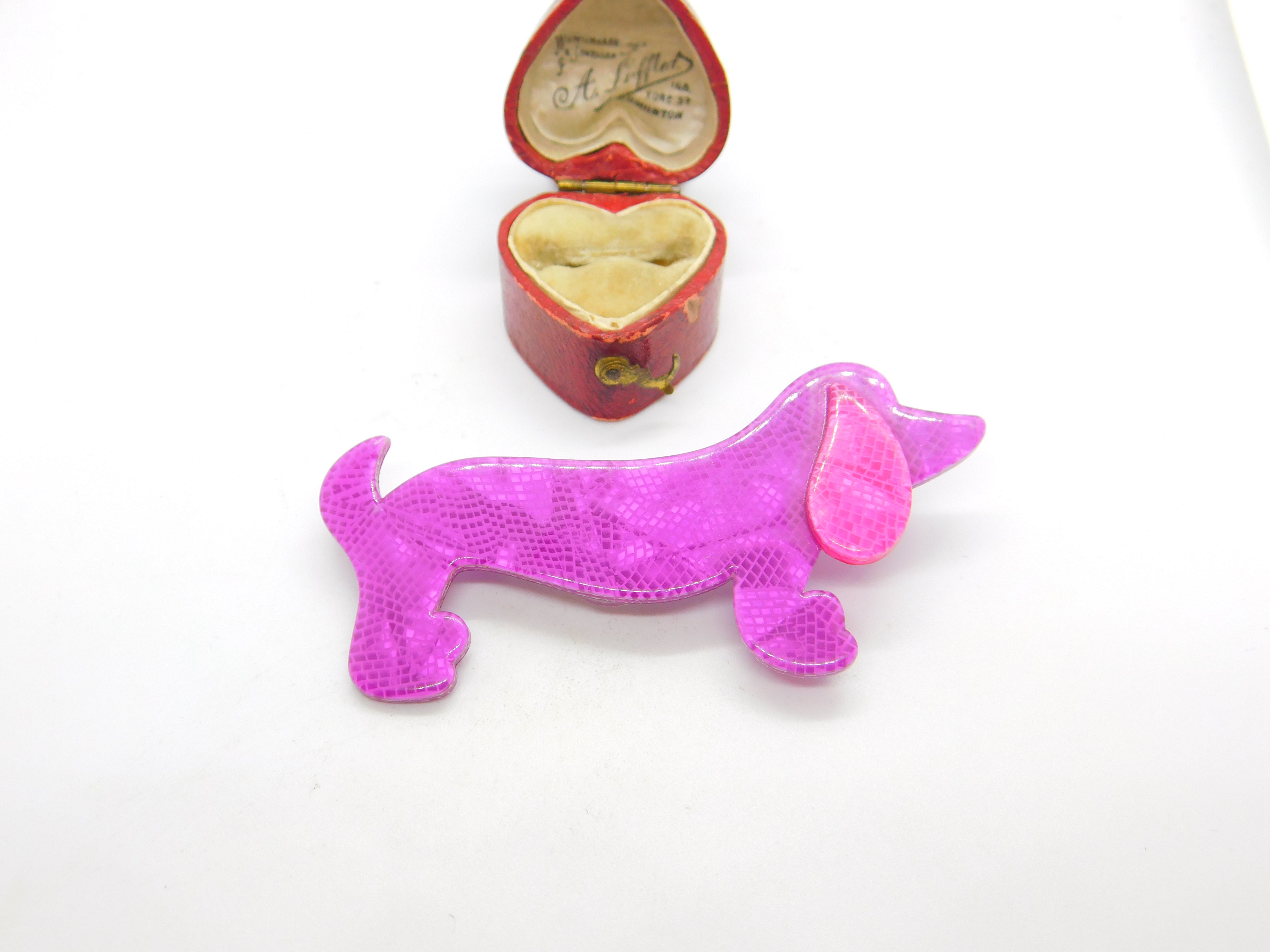 Dachshund Sausage Dog Lea Stein Paris Brooch Pin Vintage c1960. Simply iconic, this is a wonderful and very collectable Lea Stein of Paris brooch or pin of a daschund sausage dog dating from the 1960's.