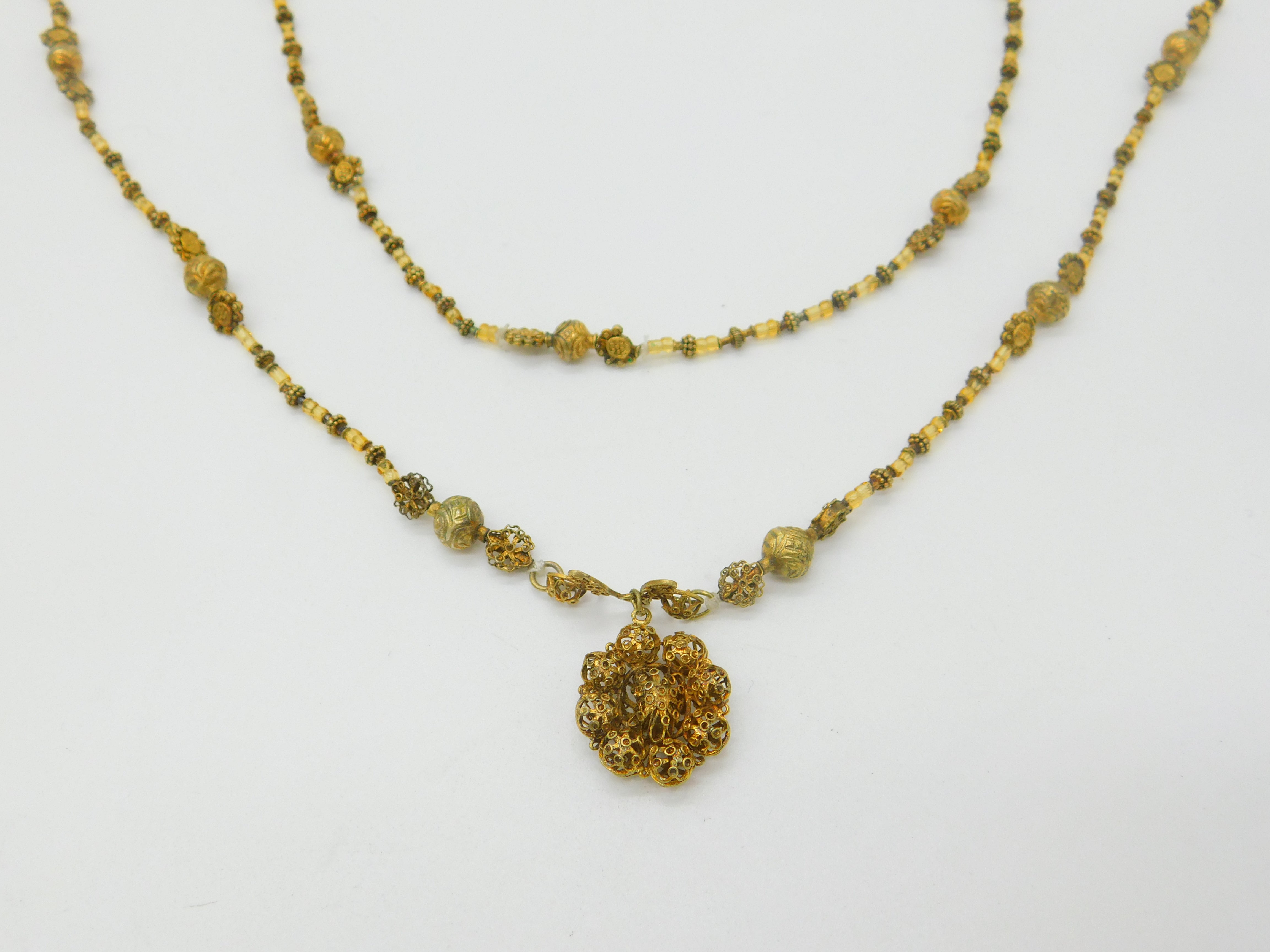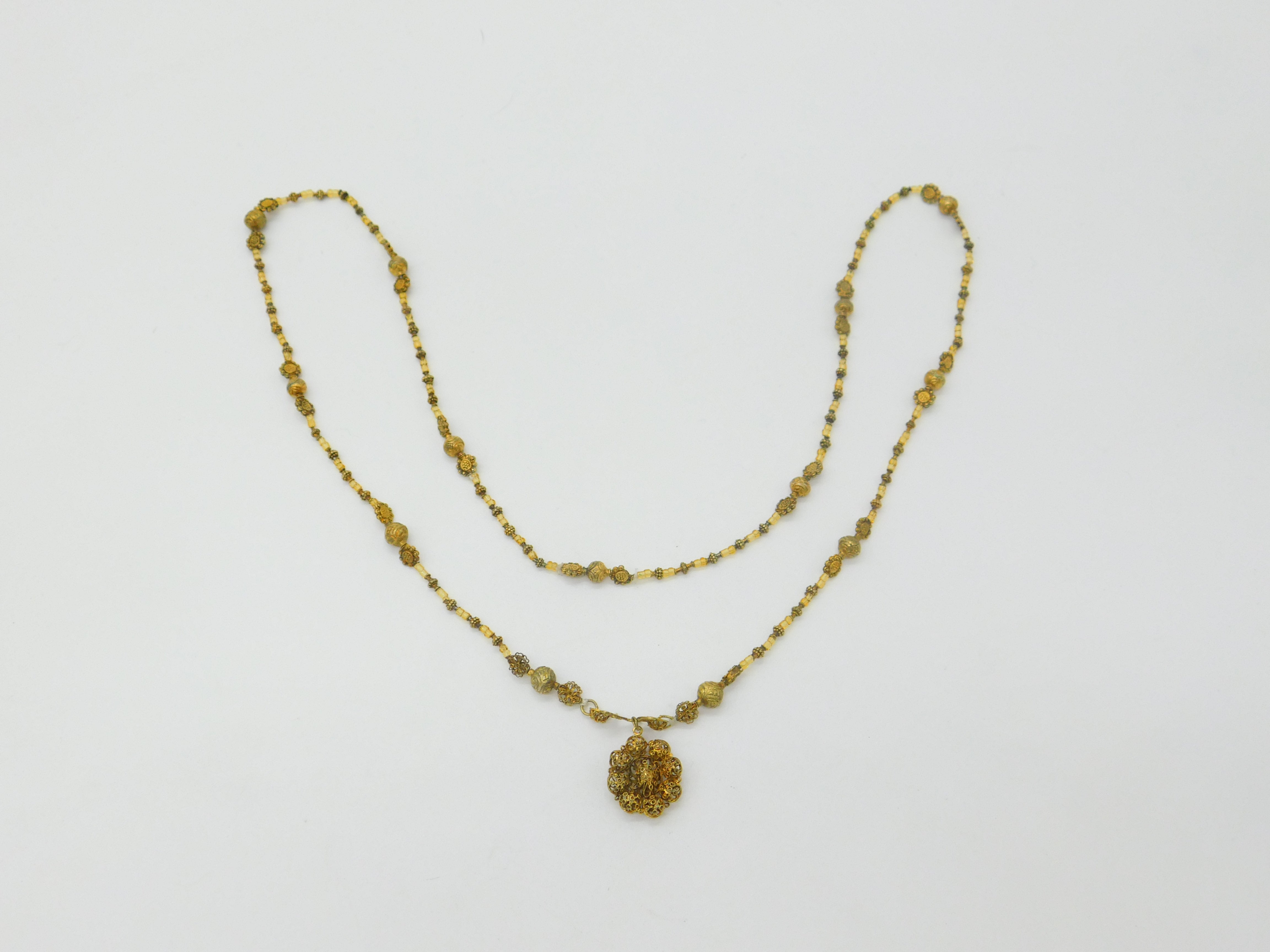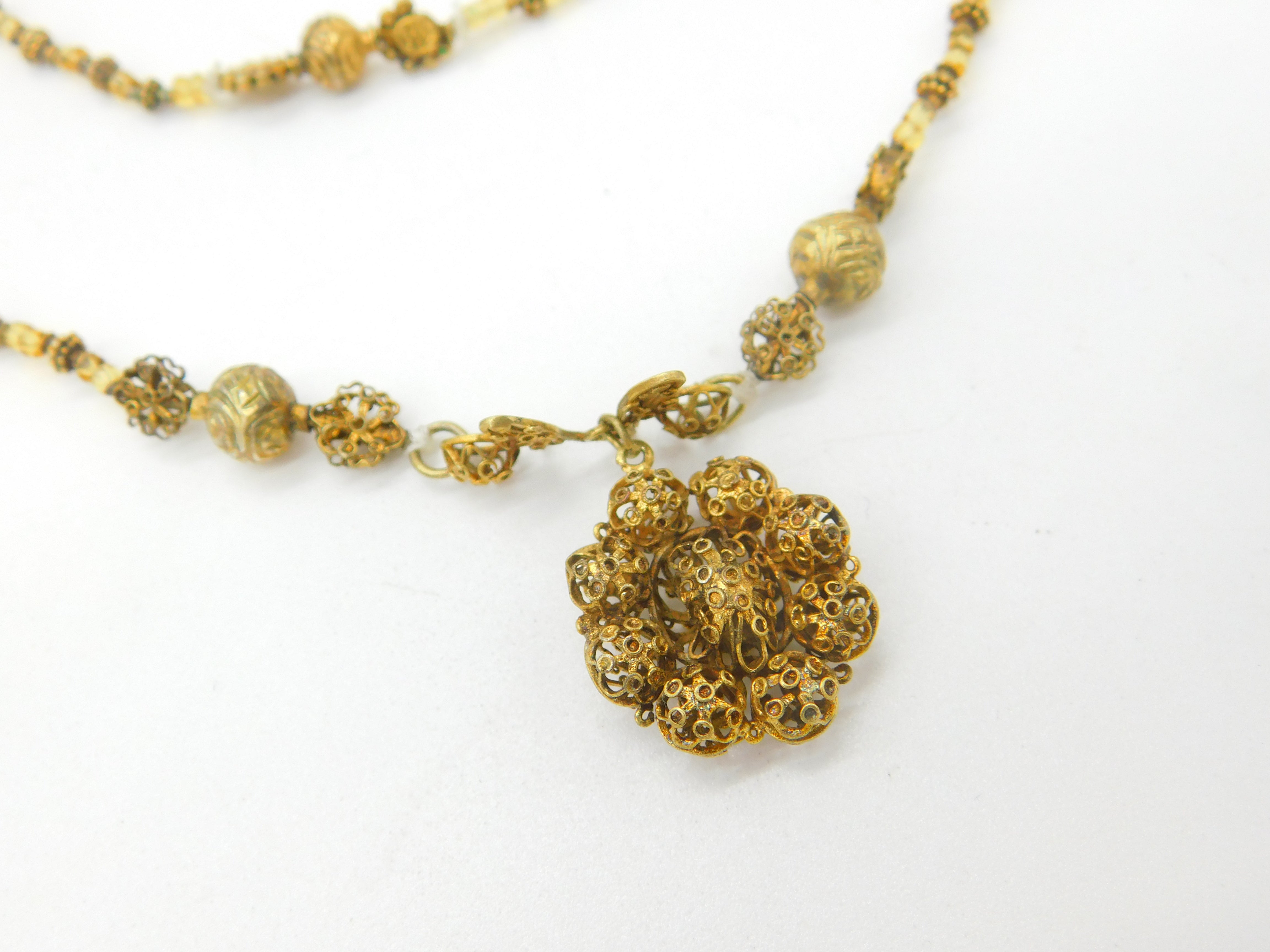 Details: A fantastic and wonderfully designed antique early Spanish sterling silver gilt necklace crafted from coins with a superb filigree floral pendant c1720 produced during Spanish occupation of the Philippines in the early 18th century. The neckalce is interspersed with citrine. Stunning example museum quality - XRF tested. This is a wonderful item that would make a perfect gift or addition to any collection. The BOX pictured is for PRESENTATION ONLY and is NOT included in the listings but used to frame the pictures unless specifically stated otherwise.