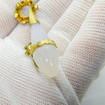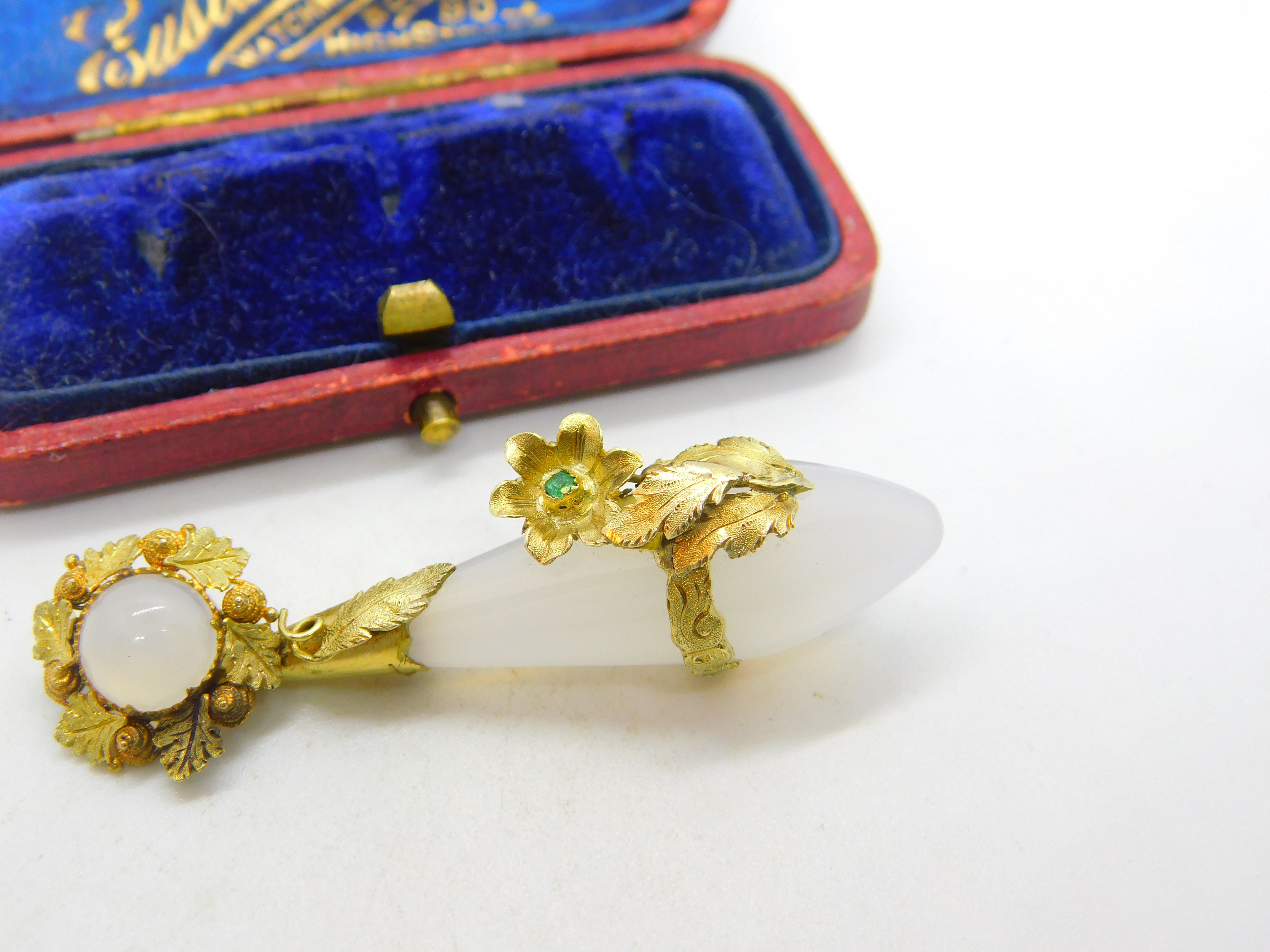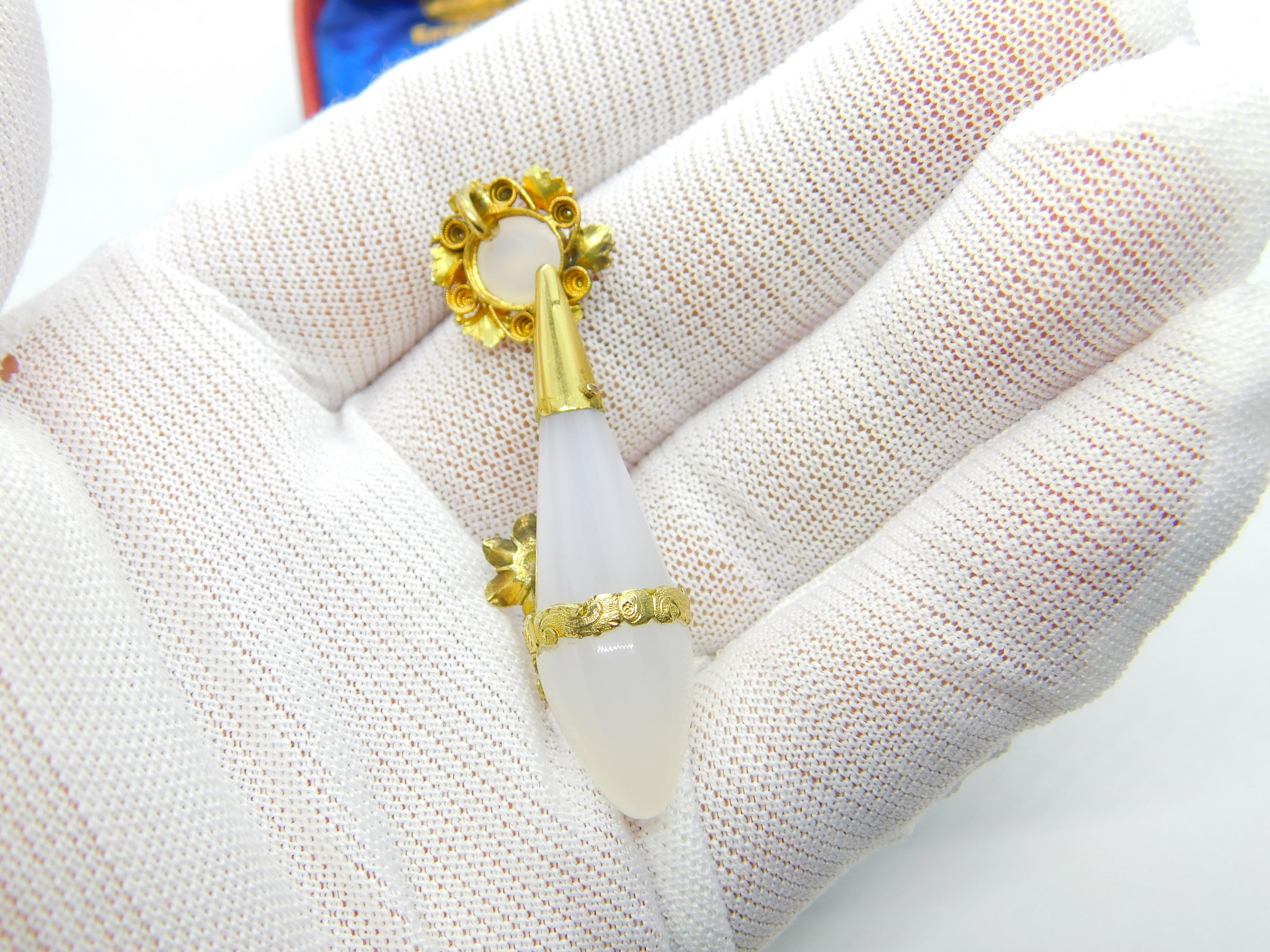 Details: A fantastic and wonderfully designed antique early Victorian 18ct yellow gold large floral drop pendant formed of carved chalcedony agate set with a small emerald stone c1840. The gold has been XRF tested the the chalcedony is perfect. This is a wonderful item that would make a perfect gift or addition to any collection. The BOX pictured is for PRESENTATION ONLY and is NOT included in the listings but used to frame the pictures unless specifically stated otherwise.