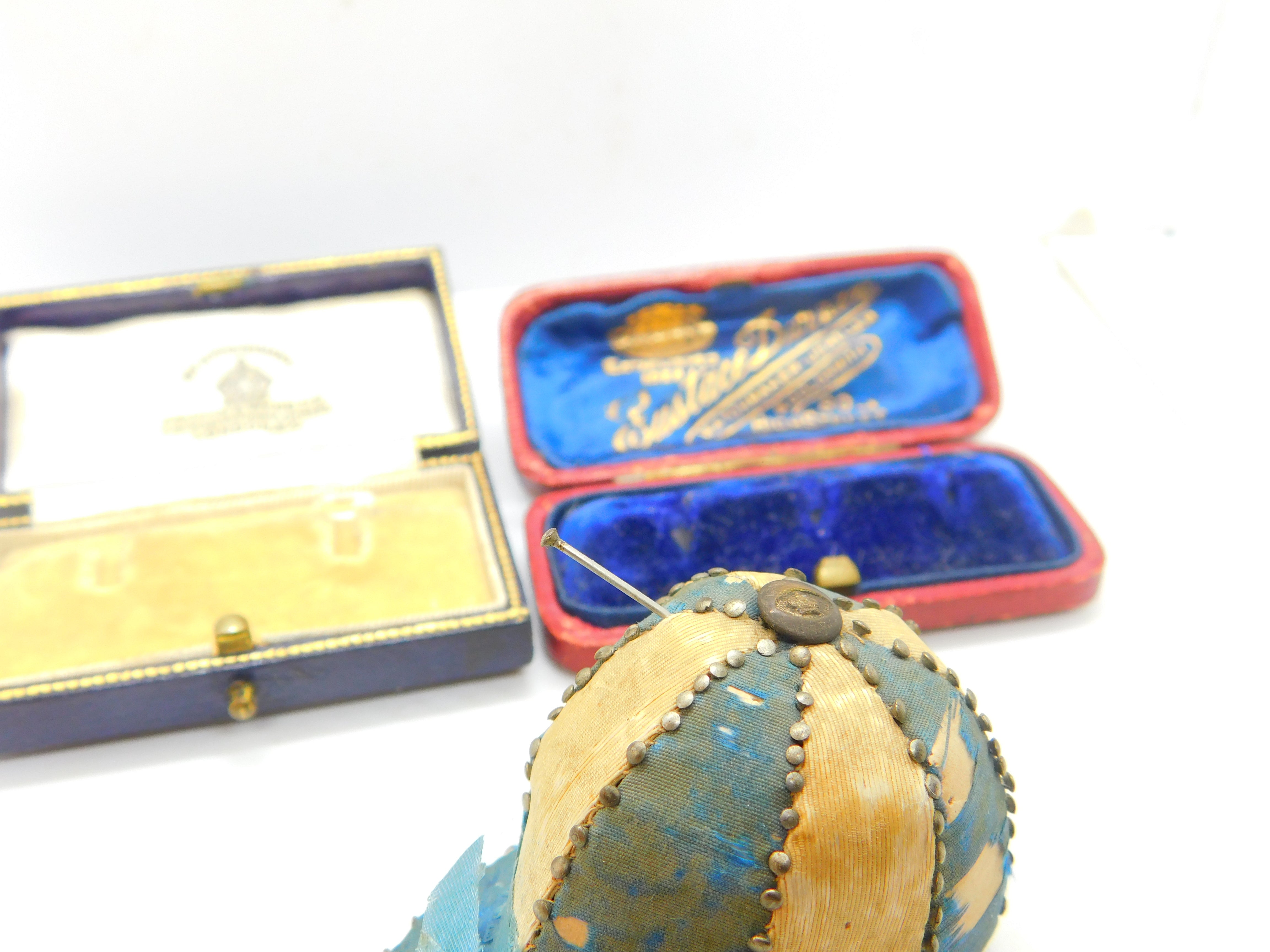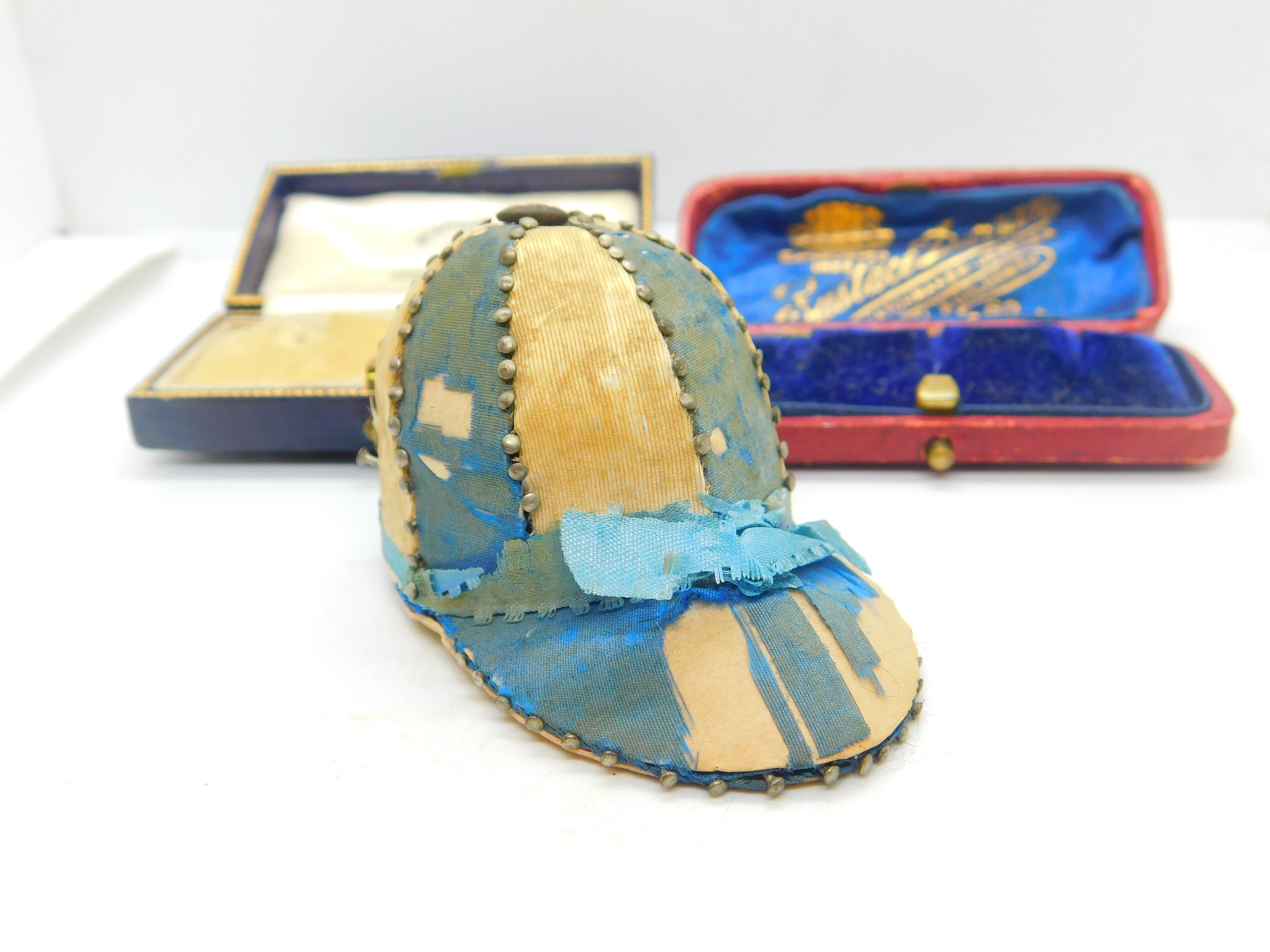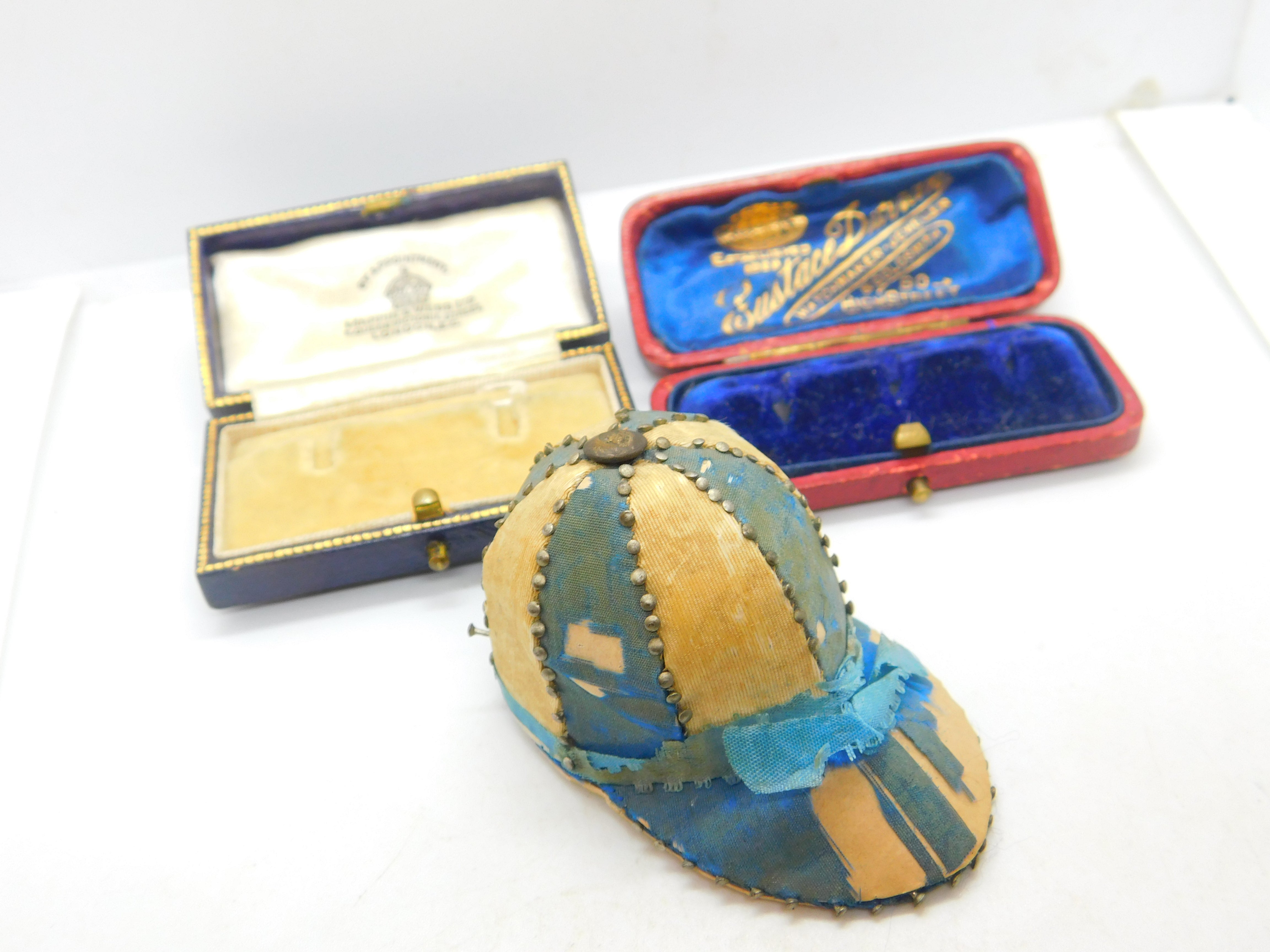 Details: A fantastic and wonderfully designed antique Victorian pin cushion in the form of a jockeys riding cap or hat with lovely design including multiple sewing pins to the mark the colour changes c1850. Pins still usable and simply charming. This is a wonderful item that would make a perfect gift or addition to any collection. The BOX pictured is for PRESENTATION ONLY and is NOT included in the listings but used to frame the pictures unless specifically stated otherwise.