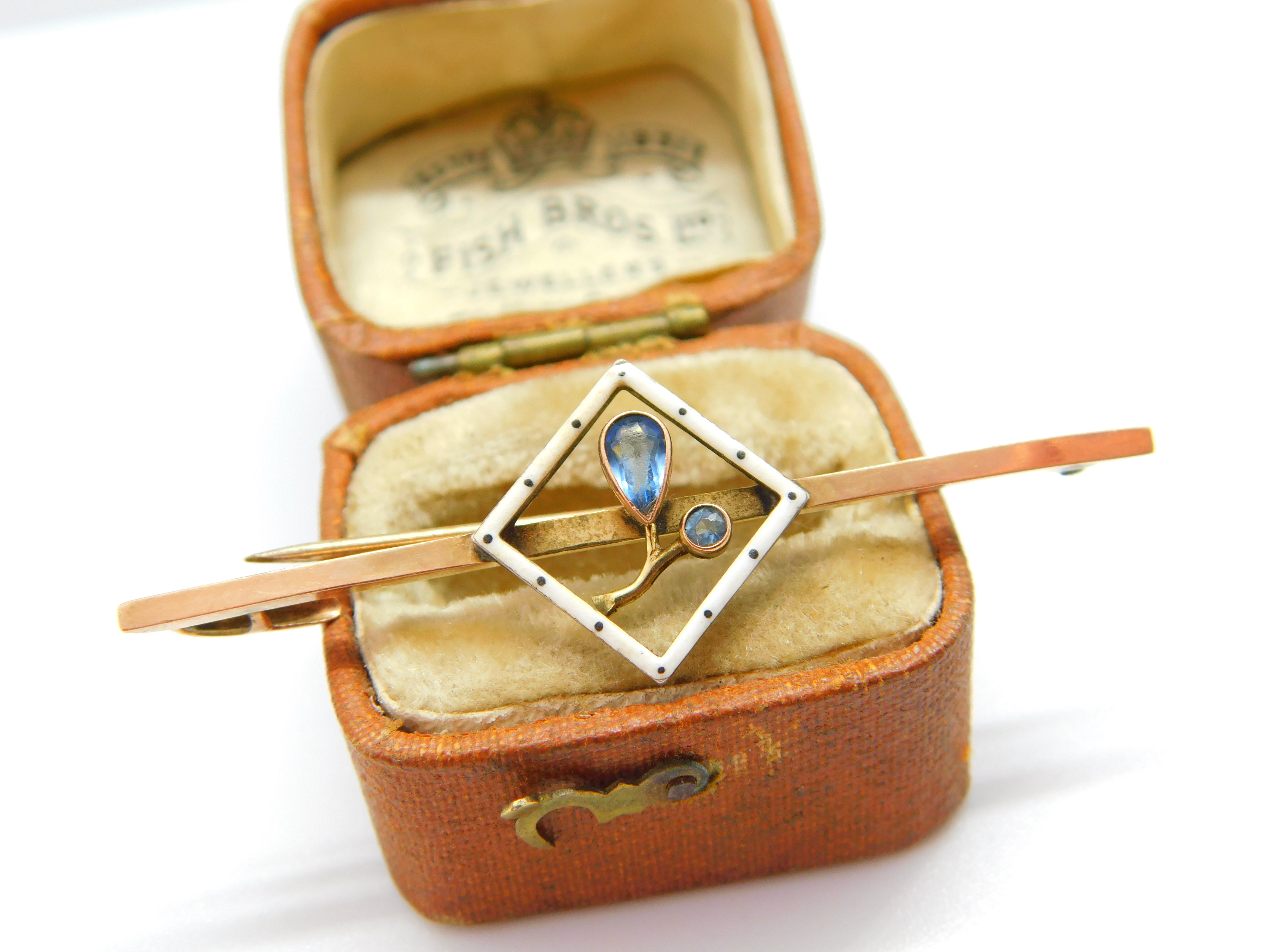 Details: A fantastic and wonderfully designed antique Edwardian 9ct yellow gold sweetheart brooch with charming floral pattern c1910. The front is silver and adorned with white enamel surrounding a blue topaz leaf pattern design hallmarked 9ct & Sil. A gorgeous early brooch. This is a wonderful item that would make a perfect gift or addition to any collection. The BOX pictured is for PRESENTATION ONLY and is NOT included in the listings but used to frame the pictures unless specifically stated otherwise.