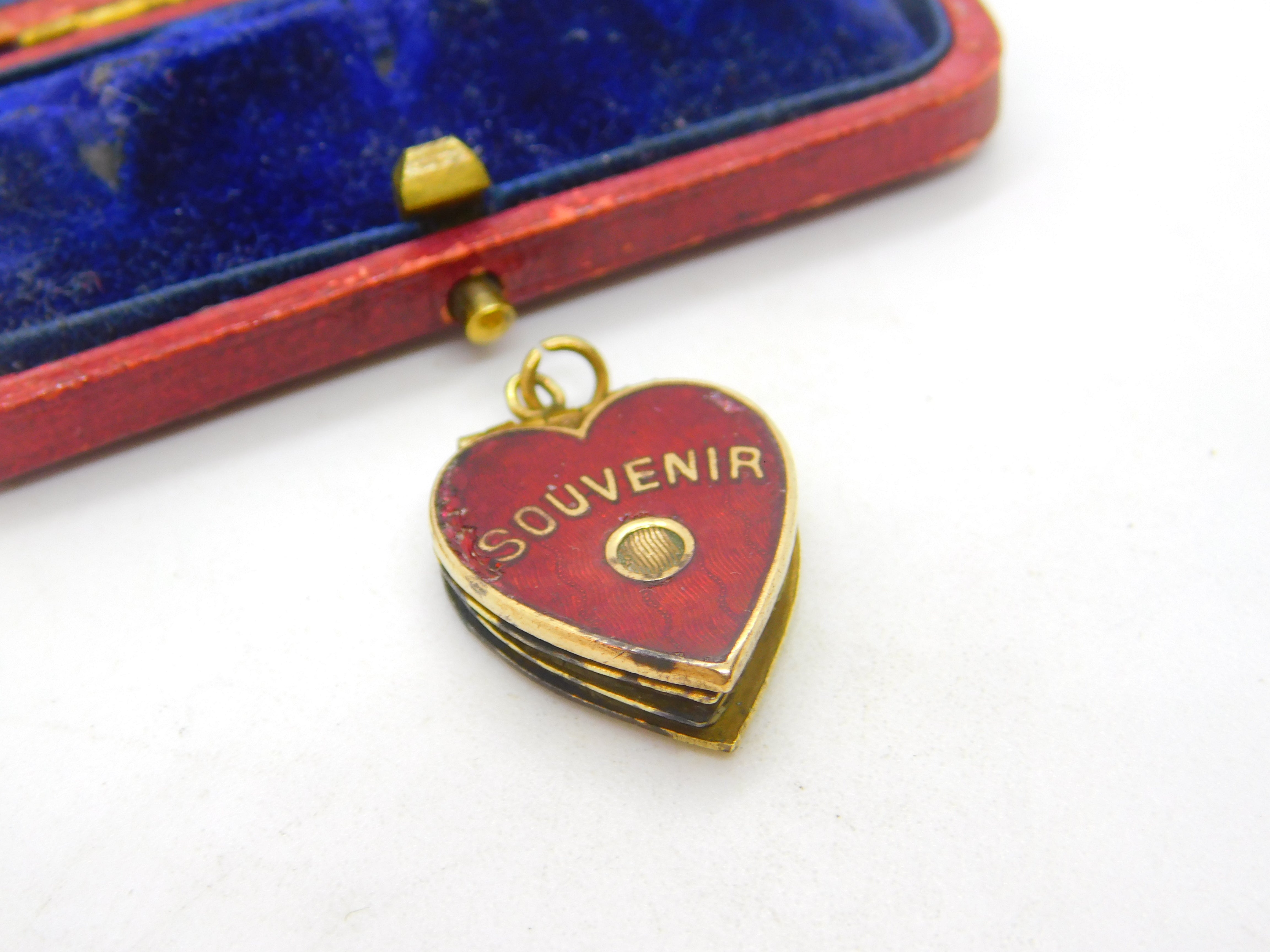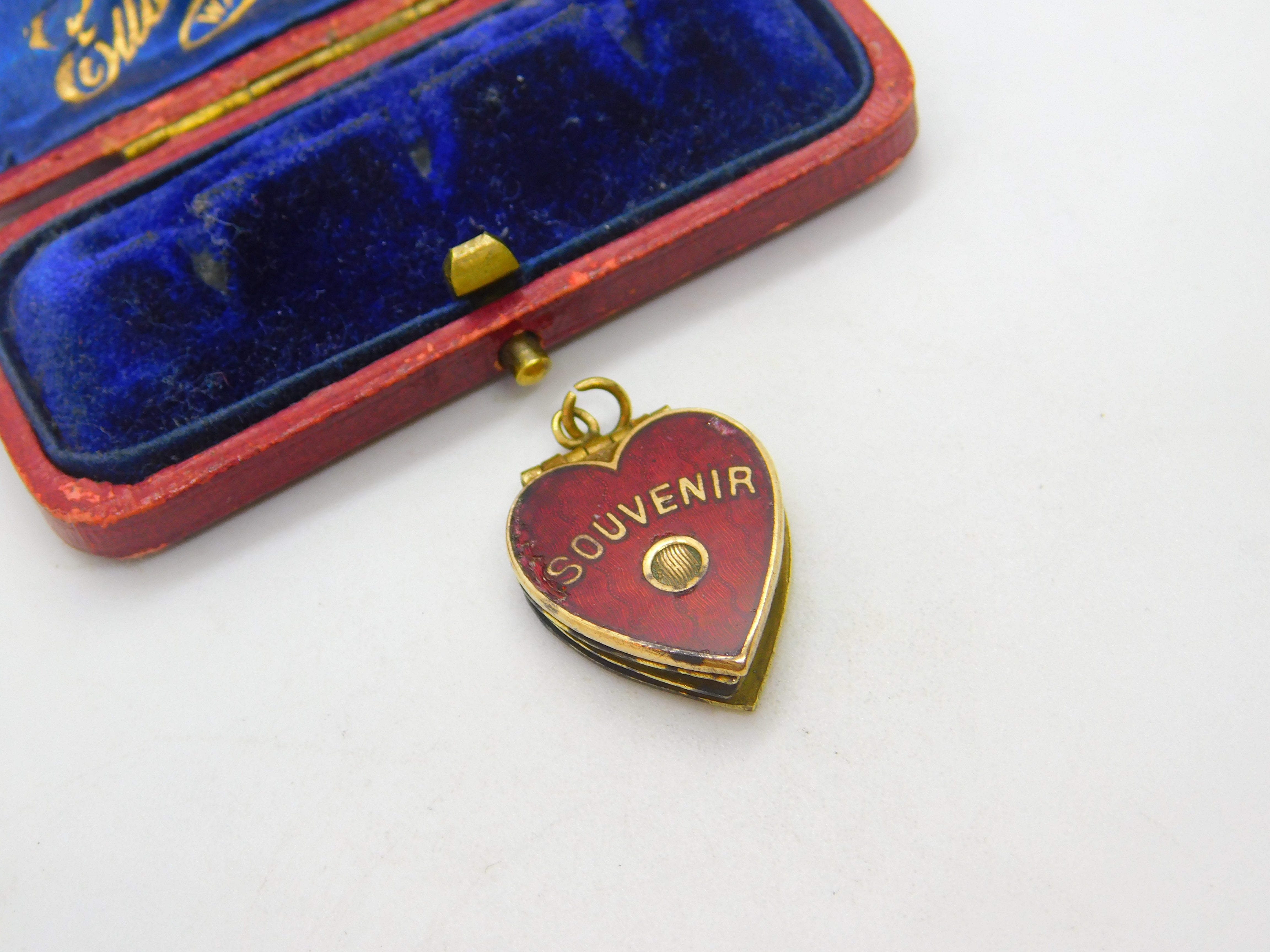 Details: A fantastic and wonderfully designed antique Edwardian gilt metal & red enamel King Edward VII coronation heart shaped photo book charm with super detailing c1902 - clear tarnishing to the reverse but a lovely and unique example. This is a wonderful item that would make a perfect gift or addition to any collection. The BOX pictured is for PRESENTATION ONLY and is NOT included in the listings but used to frame the pictures unless specifically stated otherwise.