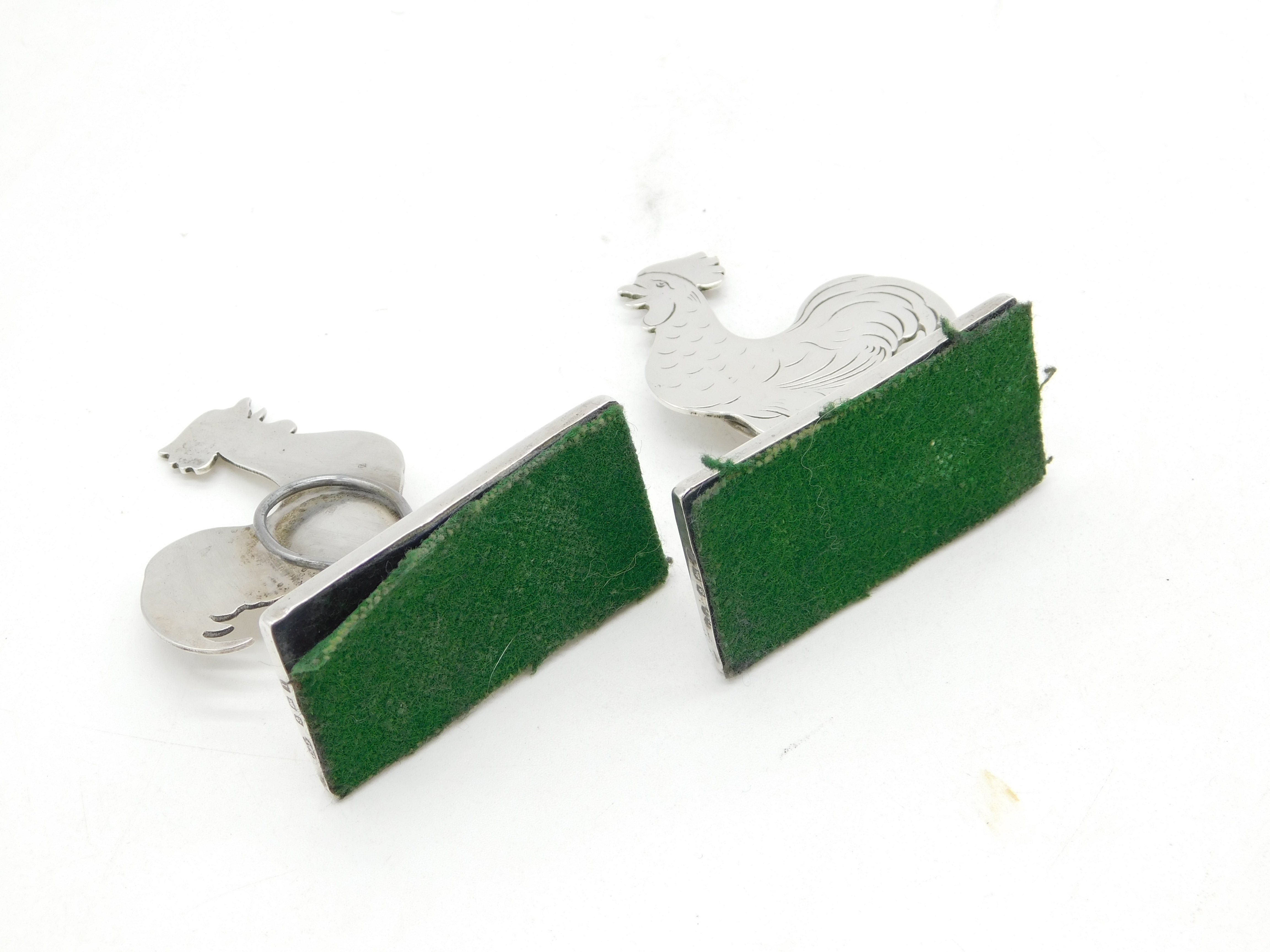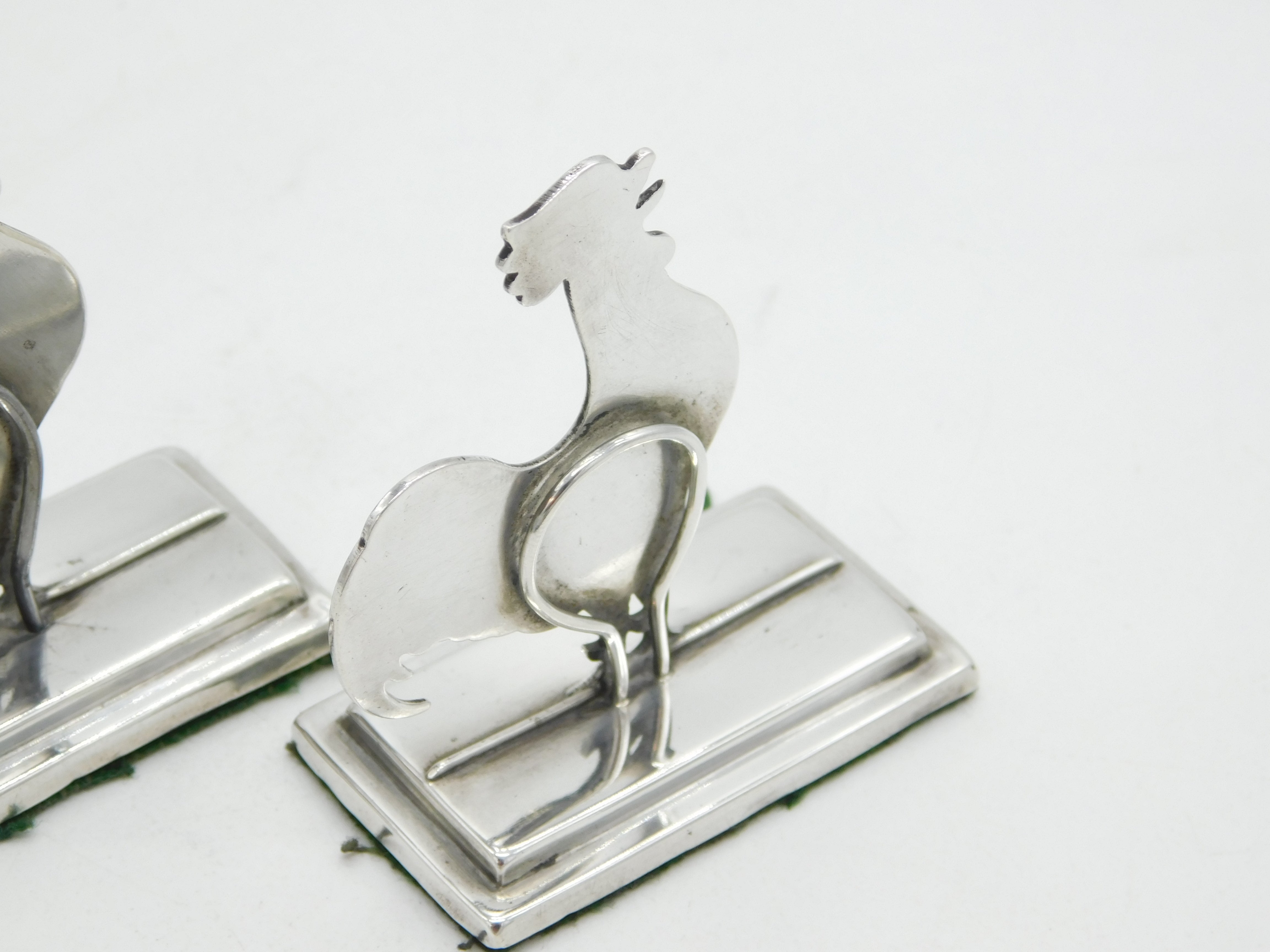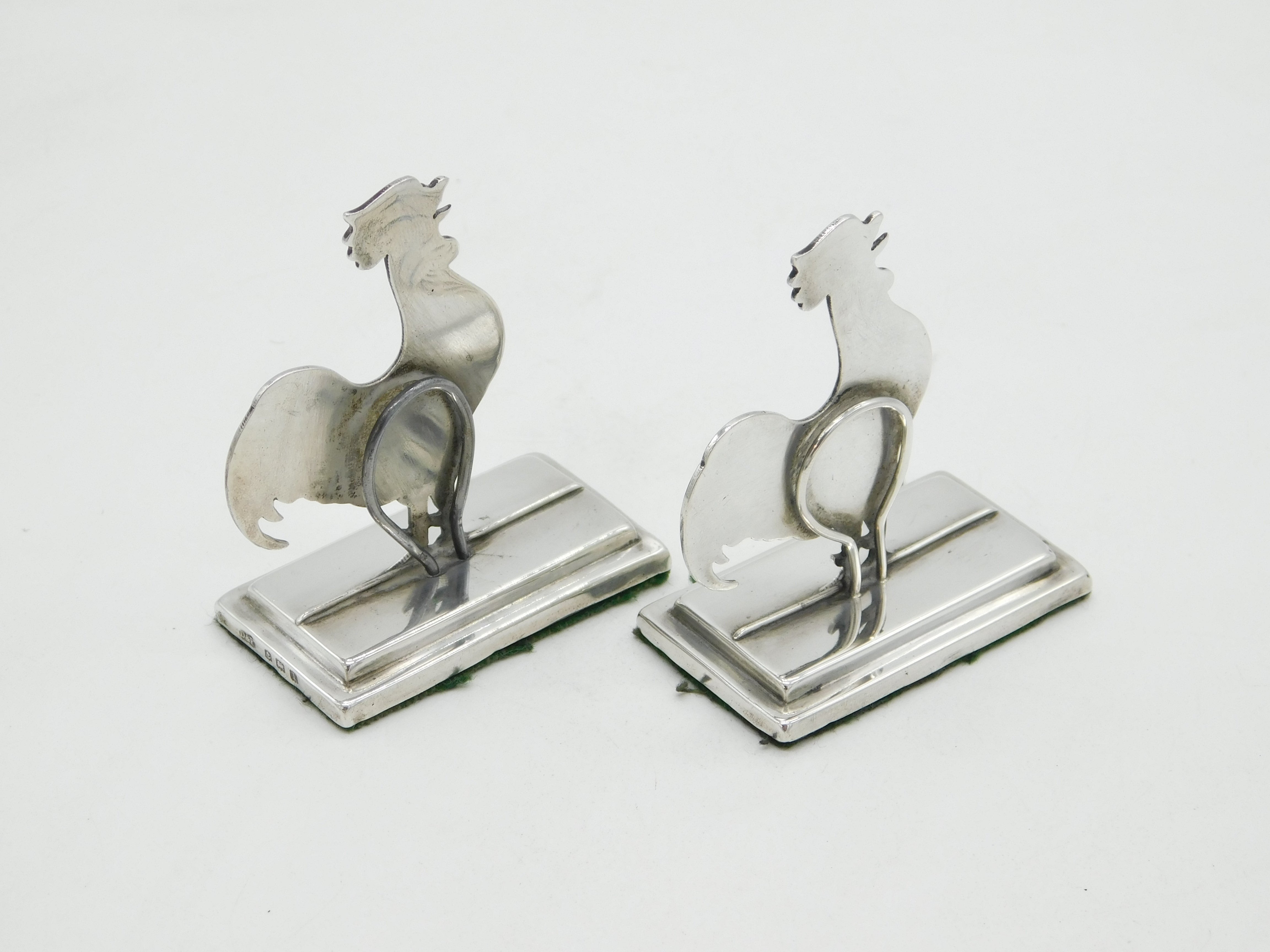 Details: A fantastic and wonderfully designed antique Edwardian pair of sterling silver cockerel chicken menu holders or place settings hallmarked Birmingham 1910 by Deakin & Francis. This is a wonderful item that would make a perfect gift or addition to any collection. We are more than happy to provide XRF reports for items upon request.