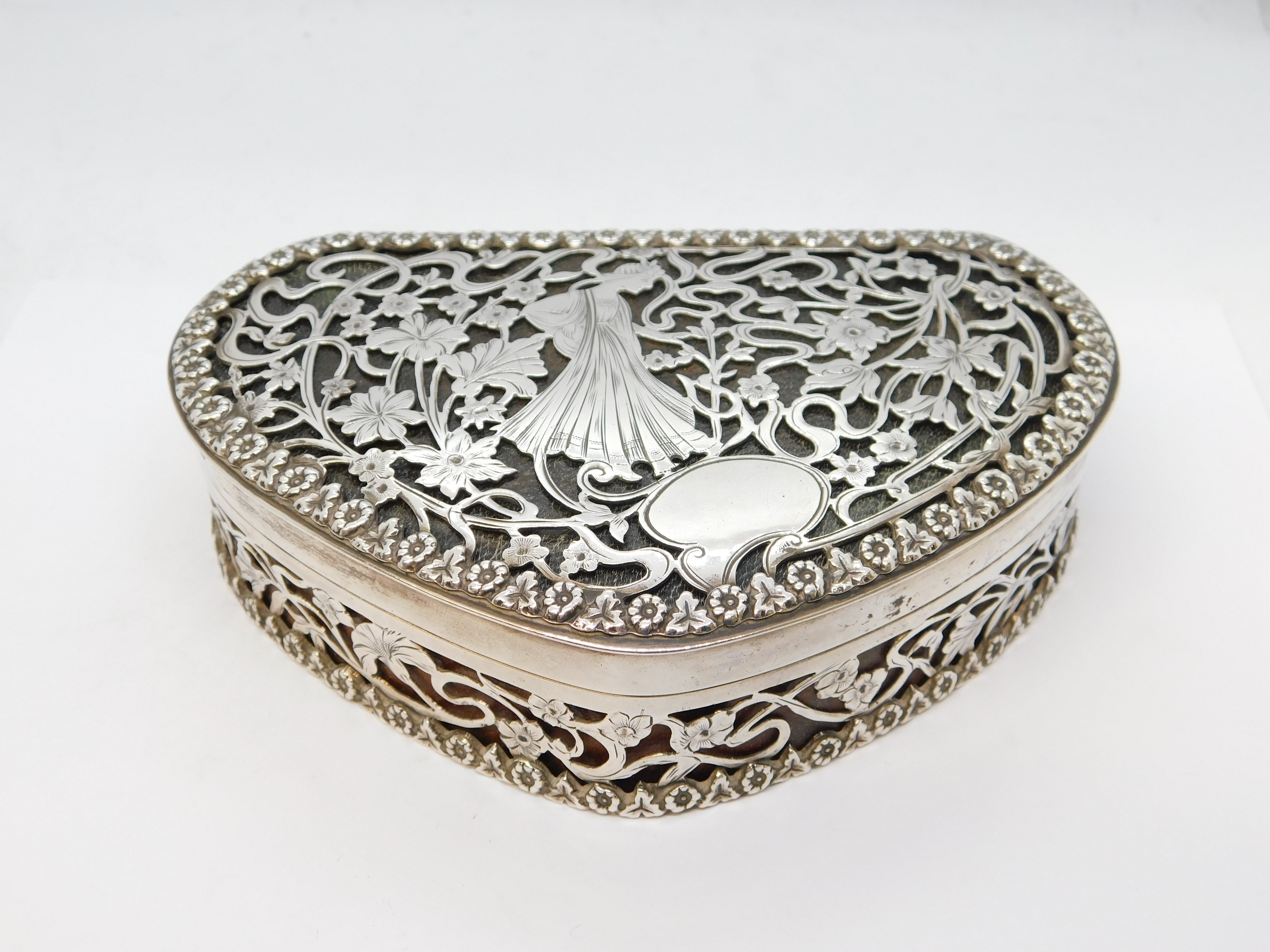 Details: A fantastic and wonderfully designed antique edwardian art nouveau pierced floral antique edwardian sterling silver pierced floral & fairy pattern ornate jewellery box with stunning detailing hallmarked Chester 1910 by George Nathan & Ridley Hayes, the interior is slightly frayed please note. Good gauge of silver including to the base. This is a wonderful item that would make a perfect gift or addition to any collection. We are more than happy to provide XRF reports for items upon request.