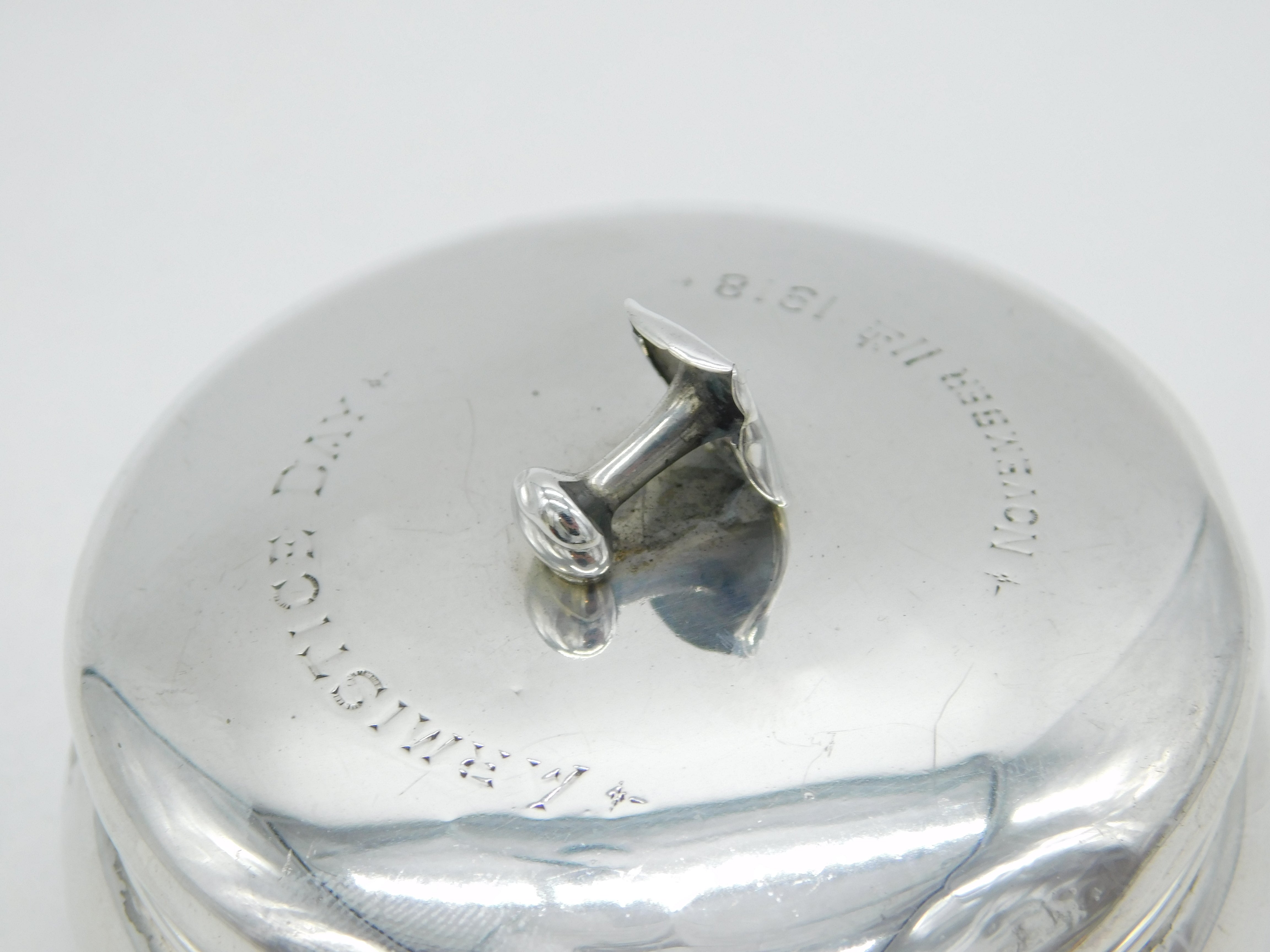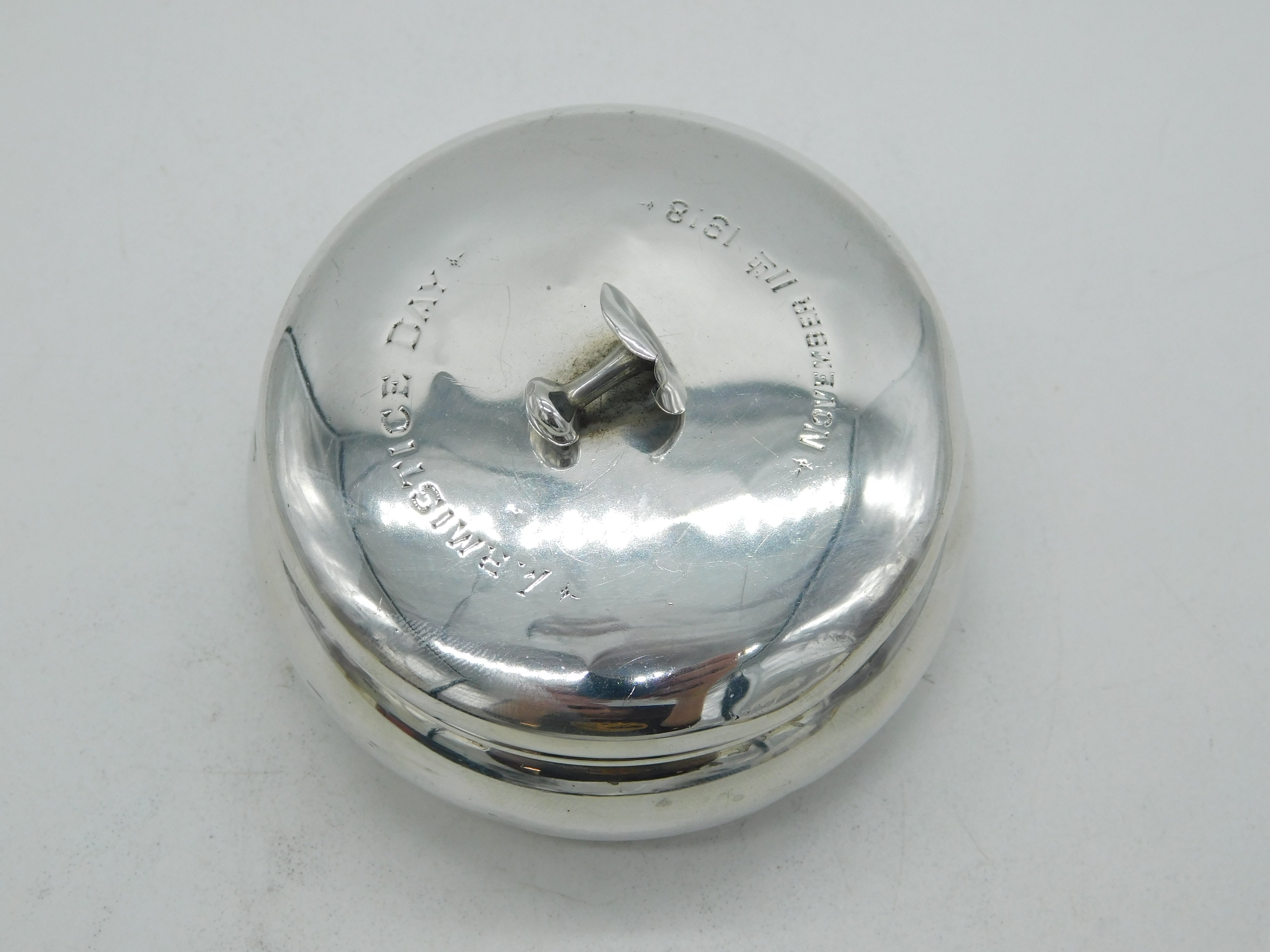 Details: A fantastic and wonderfully designed antique Edwardian sterling silver collar stud box with fun collar stud to the top of the lid later engraved 'Armistice Day, November 11th 1918' hallmarked Birmingham 1909 to the base. This is a wonderful item that would make a perfect gift or addition to any collection.
