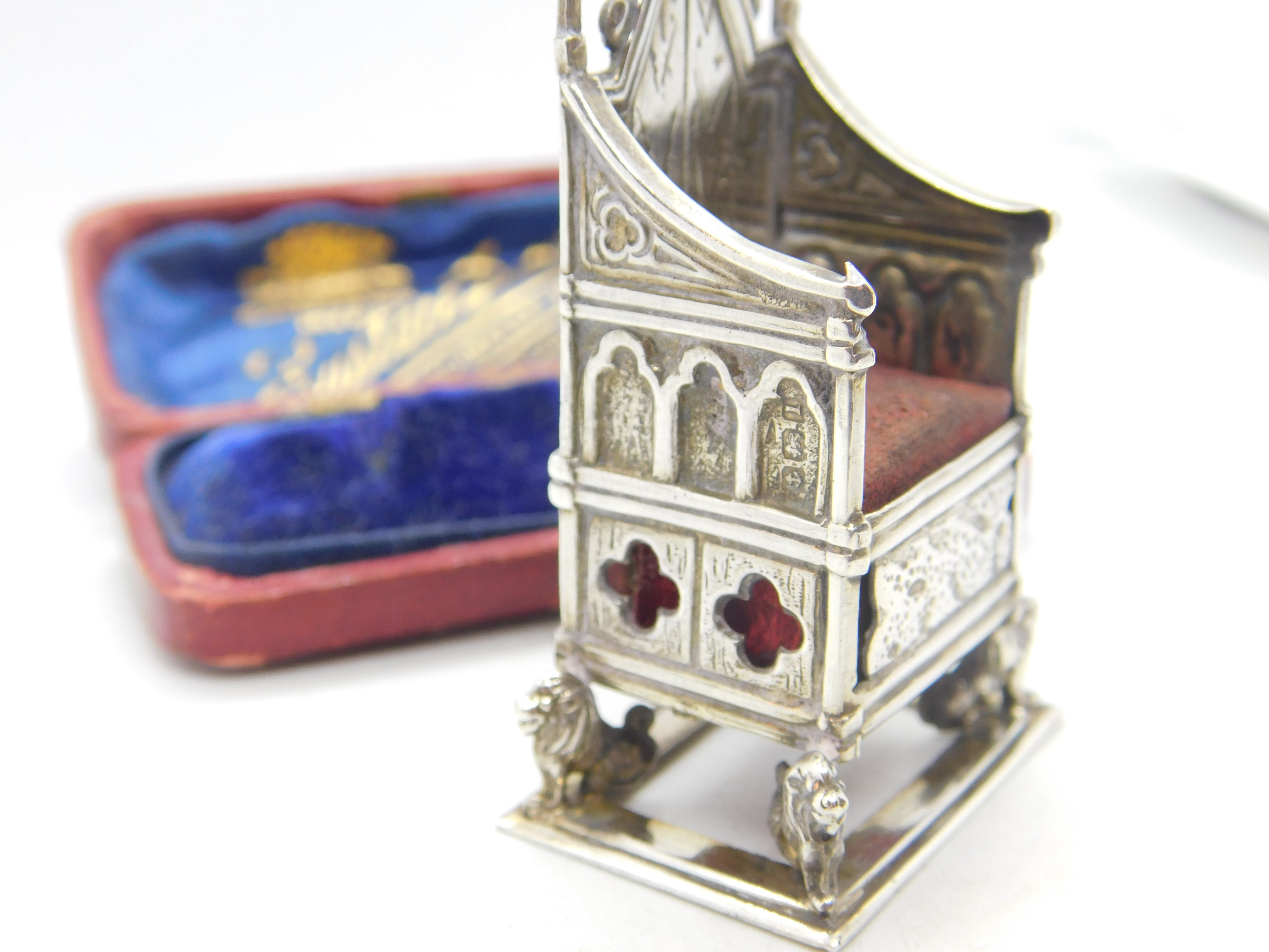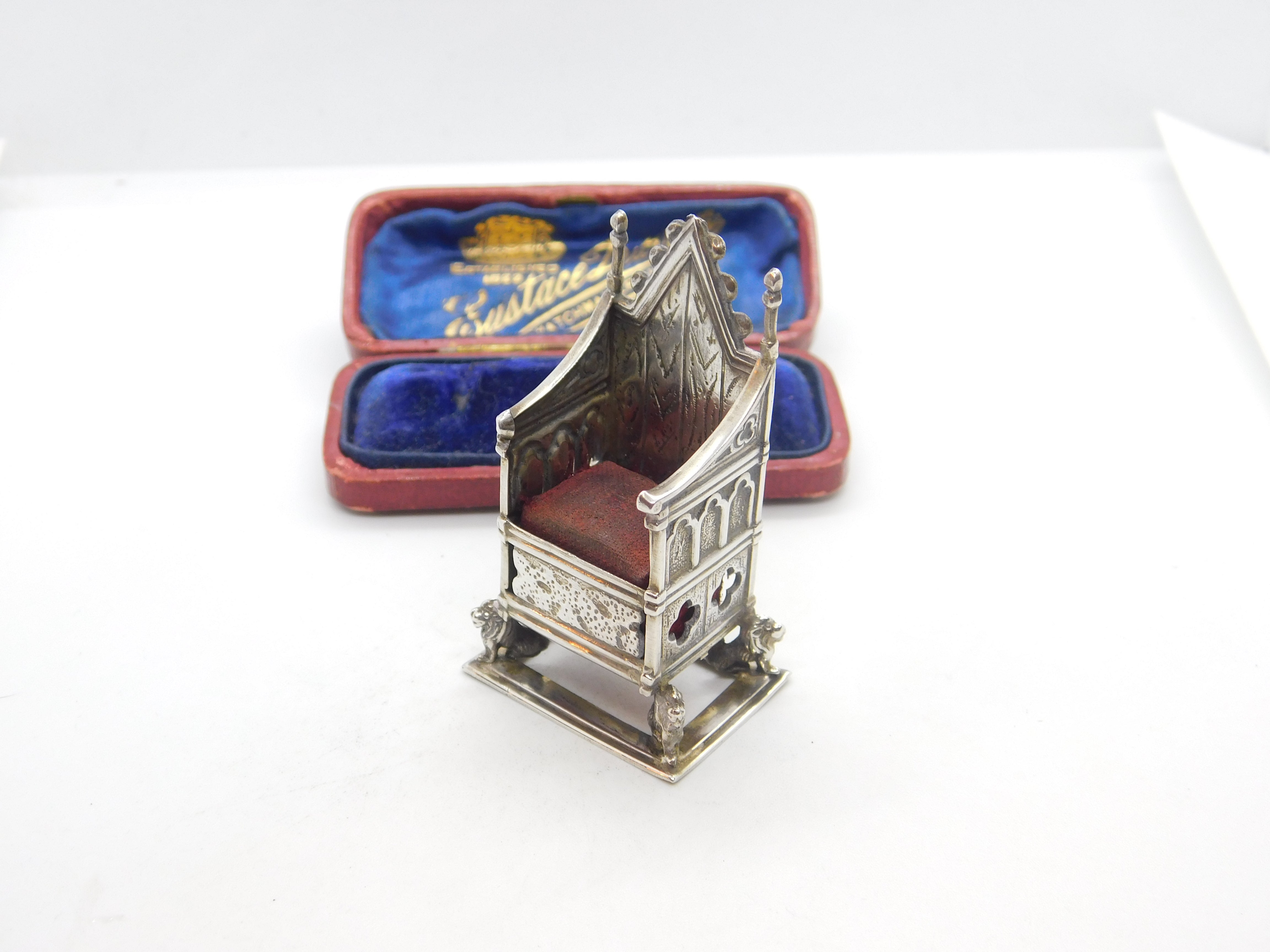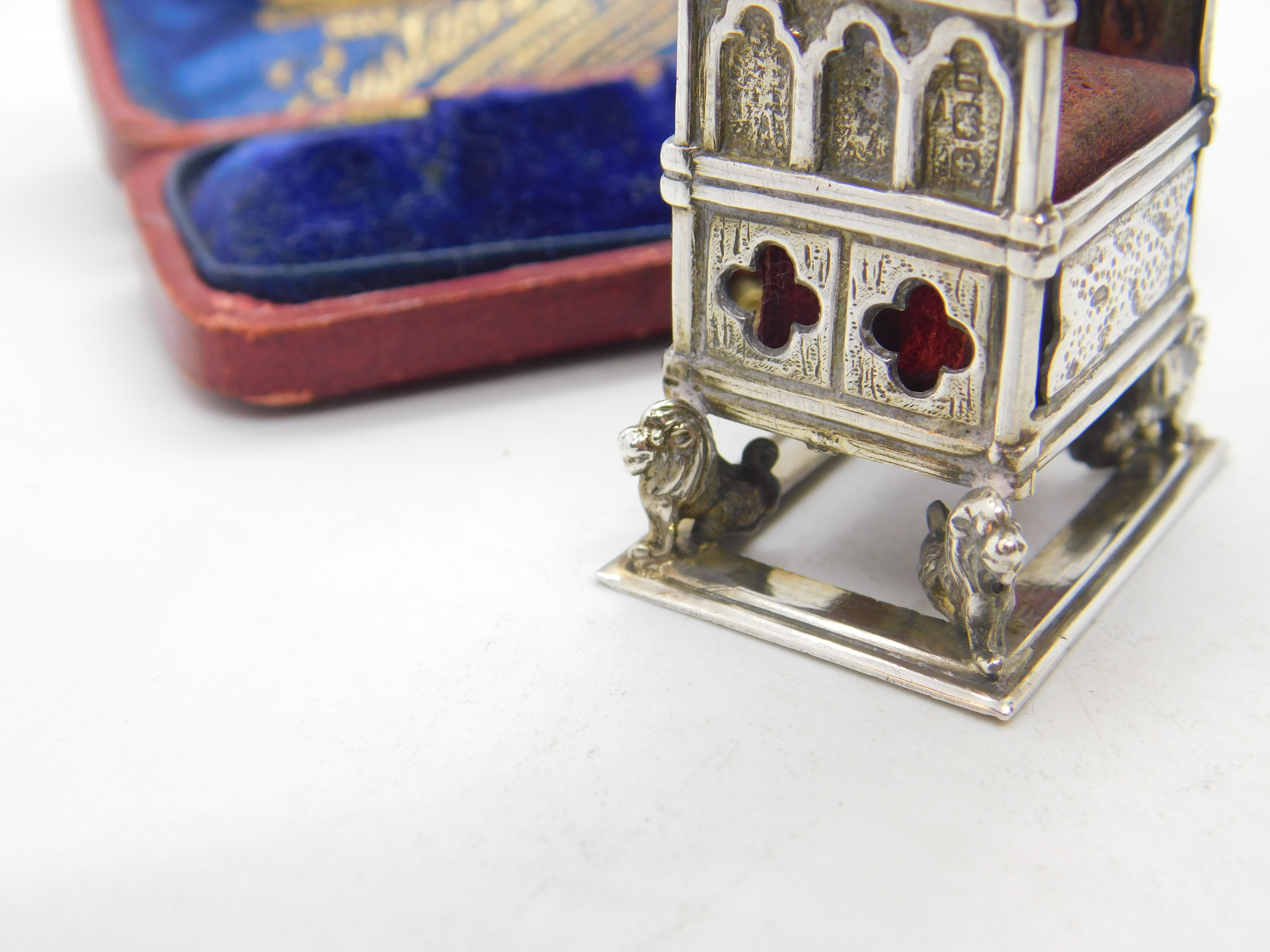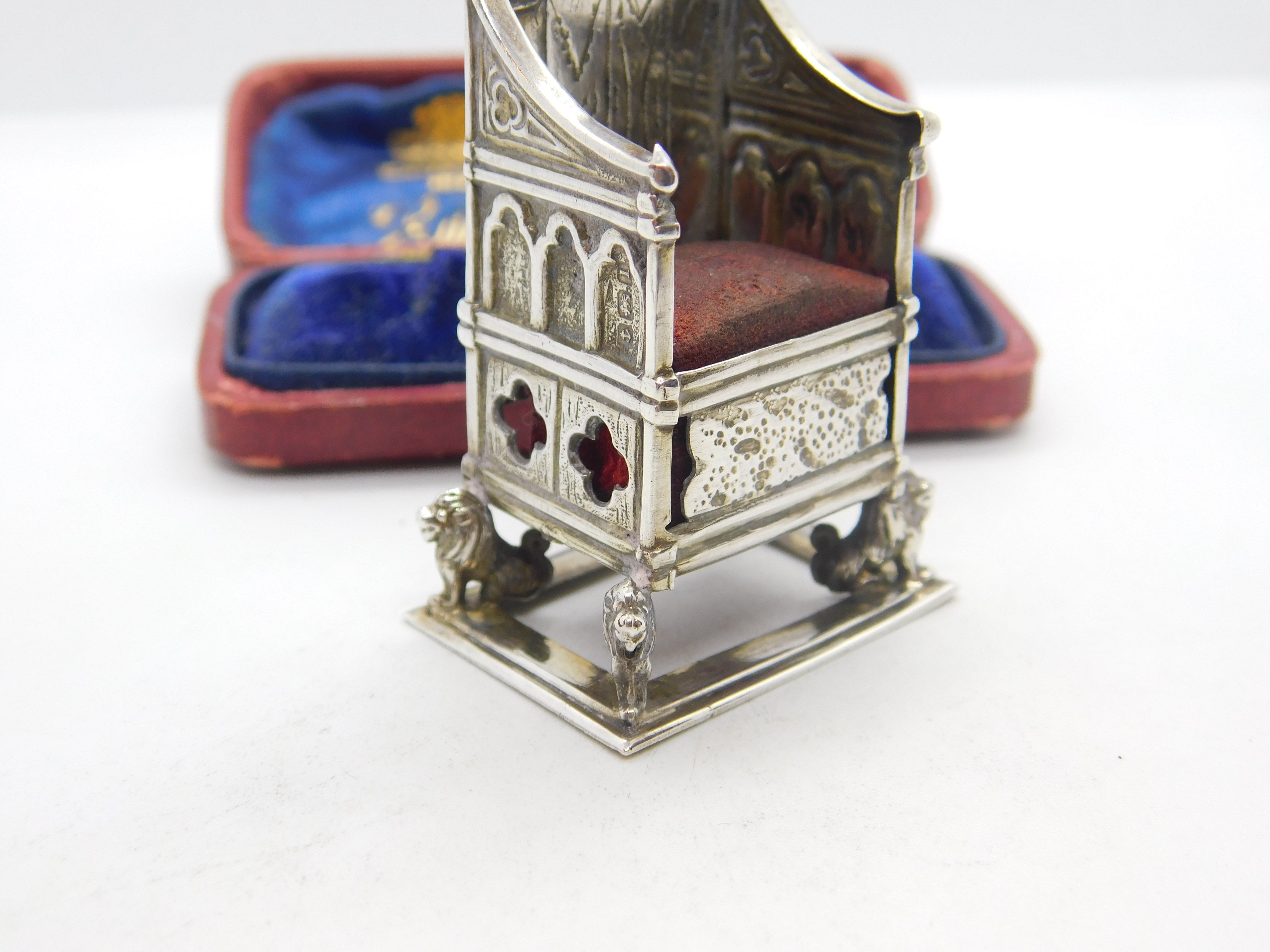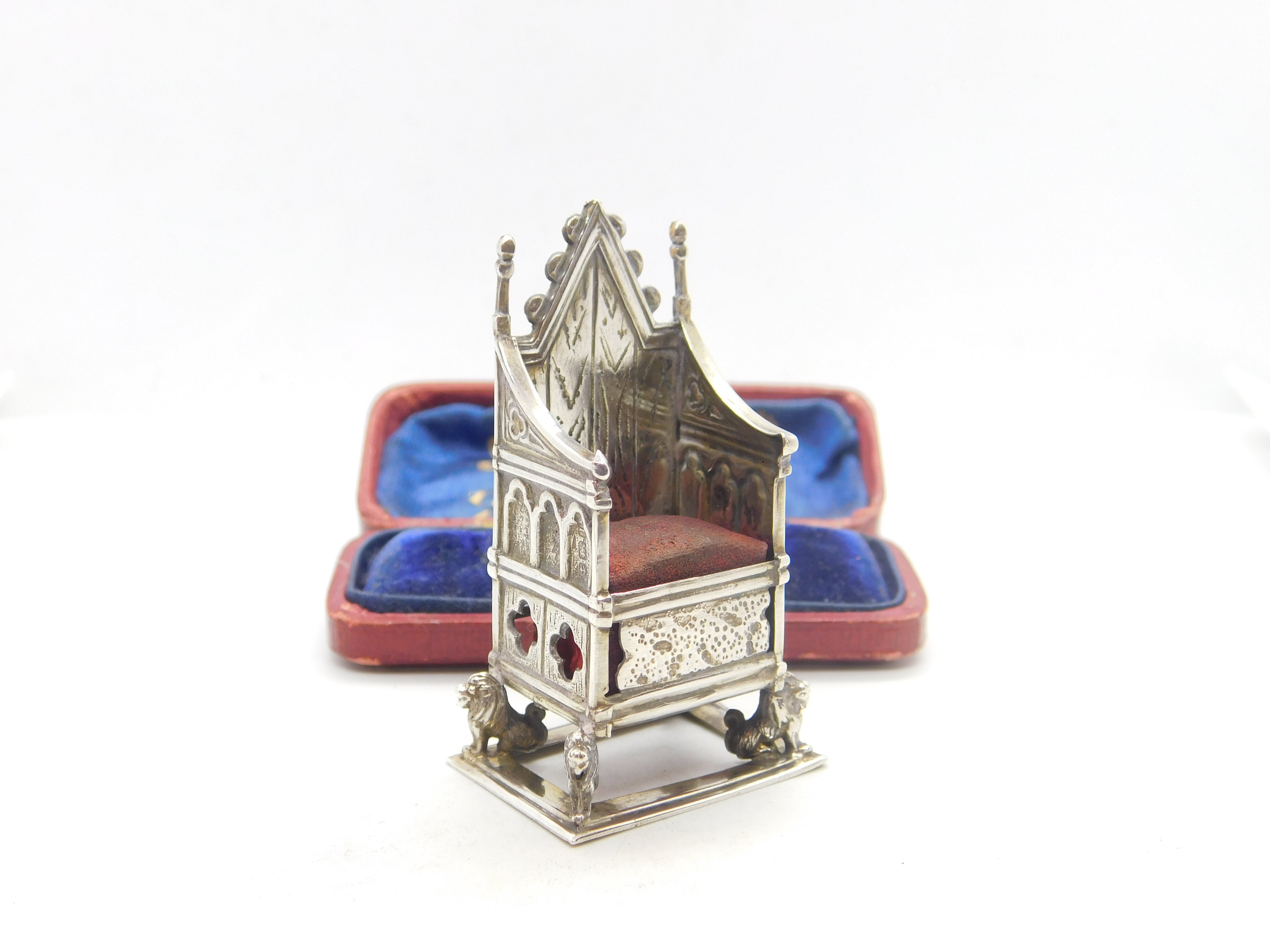 Details: A fantastic and wonderfully designed antique Edwardian sterling silver pin cushion in the form of the British coronation throne almost certainly made to commemorate the coronation of King George V in 1911 hallmarked Birmingham 1910 to the edge. This is a wonderful item that would make a perfect gift or addition to any collection. The BOX pictured is for PRESENTATION ONLY and is NOT included in the listings but used to frame the pictures unless specifically stated otherwise.