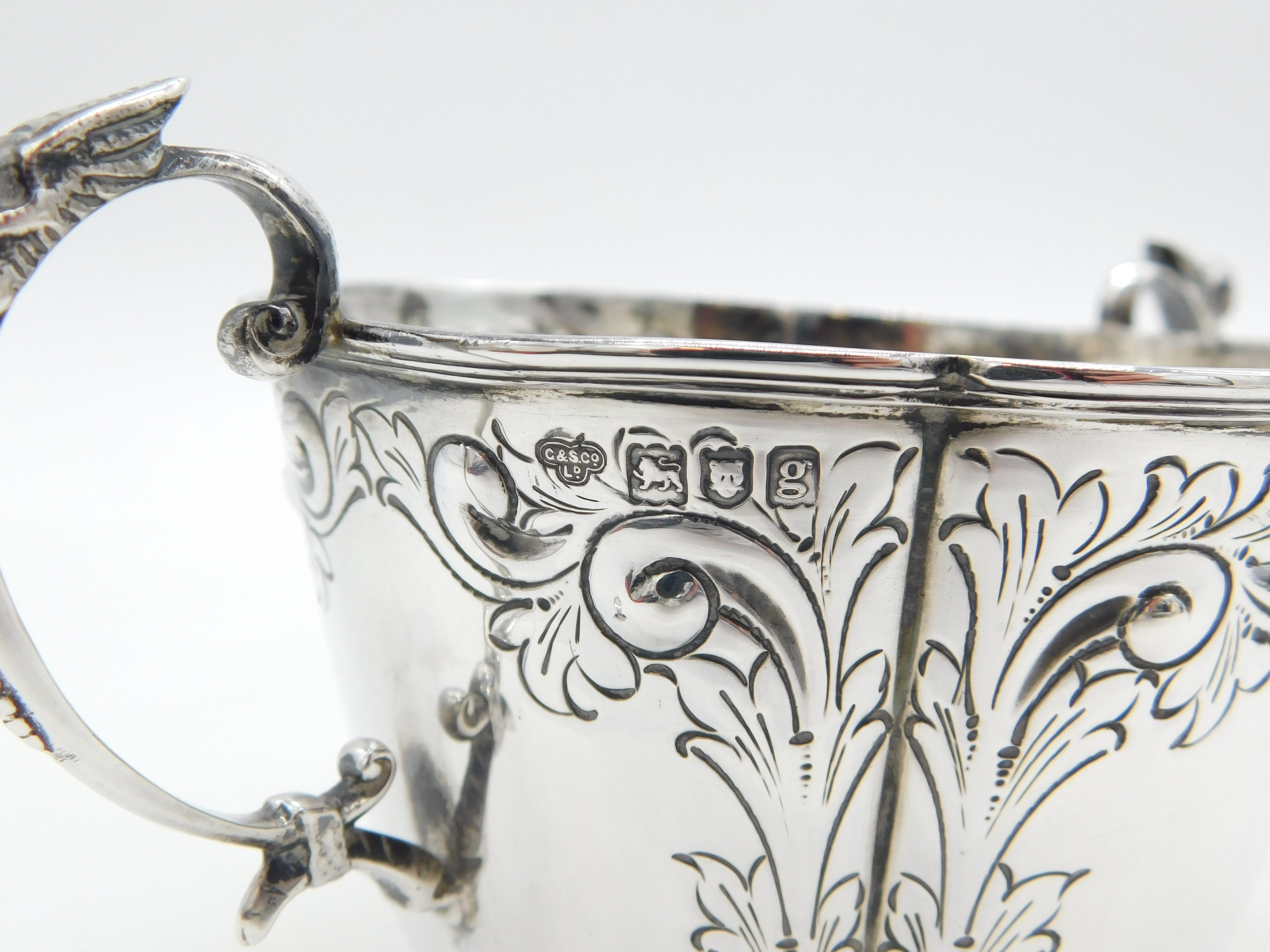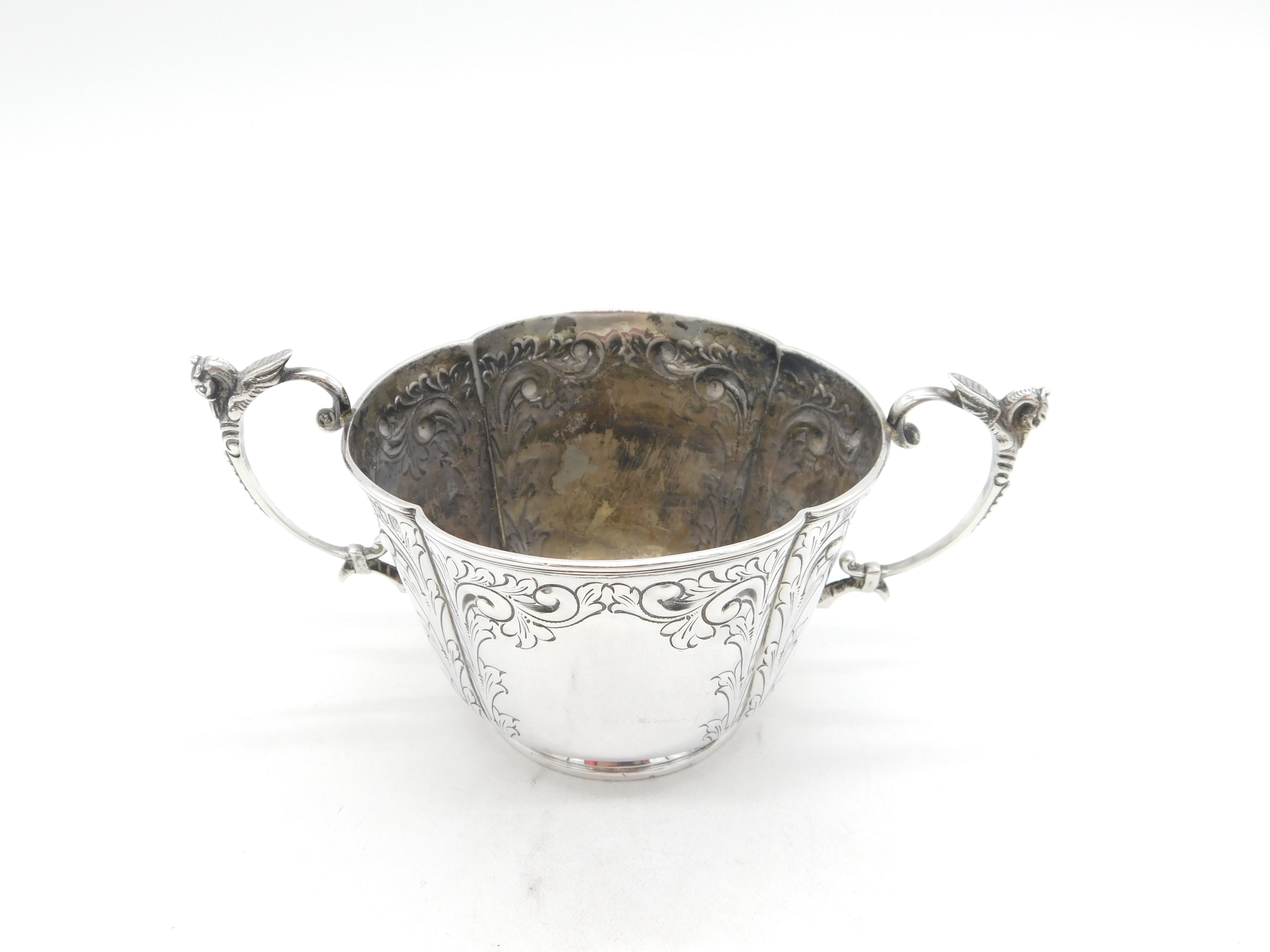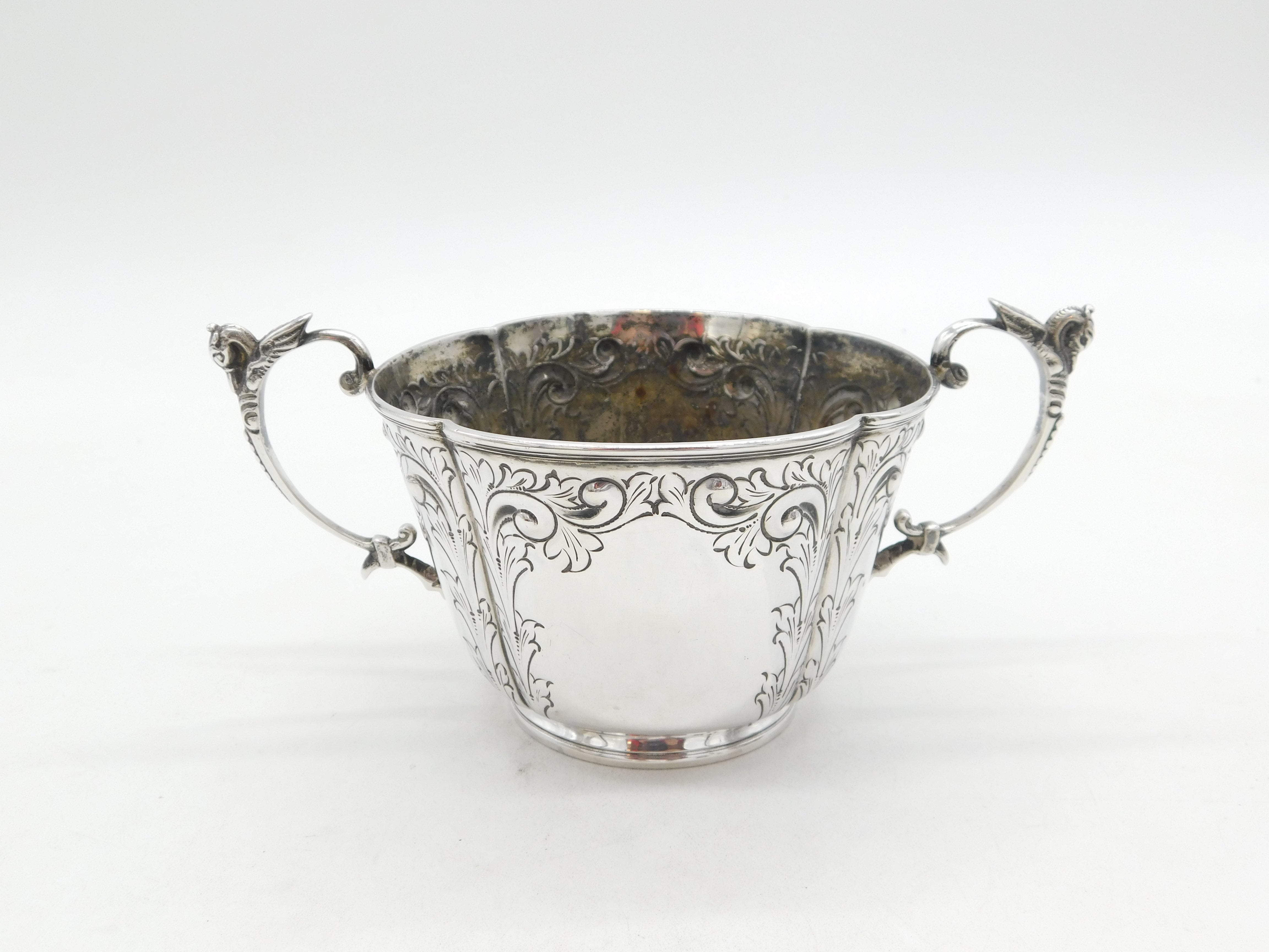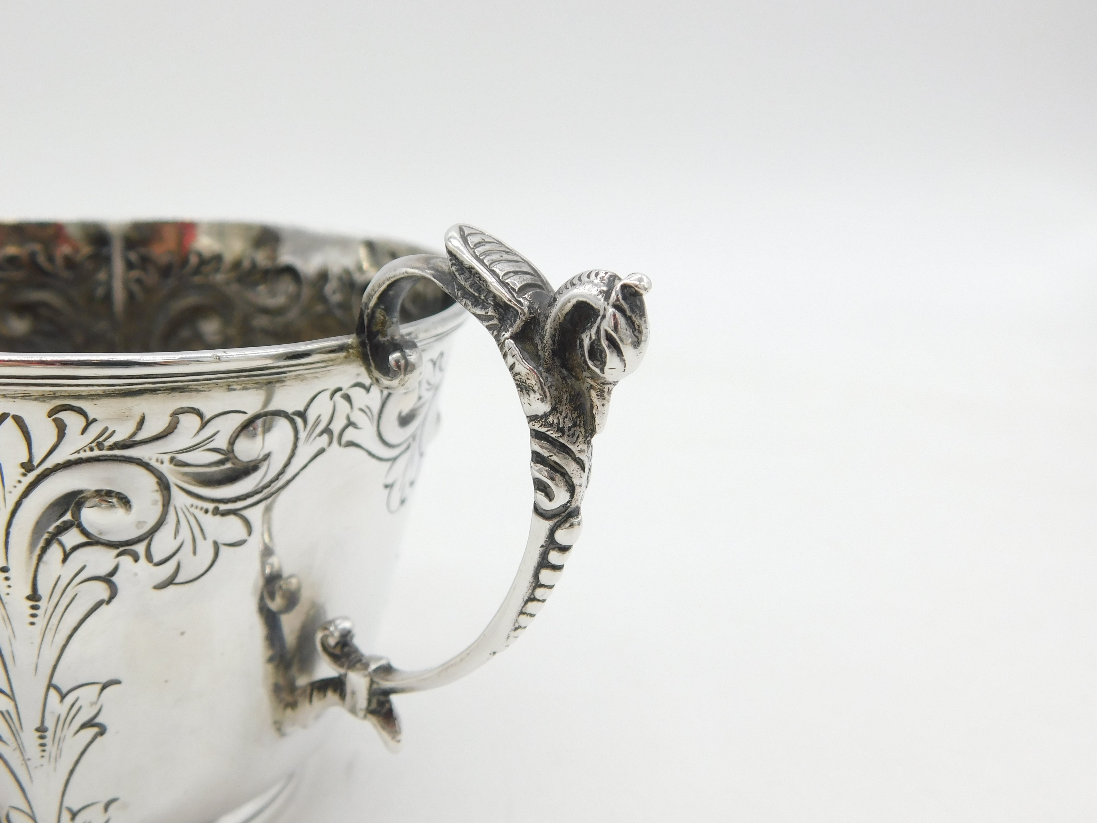 Details: A fantastic and wonderfully designed antique Edwardian sterling silver floral pattern porringer with lovely detailing hallmarked London 1902 by Goldsmiths & Silversmiths Co. Ltd. This is a wonderful item that would make a perfect gift or addition to any collection.