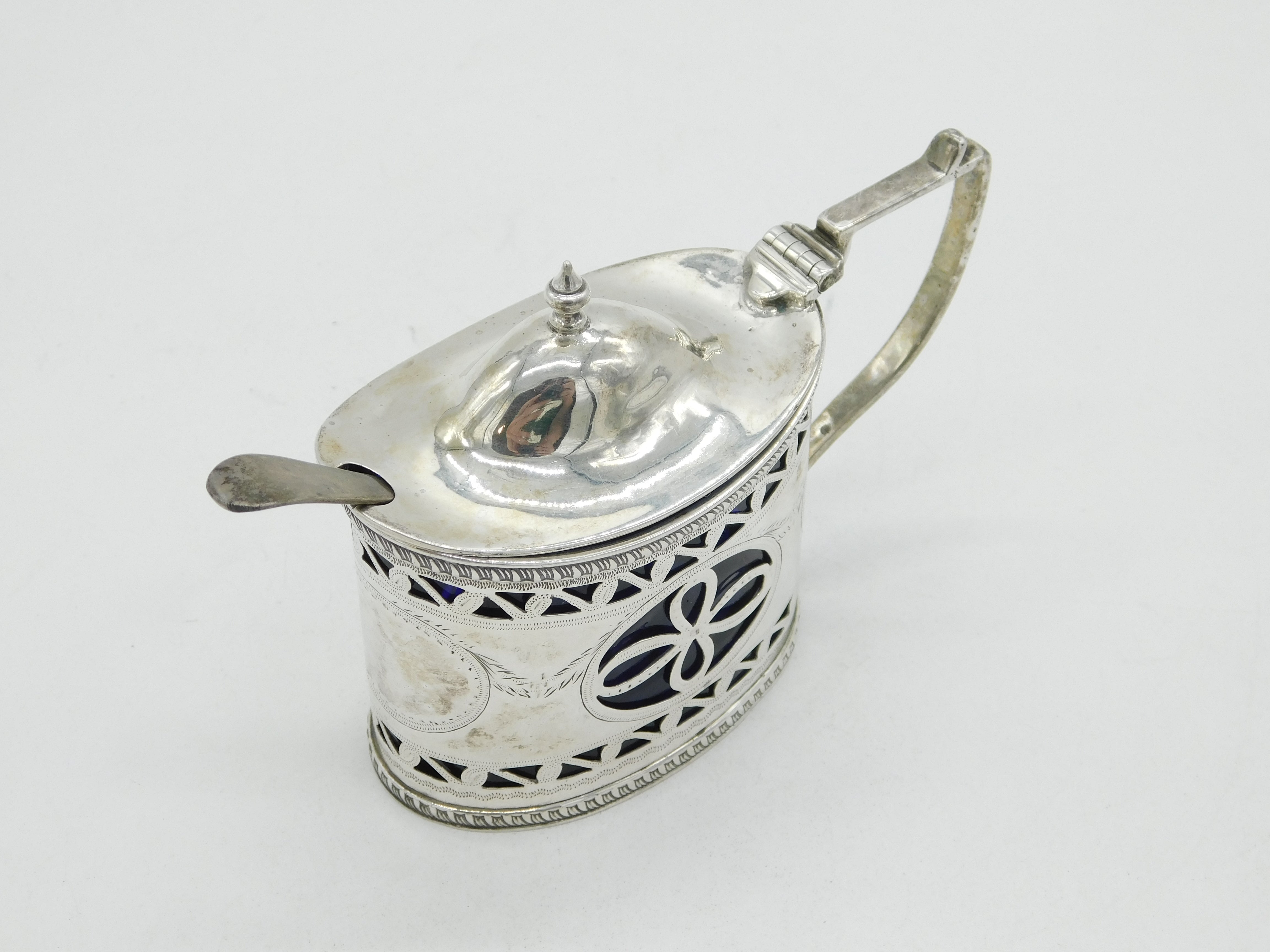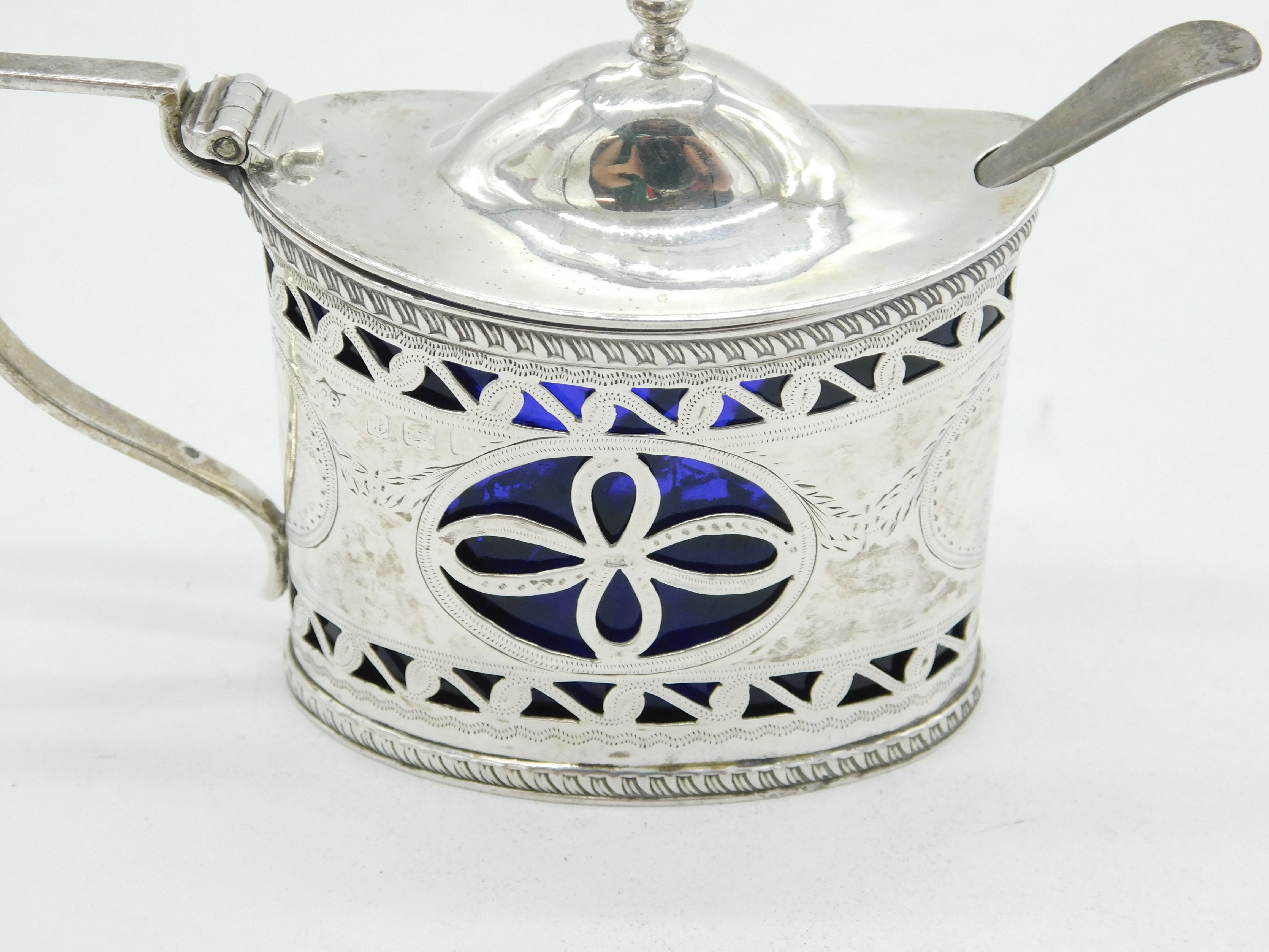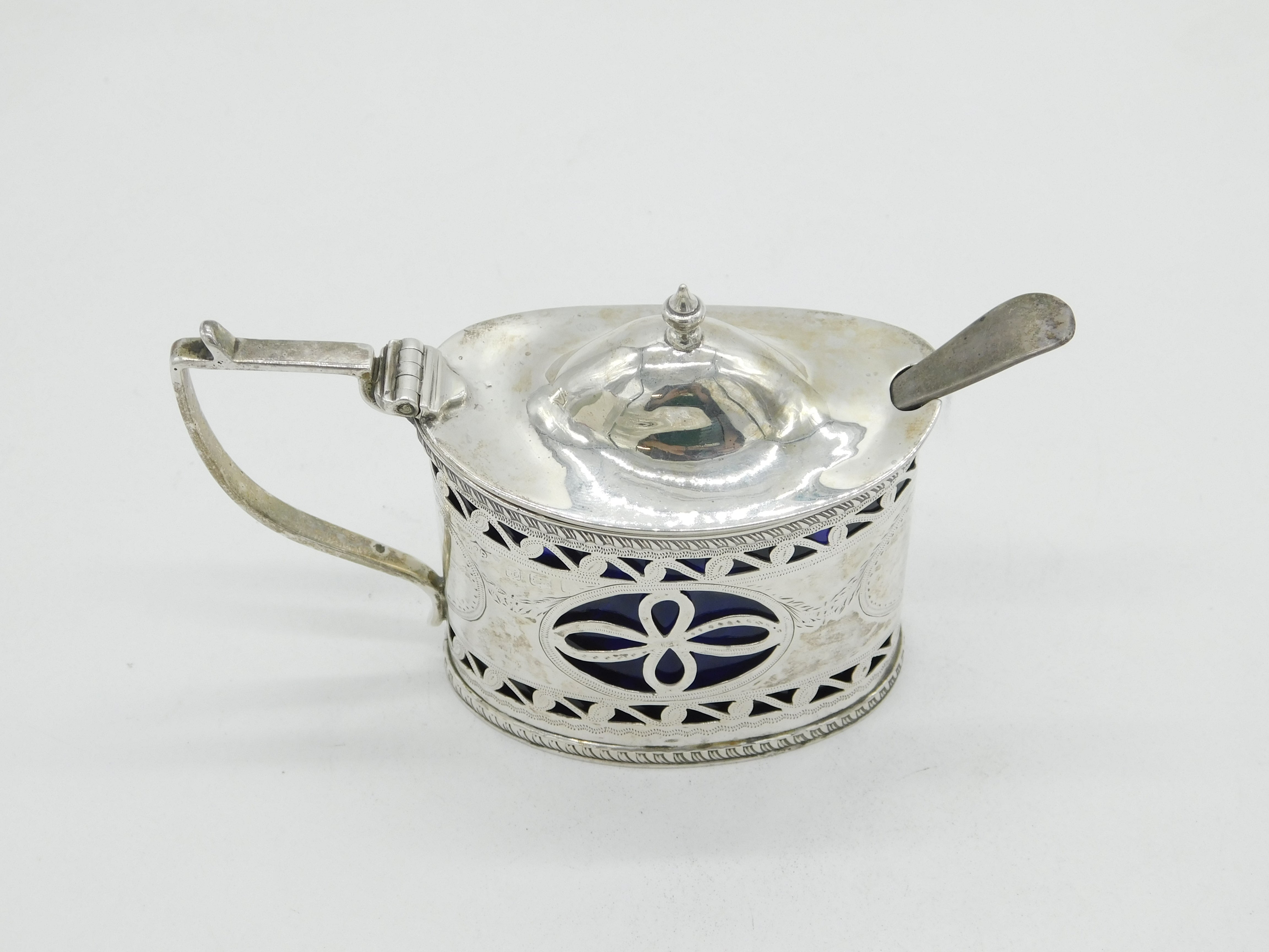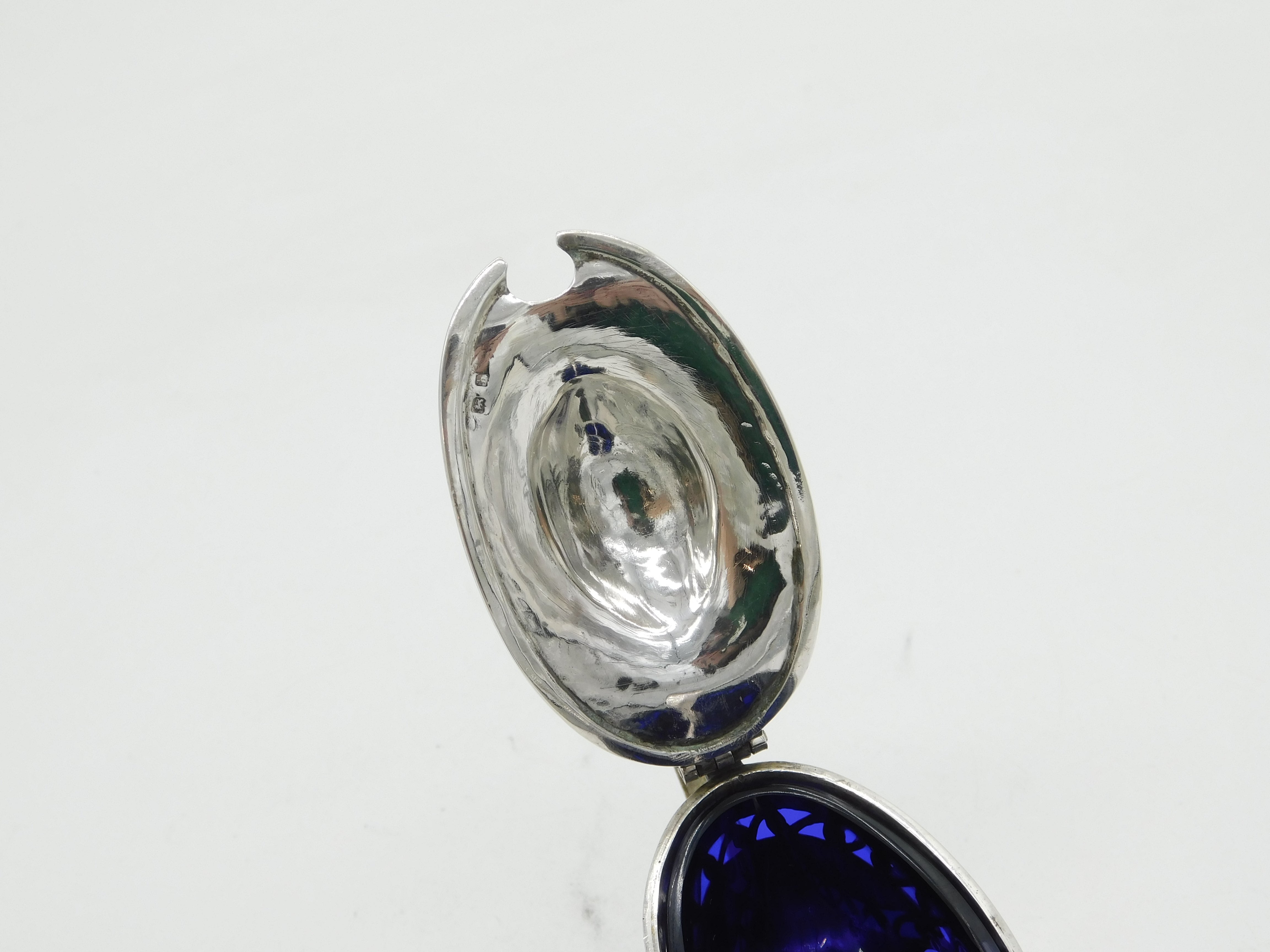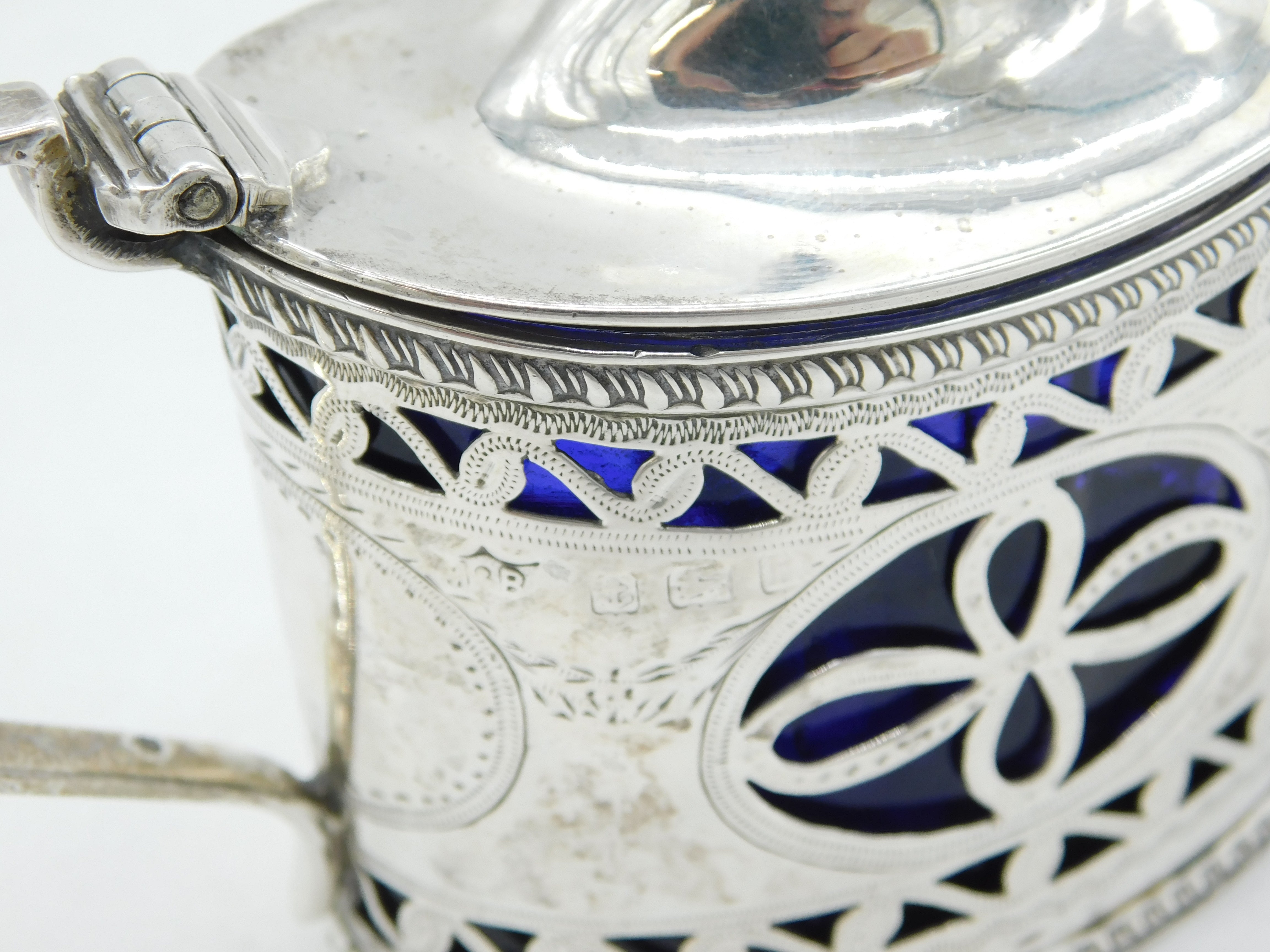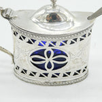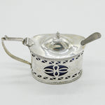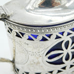 Details: A fantastic and wonderfully designed antique Edwardian sterling silver pierced floral mustard pot with lovely blue glass liner hallmarked Birmingham 1907 to the edge. This is a wonderful item that would make a perfect gift or addition to any collection. We are more than happy to provide XRF reports for items upon request.