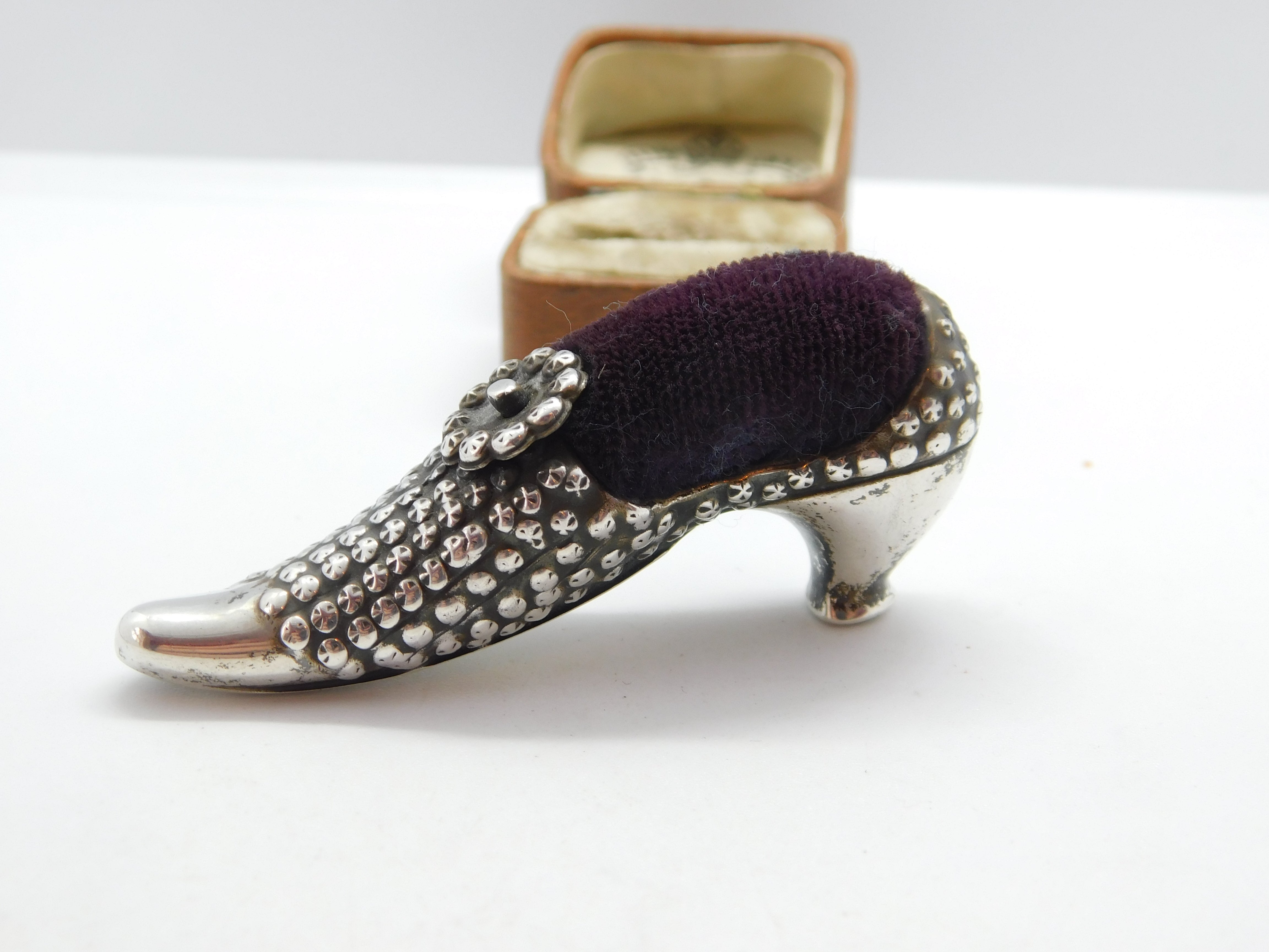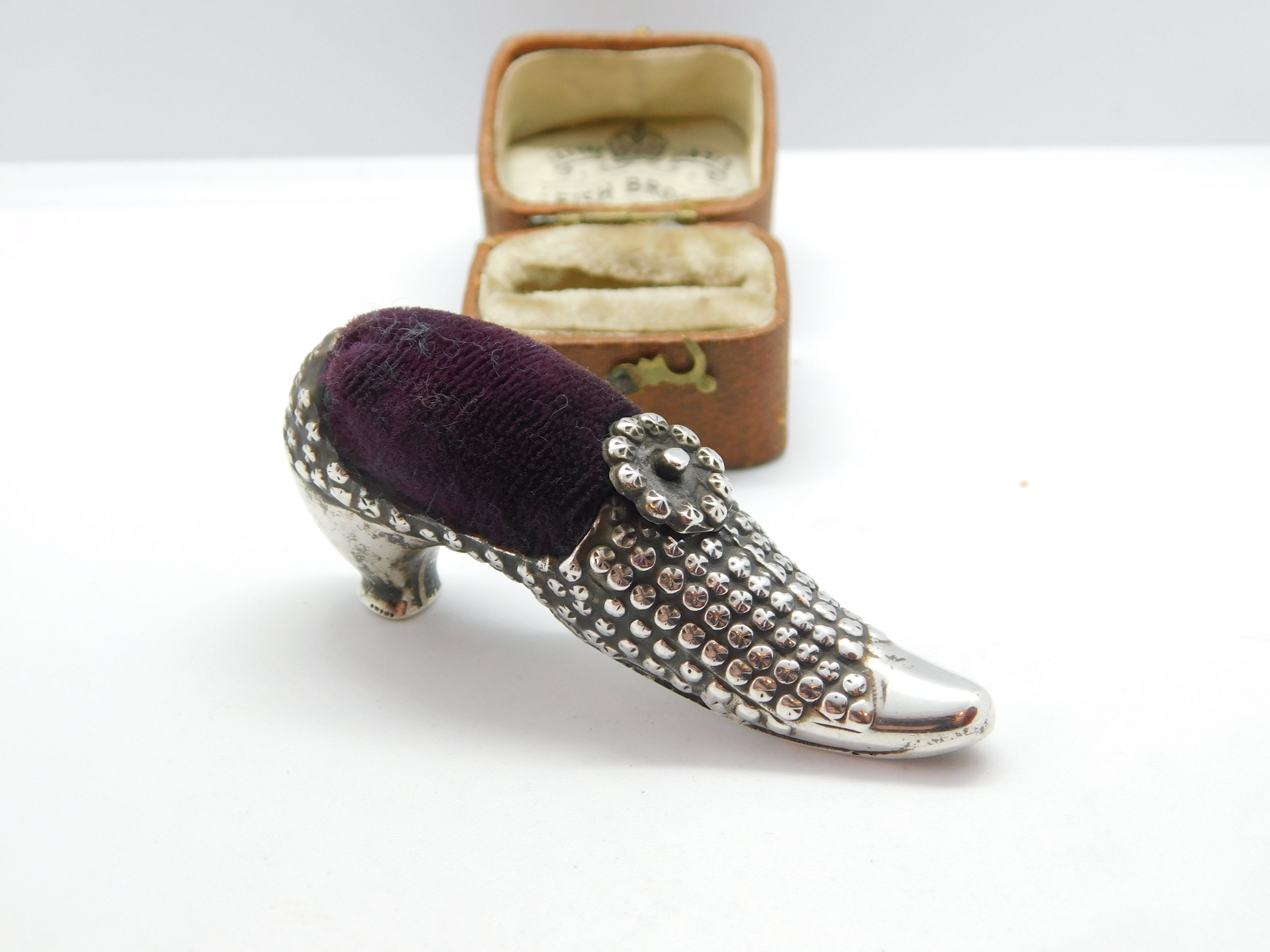 Details: A fantastic and wonderfully designed antique Edwardian sterling silver novelty pin cushion depicting a high heeled shoe with lovely detailing hallmarked Birmingham c1905 to the edge. This is a wonderful item that would make a perfect gift or addition to any collection. The BOX pictured is for PRESENTATION ONLY and is NOT included in the listings but used to frame the pictures unless specifically stated otherwise.