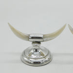 Two silver candle holders with long white horns on a light gray background