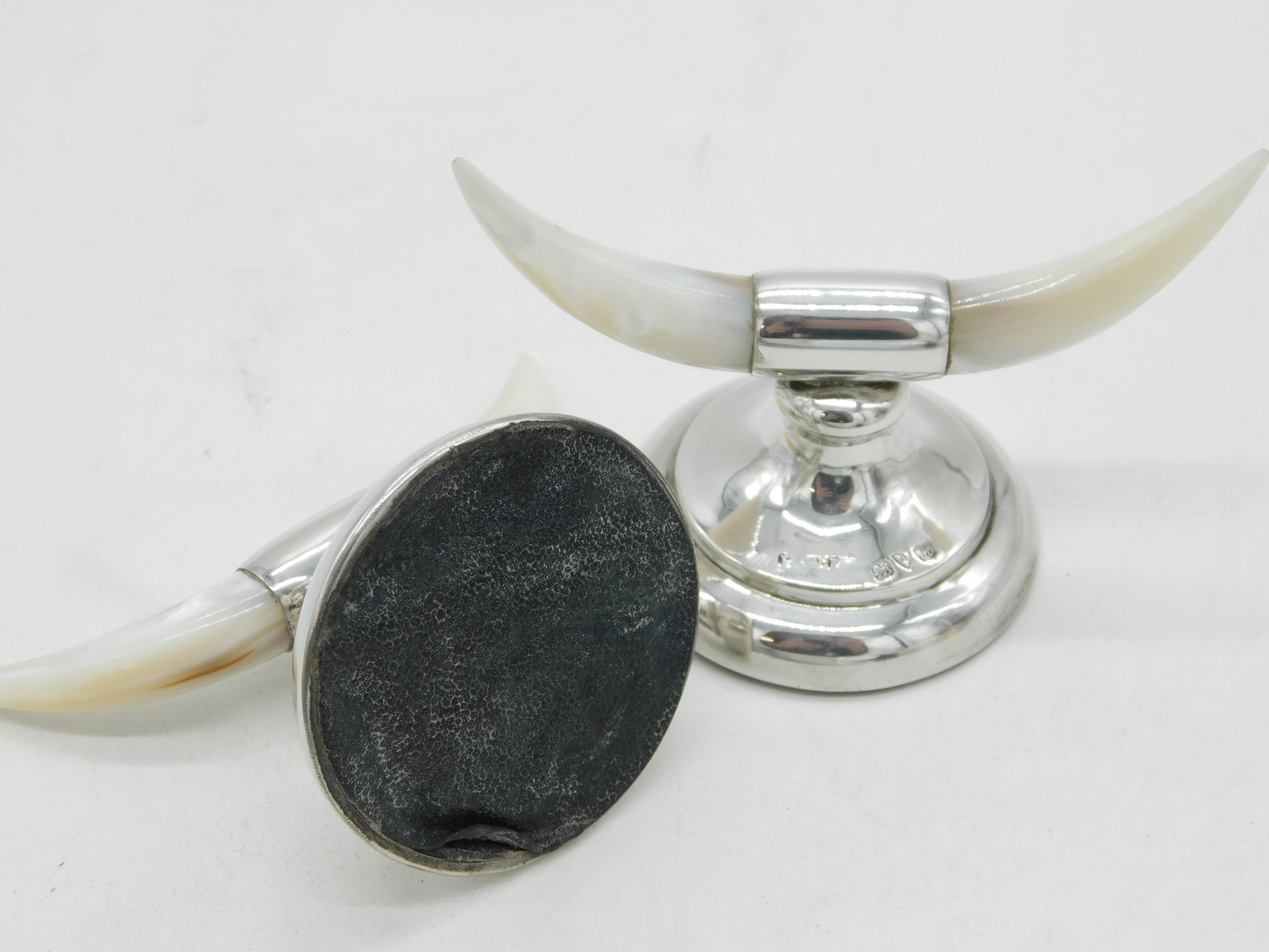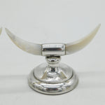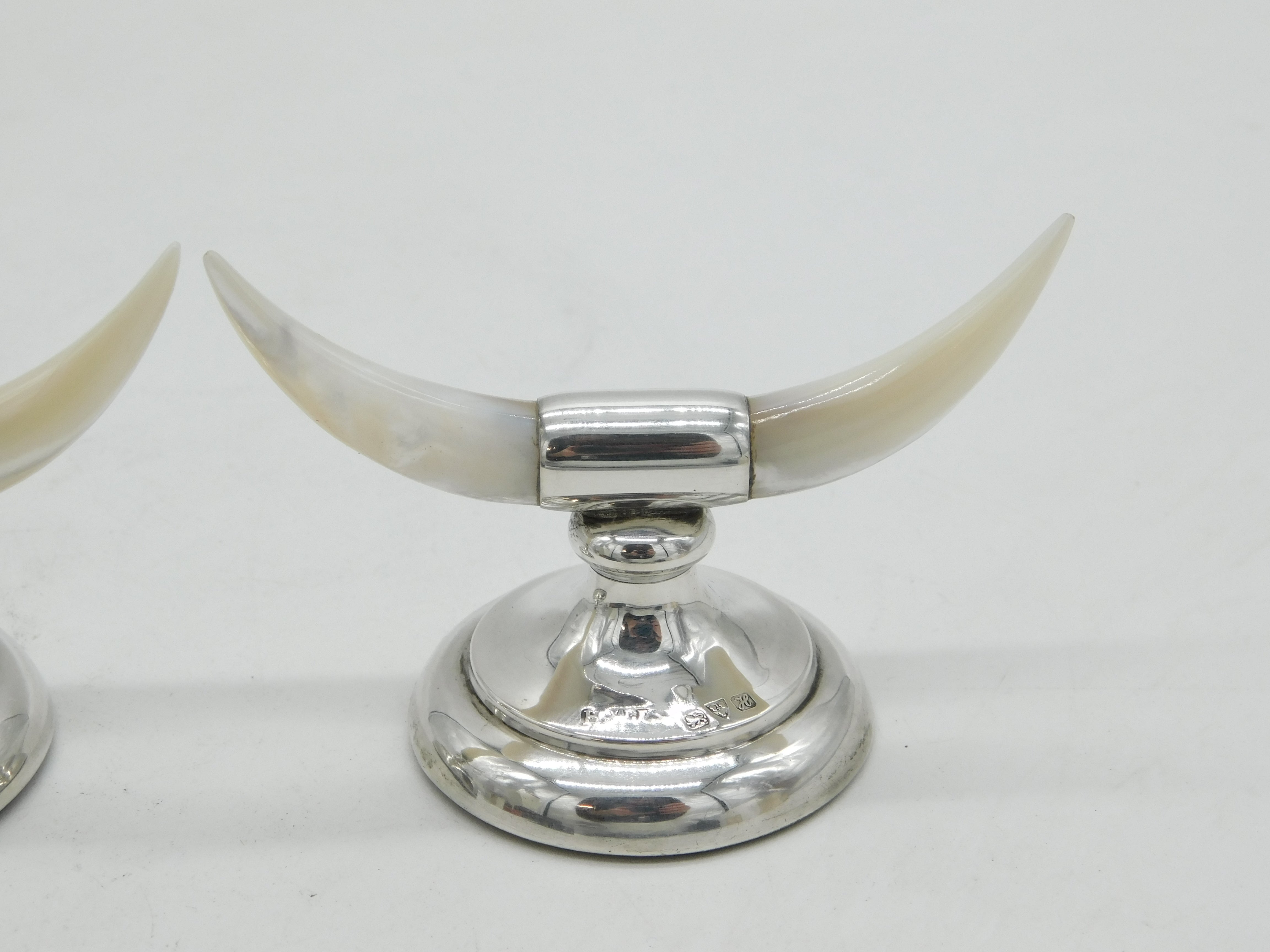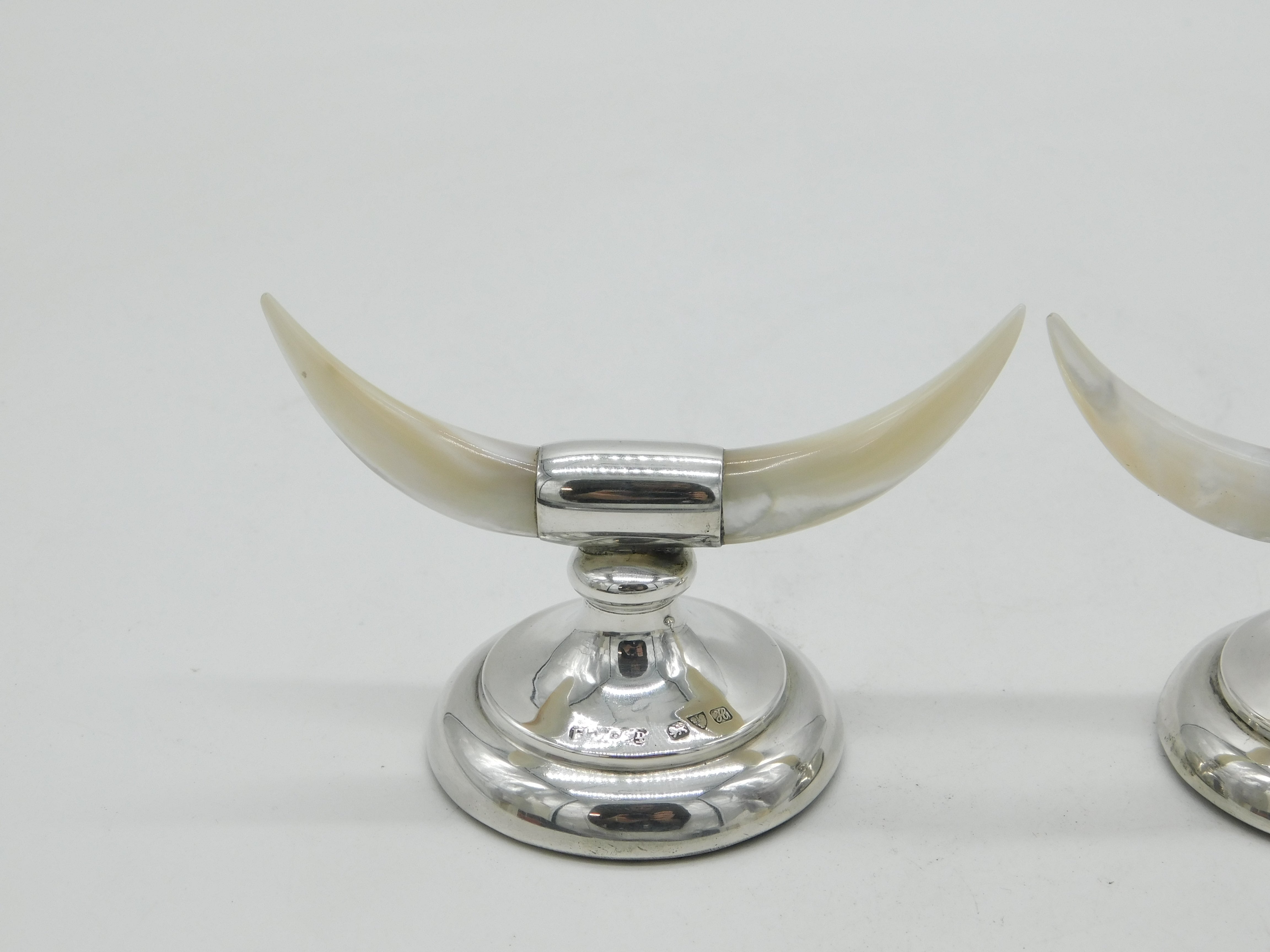 Details: A fantastic and wonderfully designed pair of antique Edwardian sterling silver & mother of pearl cutlery rests in the form of cows horns hallmarked Chester 1908 by Henry Williamson Ltd, weighted to the base. This is a wonderful item that would make a perfect gift or addition to any collection.