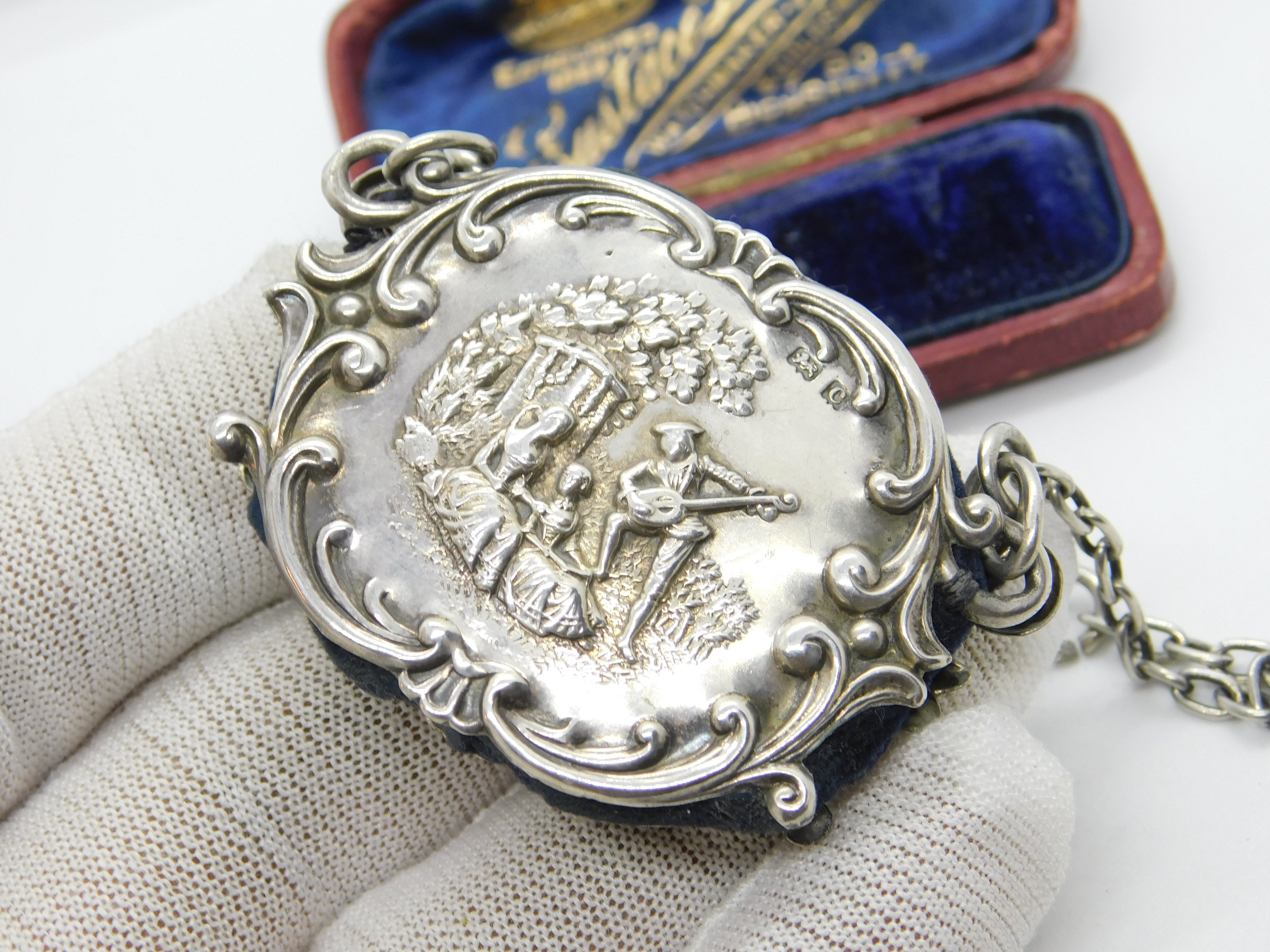 Details: A fantastic and wonderfully designed antique Edwardian sterling silver pin cushion with superb romantic lute player scene pattern hallmarked Birmingham 1902 to both sides. This is a wonderful item that would make a perfect gift or addition to any collection. The BOX pictured is for PRESENTATION ONLY and is NOT included in the listings but used to frame the pictures unless specifically stated otherwise.