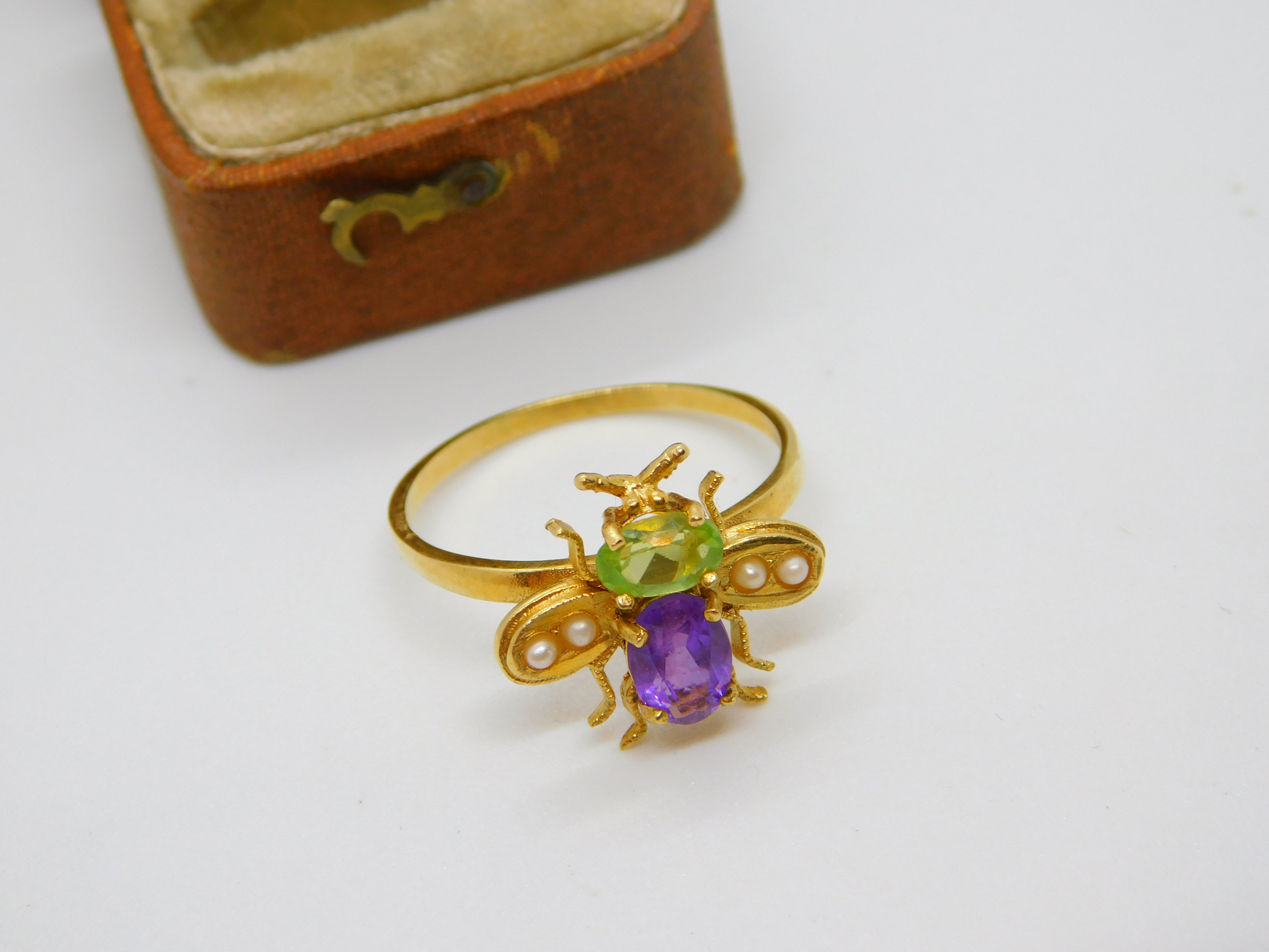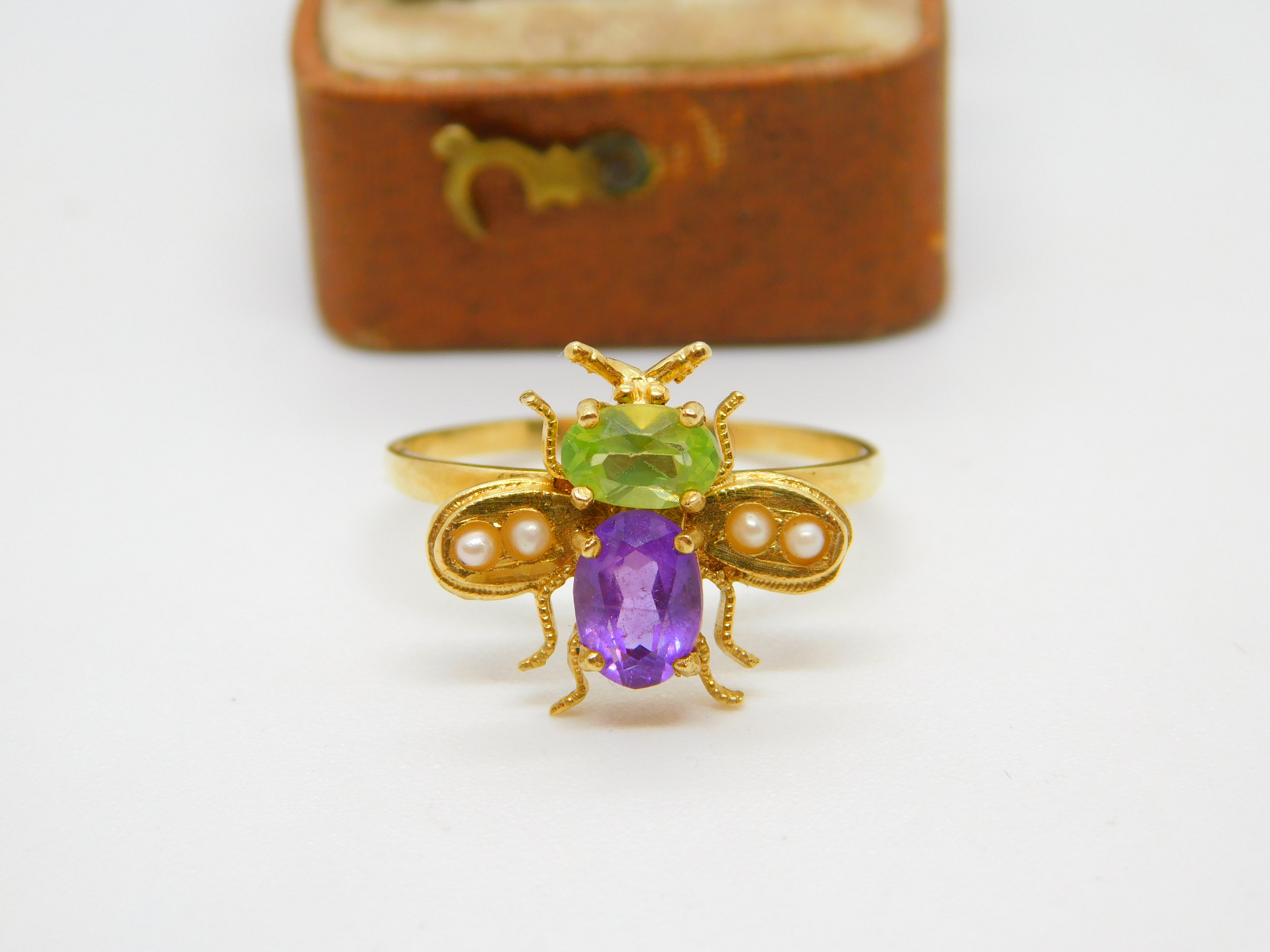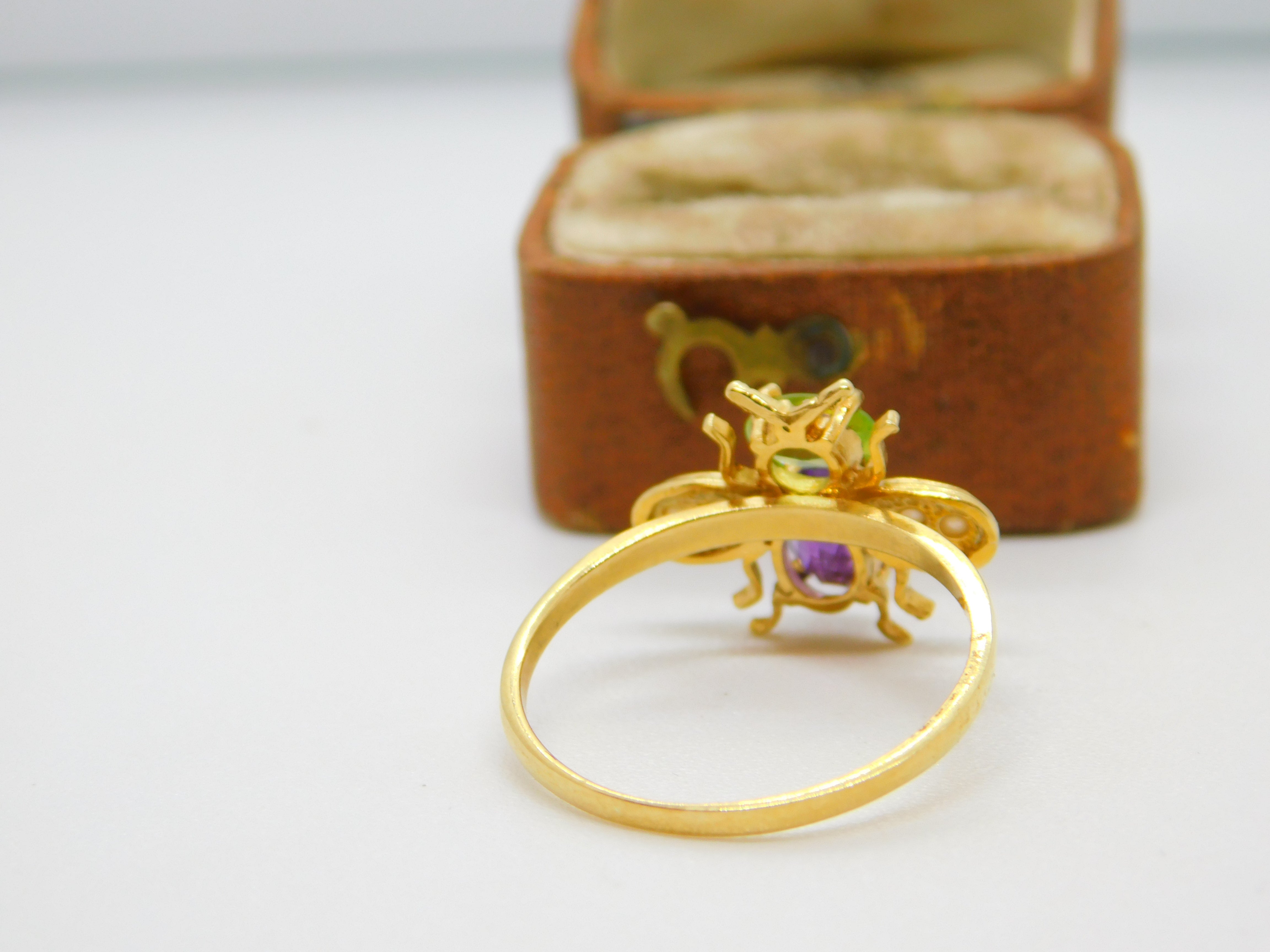 Details: A fantastic and wonderfully designed vintage Edwardian style sterling silver gilt suffragette bug or insect ring set with green peridot, purple amethyst and seed pearl the colours representing the suffragette movement hallmarked to the interior band c1980. This is a wonderful item that would make a perfect gift or addition to any collection. The BOX pictured is for PRESENTATION ONLY and is NOT included in the listings but used to frame the pictures unless specifically stated otherwise.