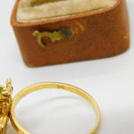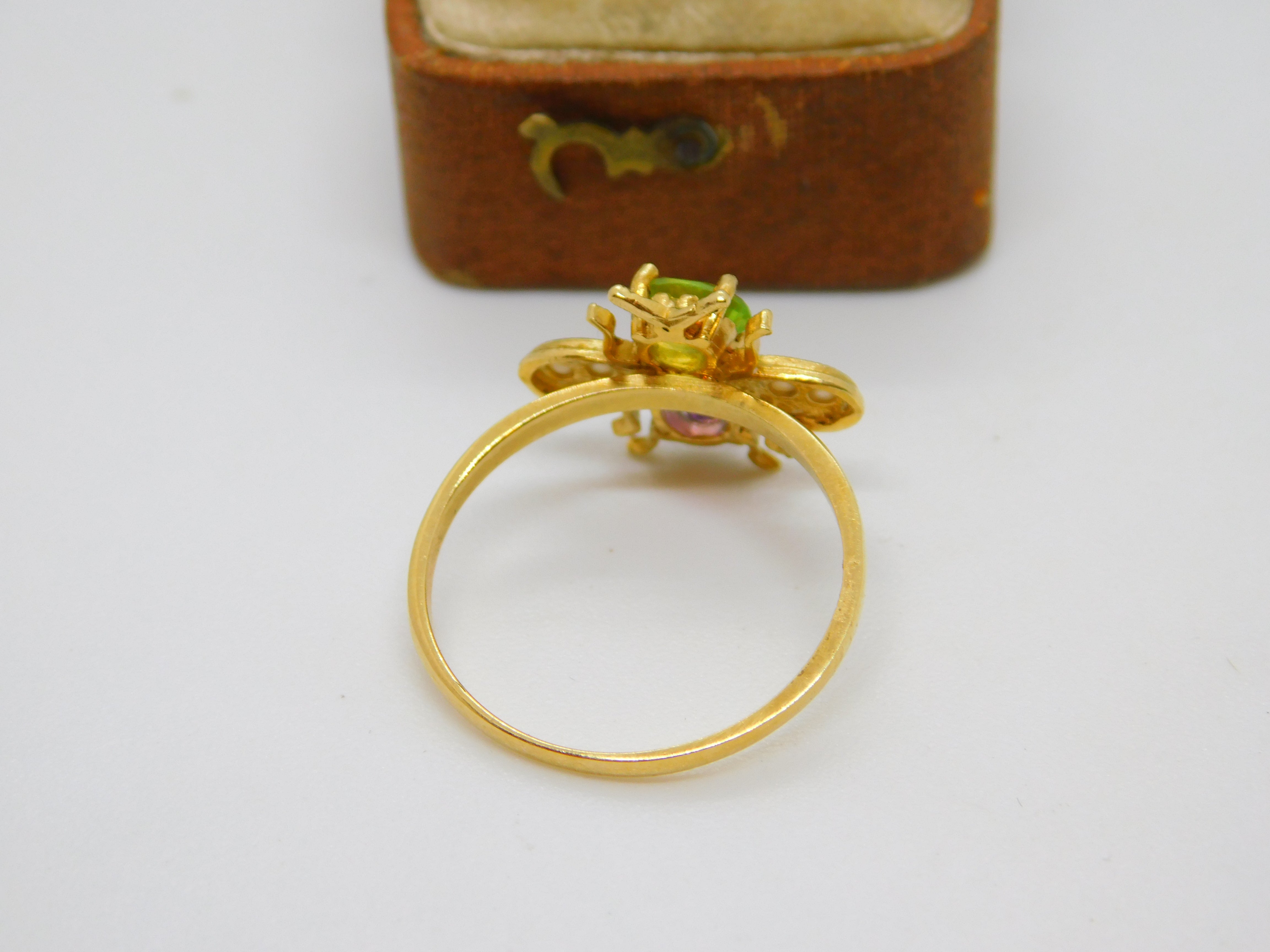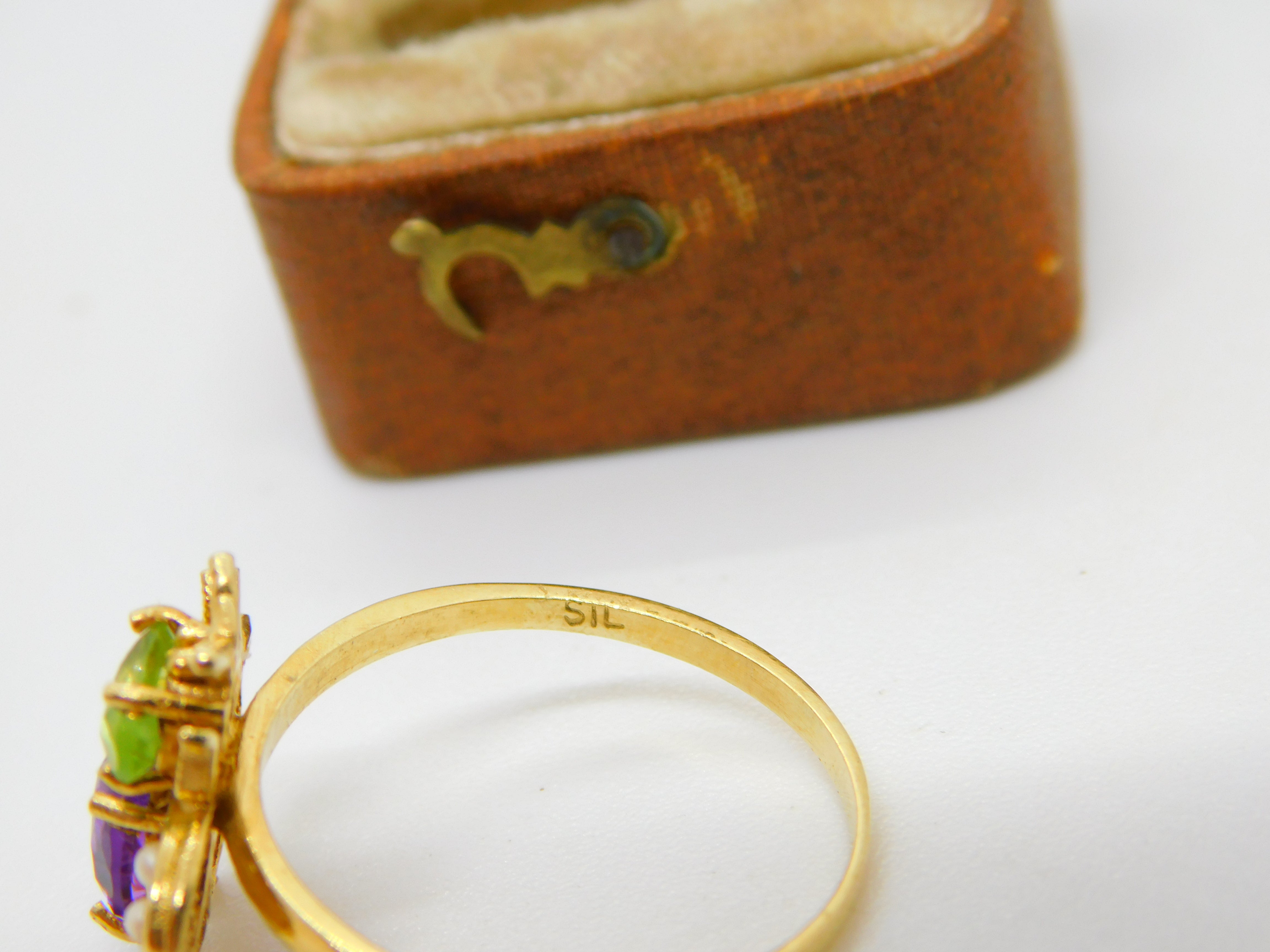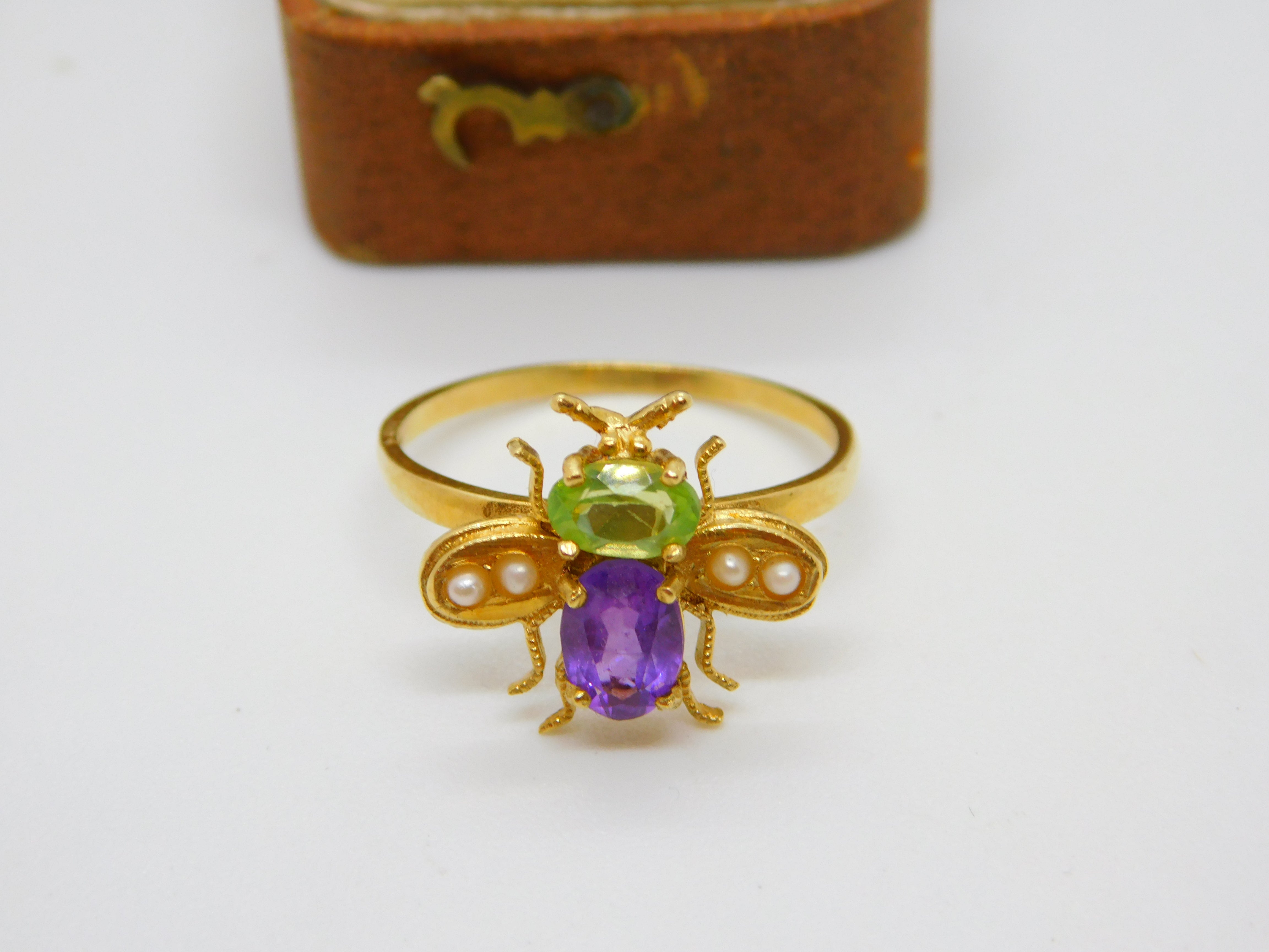 Details: A fantastic and wonderfully designed vintage Edwardian style sterling silver gilt suffragette bug or insect ring set with green peridot, purple amethyst and seed pearl the colours representing the suffragette movement hallmarked to the interior band c1980. This is a wonderful item that would make a perfect gift or addition to any collection. The BOX pictured is for PRESENTATION ONLY and is NOT included in the listings but used to frame the pictures unless specifically stated otherwise.