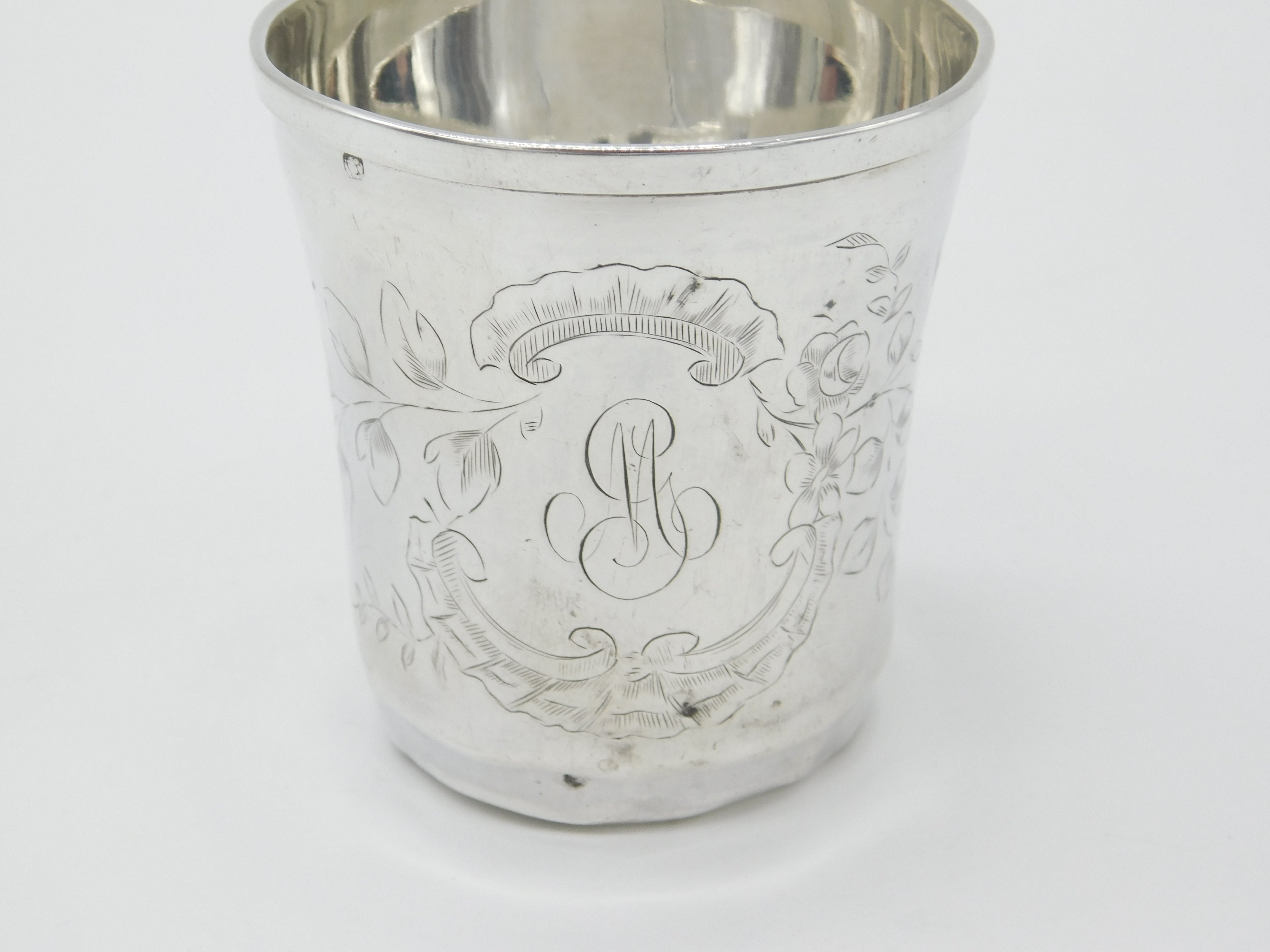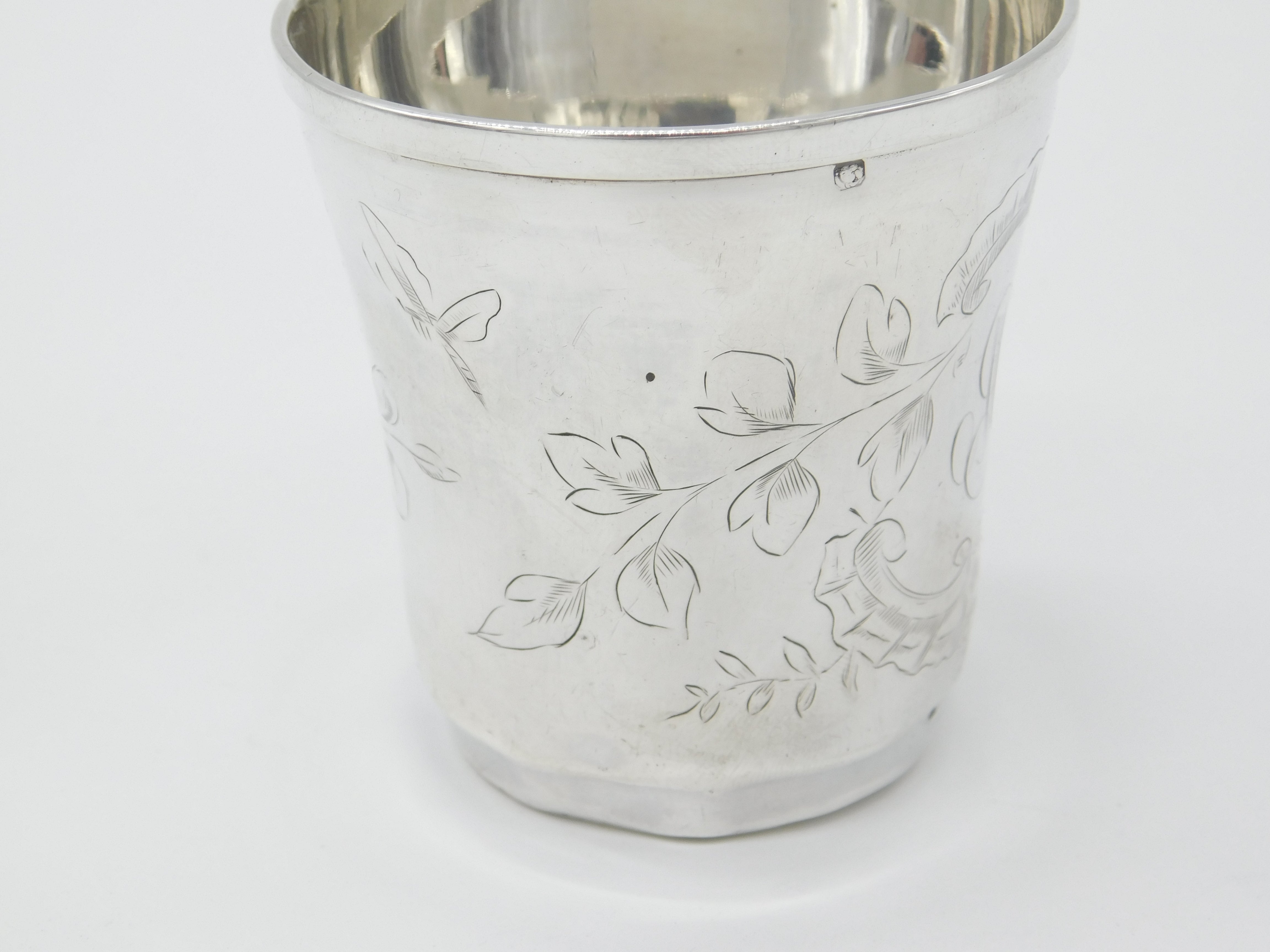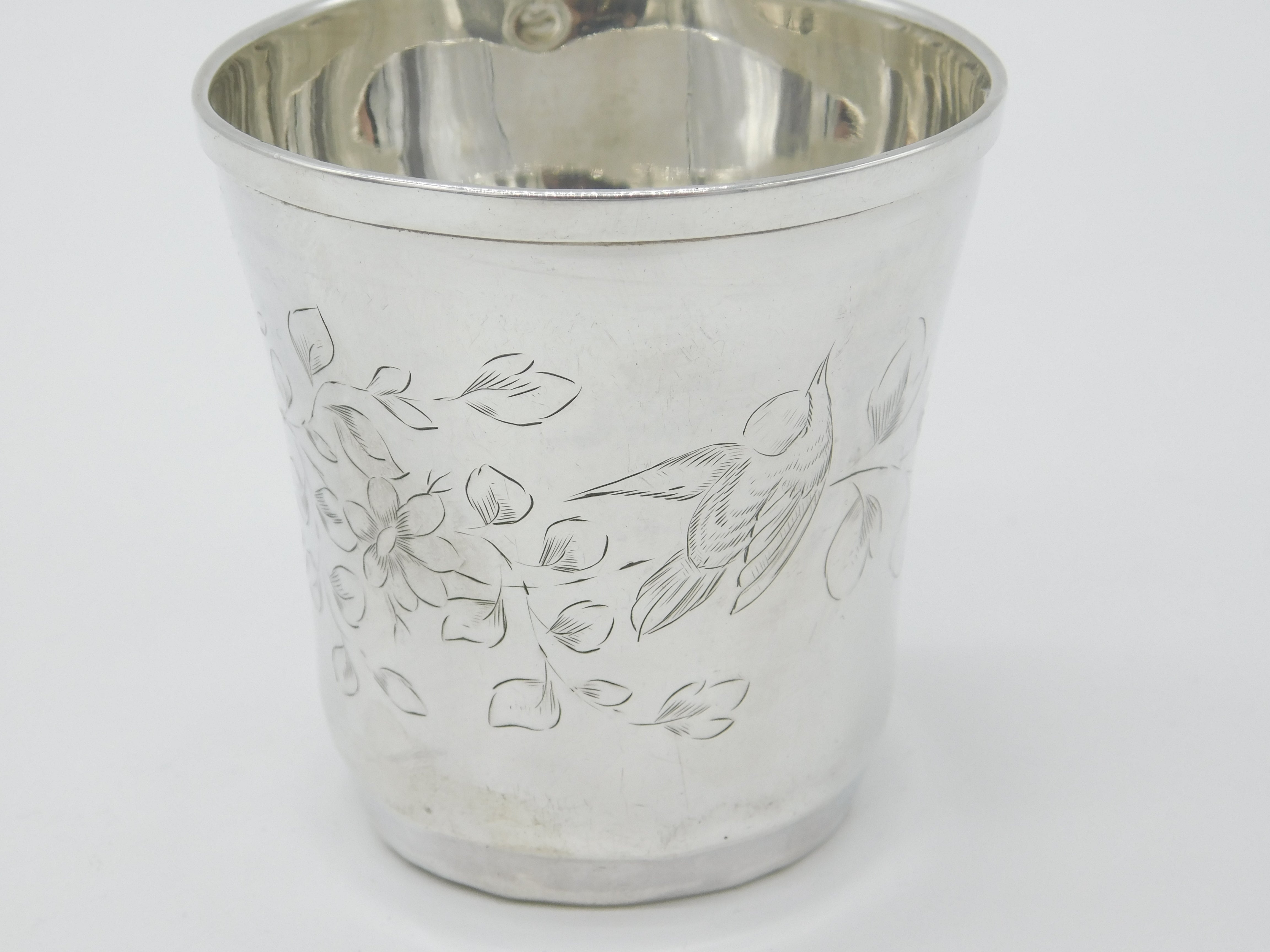 Details: A fantastic and wonderfully designed antique art nouveau French aesthetic sterling silver beaker with lovely etched bird and floral detail hallmarked with a makers mark to the base and French mark to the rim. Fairly dented please see pictures but sweet nonetheless. This is a wonderful item that would make a perfect gift or addition to any collection. The BOX pictured is for PRESENTATION ONLY and is NOT included in the listings but used to frame the pictures unless specifically stated otherwise.