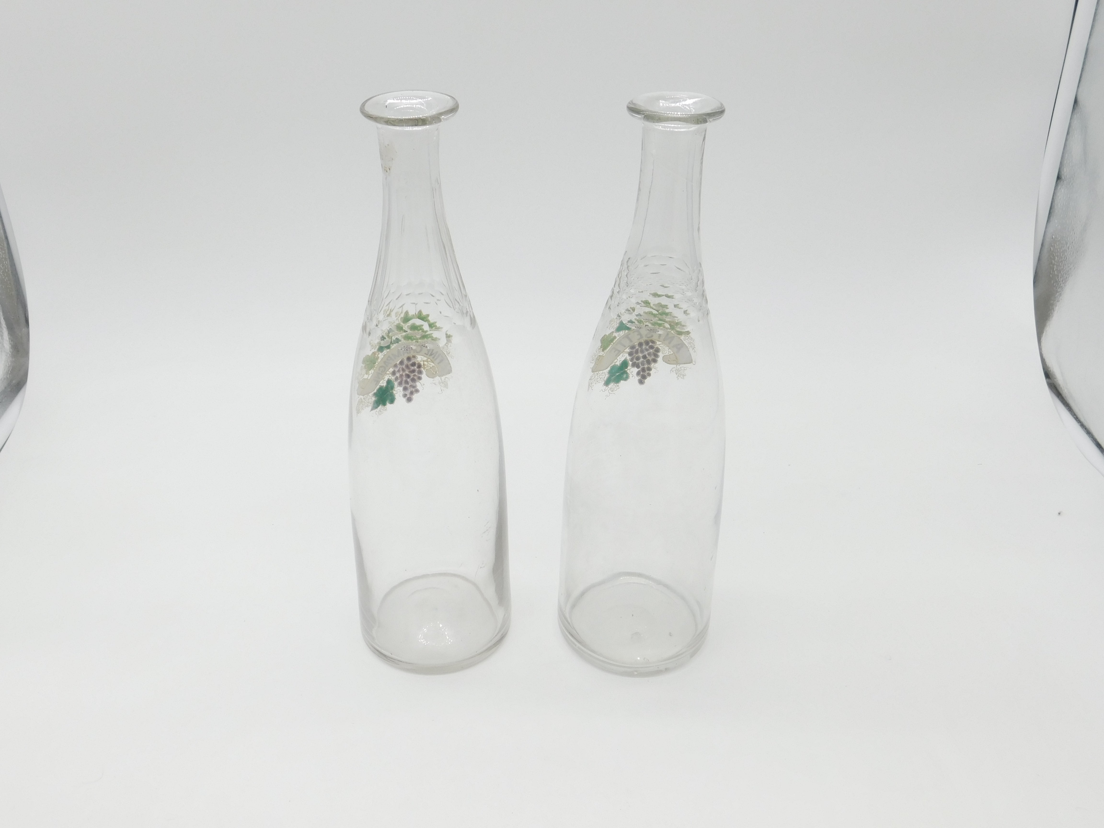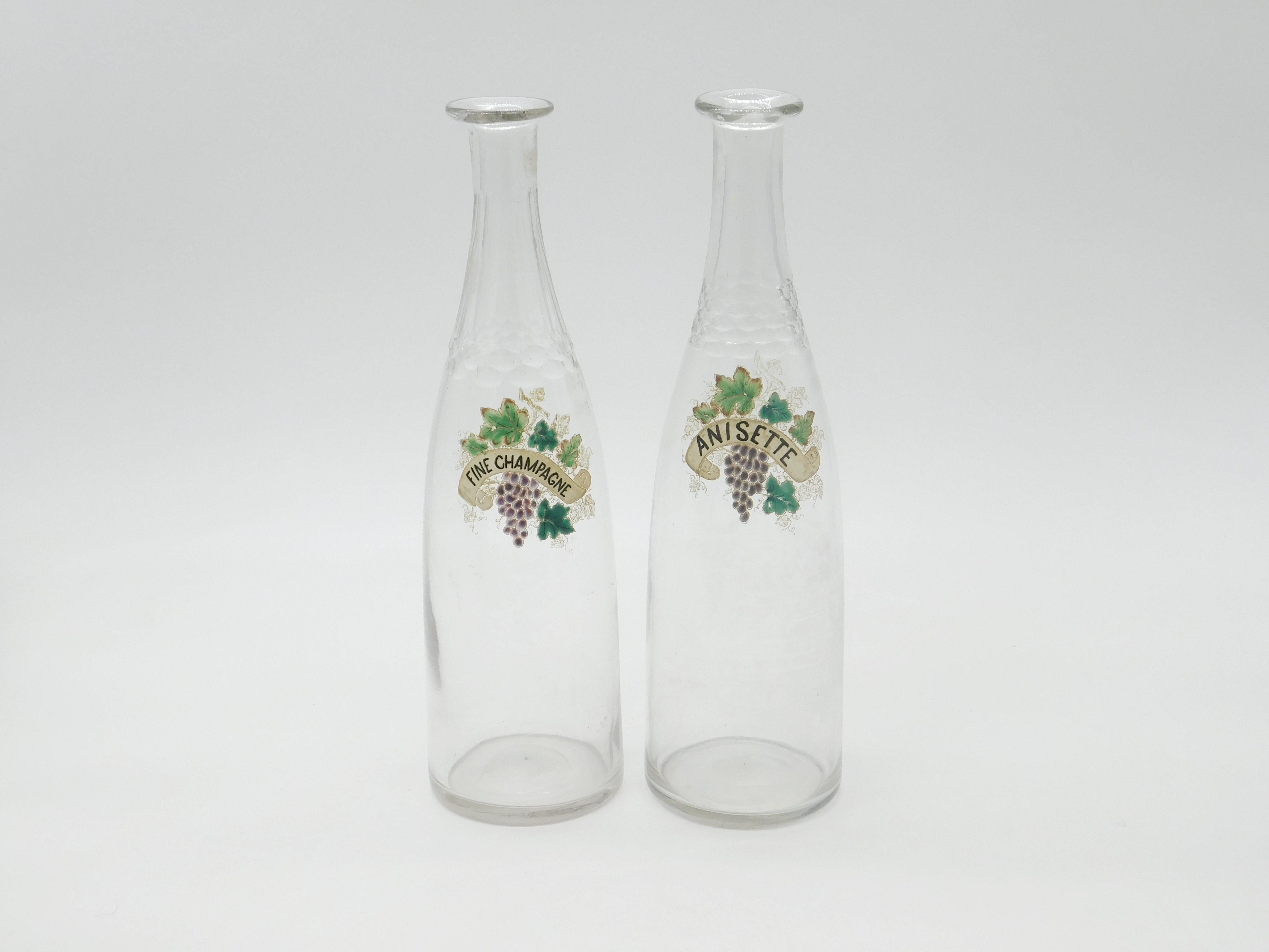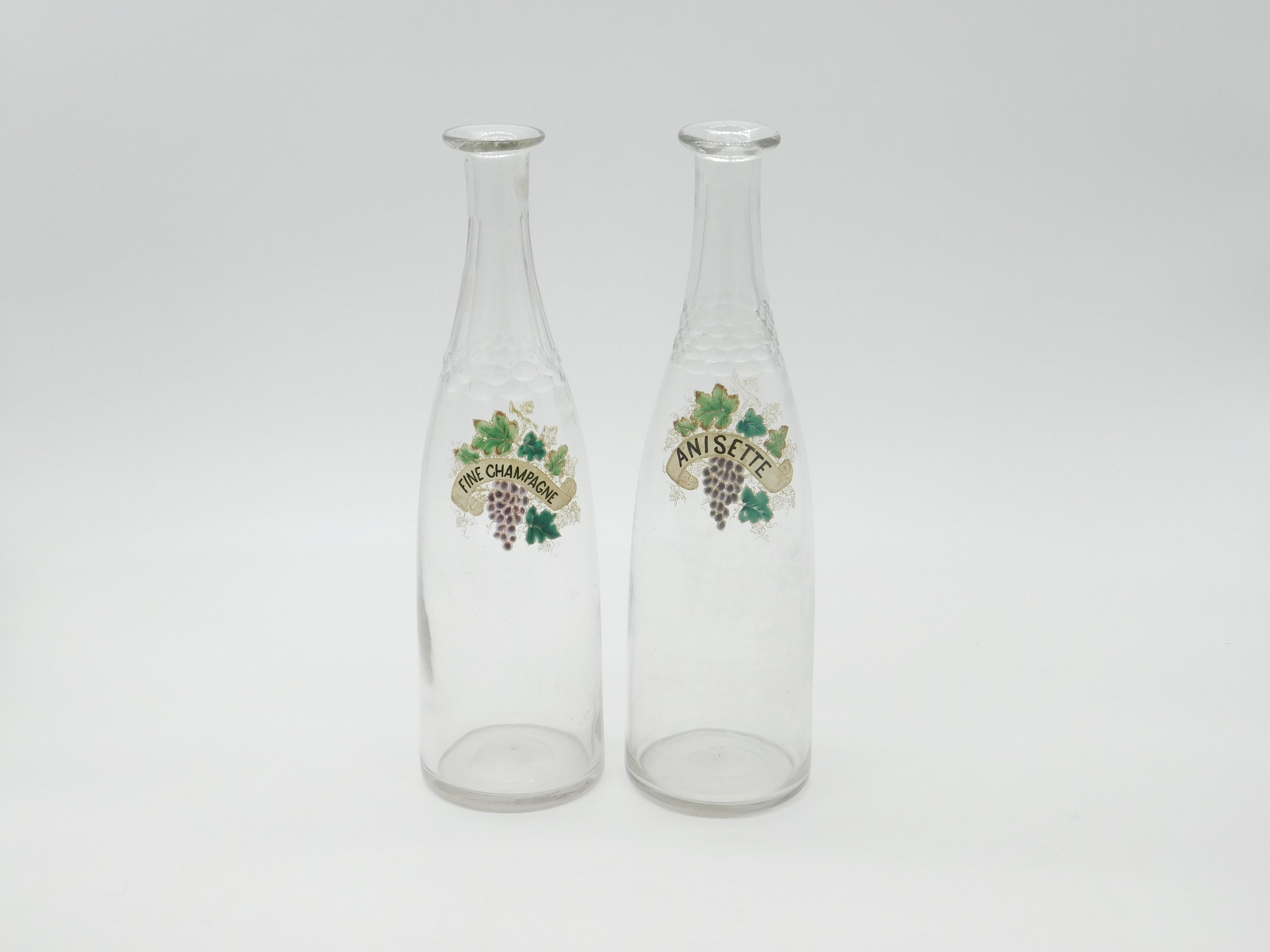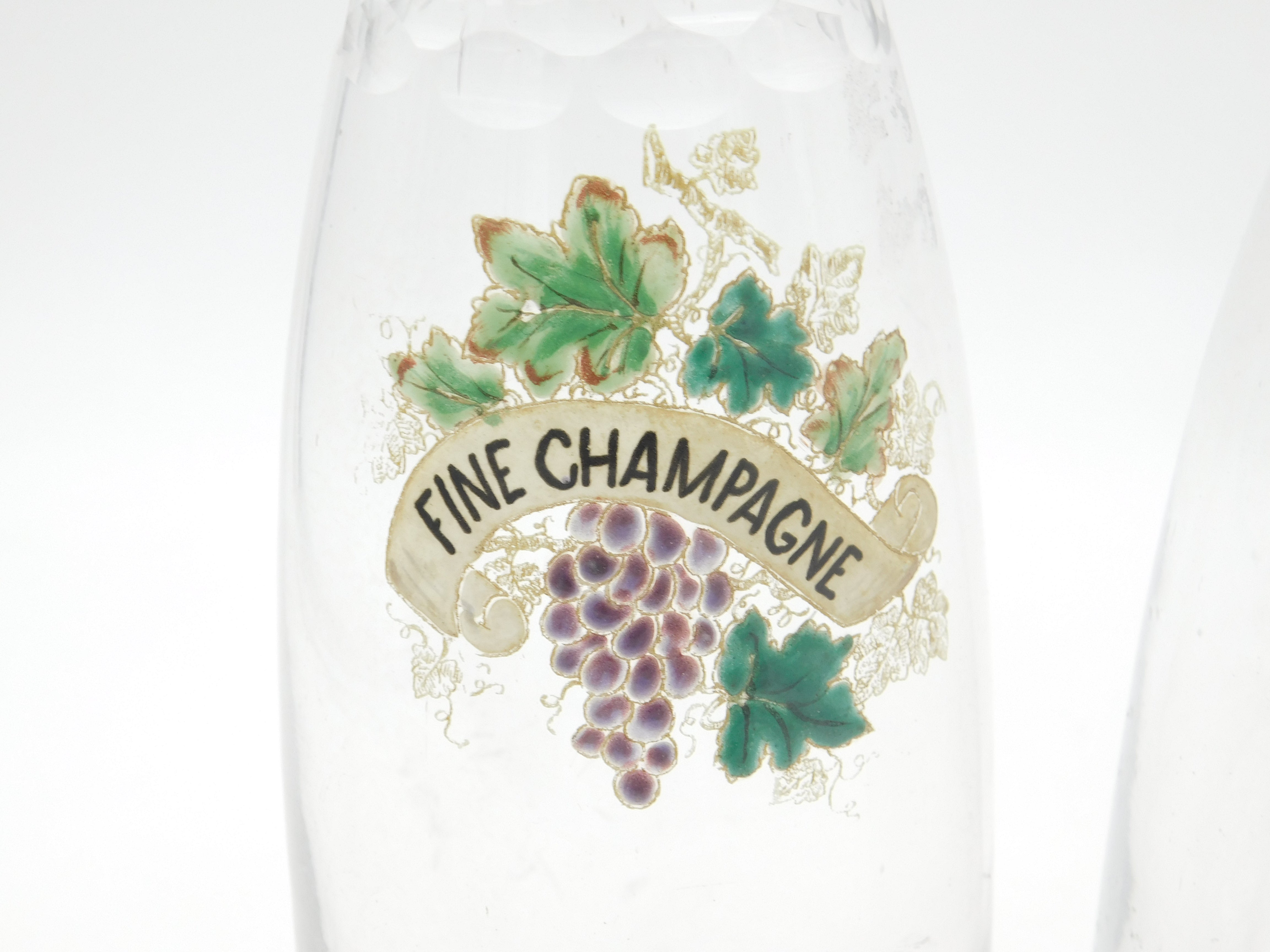 French Pair of Victorian Glass & Enamel 'Fine Champagne' & 'Anisette' Carafes