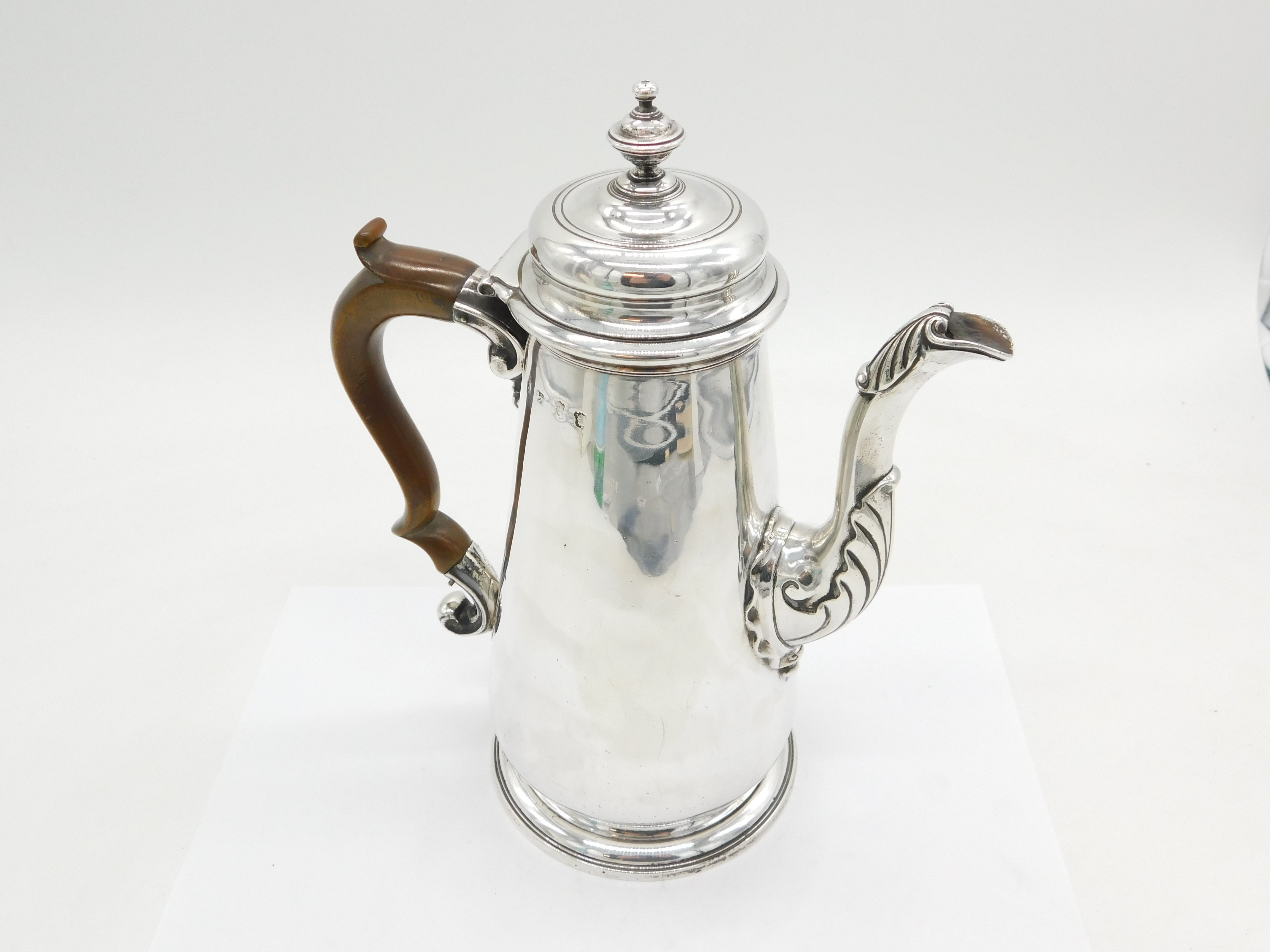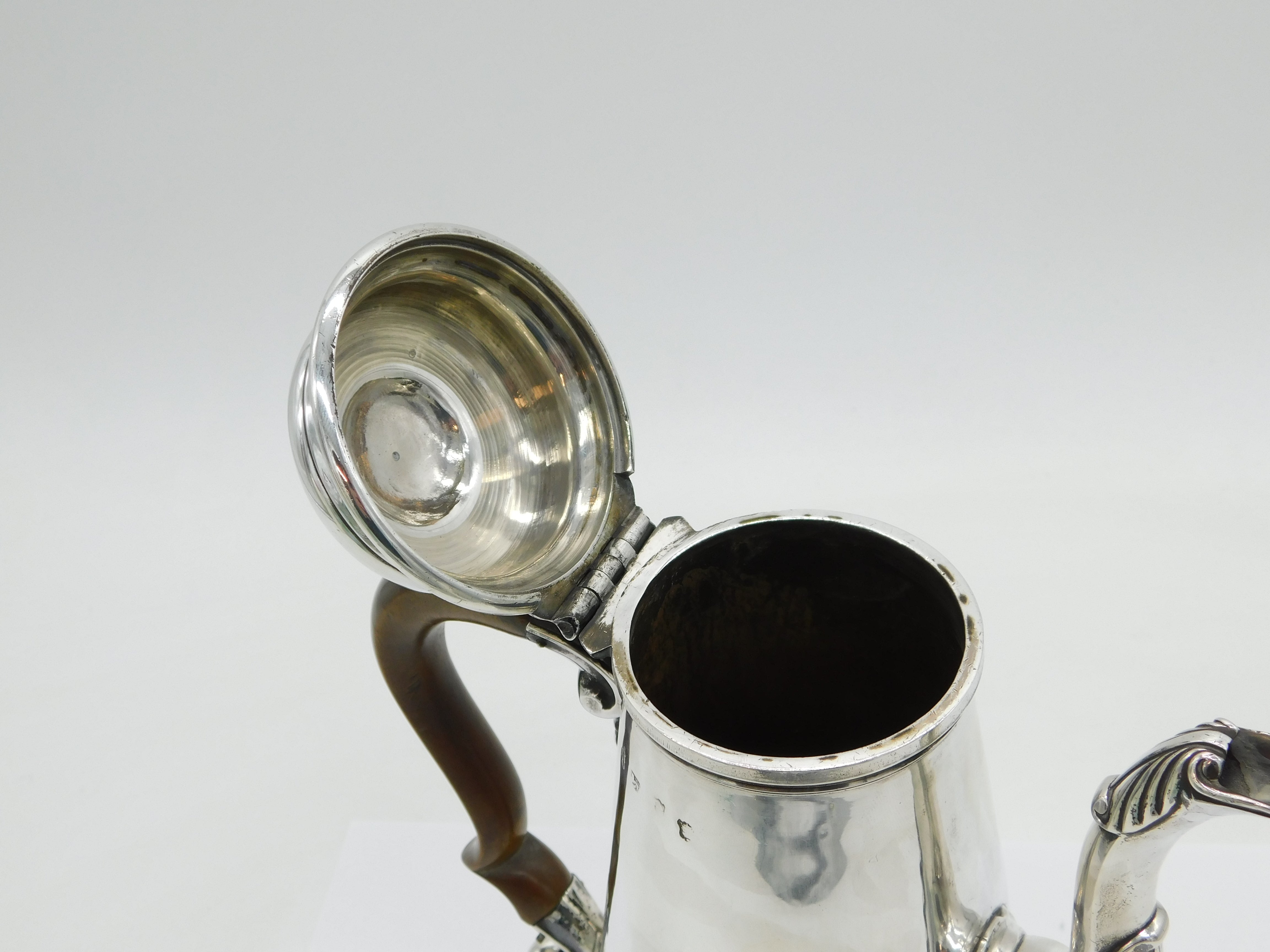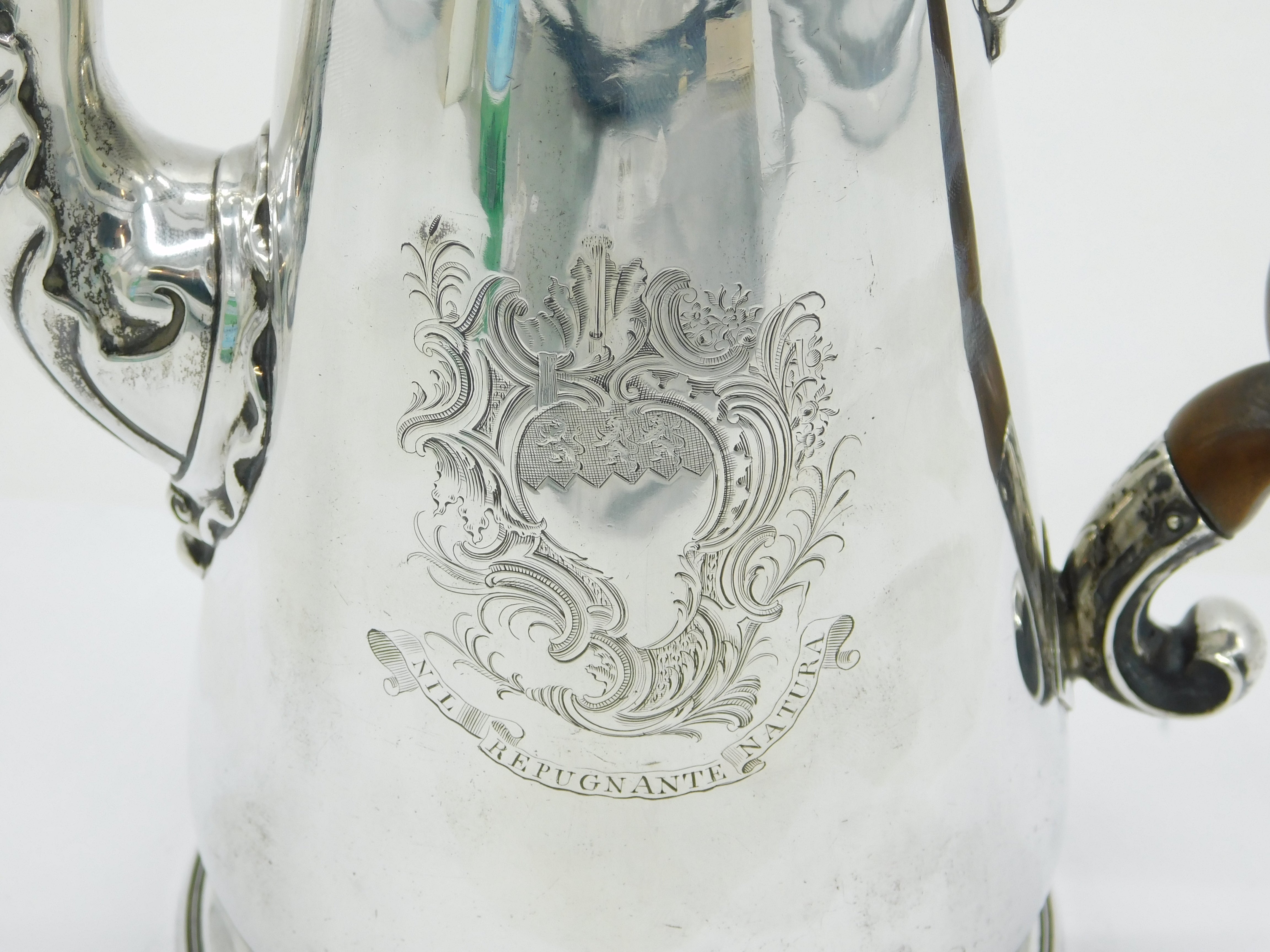 Details: A fantastic and wonderfully designed antique early-georgian large sterling silver coffee pot with superb armorial crest to the front edge, turned wooden handle, scrolled decoration to the spout, hallmarked London 1740 with rubbed makers marks. This is a wonderful item that would make a perfect gift or addition to any collection. We are more than happy to provide XRF reports for items upon request.