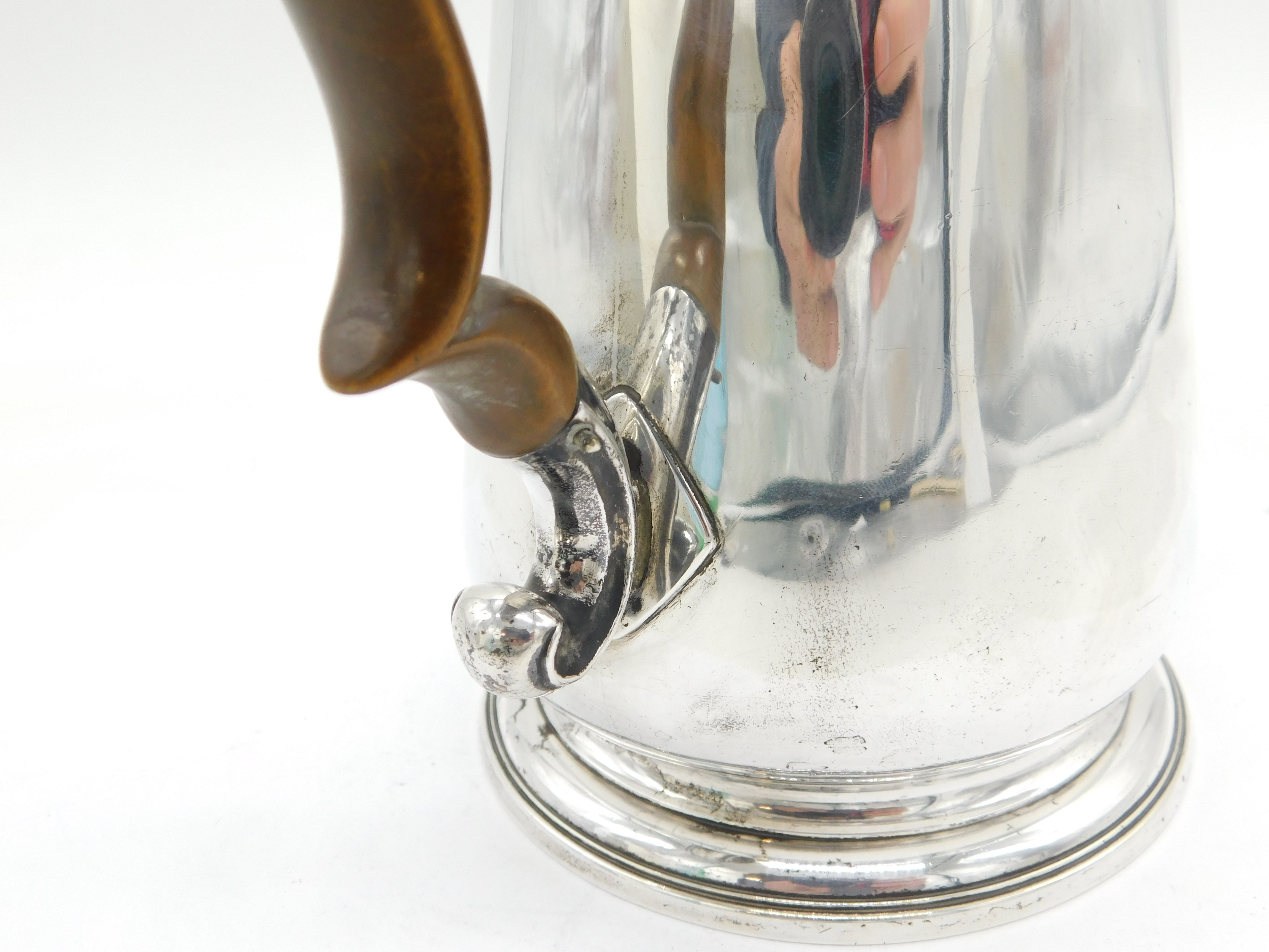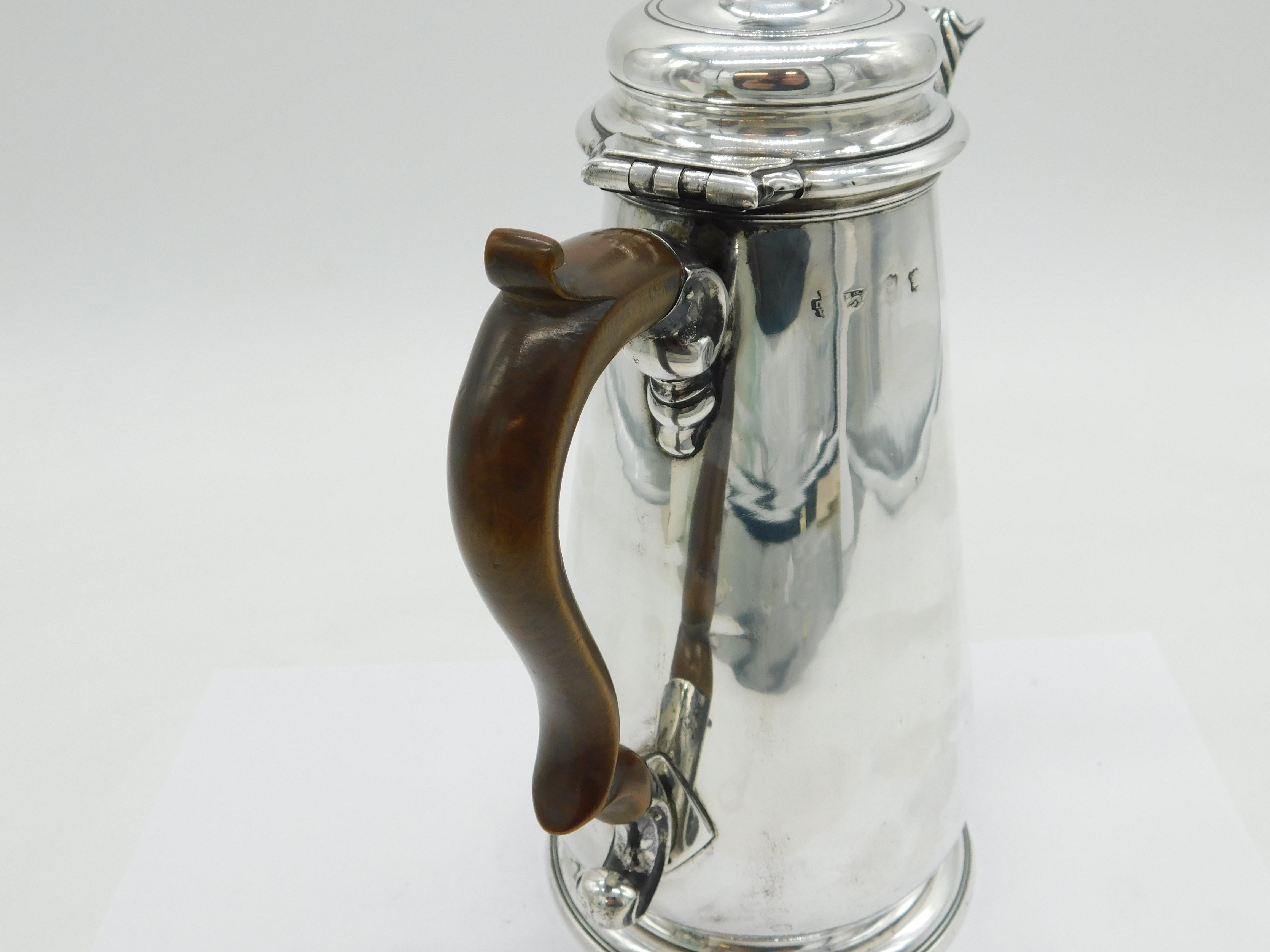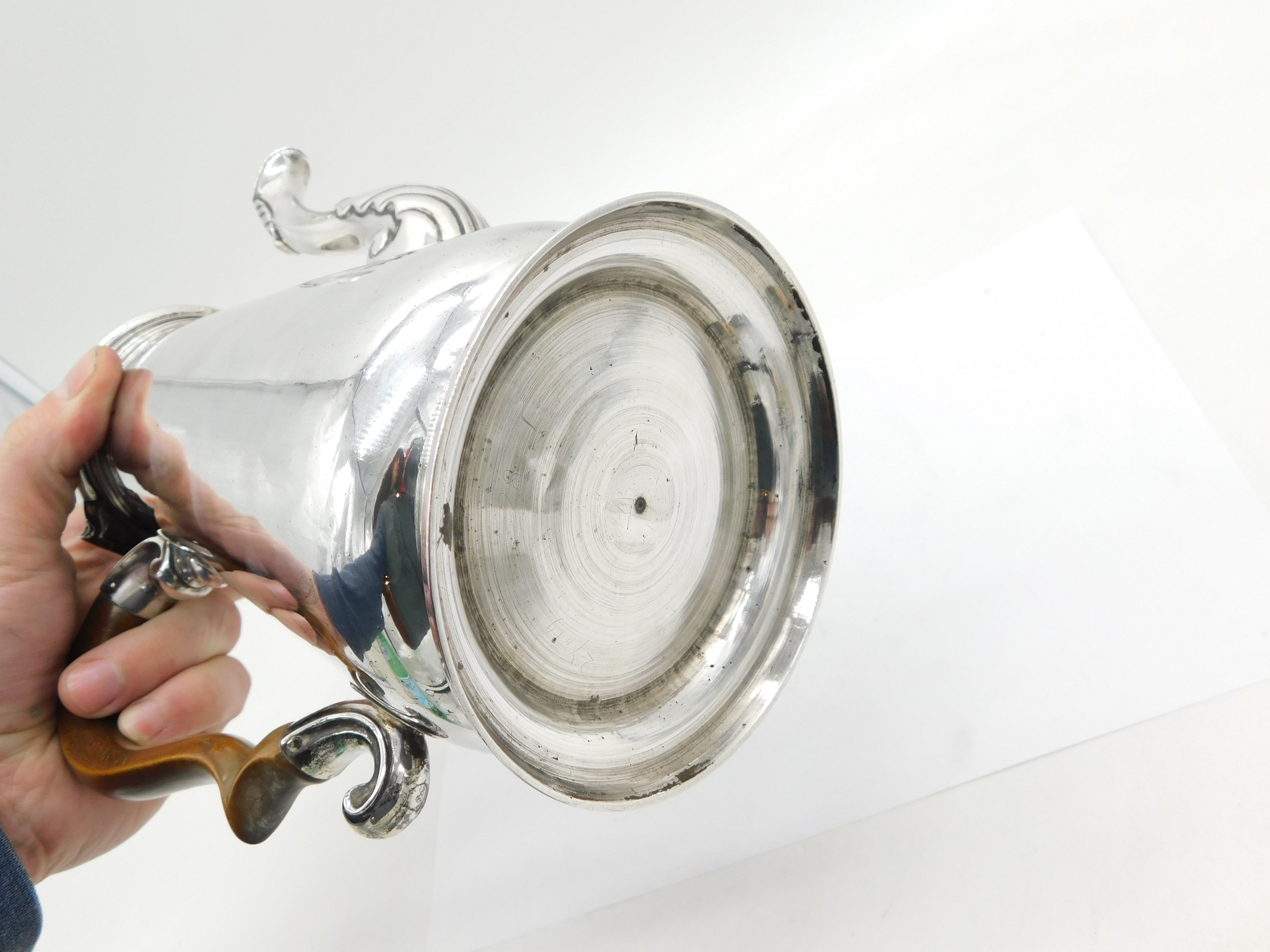 Details: A fantastic and wonderfully designed antique early-georgian large sterling silver coffee pot with superb armorial crest to the front edge, turned wooden handle, scrolled decoration to the spout, hallmarked London 1740 with rubbed makers marks. This is a wonderful item that would make a perfect gift or addition to any collection. We are more than happy to provide XRF reports for items upon request.