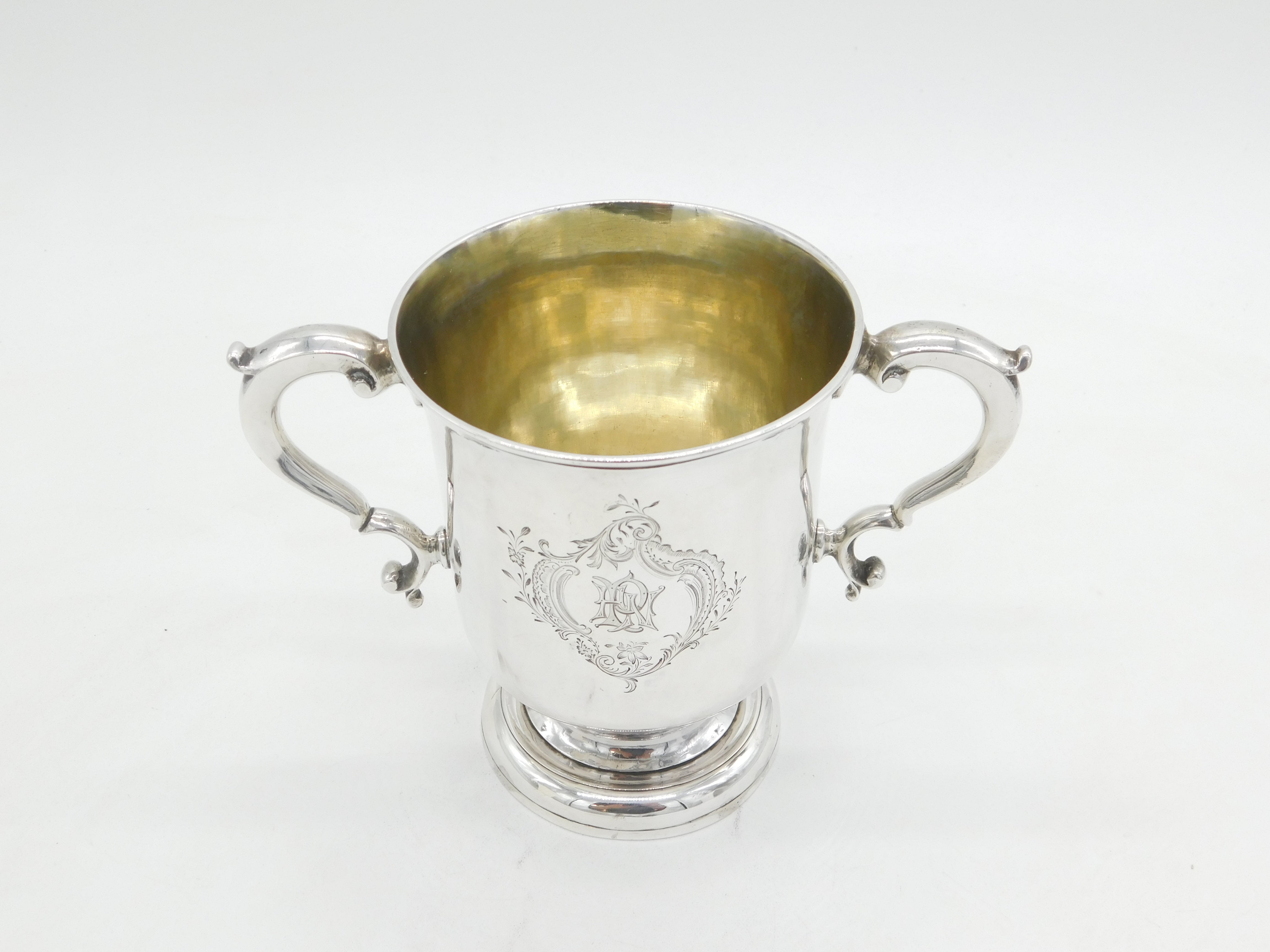 Details: A fantastic and wonderfully designed antique early-georgian sterling silver loving cup or trophy cup with charming detailing throughout, beautifully hallmarked to the base for London 1760 by John Moore. This is a wonderful item that would make a perfect gift or addition to any collection.