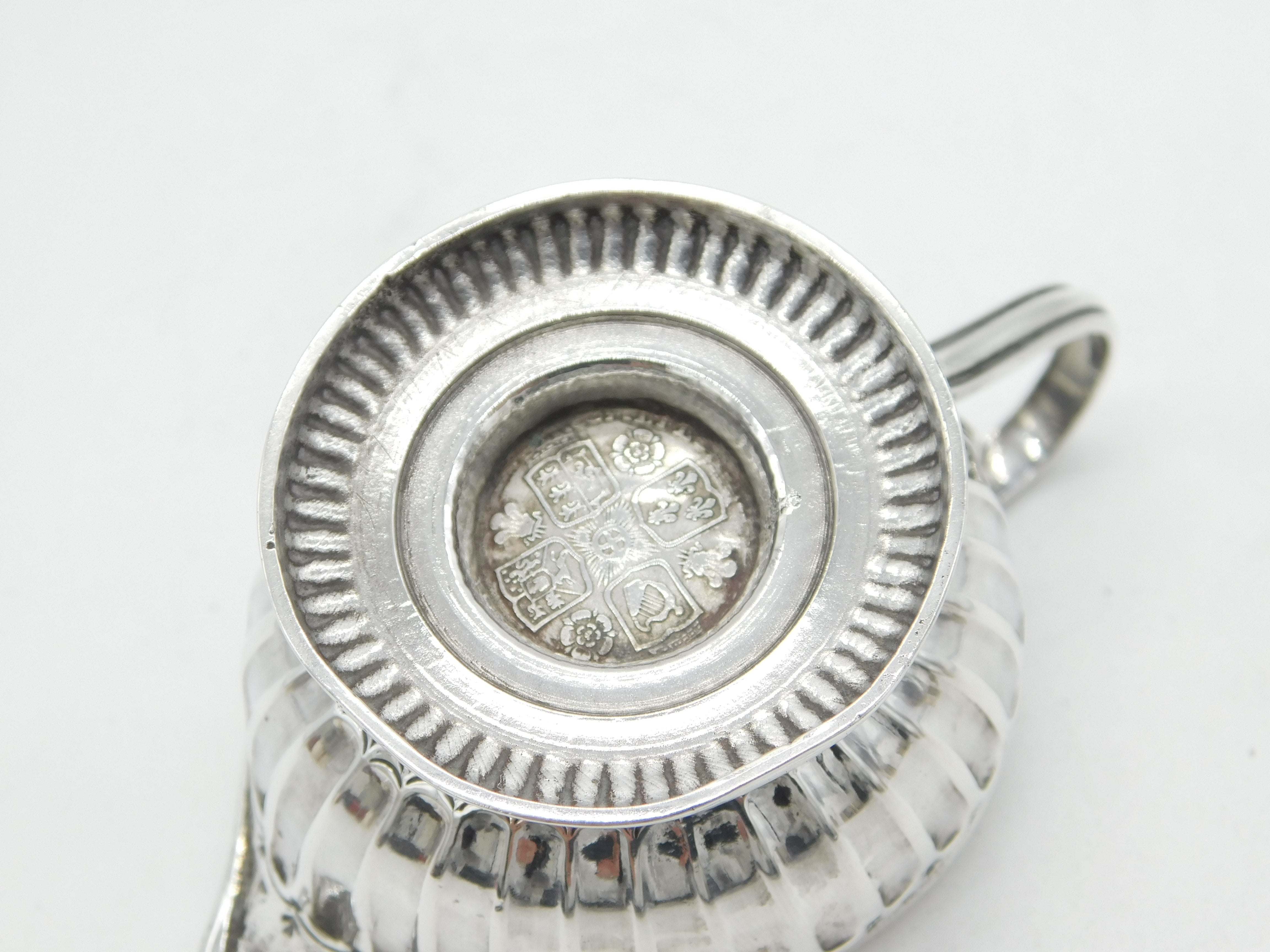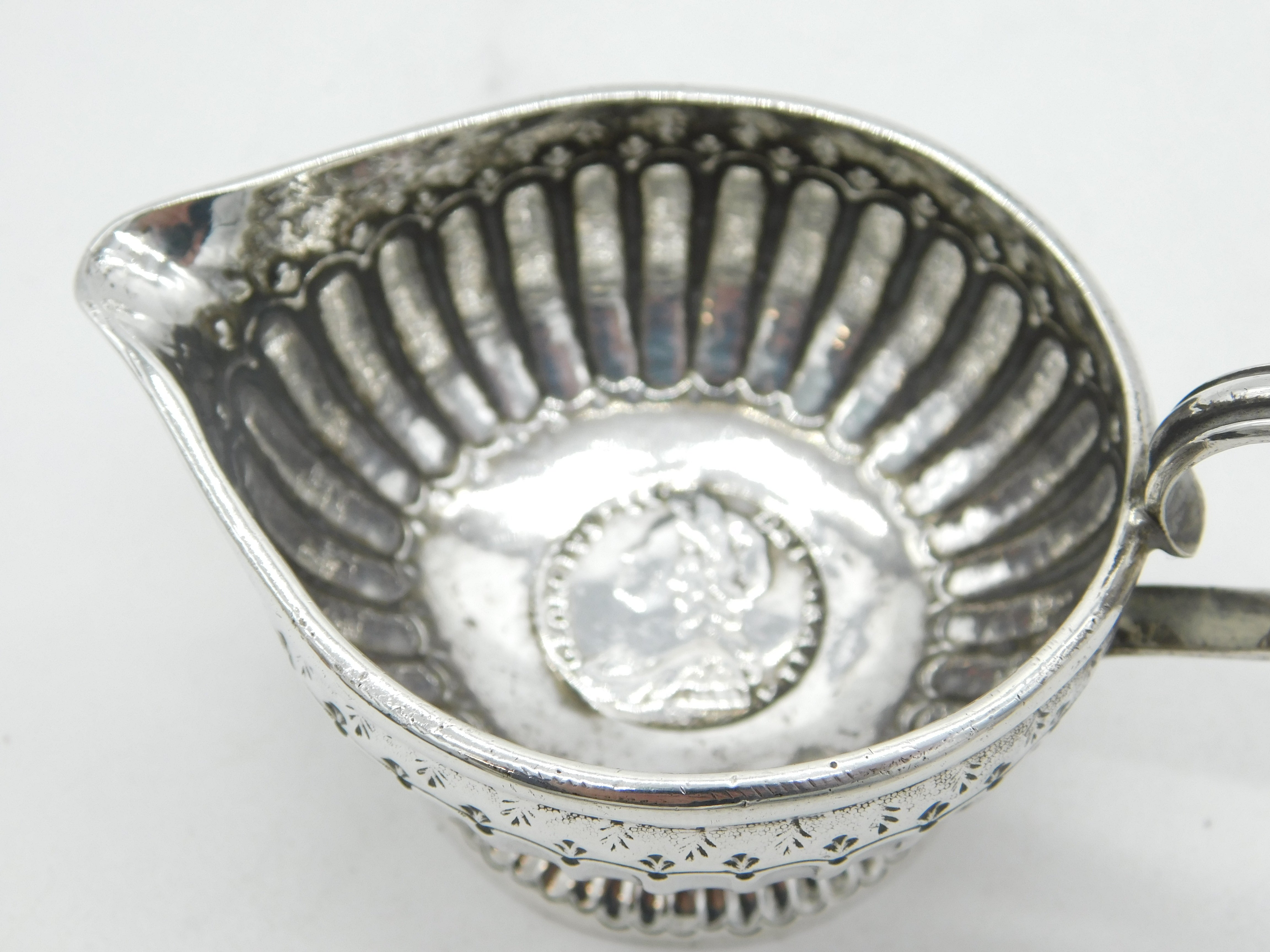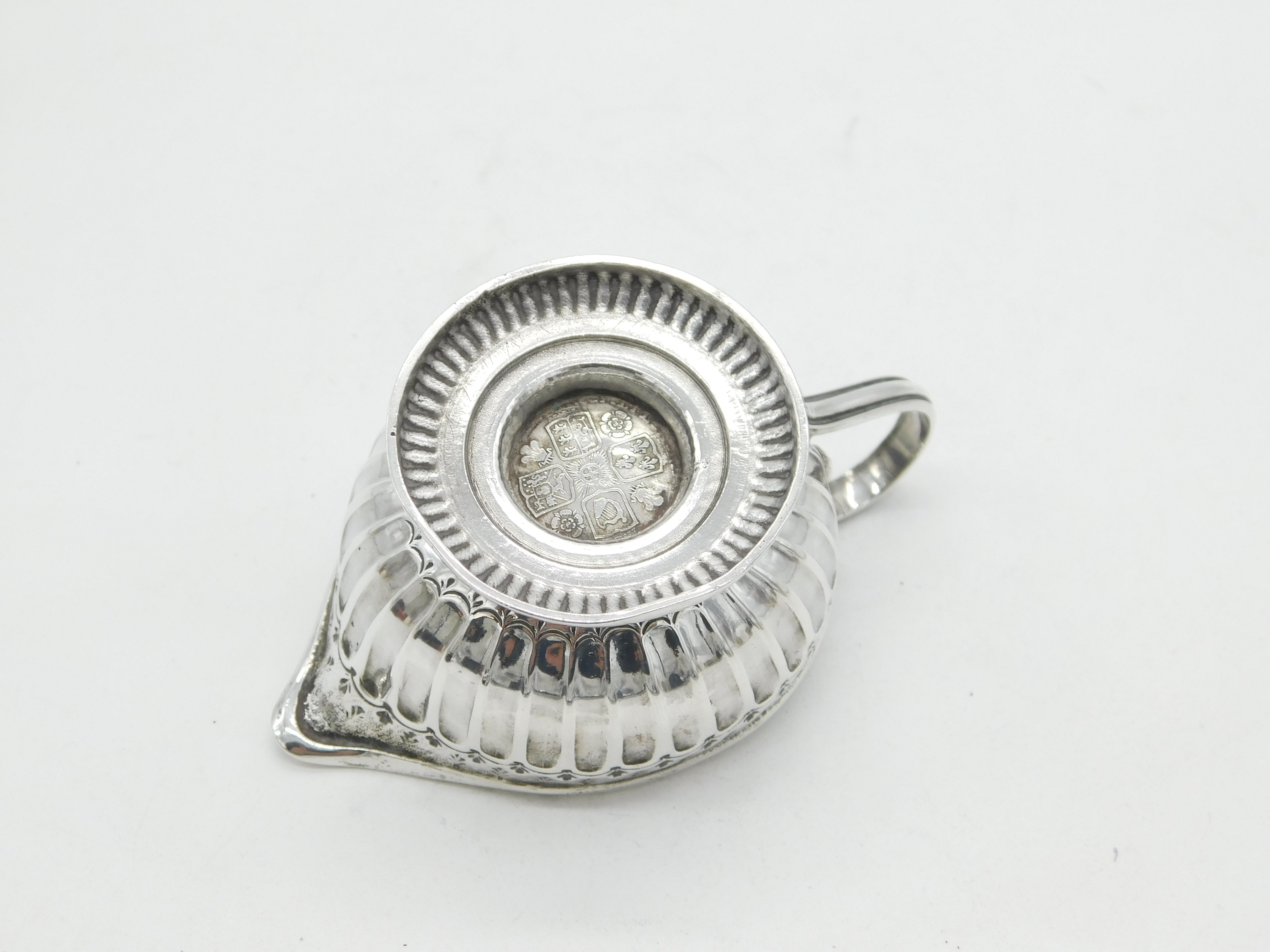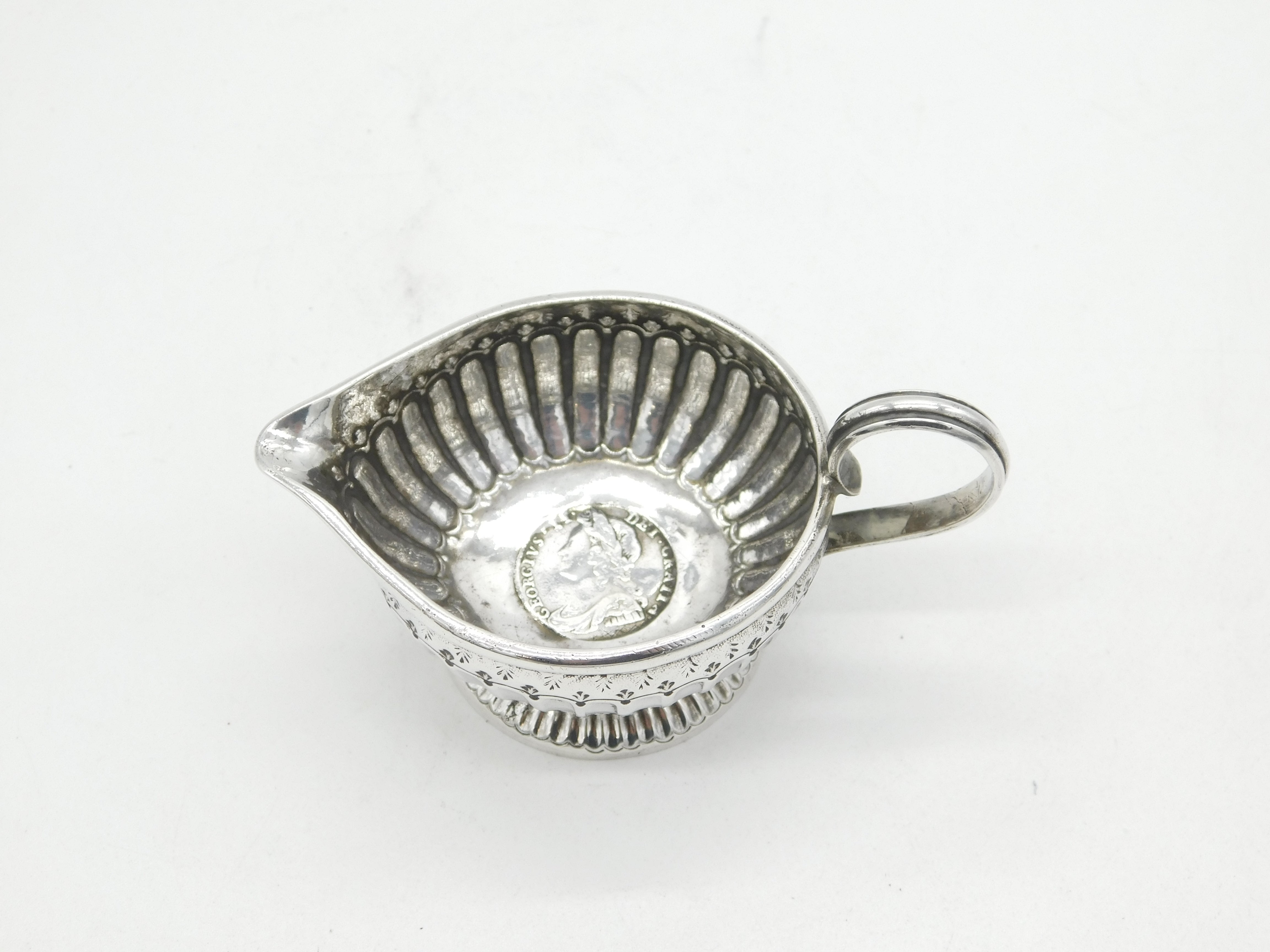 Details: A fantastic and wonderfully designed antique georgian sterling silver small fluted cream jug set with a King George II shilling c1750, the silver has been XRF tested as it is unmarked. This is a wonderful item that would make a perfect gift or addition to any collection.