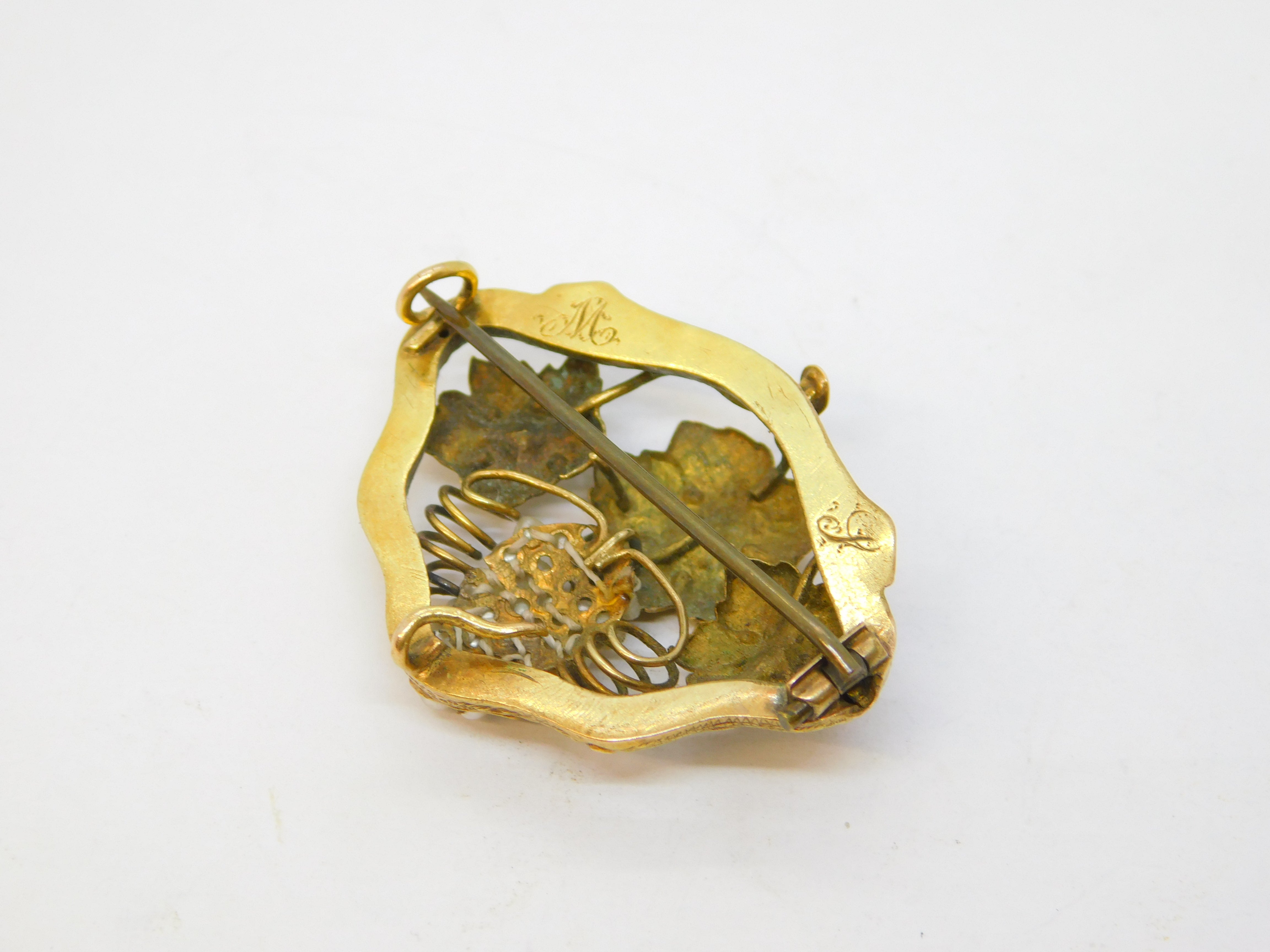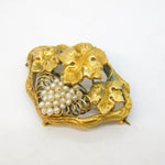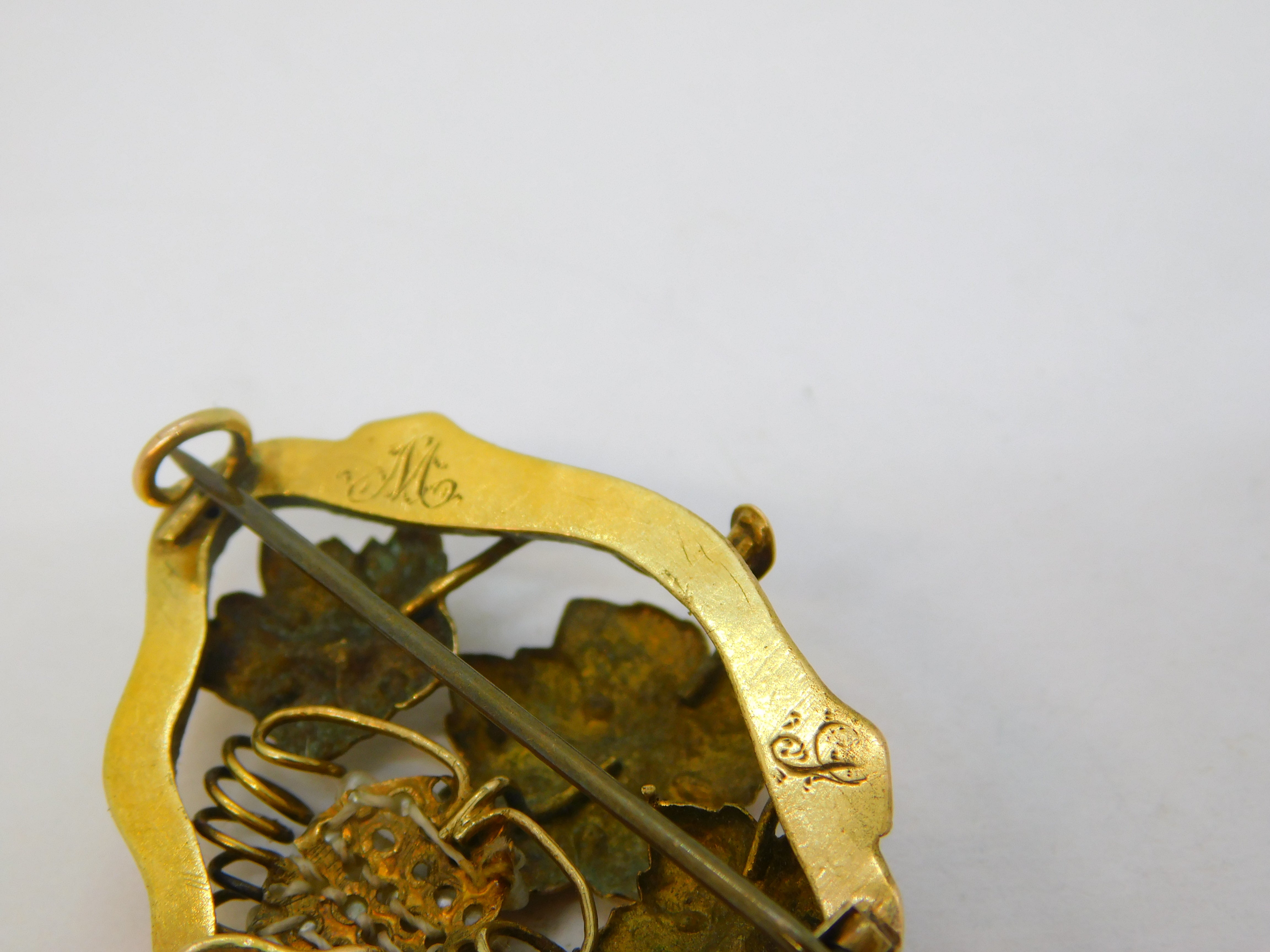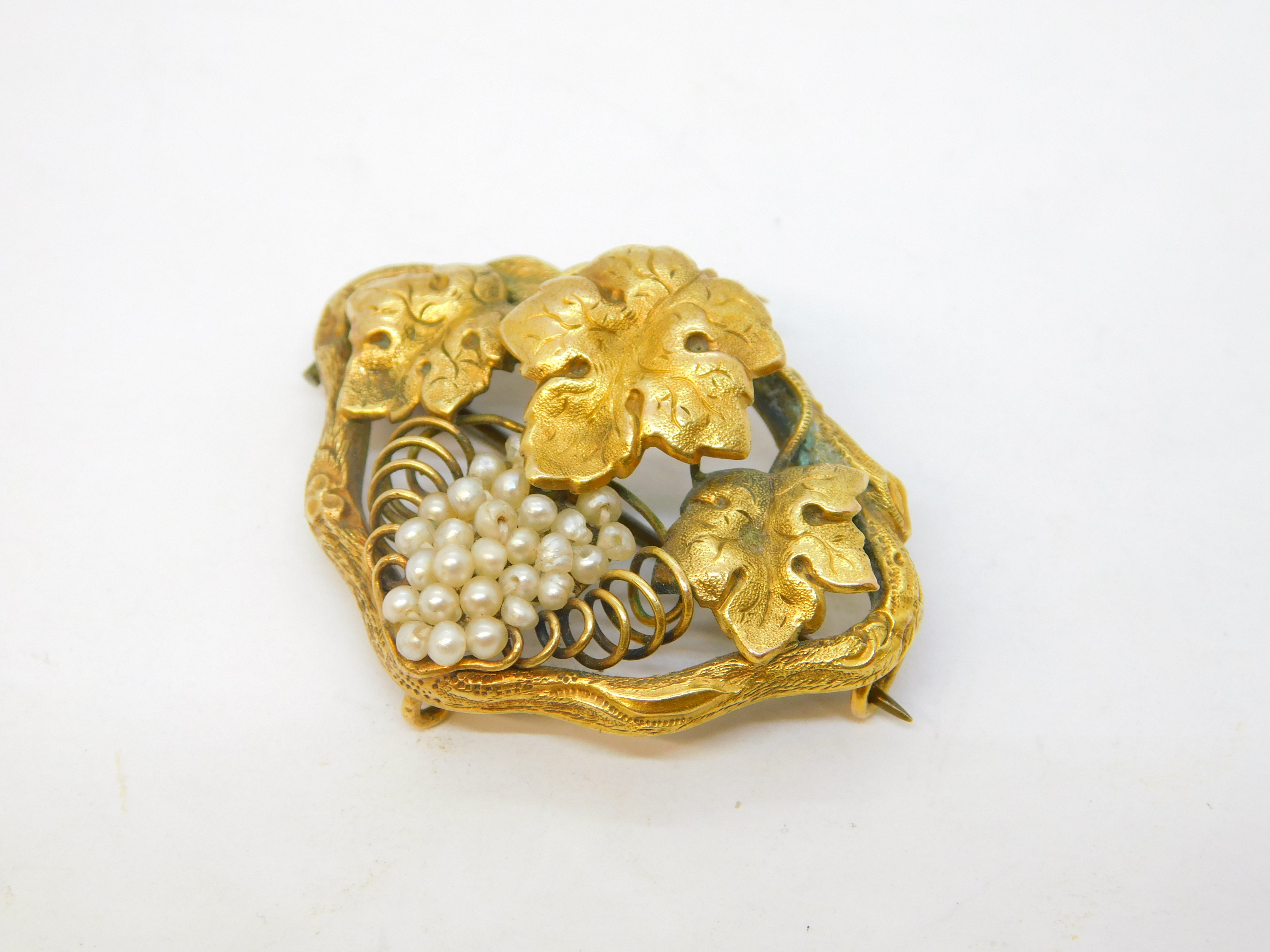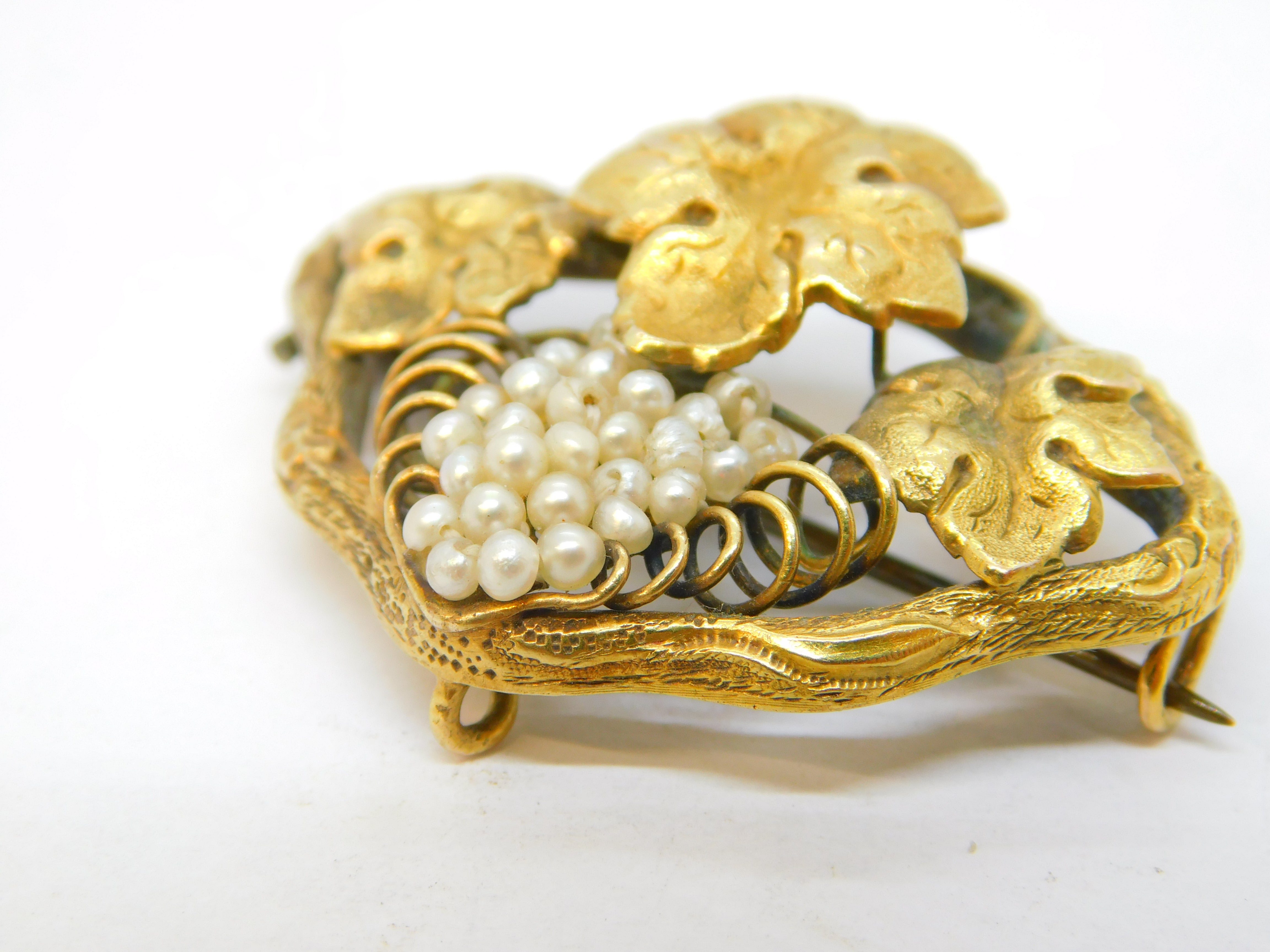 Details: A fantastic and wonderfully designed antique georgian 18ct yellow gold sweetheart brooch formed of three leaves above a bunch of grapes set with seed pearls, engraved with initials to the reverse, the gold has been XRF tested as it is unmarked c1790. This is a wonderful item that would make a perfect gift or addition to any collection.