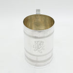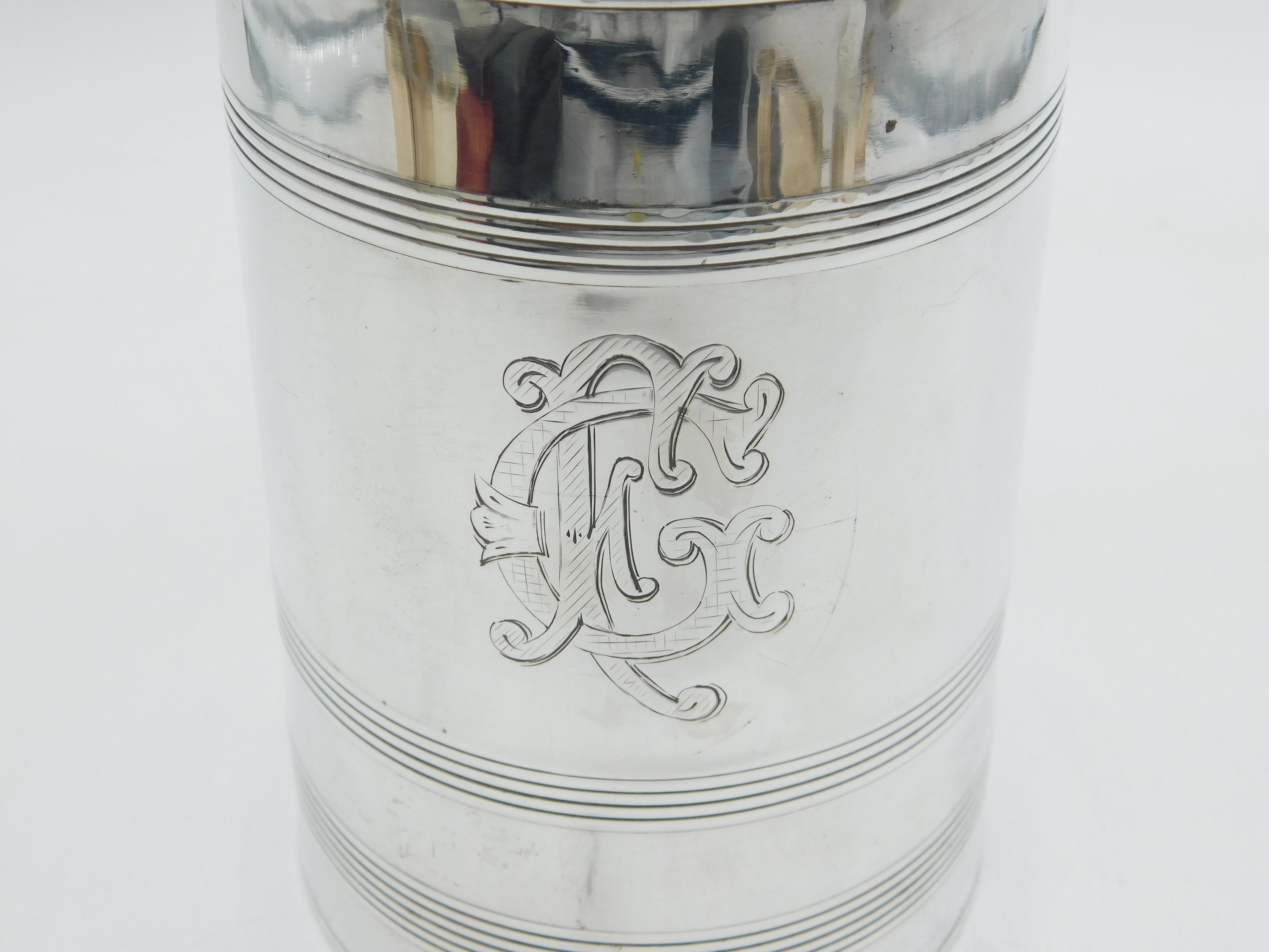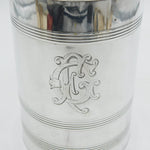 Details: A fantastic and wonderfully designed antique late-Georgian sterling silver large quart tankard mug with lined patterns and floral decoration to the handles faintly hallmarked to the top edge, London 1795 with rubbed makers marks. Lovely size and monogram to the front. This is a wonderful item that would make a perfect gift or addition to any collection.