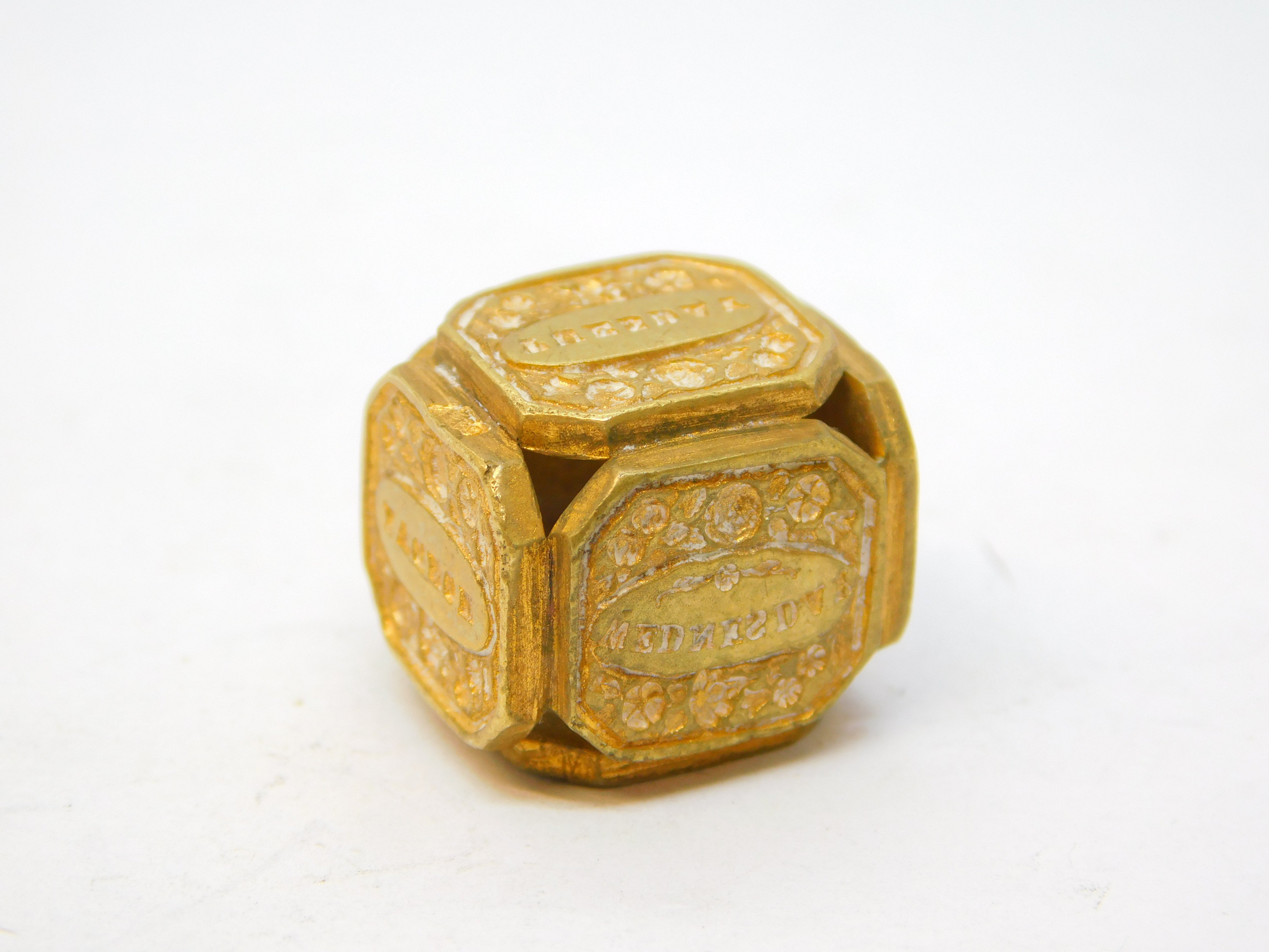 Details: A fantastic and wonderfully designed antique georgian gilt metal six-sided dice with the different days of the week to each edge excluding Sunday c1820, a wonderful unusual item. This is a wonderful item that would make a perfect gift or addition to any collection.