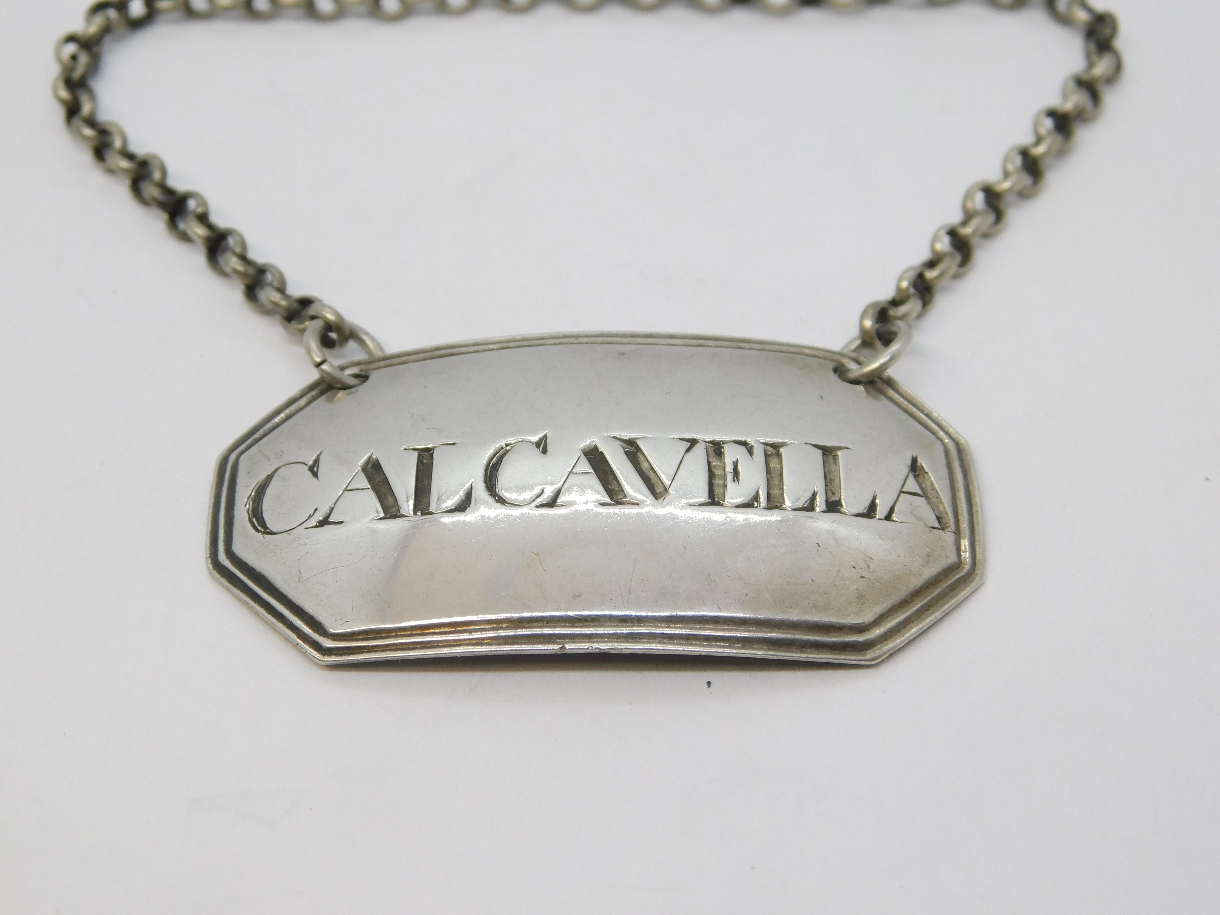 Details: A fantastic and wonderfully designed antique georgian sterling silver bright cut Calcavella wine decanter label hallmarked London 1792 by Solomon Hougham, a scarce label in lovely condition referring to a portuguese wine popular during the 18th & 19th century. This is a wonderful item that would make a perfect gift or addition to any collection. We are more than happy to provide XRF reports for items upon request.