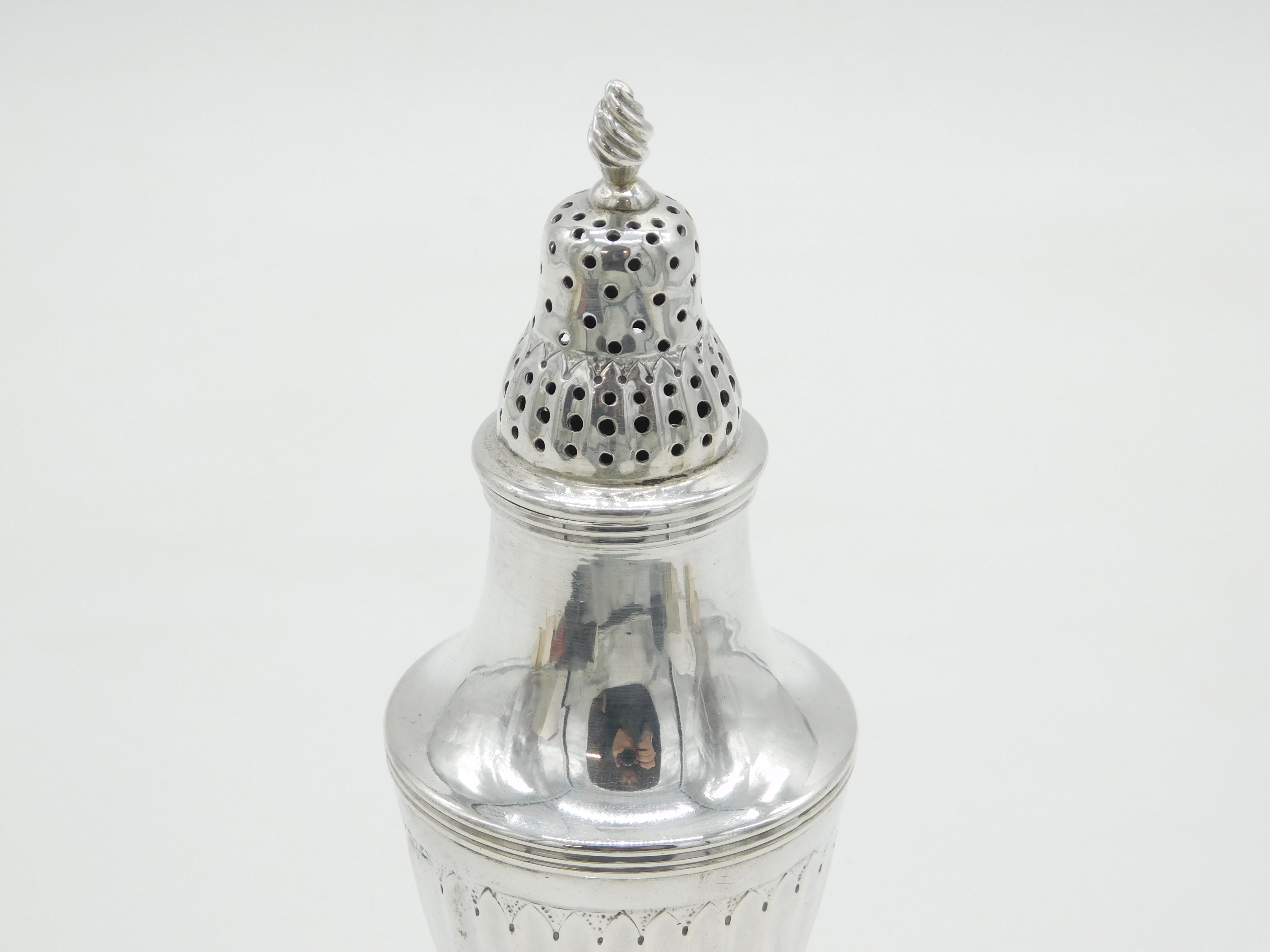 Details: A fantastic and wonderfully designed antique georgian sterling silver fluted pedestal sugar caster or muffineer with lovely detailing hallmarked London 1799 by Thomas Wallis II. This is a wonderful item that would make a perfect gift or addition to any collection.