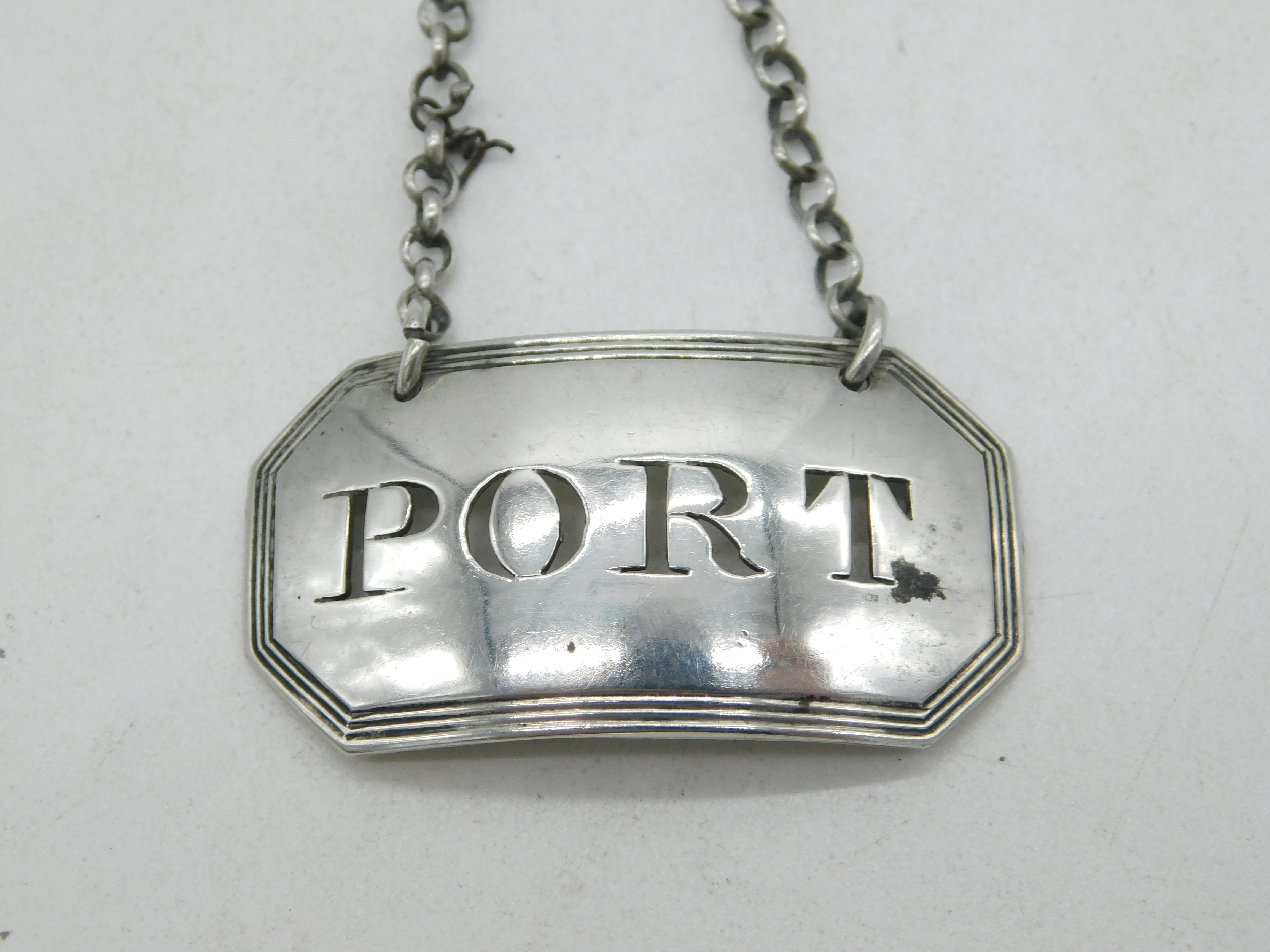 Details: A fantastic and wonderfully designed antique georgian sterling silver pierced Port decanter label with lovely detailing hallmarked London 1808 by John Reilly. This is a wonderful item that would make a perfect gift or addition to any collection.