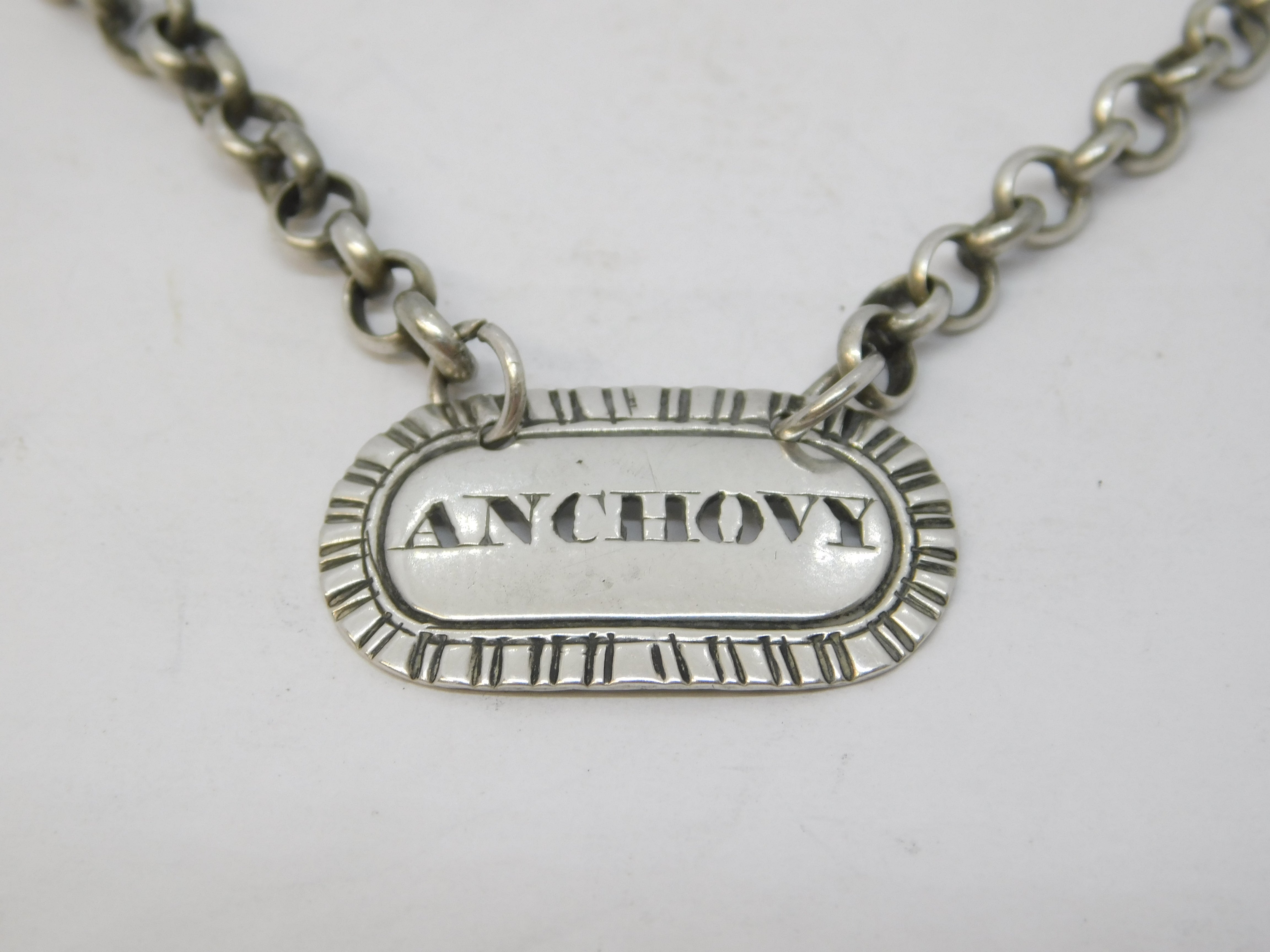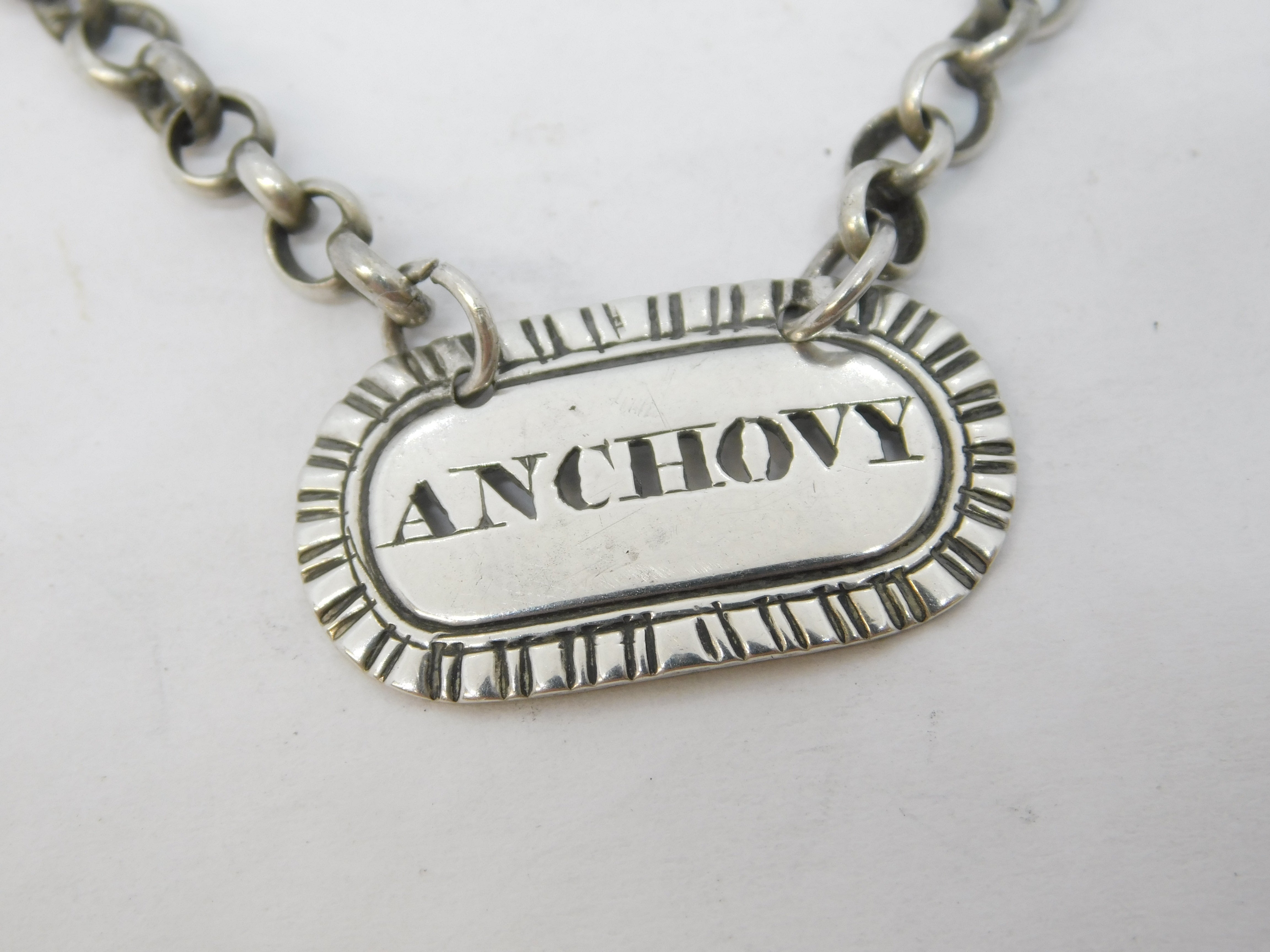 Details: A fantastic and wonderfully designed antique georgian sterling silver small anchovy sauce label or ticket with lovely detailing hallmarked London 1823 by George Knight. This is a wonderful item that would make a perfect gift or addition to any collection.