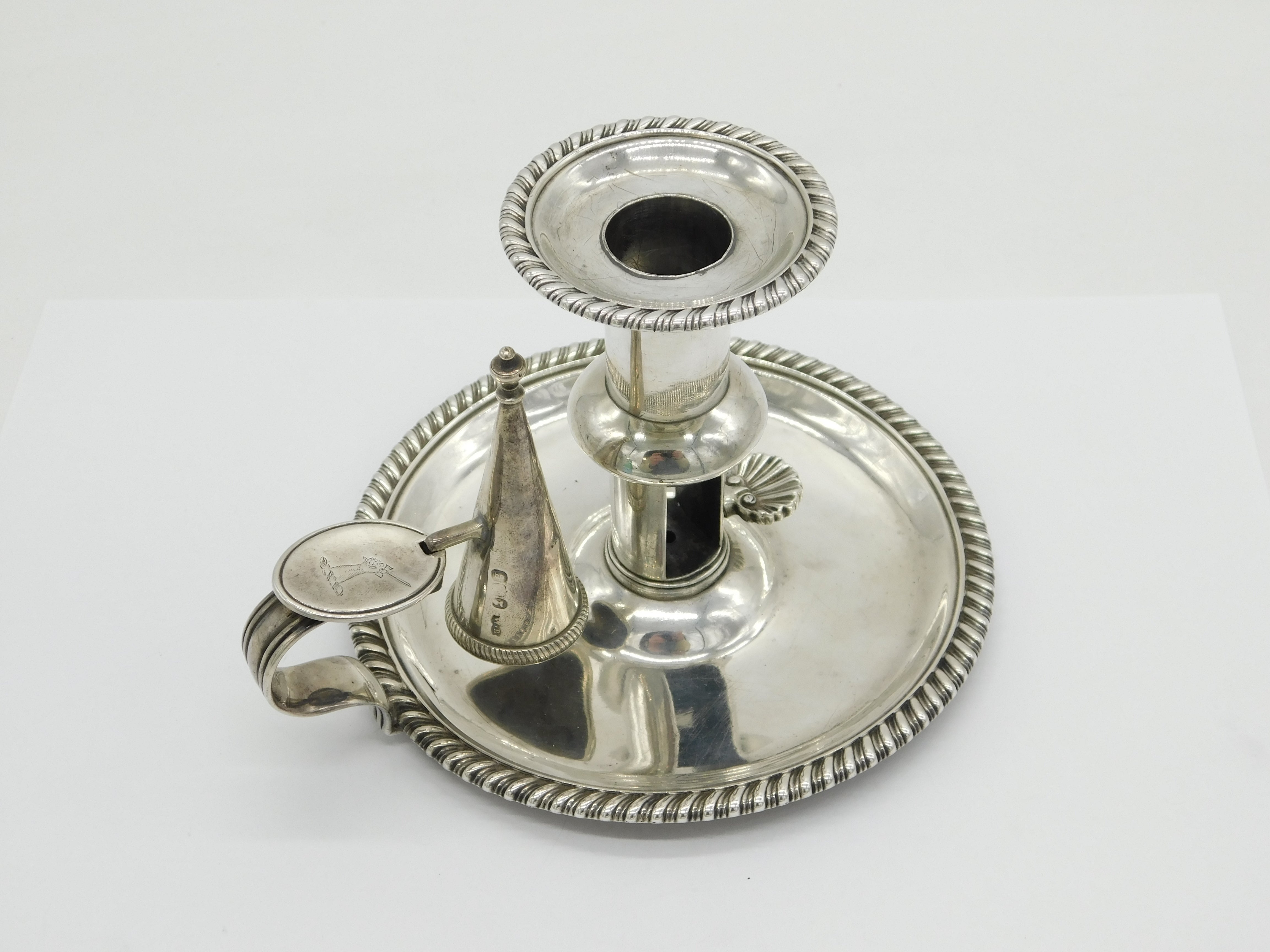 Details: A fantastic and wonderfully designed antique georgian sterling silver candle chamberstick with heraldic crest to the handle, includes snuffer, hallmarked London 1822 by William Stroud. This is a wonderful item that would make a perfect gift or addition to any collection. We are more than happy to provide XRF reports for items upon request.