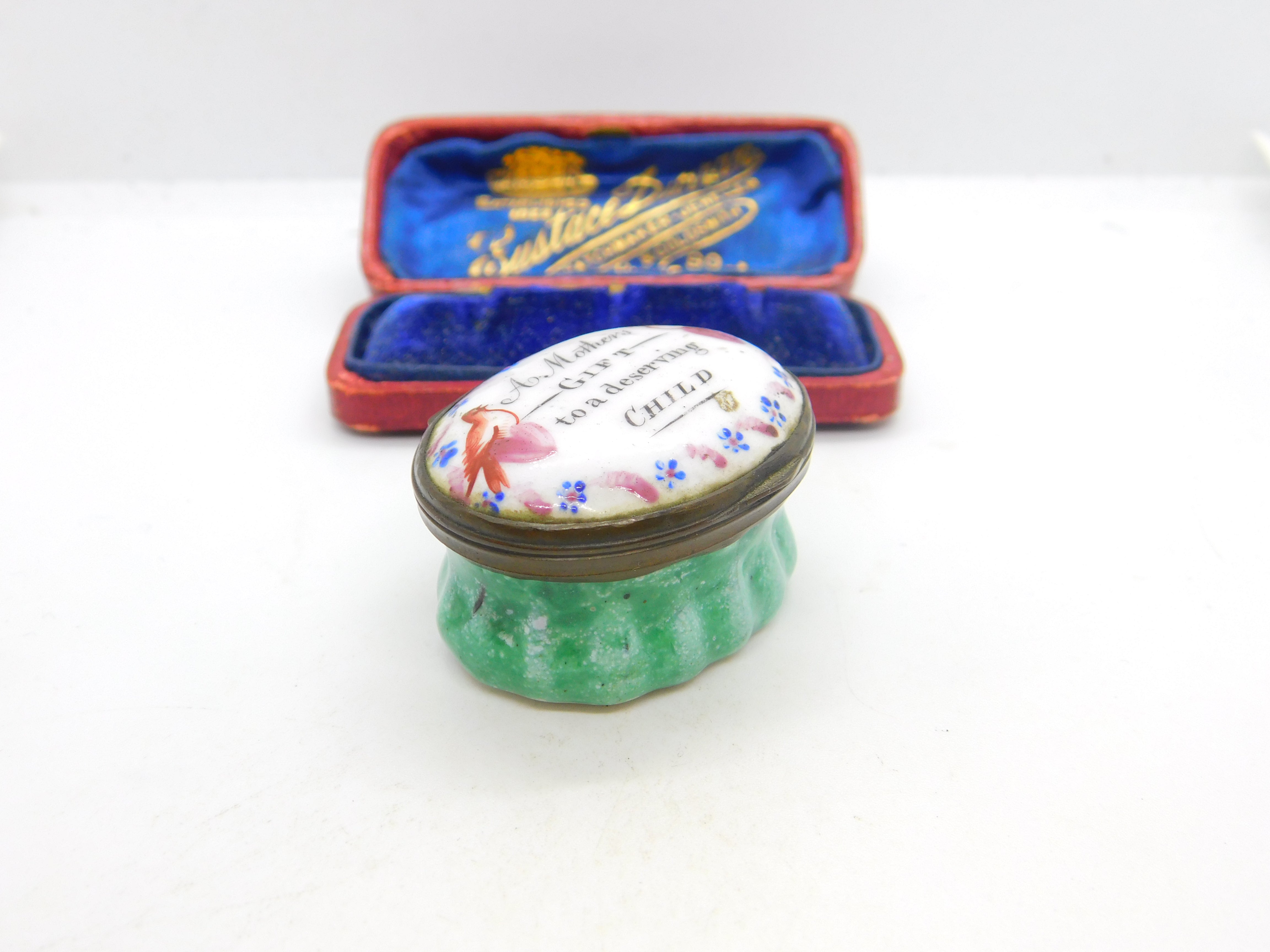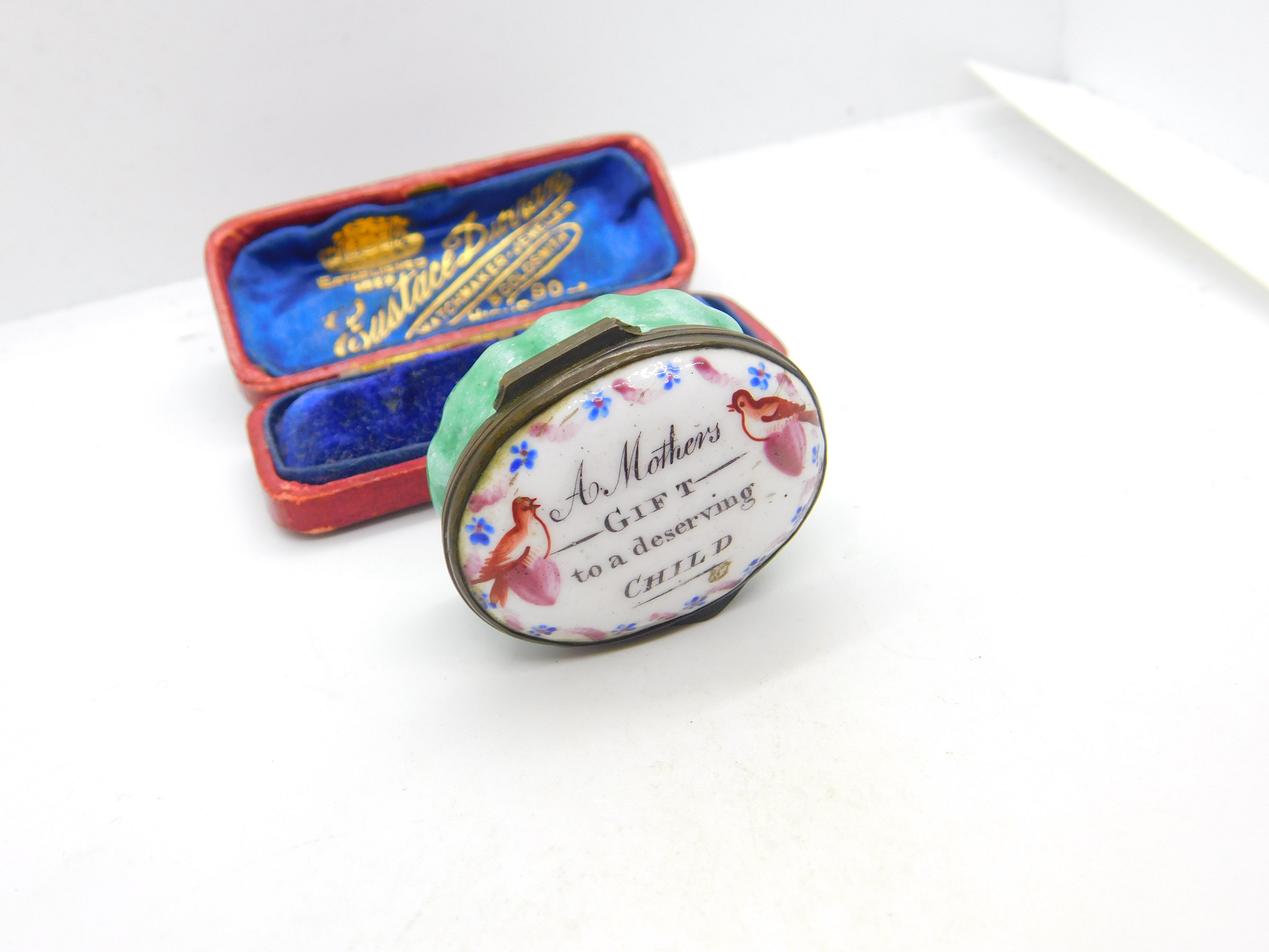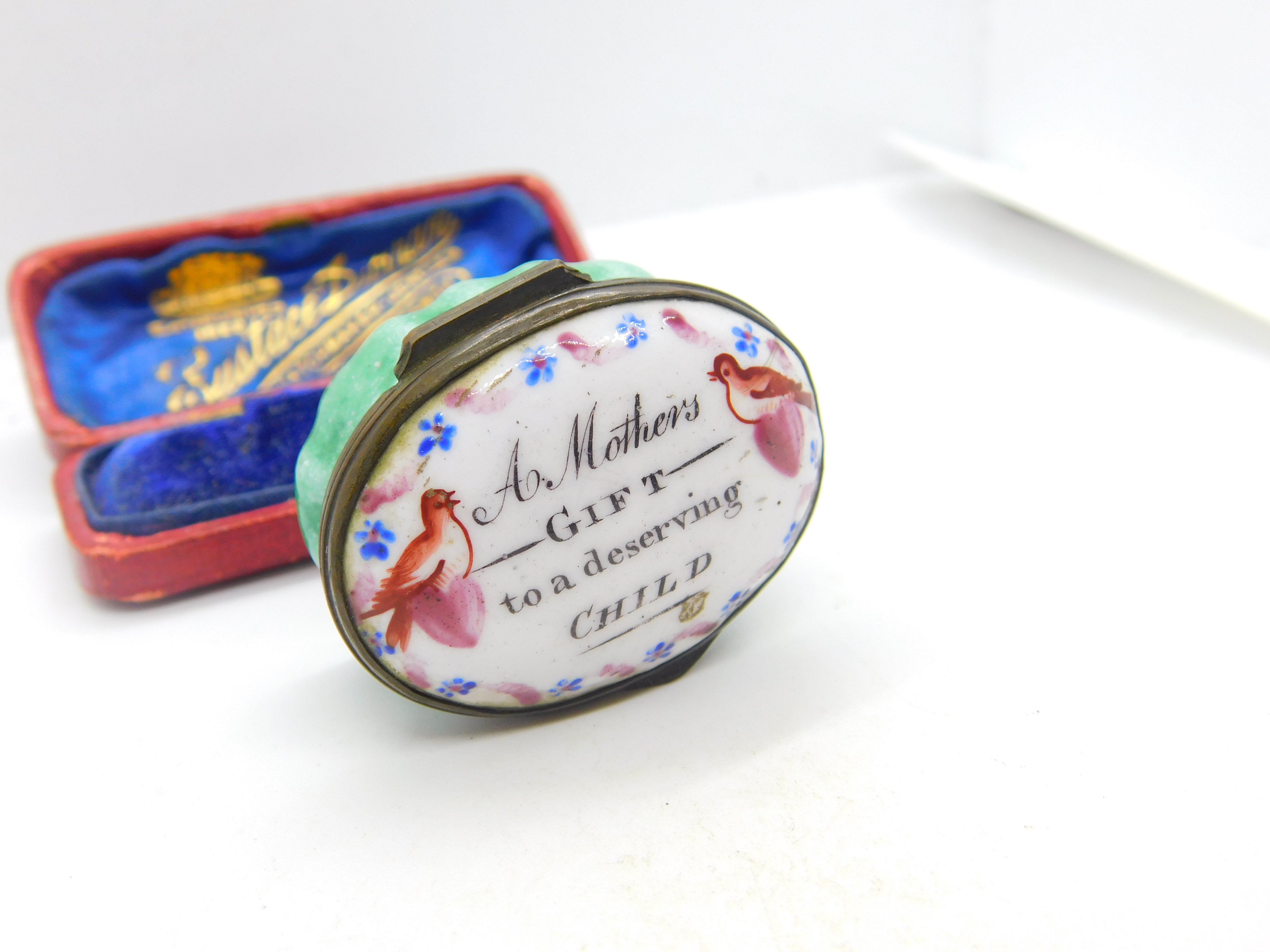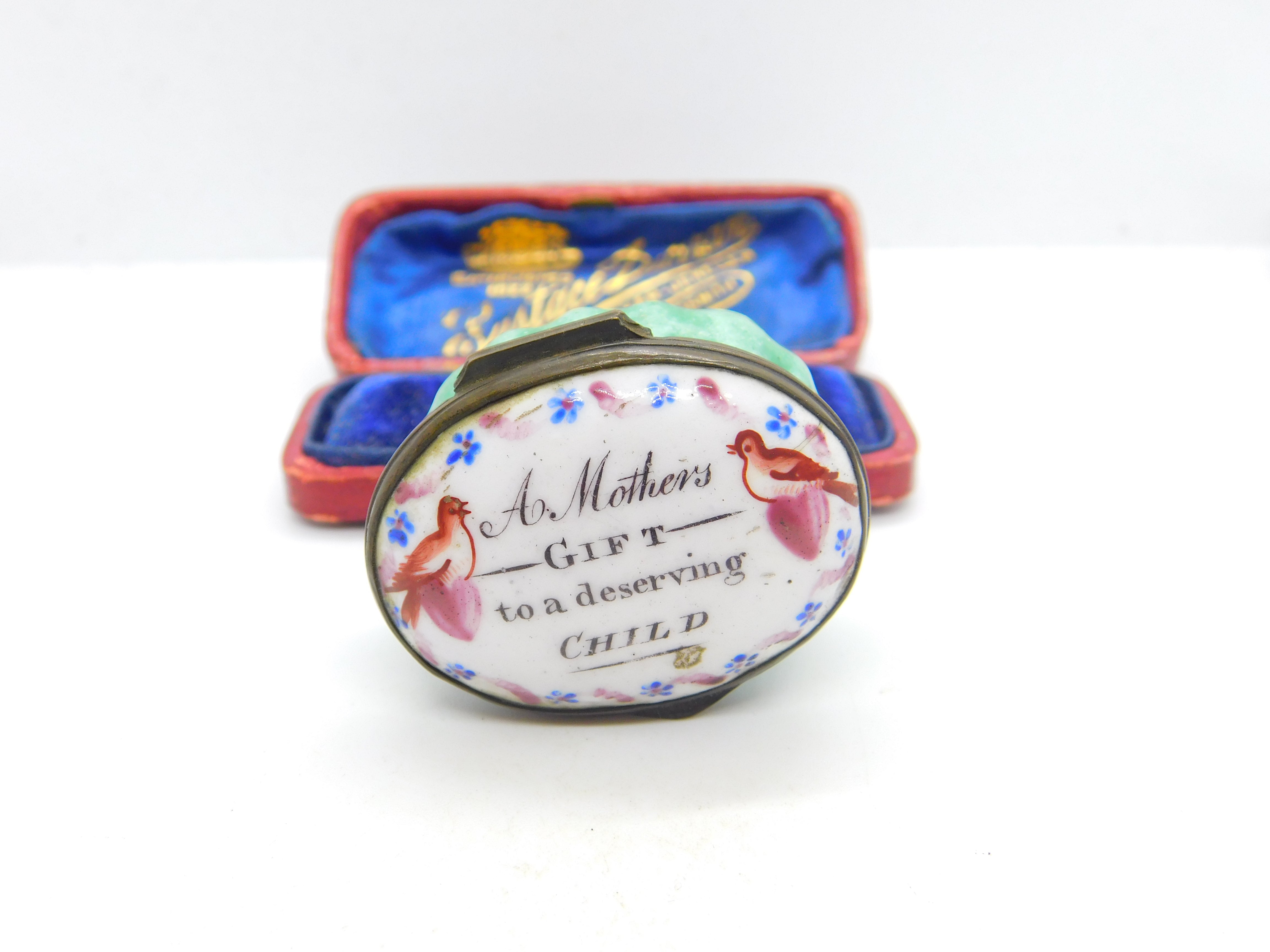 Georgian Bilston Enamel 'A Mothers Gift to a deserving Child' Patch Box c1780