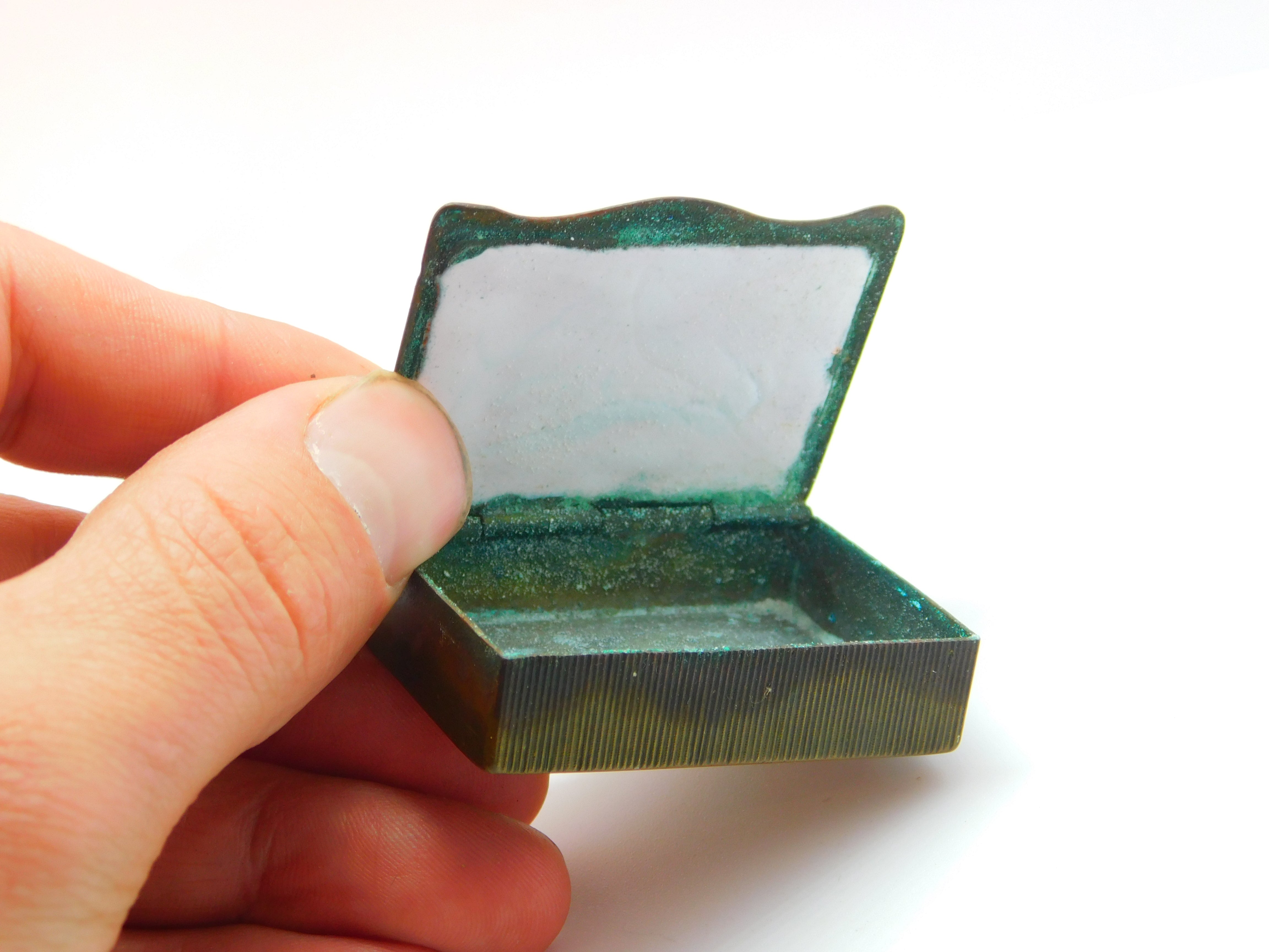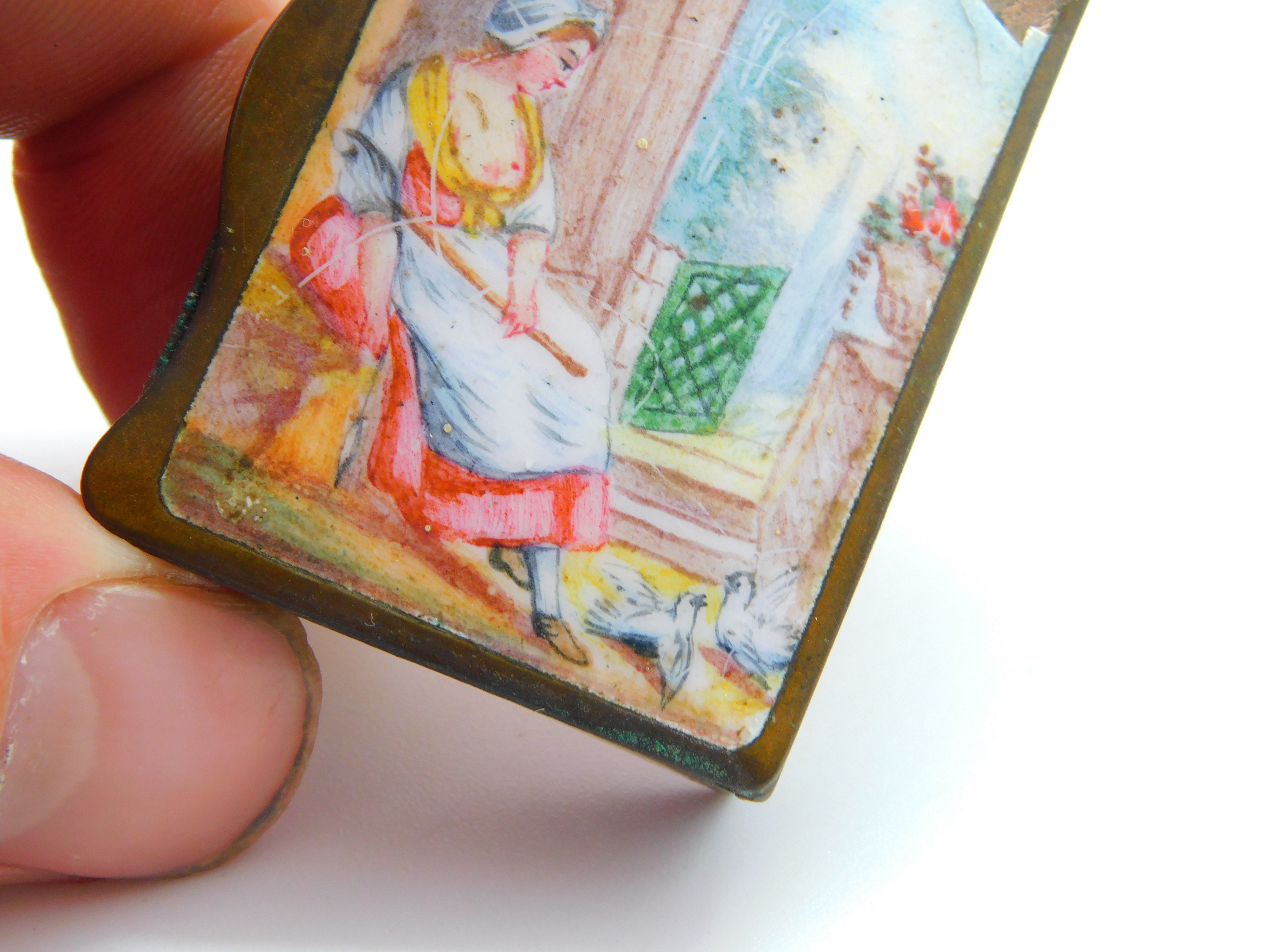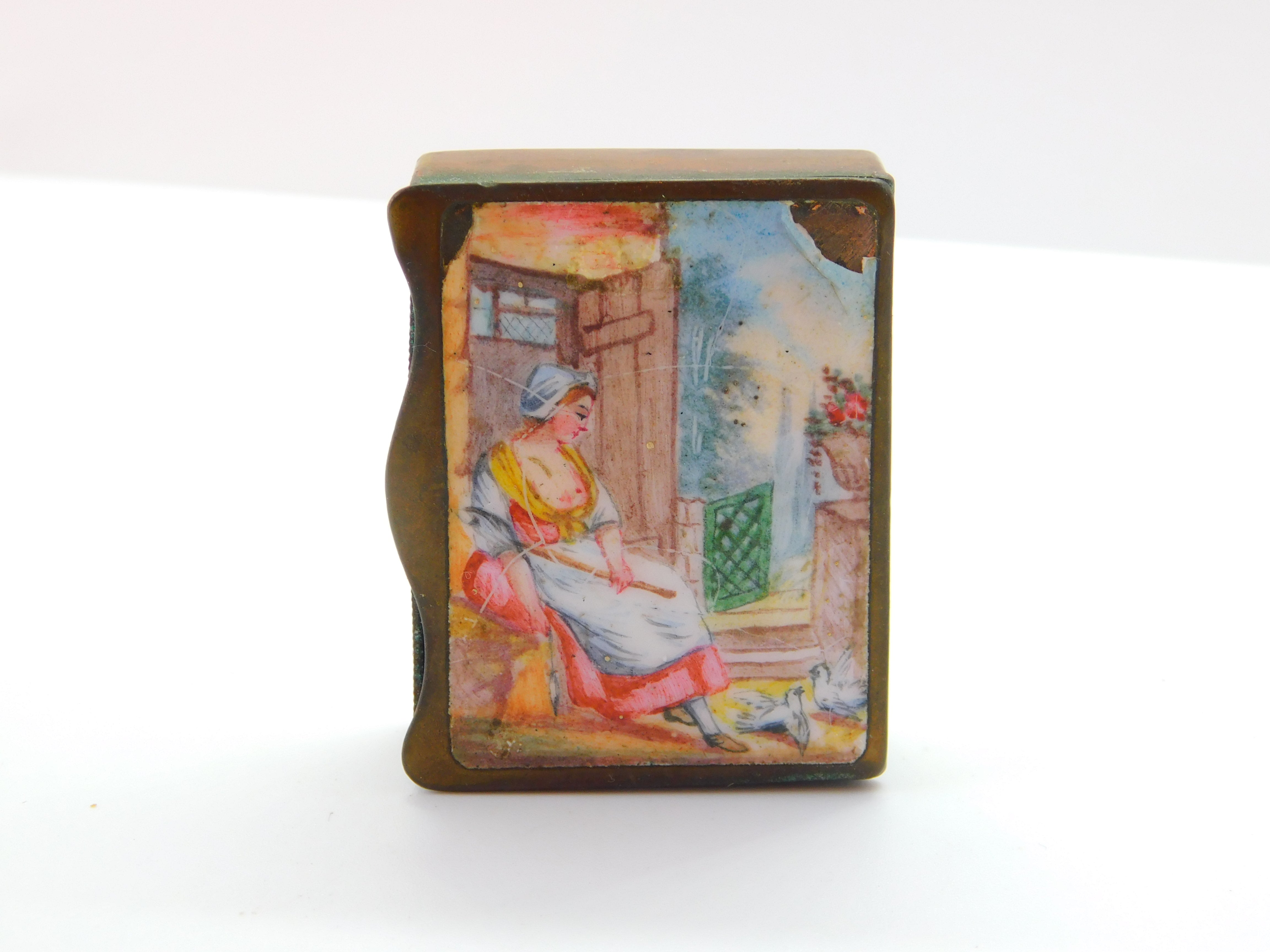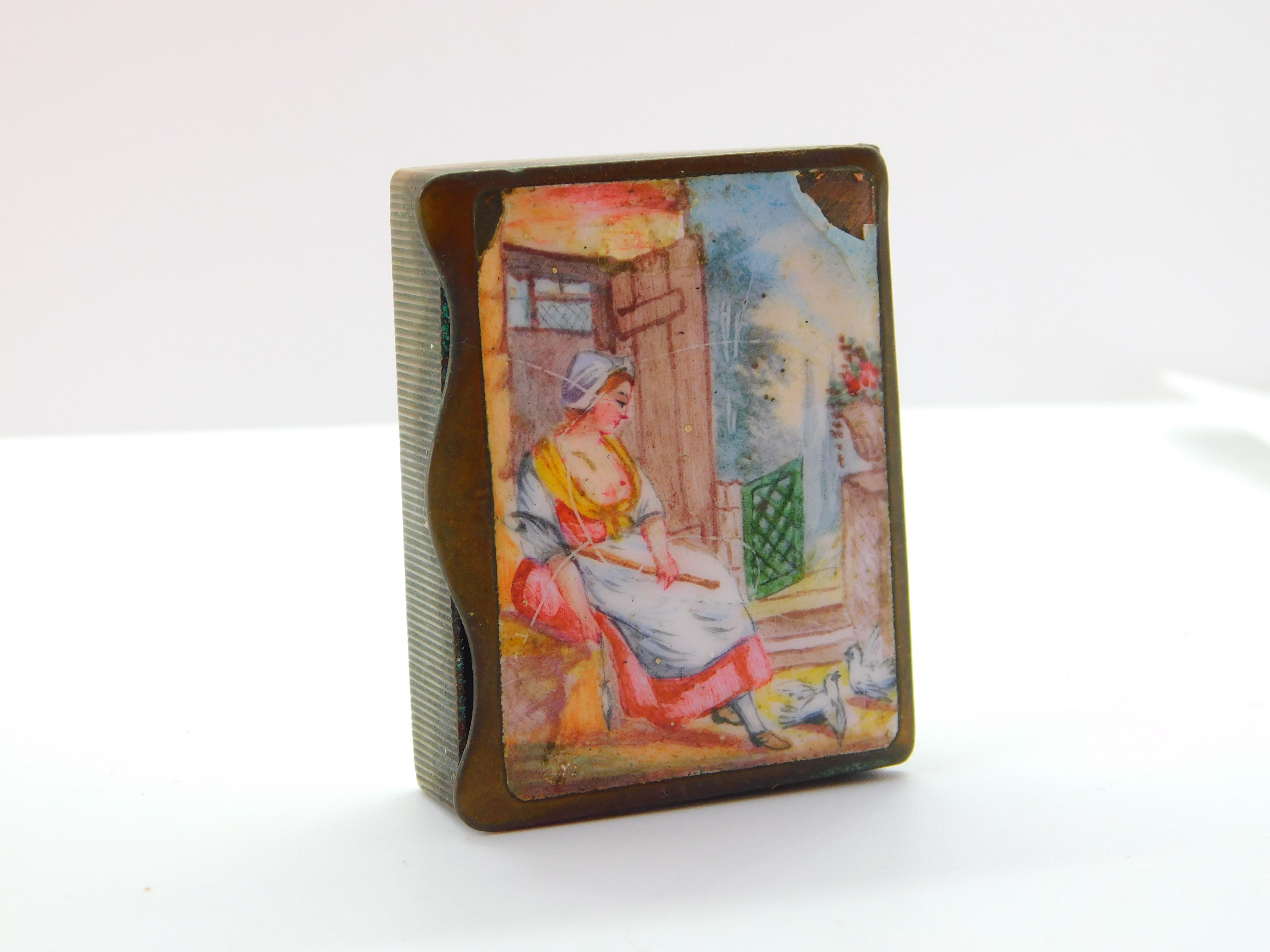 Details: A fantastic and wonderfully designed antique Georgian base metal and colourful enamel topped vesta case or snuff box with a slightly erotic scene to the front c1820, chip to the enamel please note. This is a wonderful item that would make a perfect gift or addition to any collection. The BOX pictured is for PRESENTATION ONLY and is NOT included in the listings but used to frame the pictures unless specifically stated otherwise.