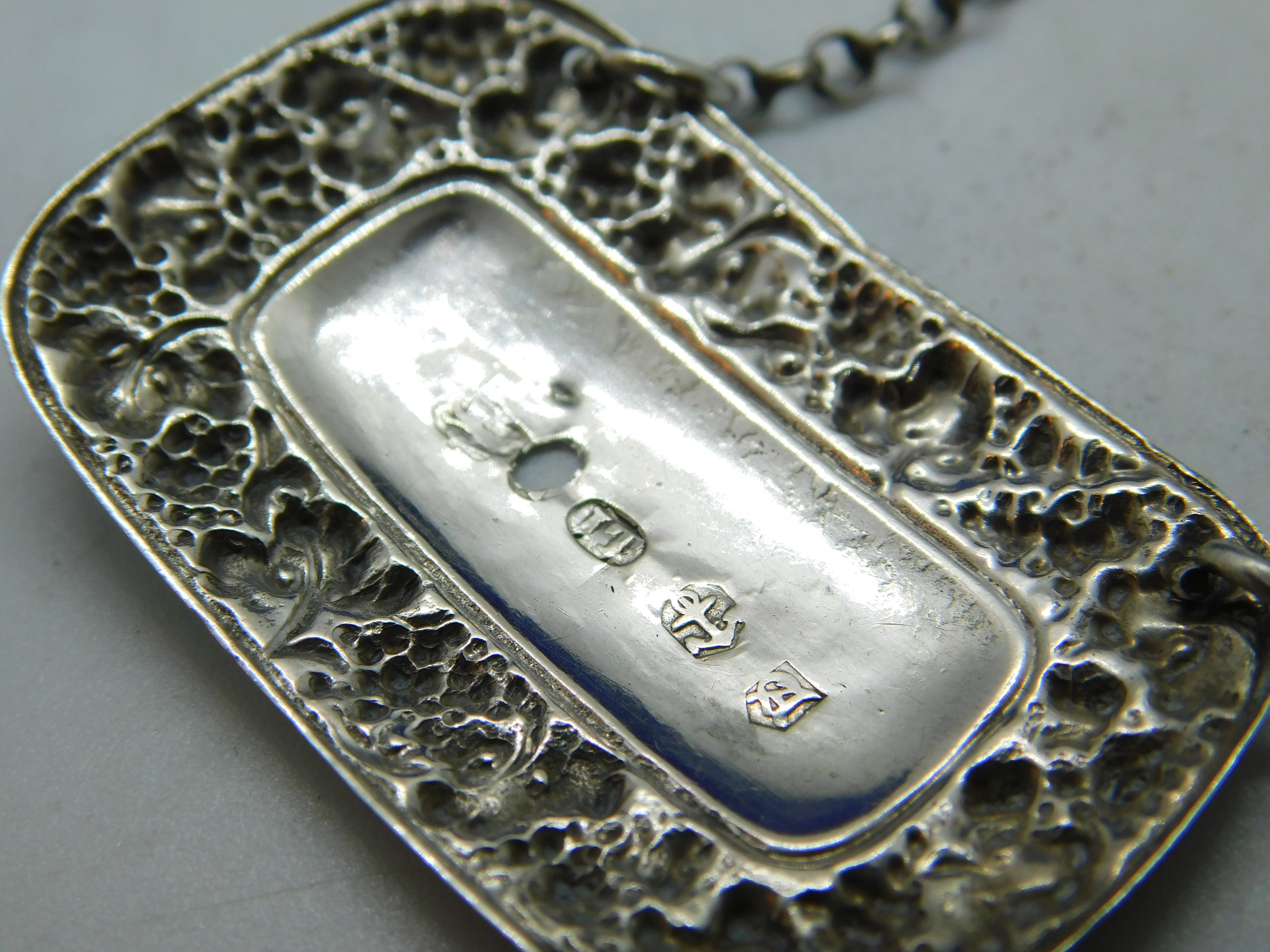 Details: A fantastic and wonderfully designed antique Georgian George IV sterling silver decanter label with charming anchus & grape patterns for 'Brosnuchair' hallmarked Birmingham 1824 by John Thropp to the reverse. We are unsure whether this is a type of wine or sauce but have never come across this example. The label does have a hole to the centre please see pictures but nonetheless very unique. This is a wonderful item that would make a perfect gift or addition to any collection. The BOX pictured is for PRESENTATION ONLY and is NOT included in the listings but used to frame the pictures unless specifically stated otherwise.