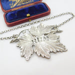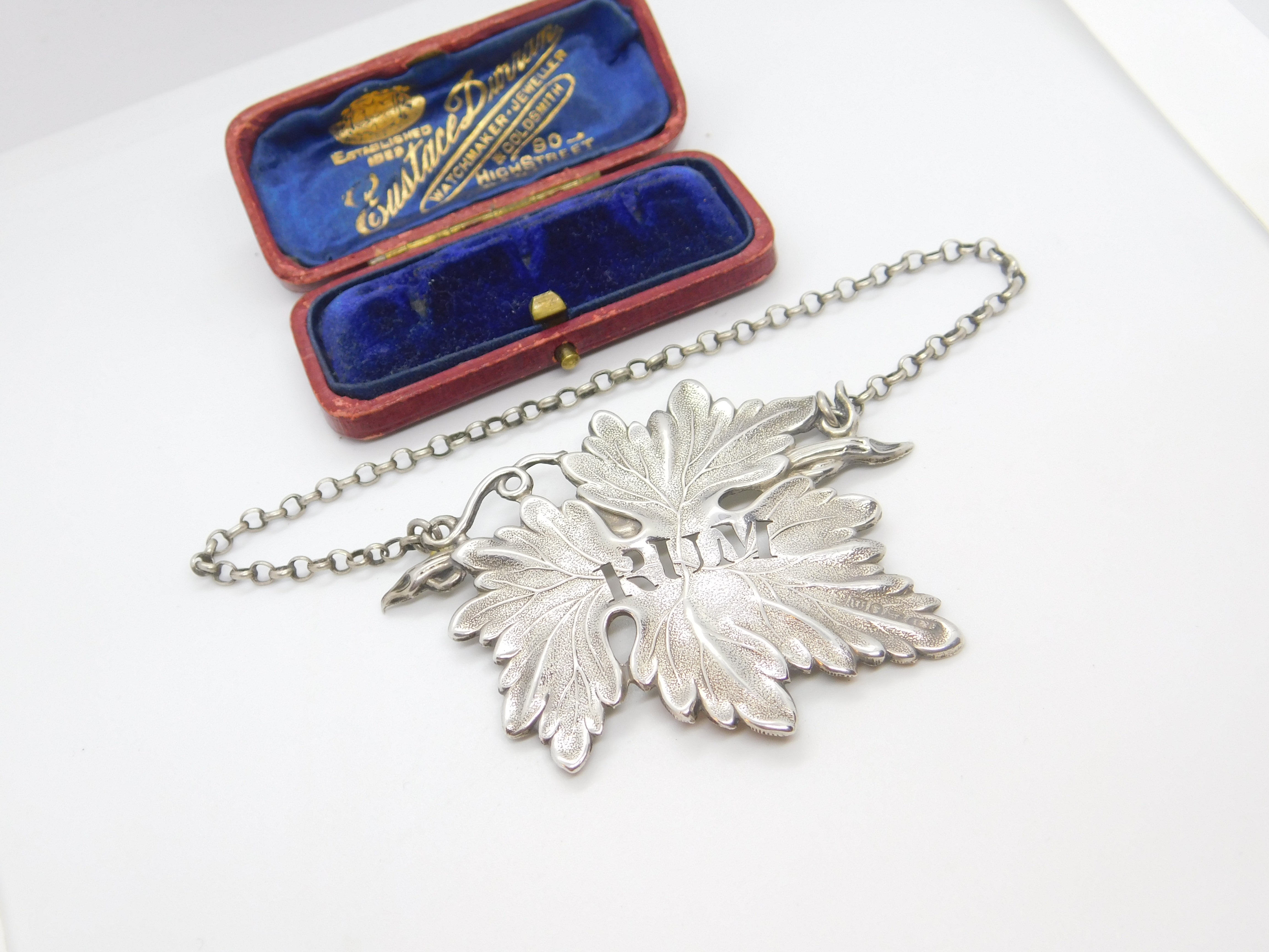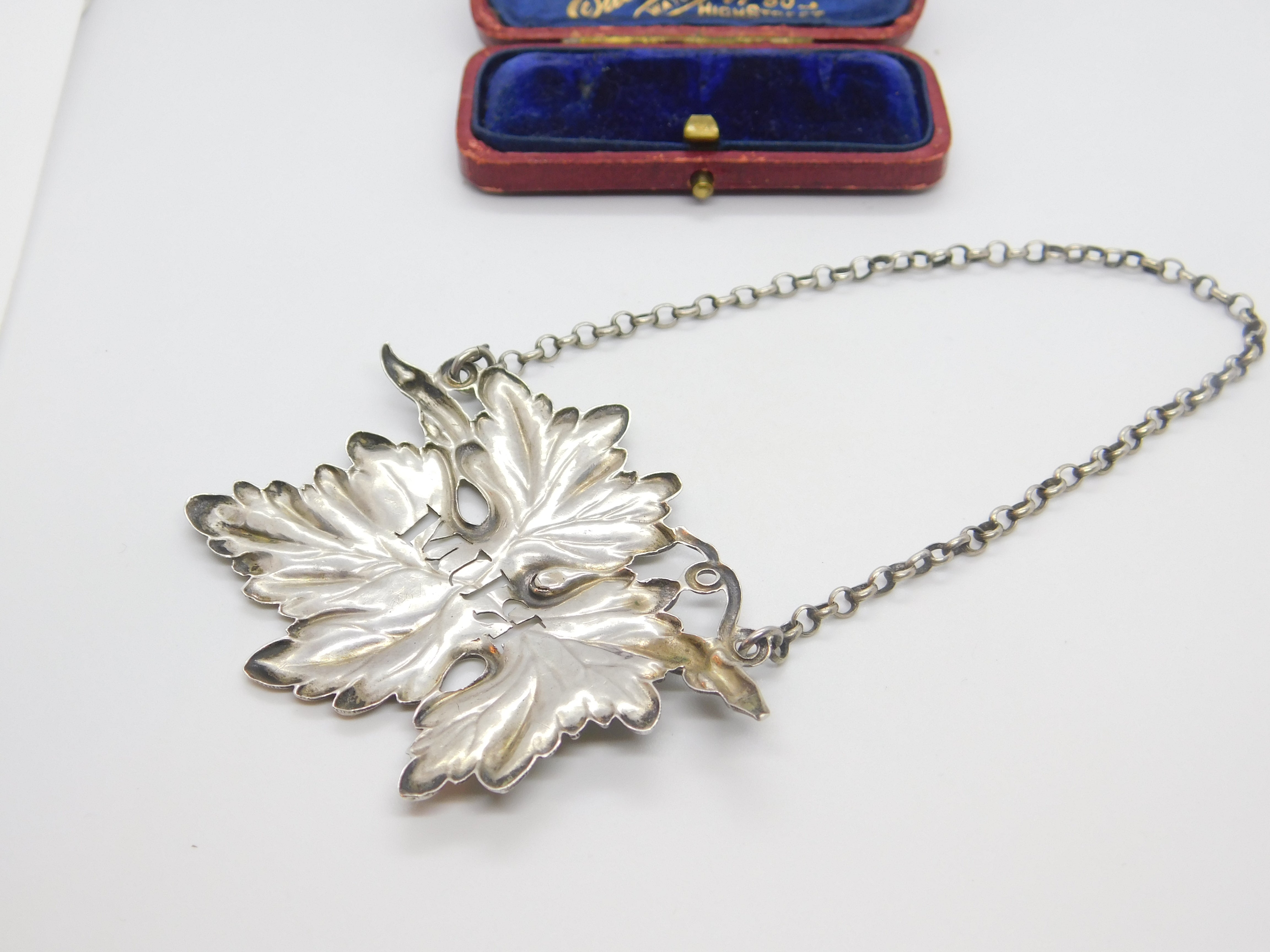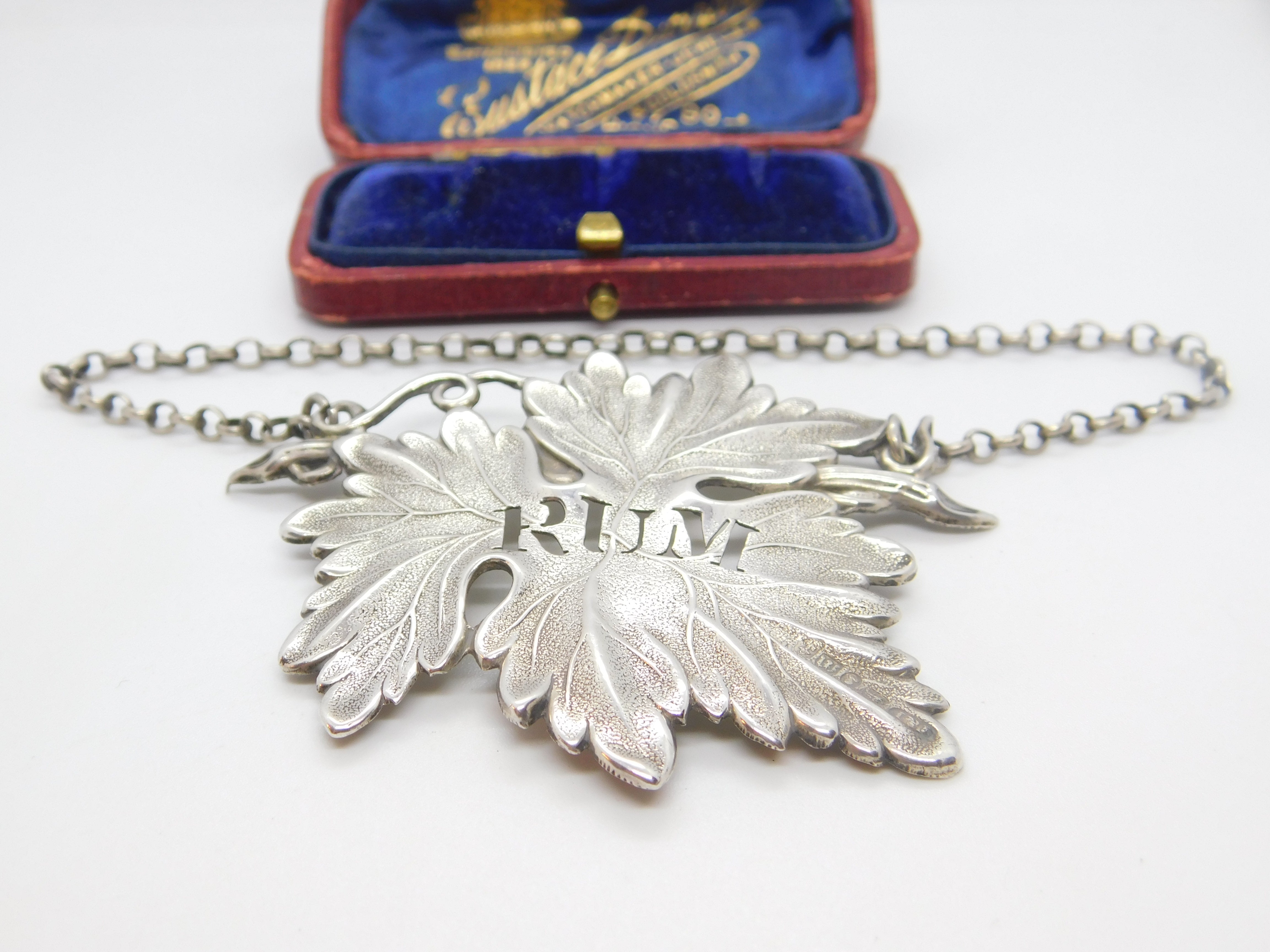 Details: A fantastic and wonderfully designed antique Georgian sterling silver leaf form Rum decanter or bottle label with lovely detail hallmarked Birmingham 1835 by Taylor & Perry. This is a wonderful item that would make a perfect gift or addition to any collection. The BOX pictured is for PRESENTATION ONLY and is NOT included in the listings but used to frame the pictures unless specifically stated otherwise.