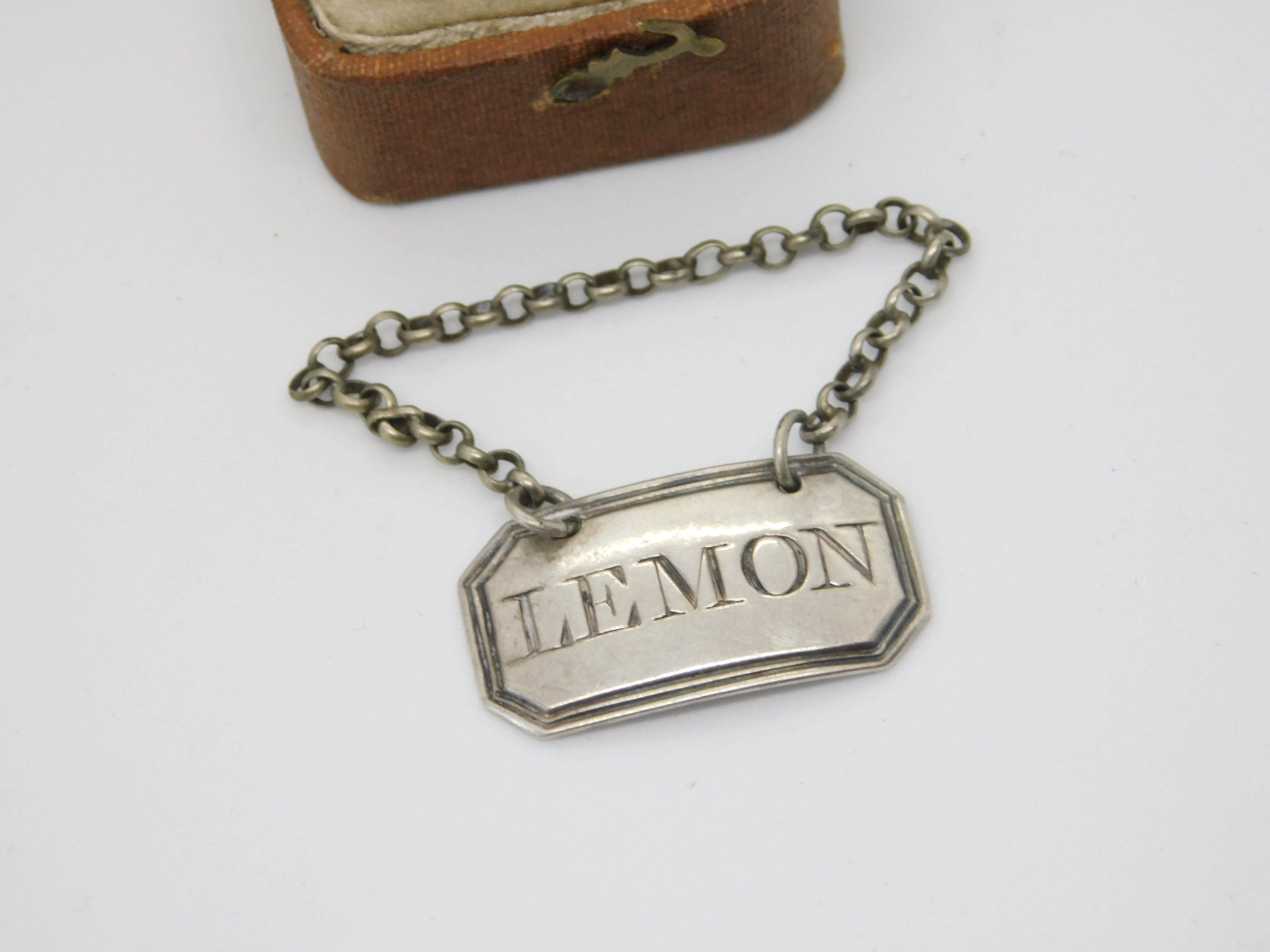 Details: A fantastic and wonderfully designed antique Georgian sterling silver scarce 'Lemon' sauce label or bottle ticket with excellent bright cut lettering hallmarked only with a makers mark to the reverse by Thomas Phipps & Edward Robinson c1790, London. This is a wonderful item that would make a perfect gift or addition to any collection. The BOX pictured is for PRESENTATION ONLY and is NOT included in the listings but used to frame the pictures unless specifically stated otherwise.