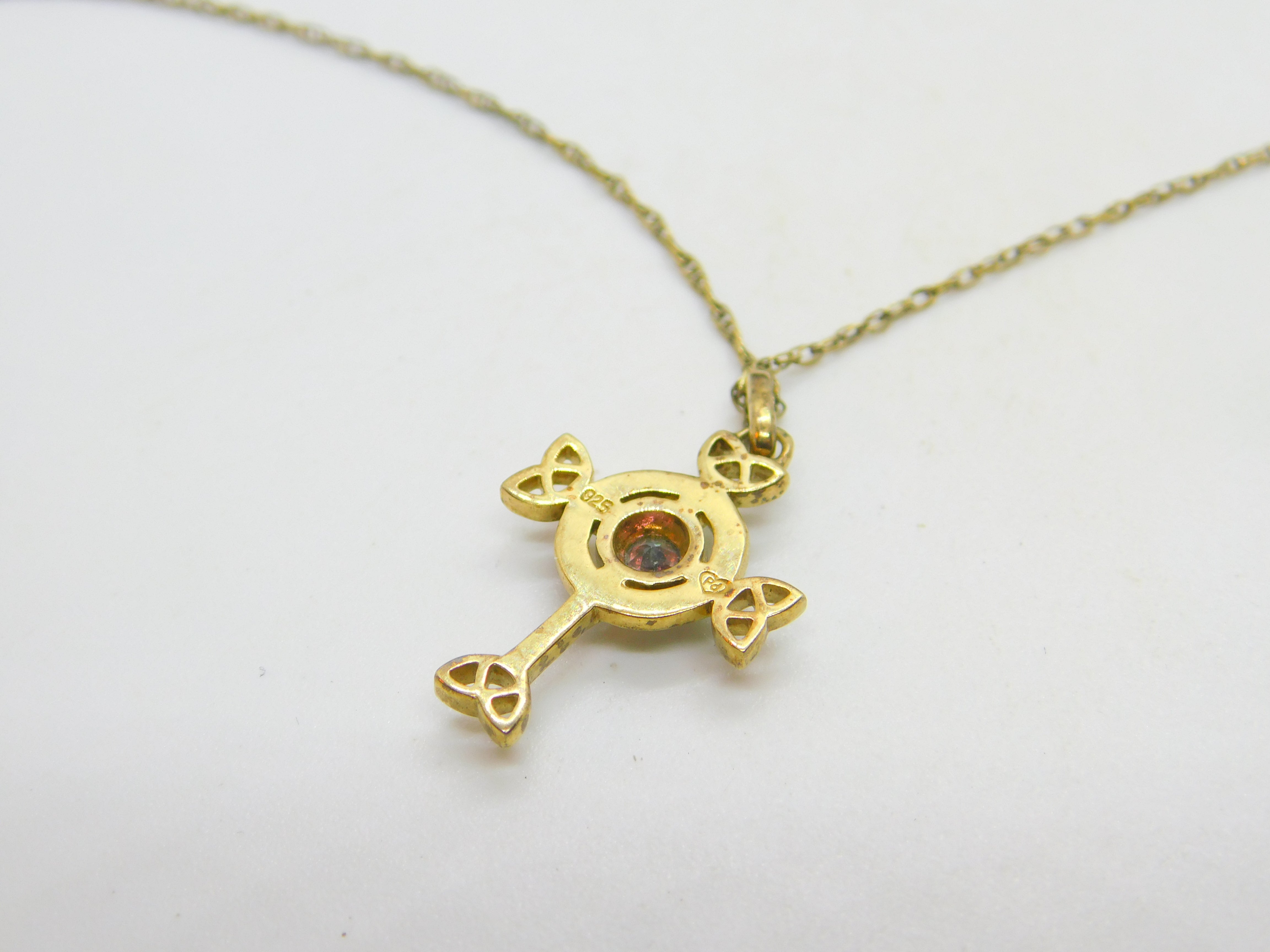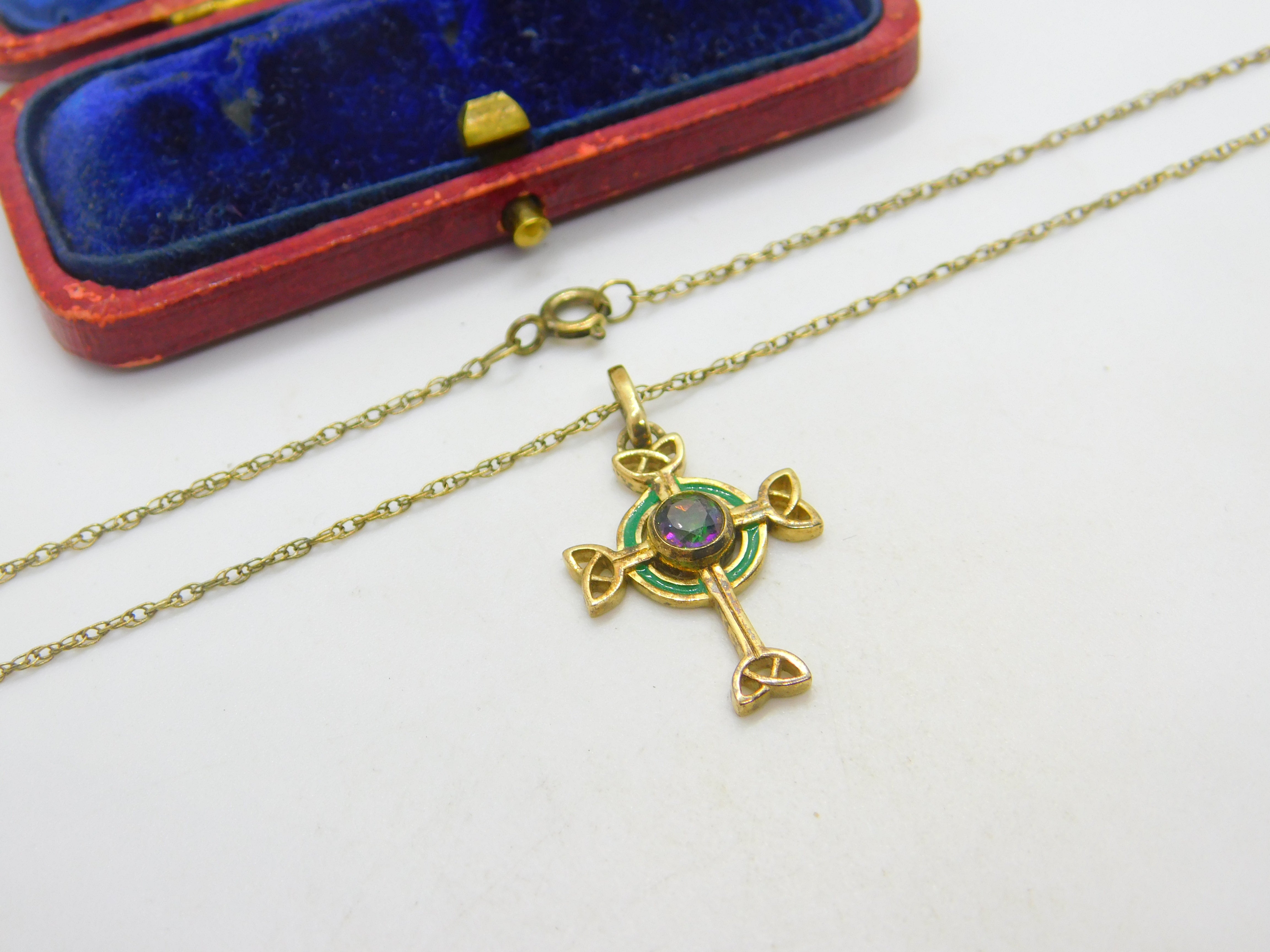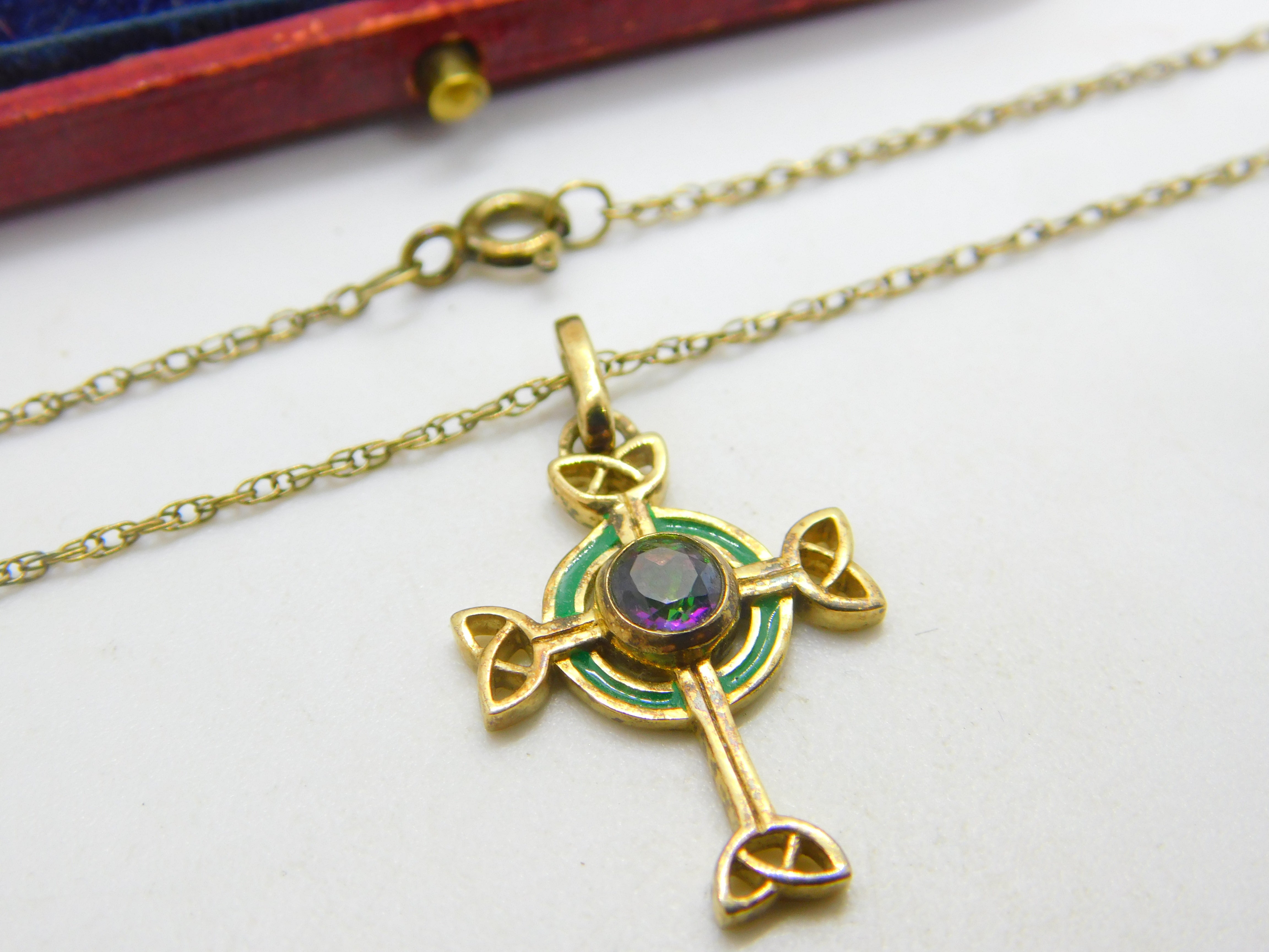 Gold on Sterling Silver Mystic Topaz Set Green Enamel Celtic Cross Necklace