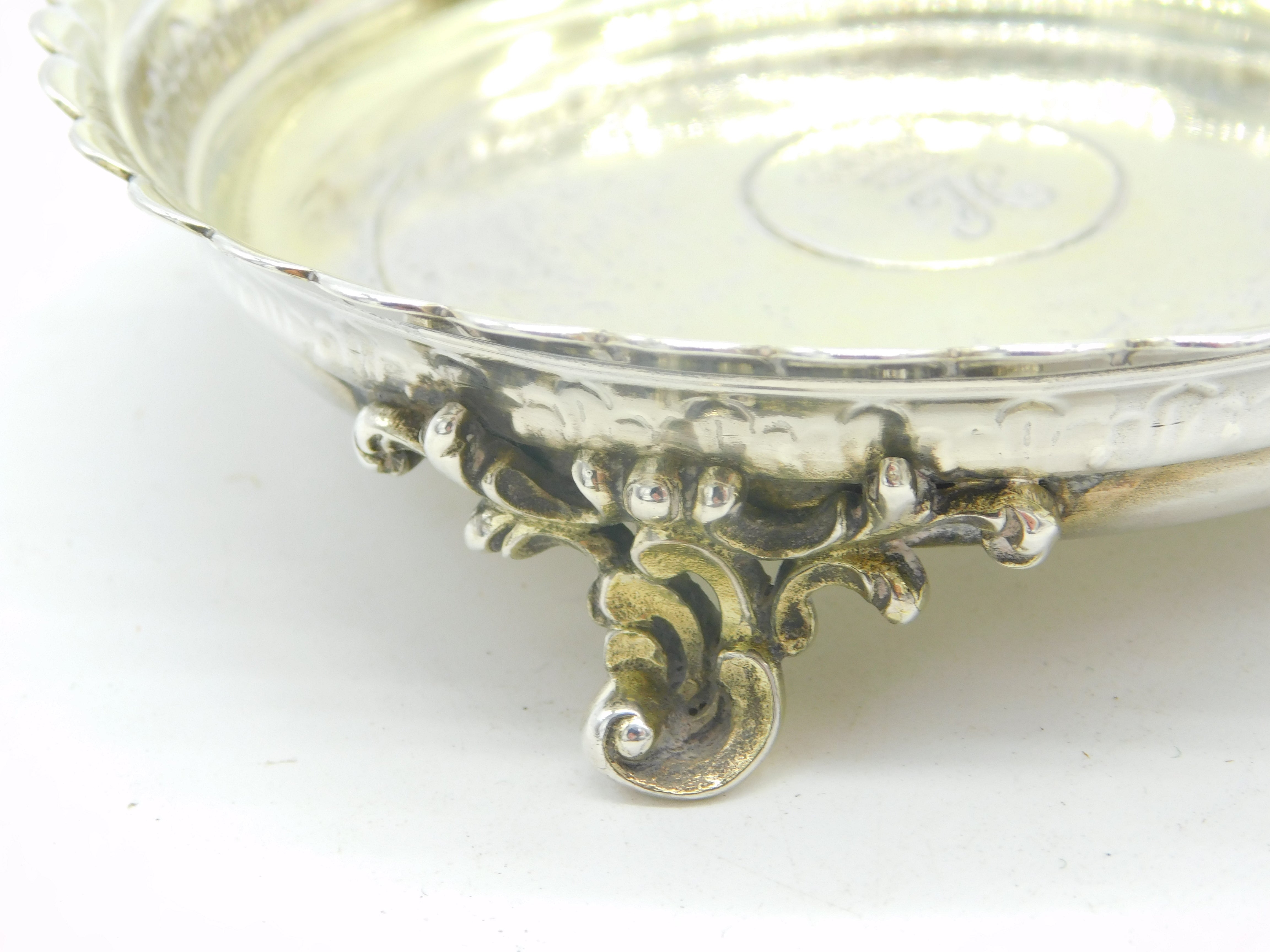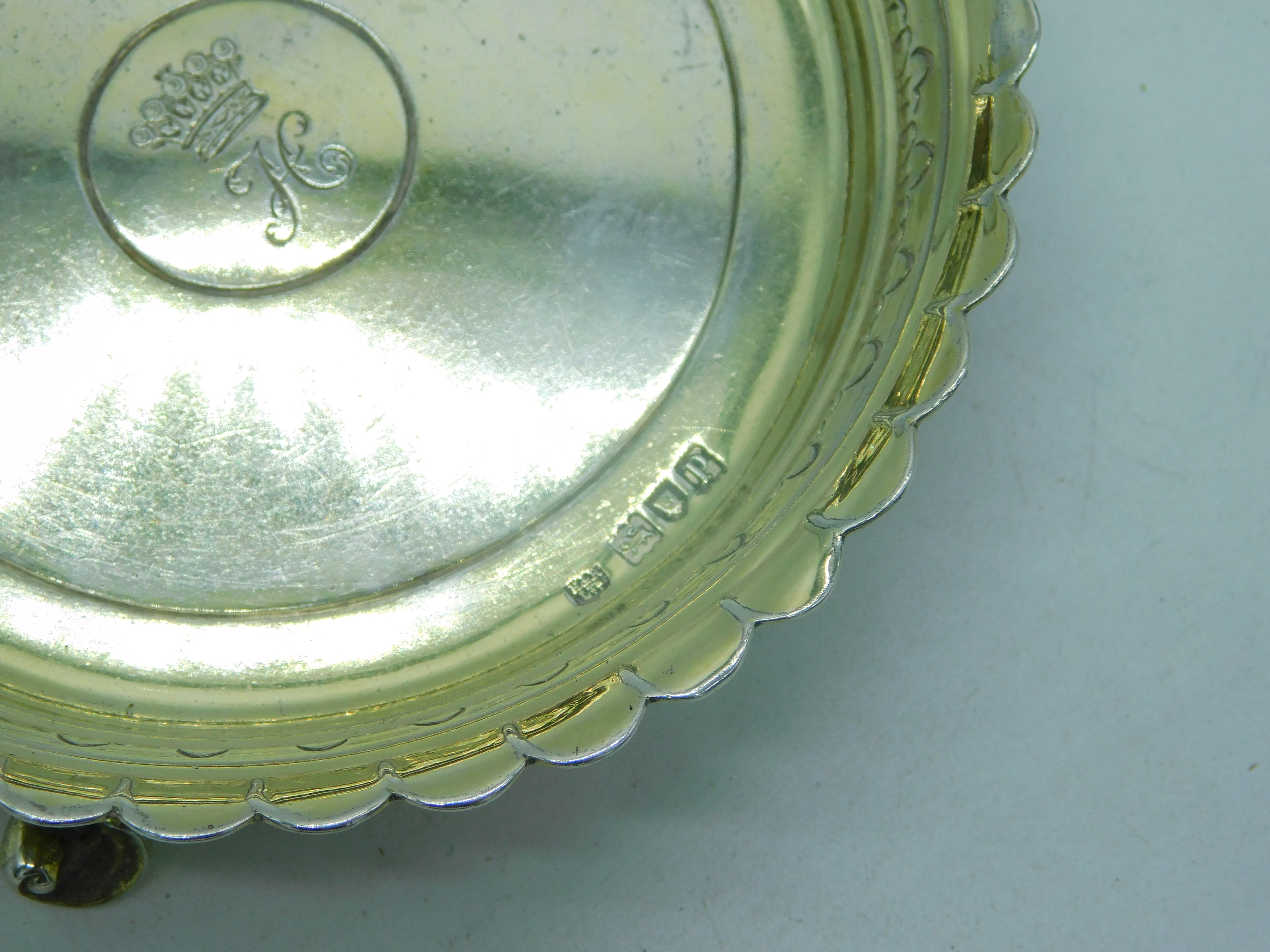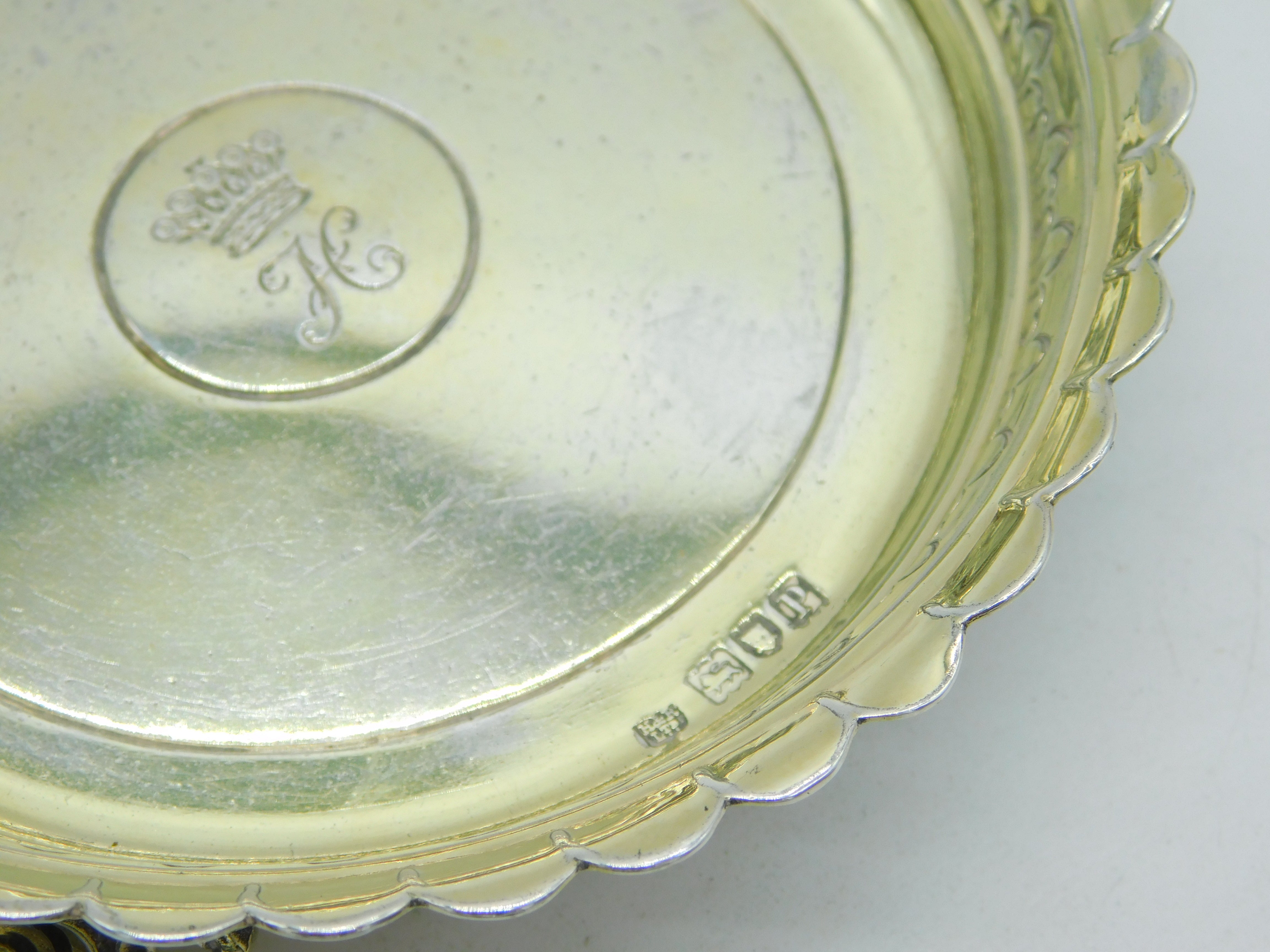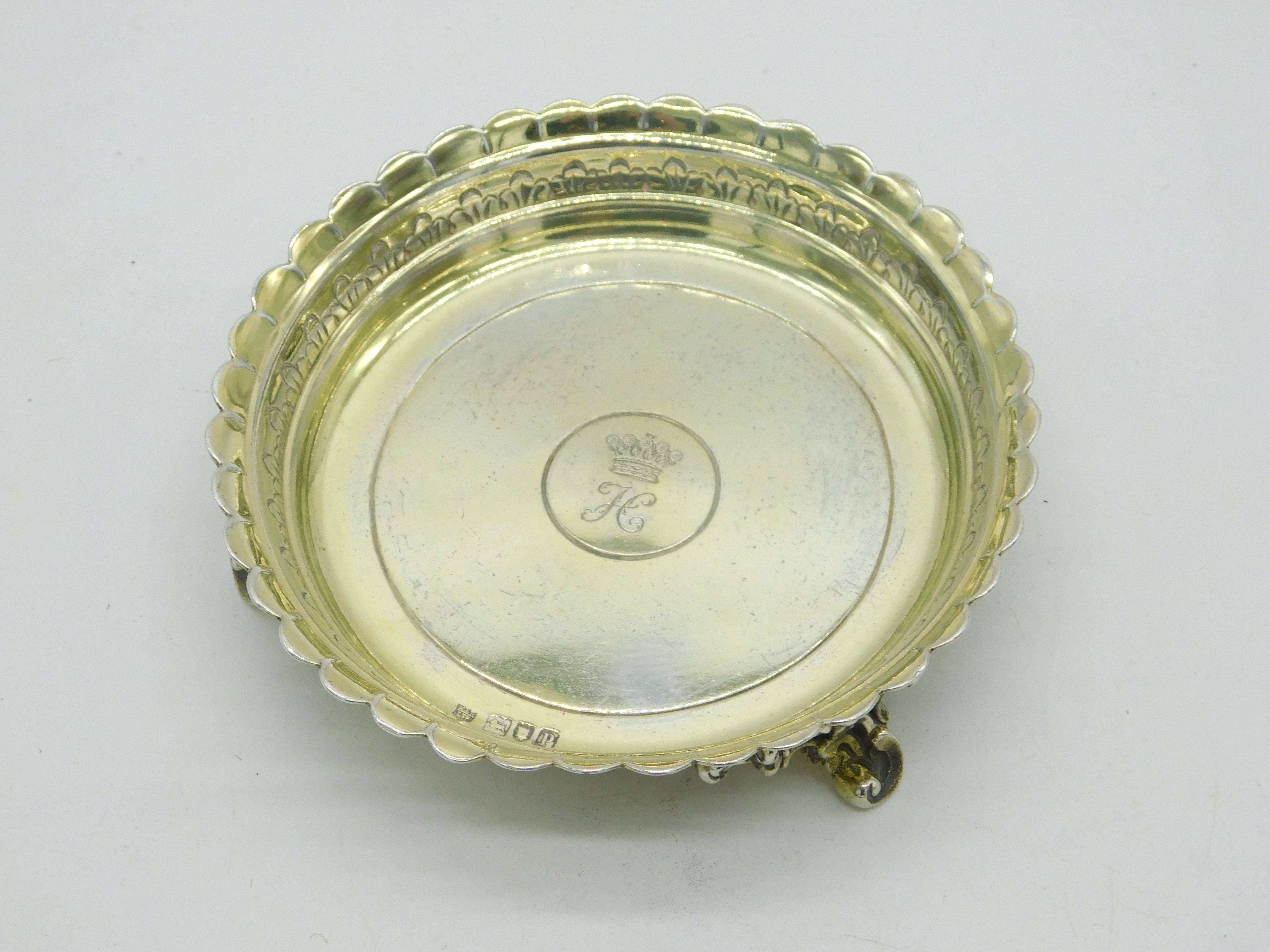 Details: A fantastic and wonderfully designed antique Edwardian sterling silver gilded glass coaster dish with charming nouveau feet engraved with charming crest to the centre showing a coronet over H initial hallmarked London 1910 by Hunt & Roskell the prestigious silver manufacturers who bore the warrant of Queen Victoria for many years found by Paul Storr. This is a wonderful item that would make a perfect gift or addition to any collection. The BOX pictured is for PRESENTATION ONLY and is NOT included in the listings but used to frame the pictures unless specifically stated otherwise.