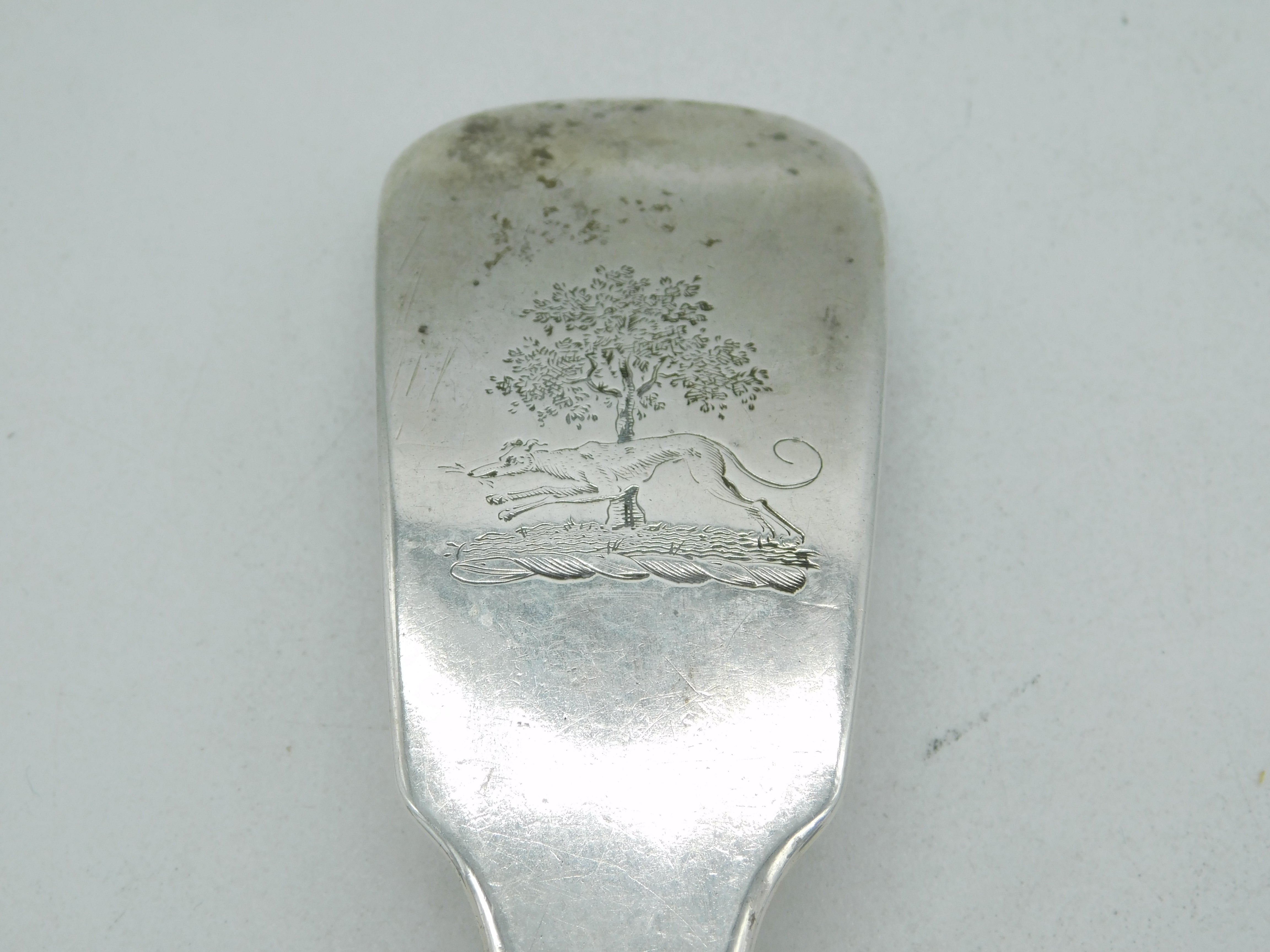 Details: A fantastic and wonderfully designed antique early Irish georgian sterling silver fish server with charming greyhound running heraldic crest to the terminal, engraved with an image of a fish to the bowl, clearly hallmarked Dublin 1806 to the reverse by maker 'J.D. This is a wonderful item that would make a perfect gift or addition to any collection.