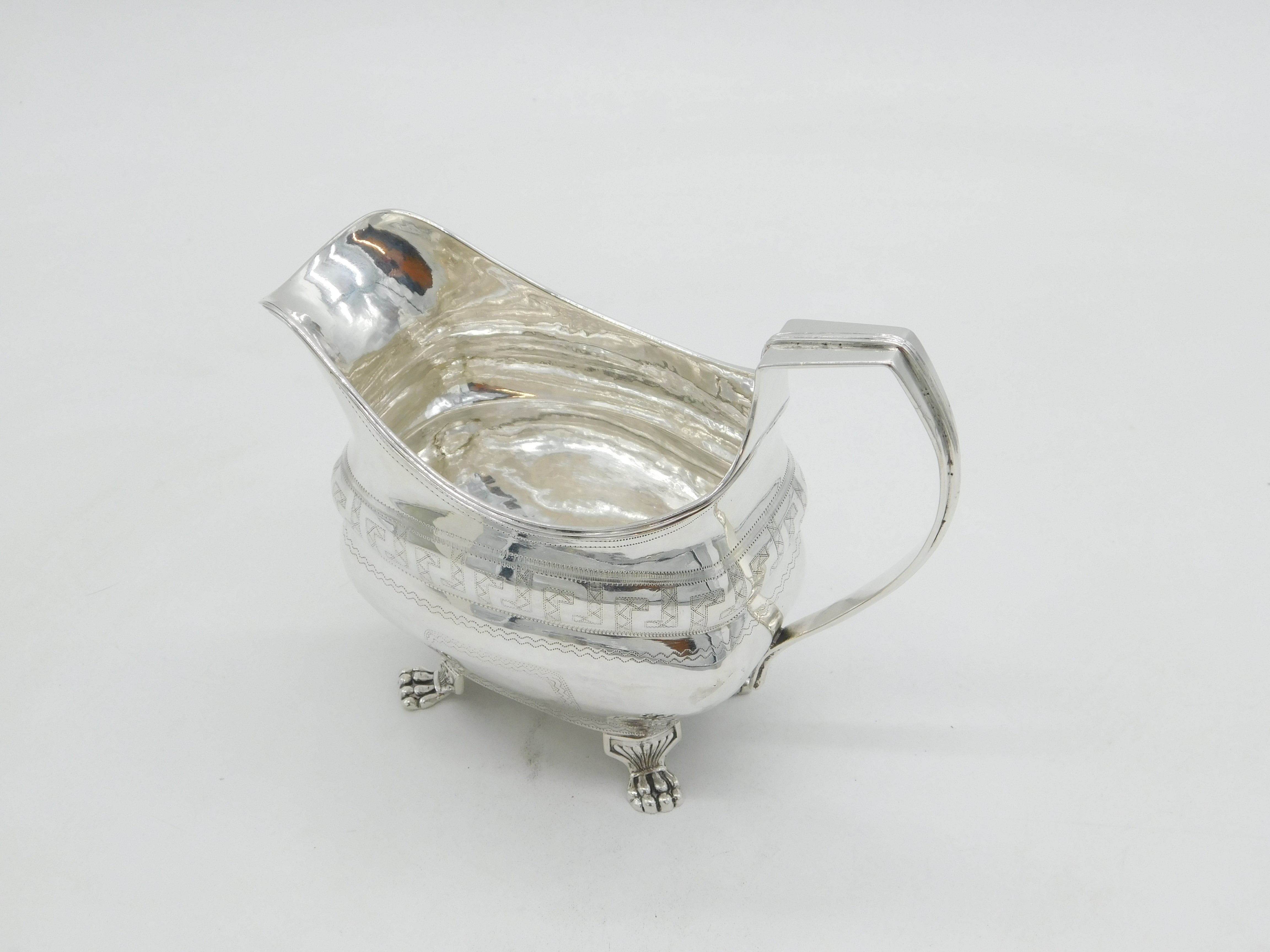 Details: A fantastic and wonderfully designed antique georgian Irish sterling silver paw foot cream jug with lovely bright cut decoration hallmarked Dublin 1806 by James Scott. Lovely detailing and nice quality. This is a wonderful item that would make a perfect gift or addition to any collection. We are more than happy to provide XRF reports for items upon request.