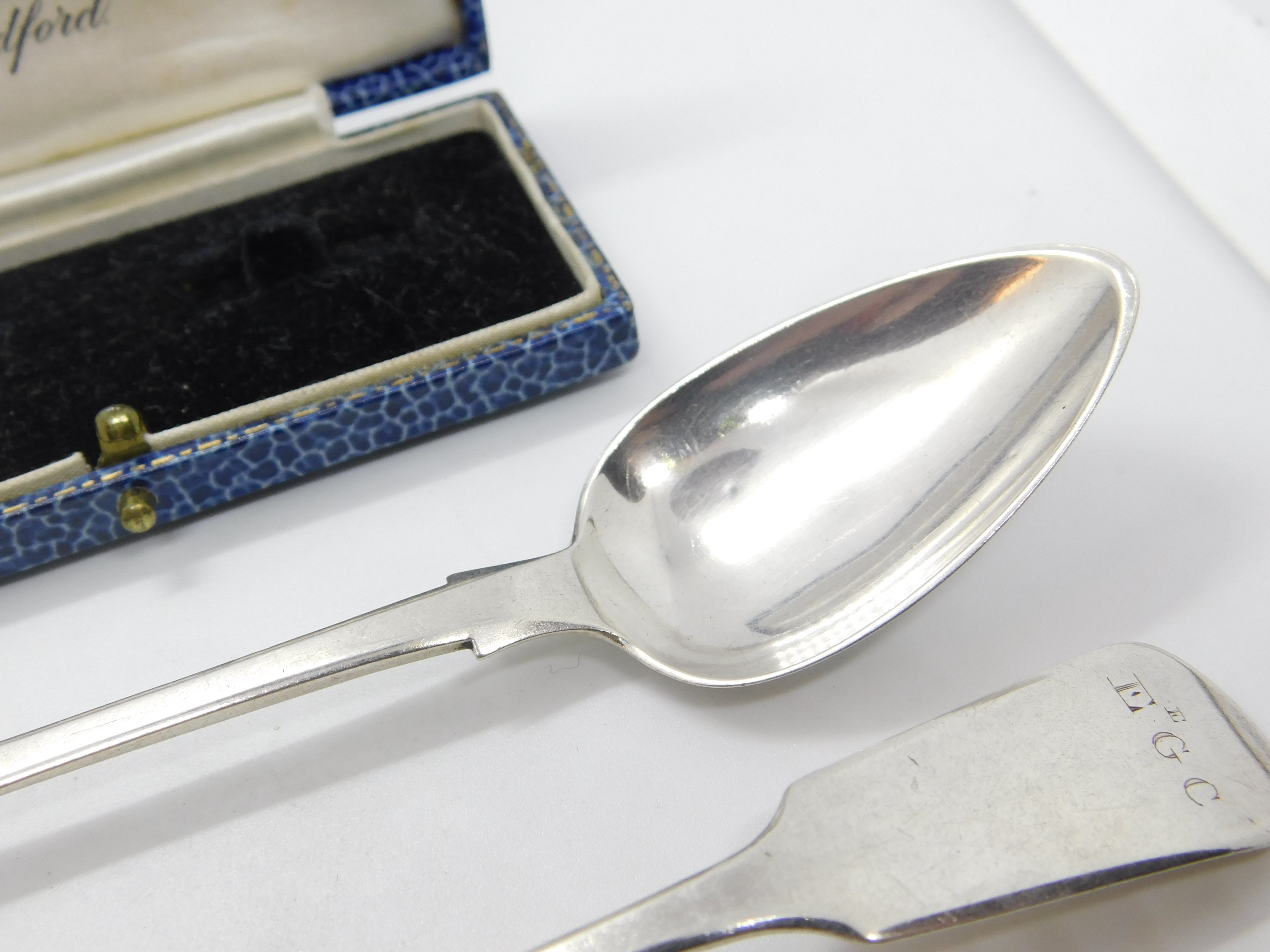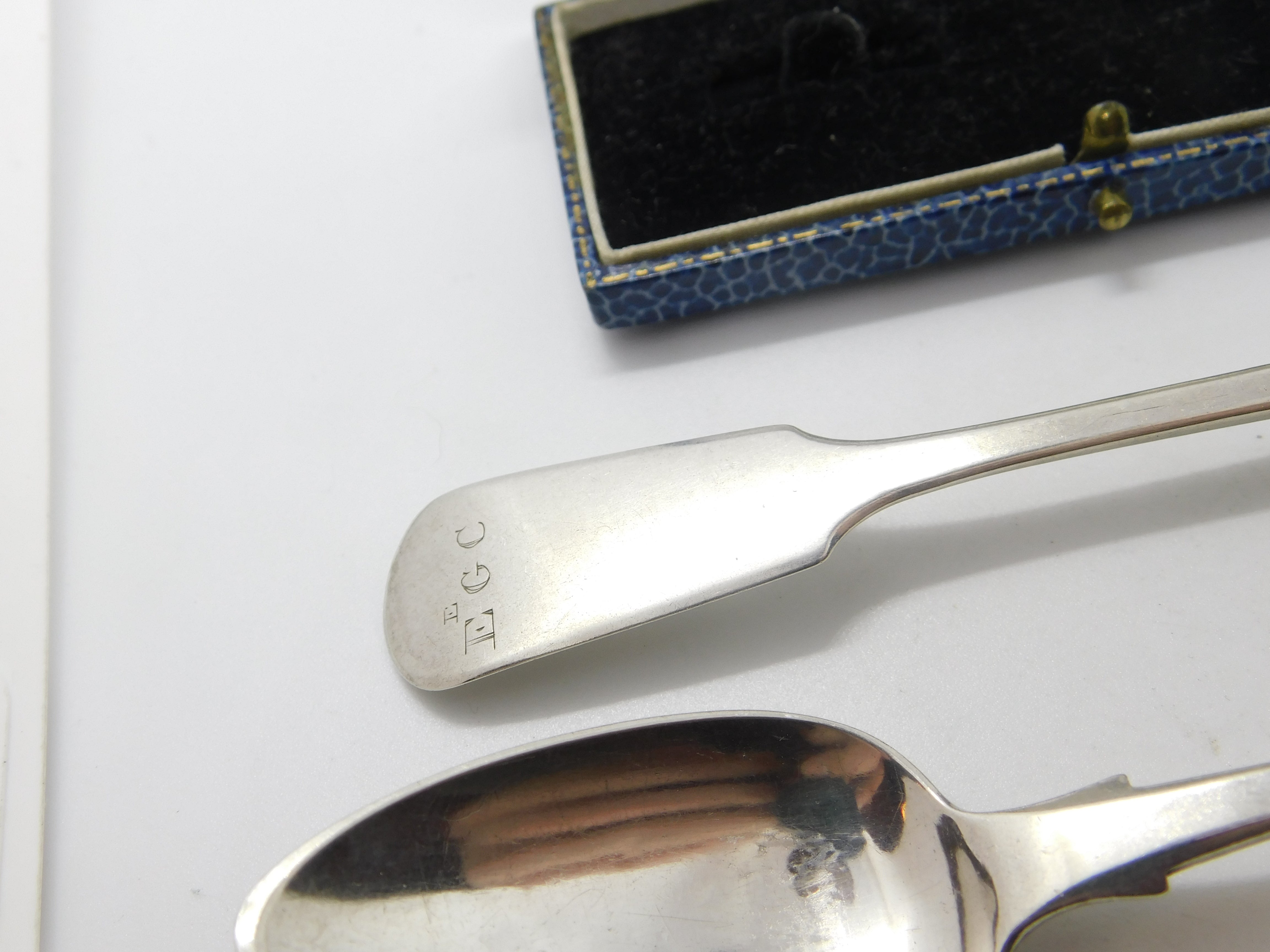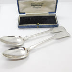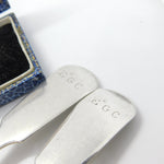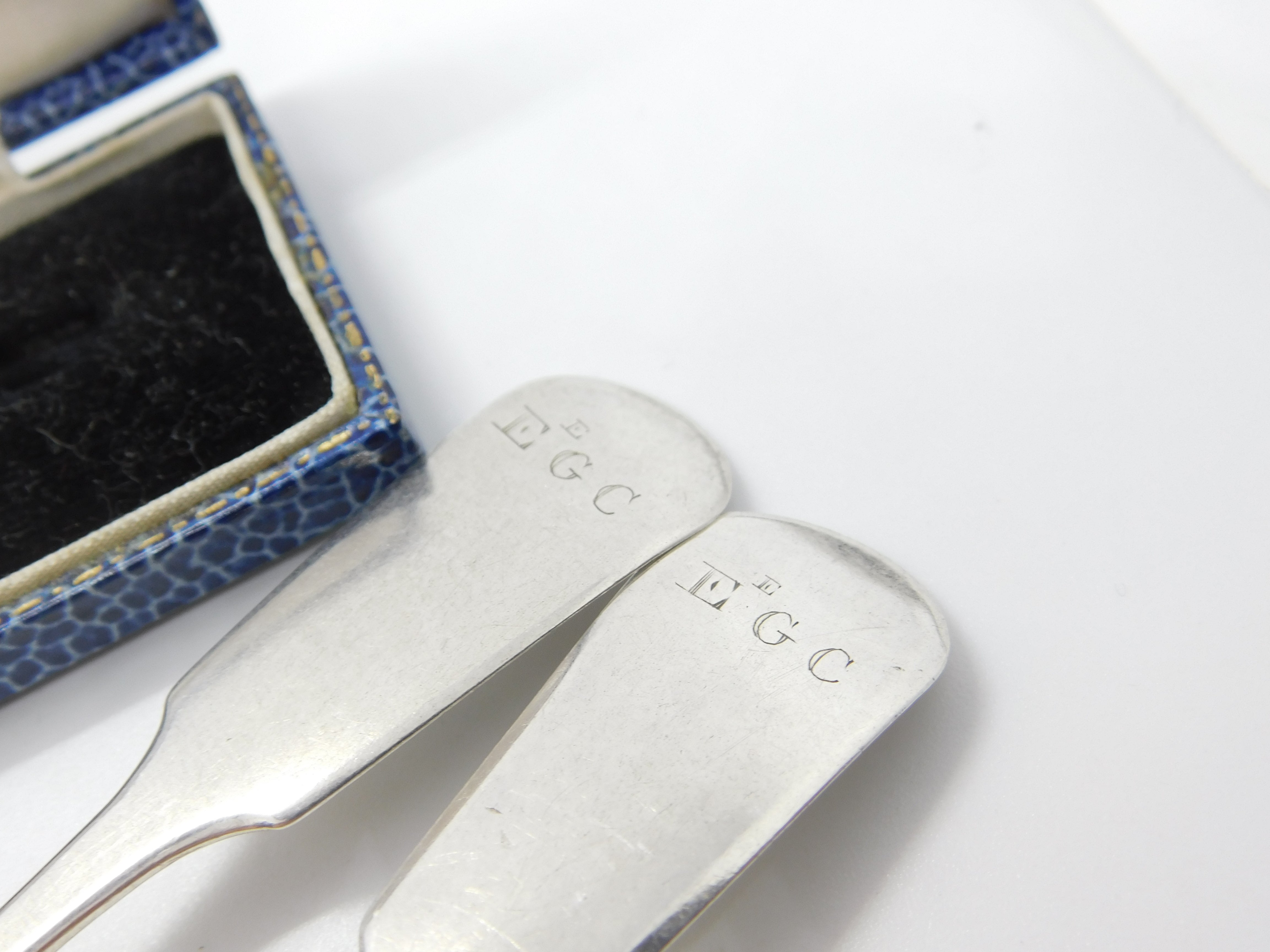 Details: A fantastic and wonderfully designed pair of antique Georgian Jersey provincial sterling silver fiddle thread pattern tea spoons with bright cut EGC initials to the terminals both hallmarked with the CWQ mark for Charles William Quesnel of Jersey and engrave dated 1829. An unusual example. This is a wonderful item that would make a perfect gift or addition to any collection. The BOX pictured is for PRESENTATION ONLY and is NOT included in the listings but used to frame the pictures unless specifically stated otherwise.