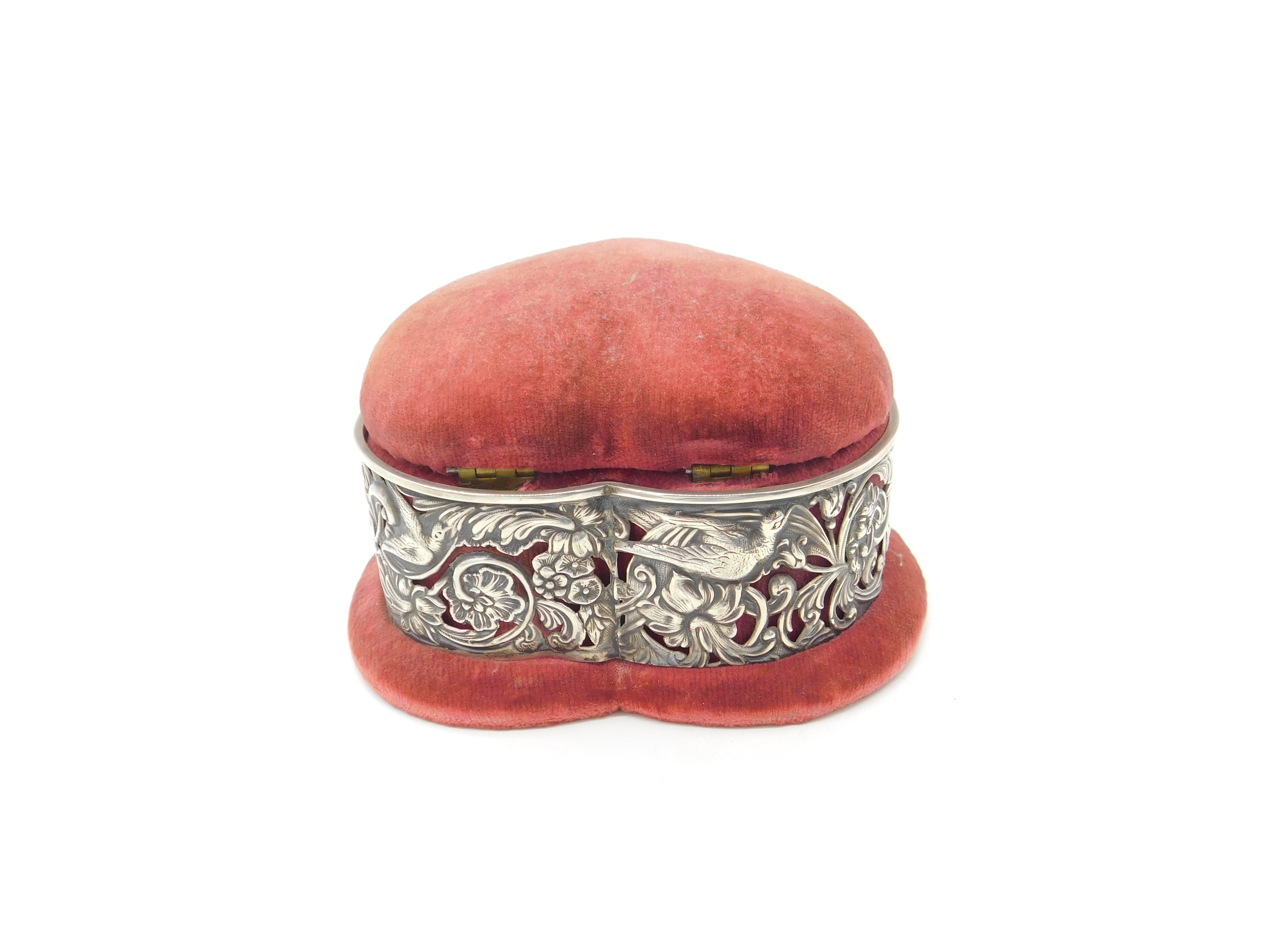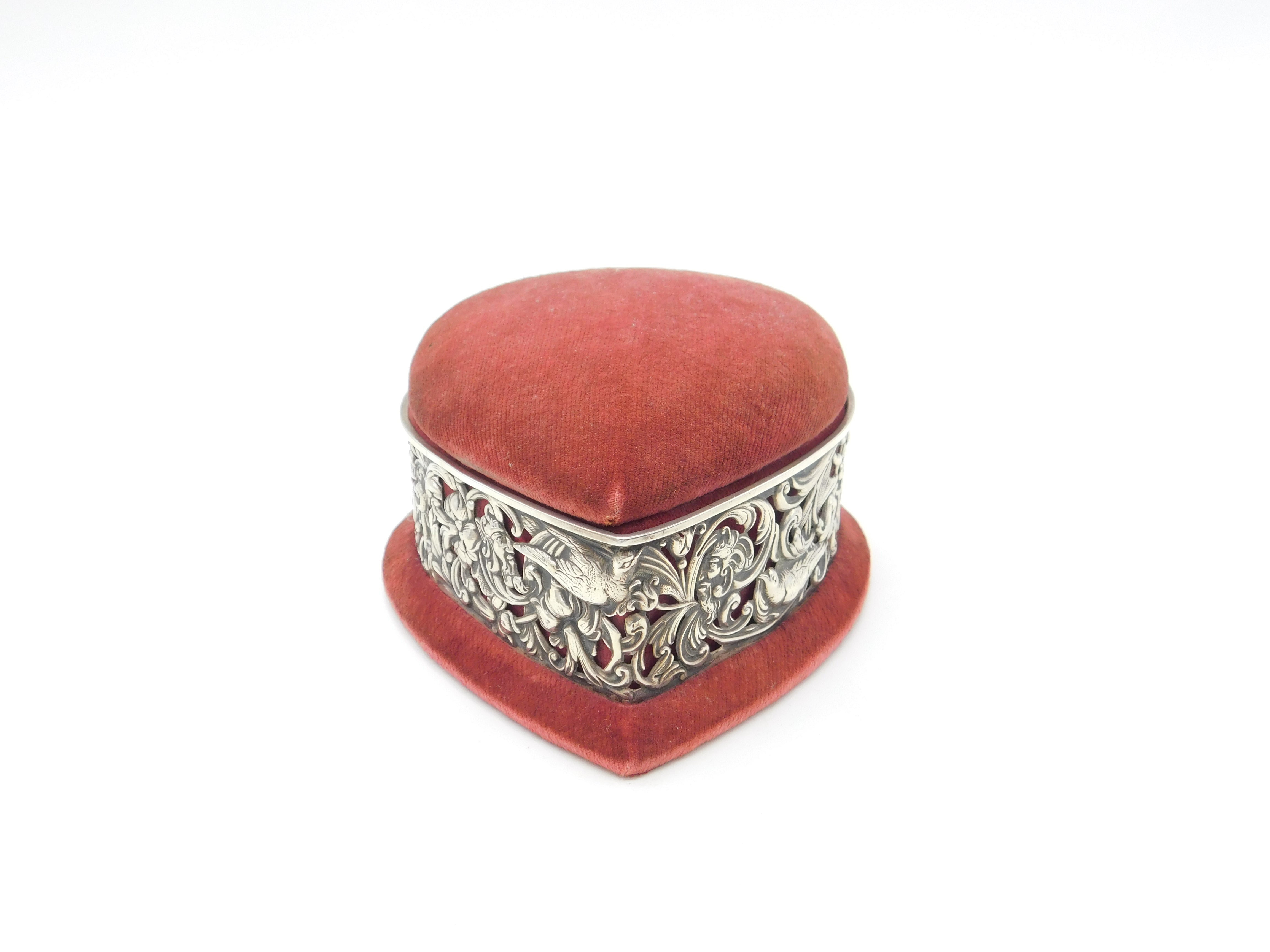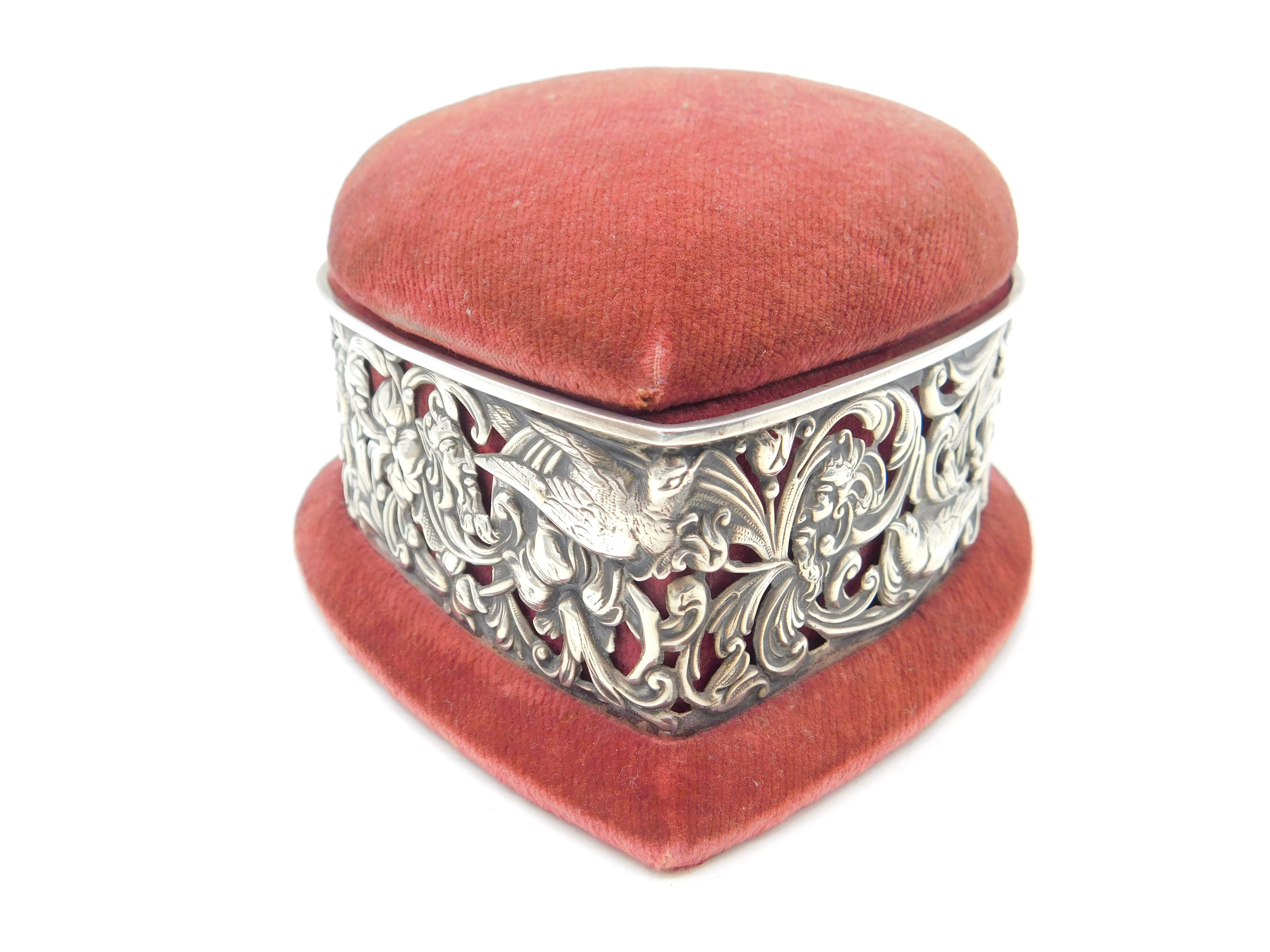 Large Victorian Sterling Silver Bird & Floral Pattern Heart Pin Cushion Box 1900 William Comyns