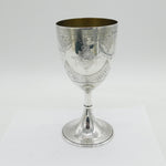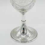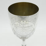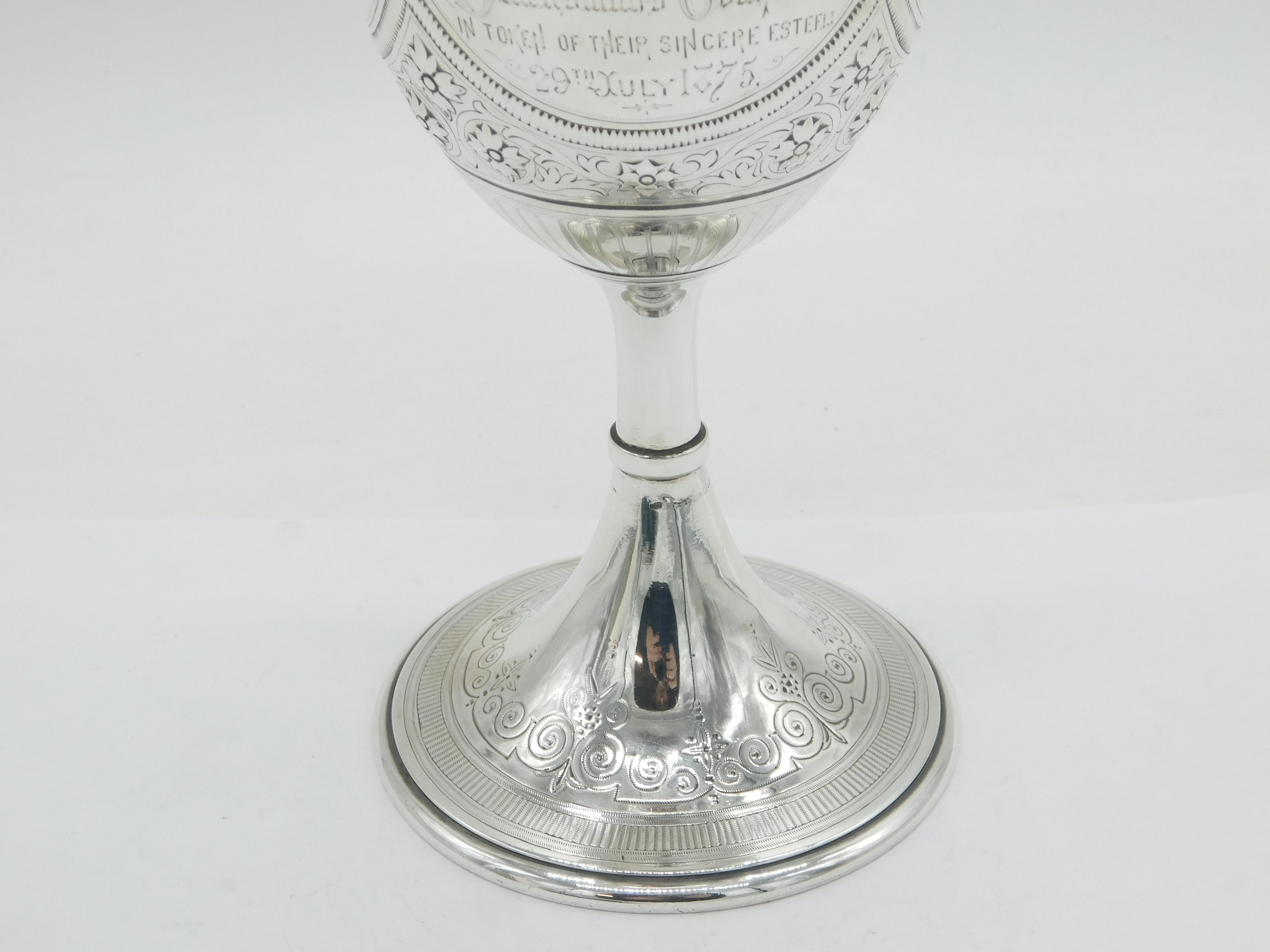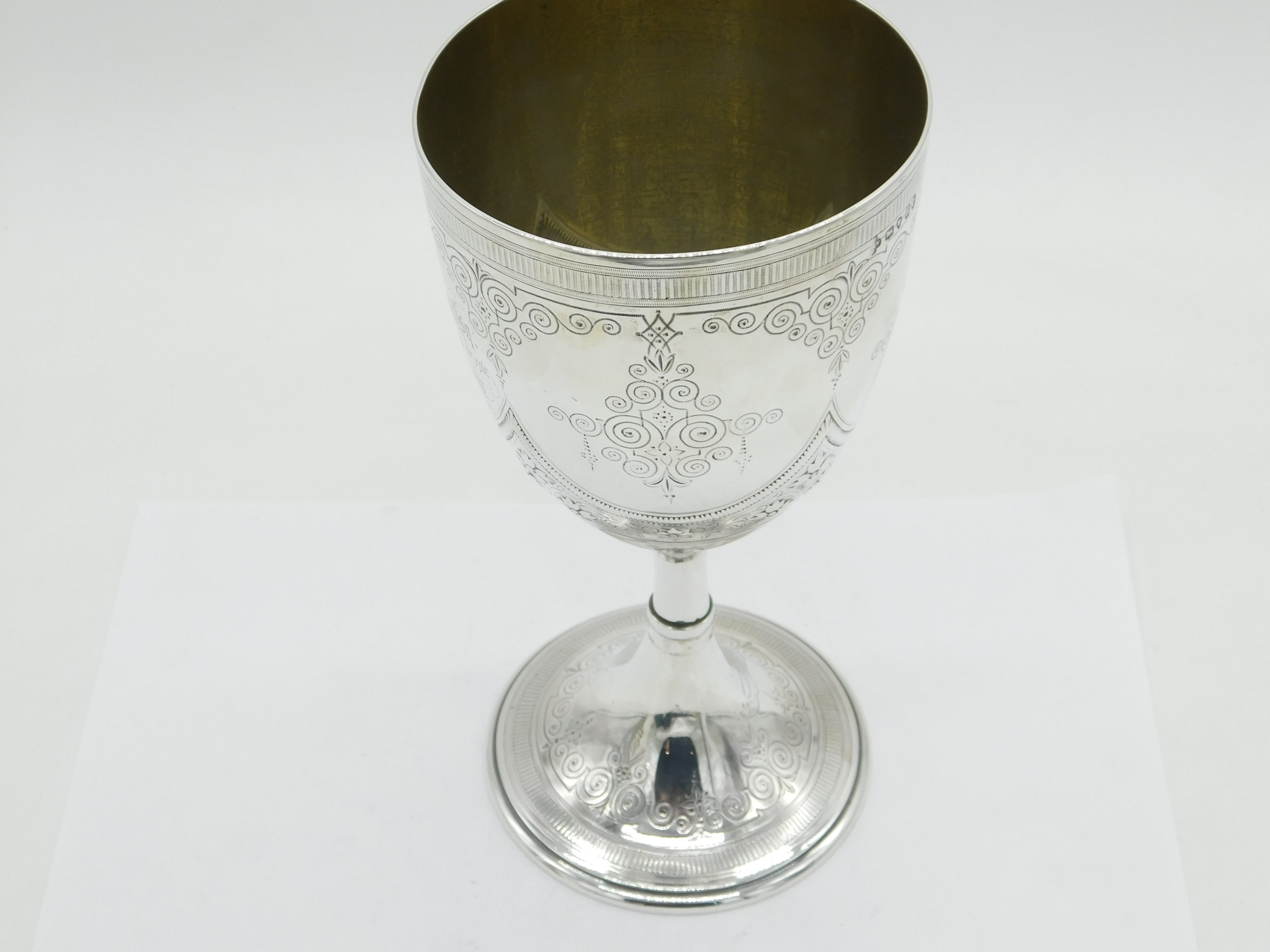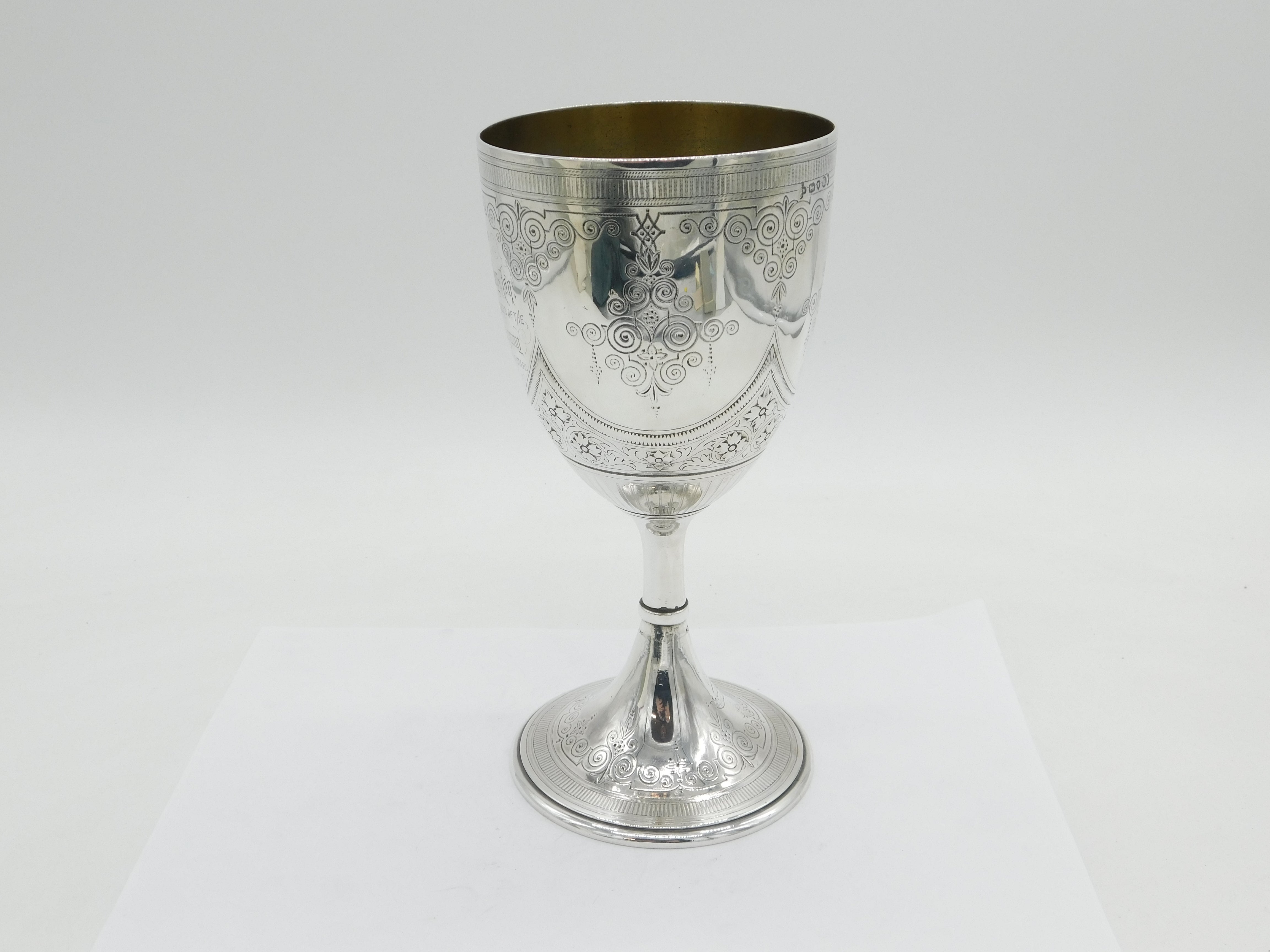 Details: A fantastic and wonderfully designed antique Victorian large sterling silver chalice goblet cup decorated throughout with floral patterns hallmarked to the upper edge London 1875 by Barnard & Sons Ltd. The cup is engraved with presentation details from the Blacksmiths Company in July, 1875 although this could be removed by a silversmith if required. Potentially a repair to the stem although unsure. Heraldic faint crest to the bottom edge. This is a wonderful item that would make a perfect gift or addition to any collection. The BOX pictured is for PRESENTATION ONLY and is NOT included in the listings but used to frame the pictures unless specifically stated otherwise.
