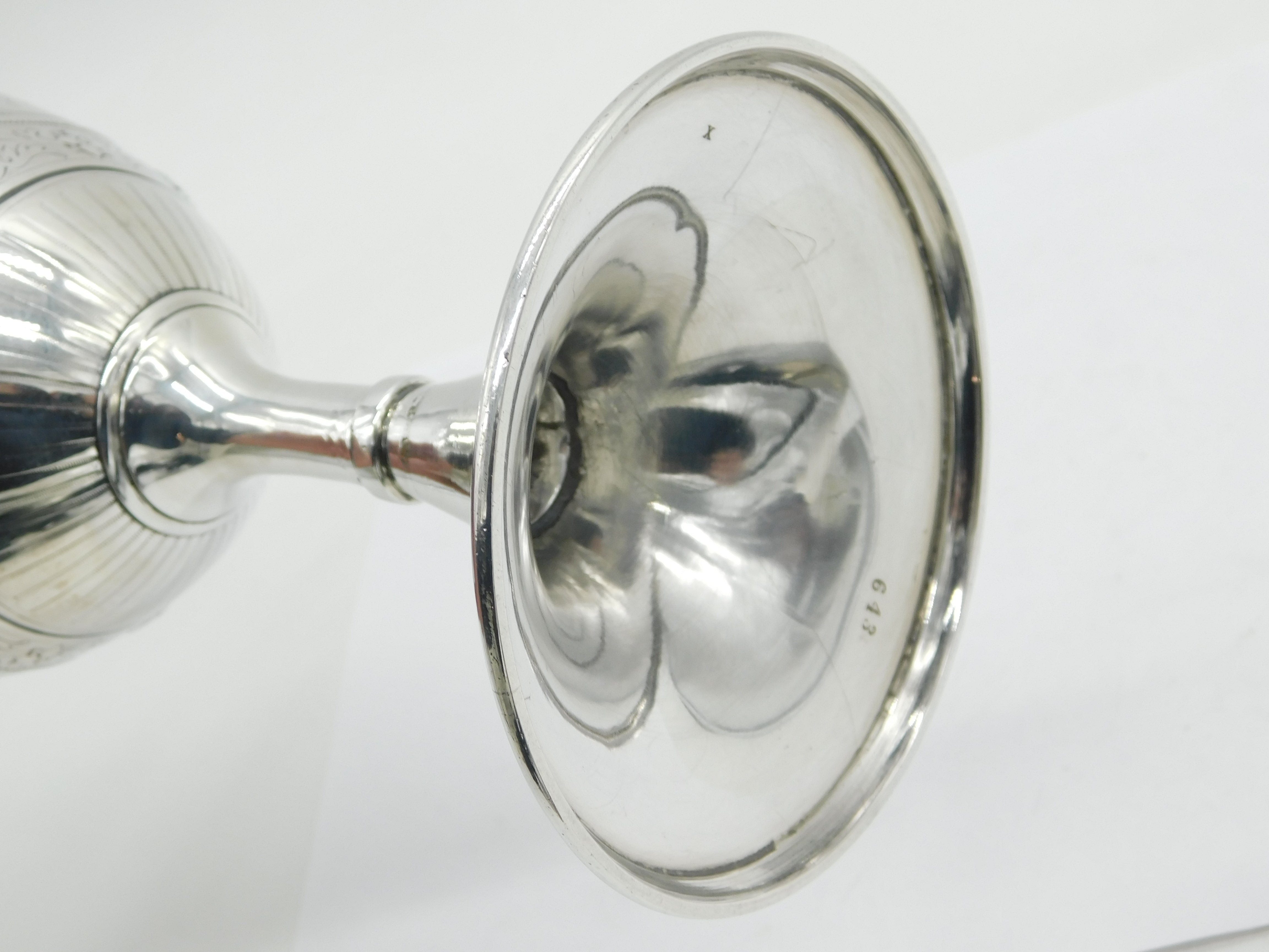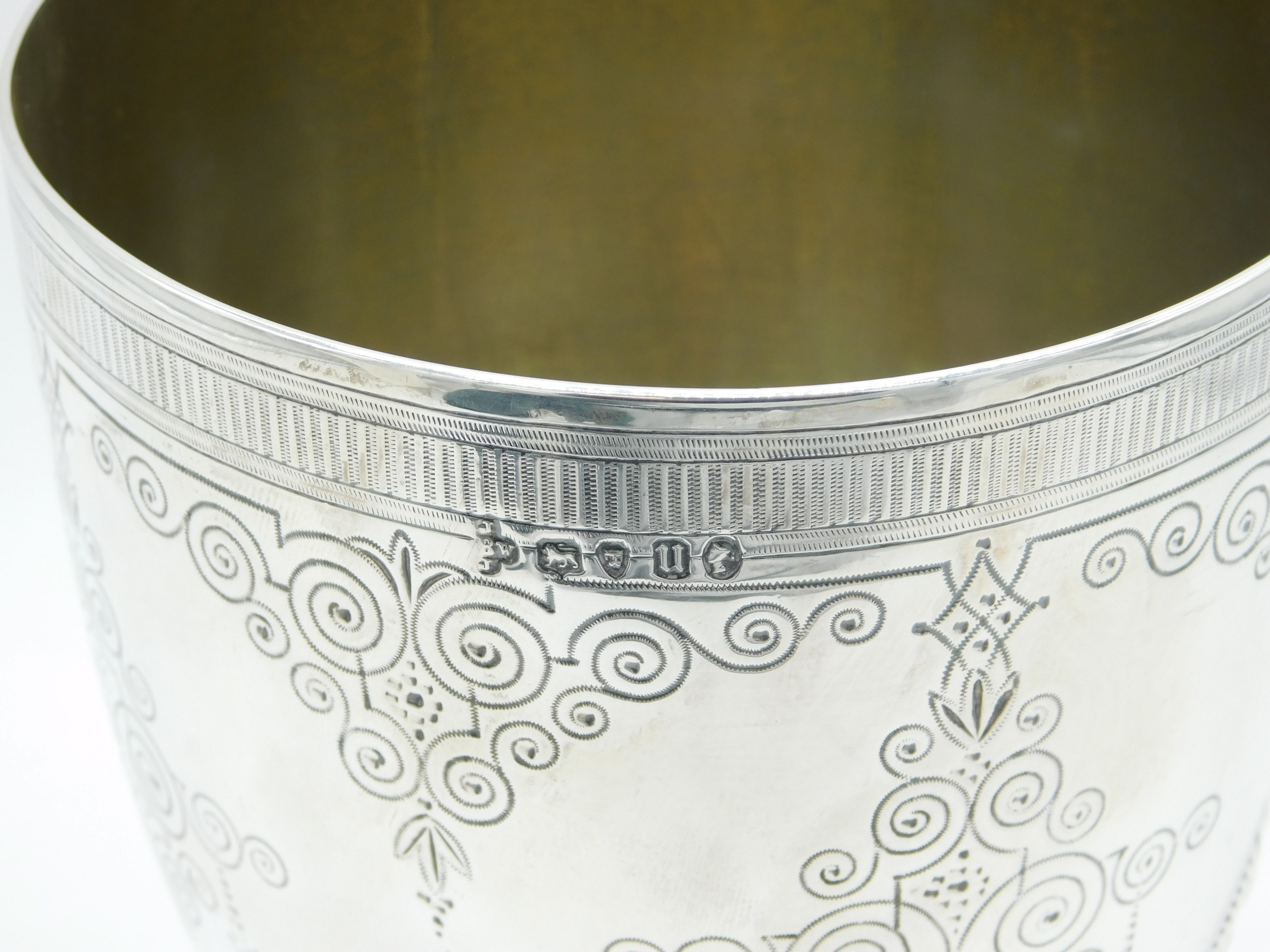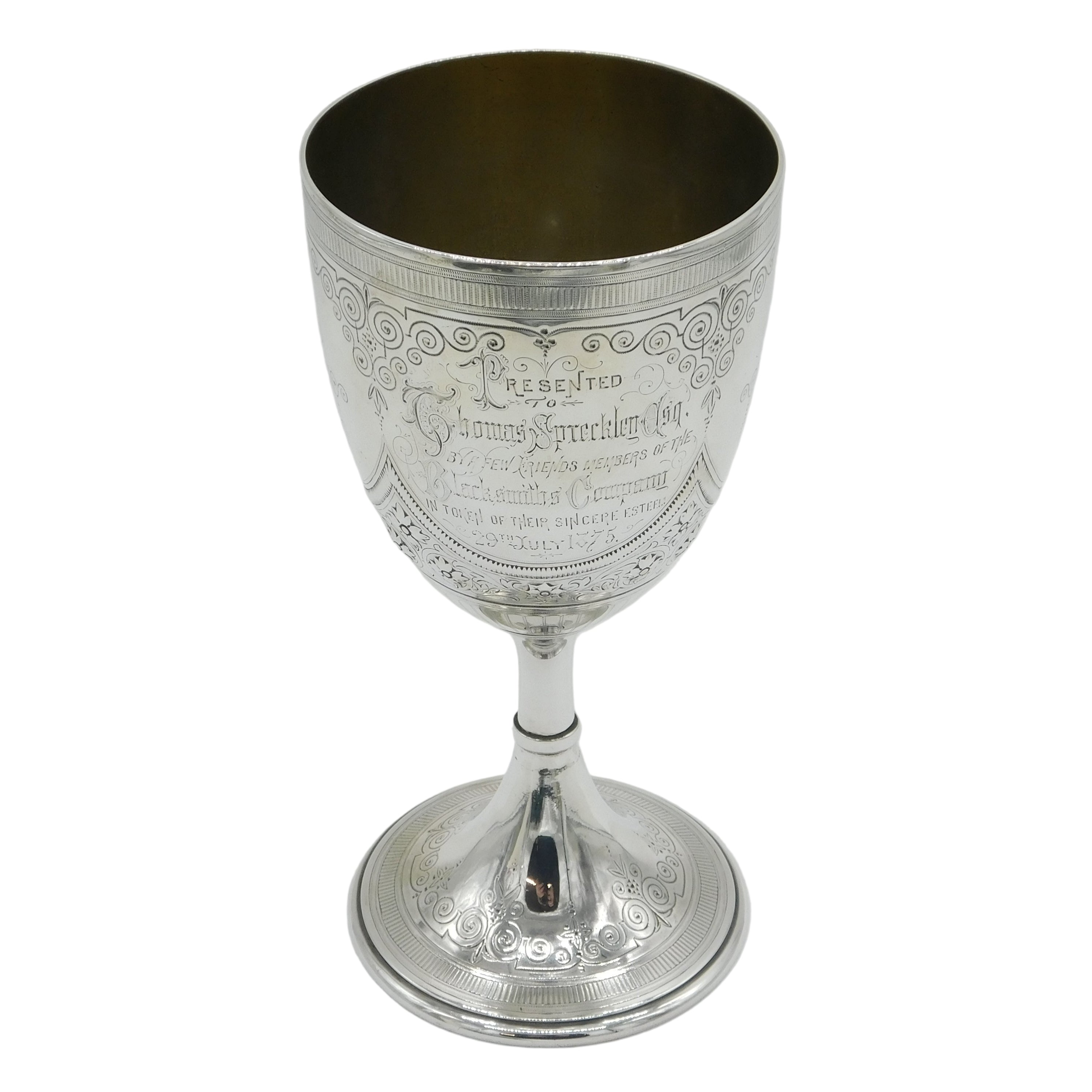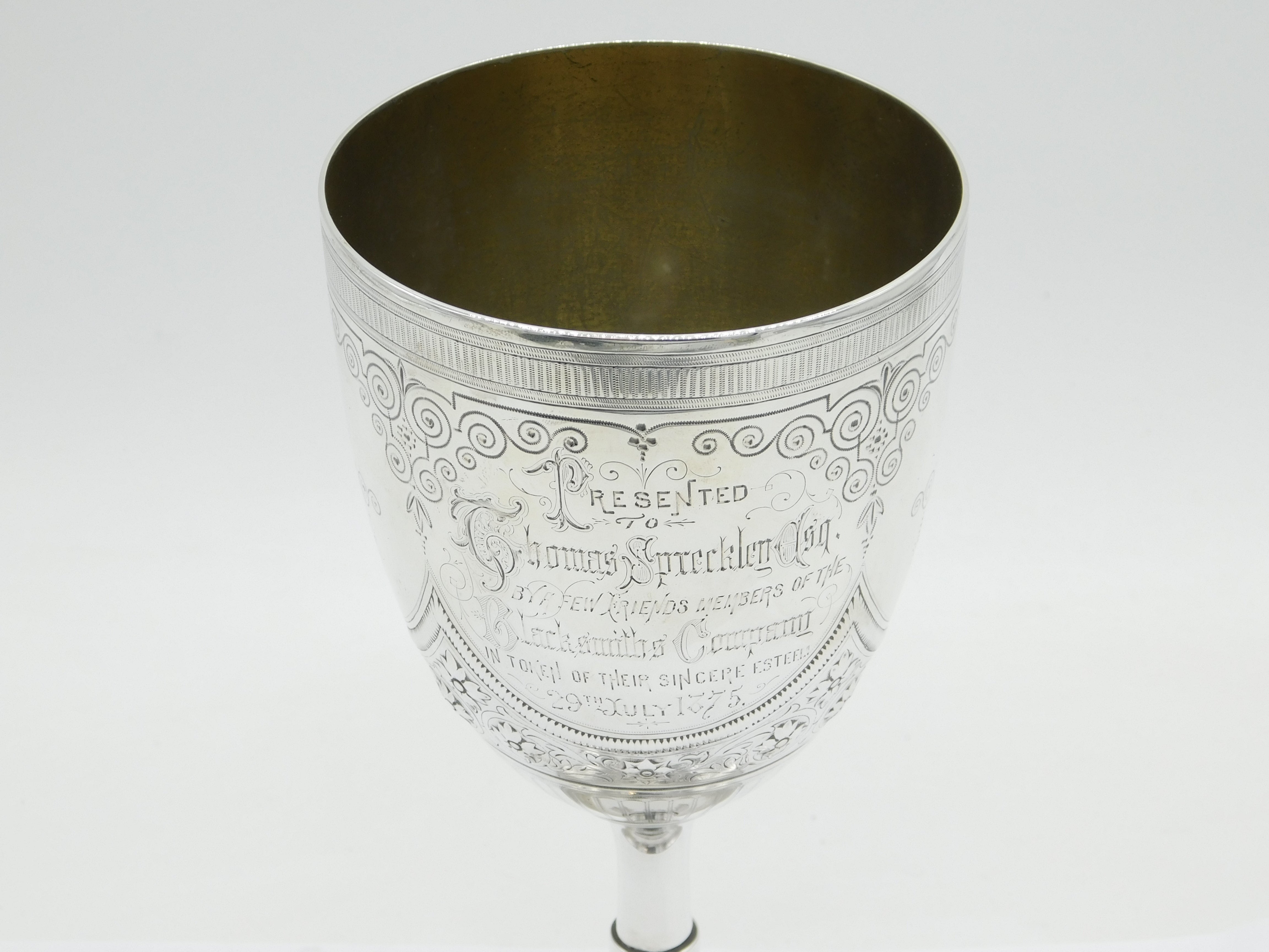 Details: A fantastic and wonderfully designed antique Victorian large sterling silver chalice goblet cup decorated throughout with floral patterns hallmarked to the upper edge London 1875 by Barnard & Sons Ltd. The cup is engraved with presentation details from the Blacksmiths Company in July, 1875 although this could be removed by a silversmith if required. Potentially a repair to the stem although unsure. Heraldic faint crest to the bottom edge. This is a wonderful item that would make a perfect gift or addition to any collection. The BOX pictured is for PRESENTATION ONLY and is NOT included in the listings but used to frame the pictures unless specifically stated otherwise.