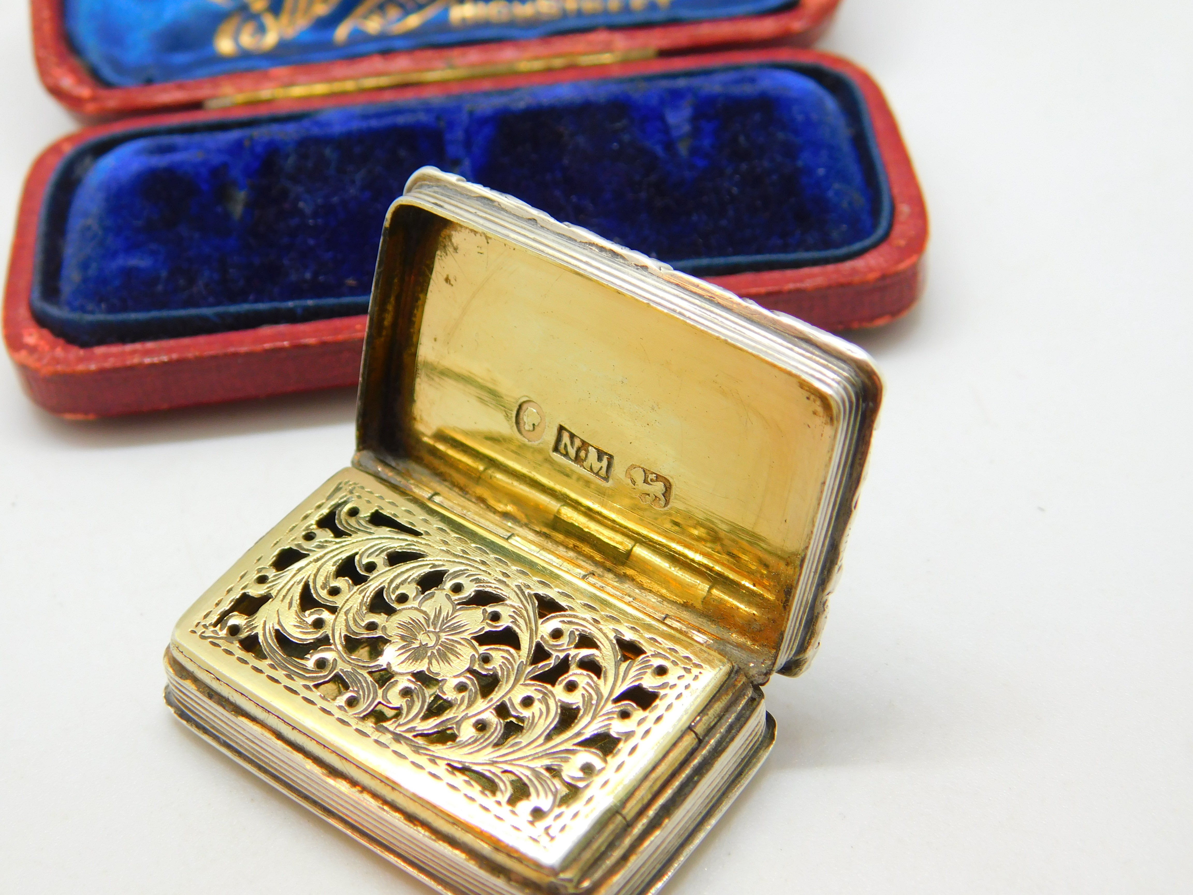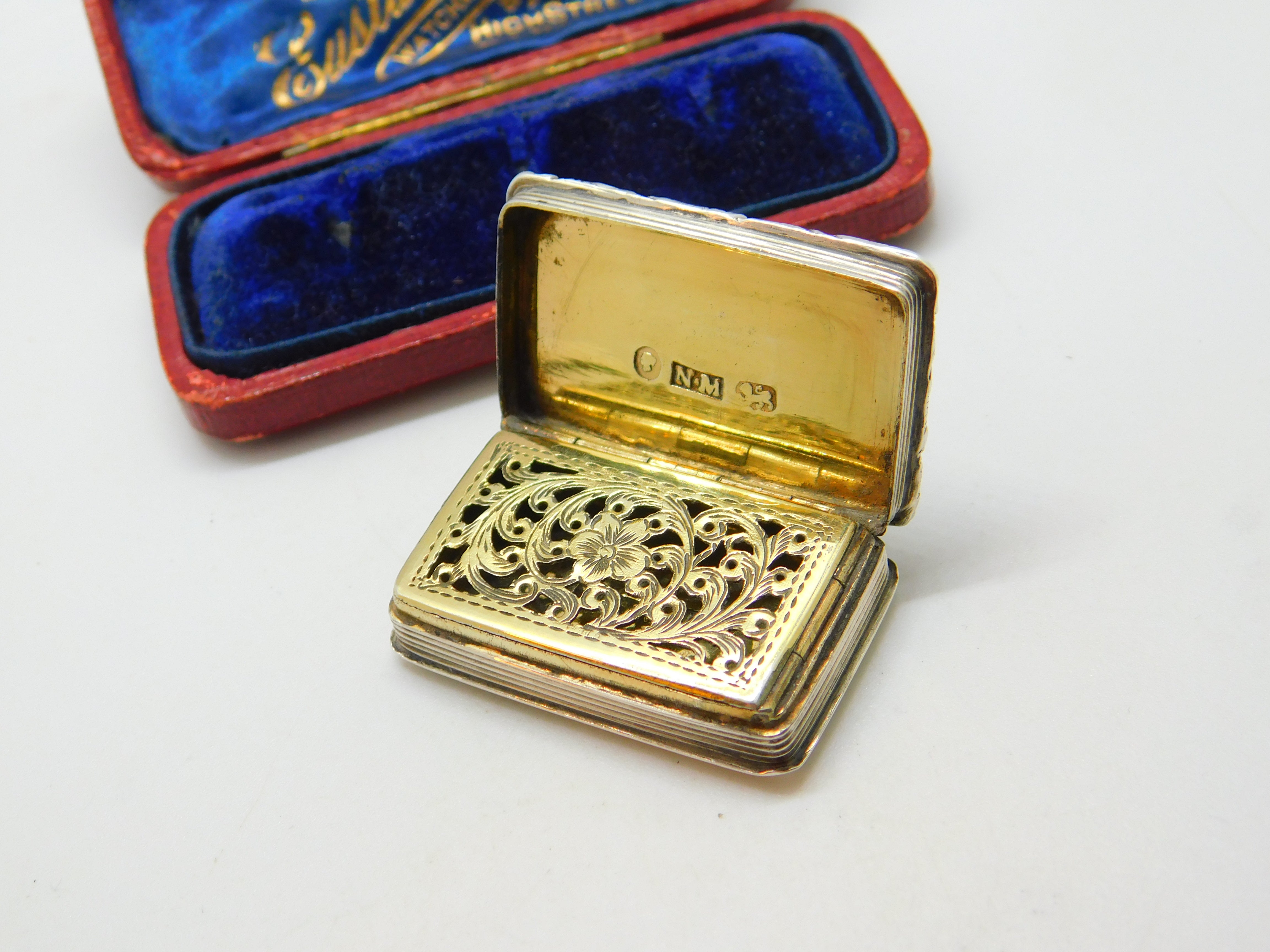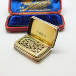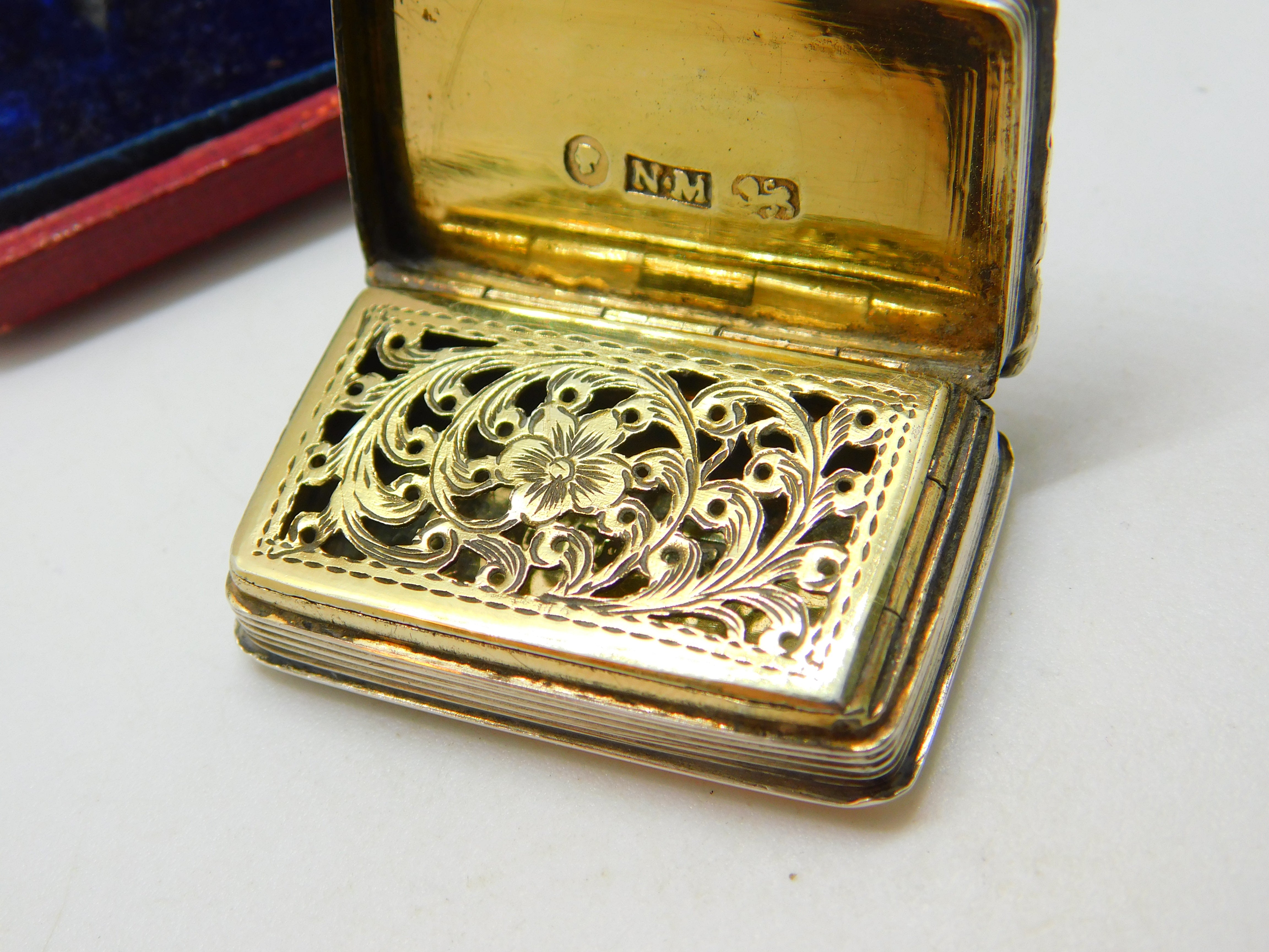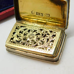 Details: A fantastic and wonderfully designed antique early Victorian sterling silver floral grill vinaigrette with lovely chased edges gilded to the interior hallmarked clearly Birmingham 1840 by prestigious silversmith Nathaniel Mills. This is a wonderful item that would make a perfect gift or addition to any collection. The BOX pictured is for PRESENTATION ONLY and is NOT included in the listings but used to frame the pictures unless specifically stated otherwise.