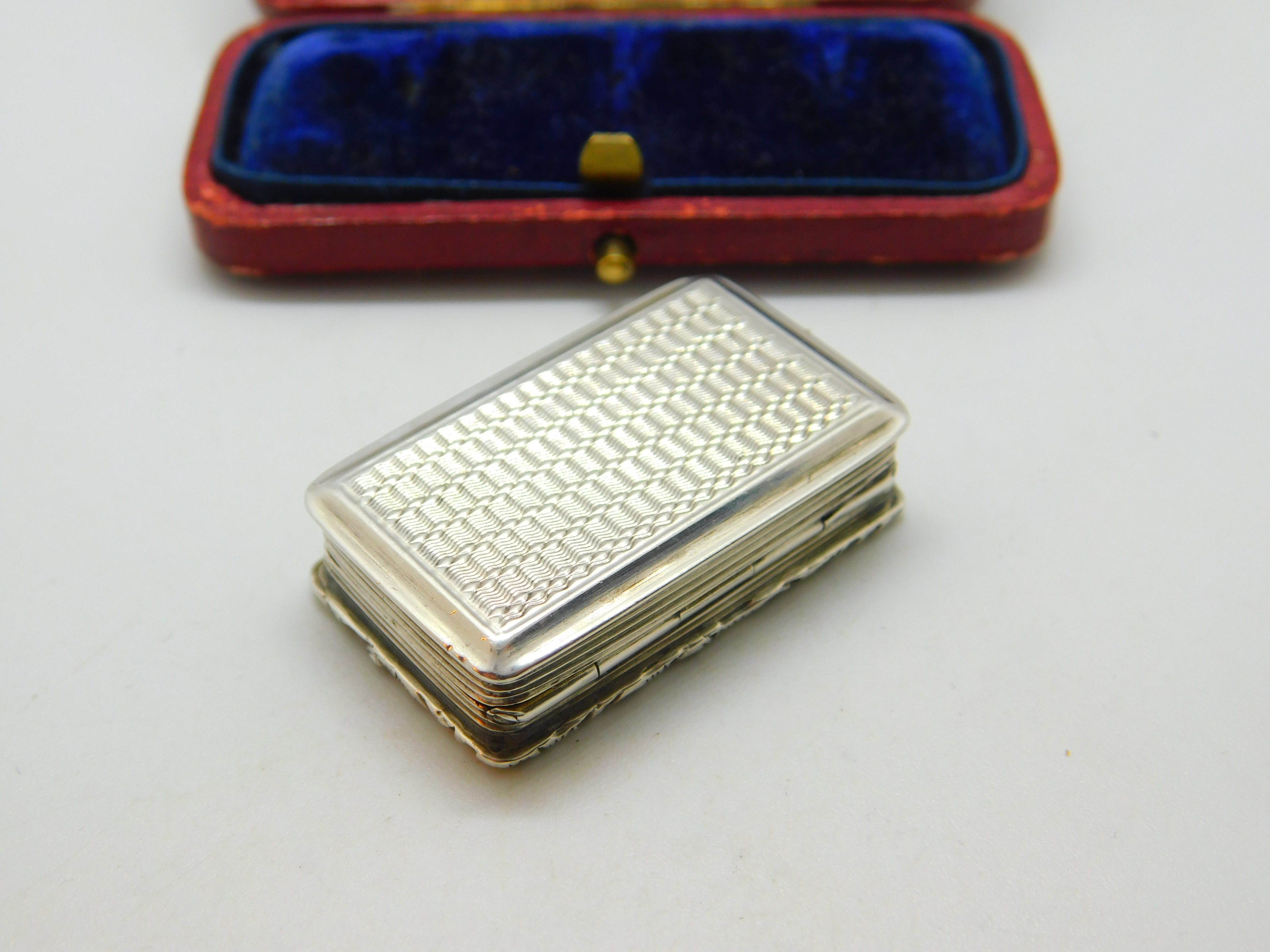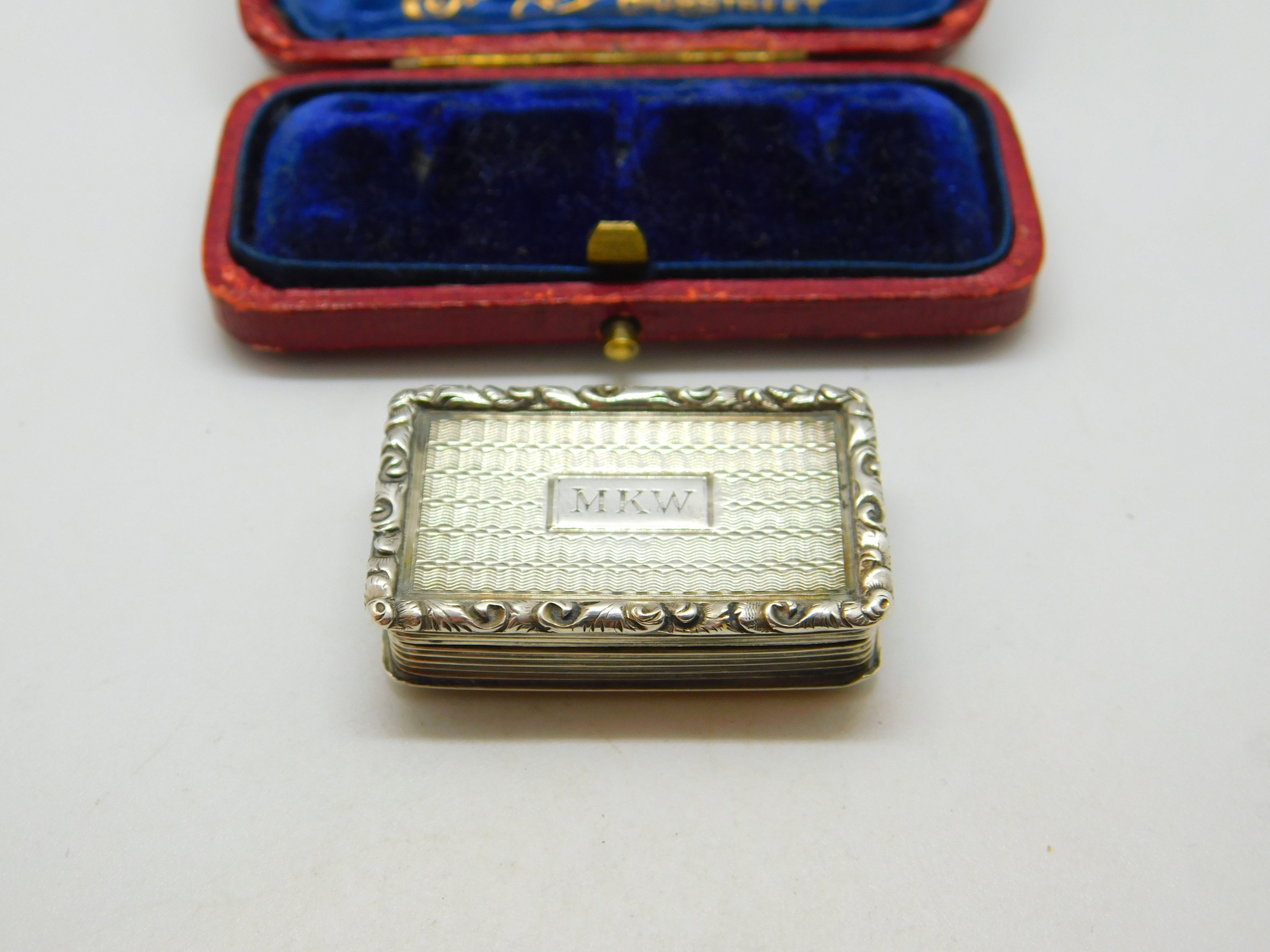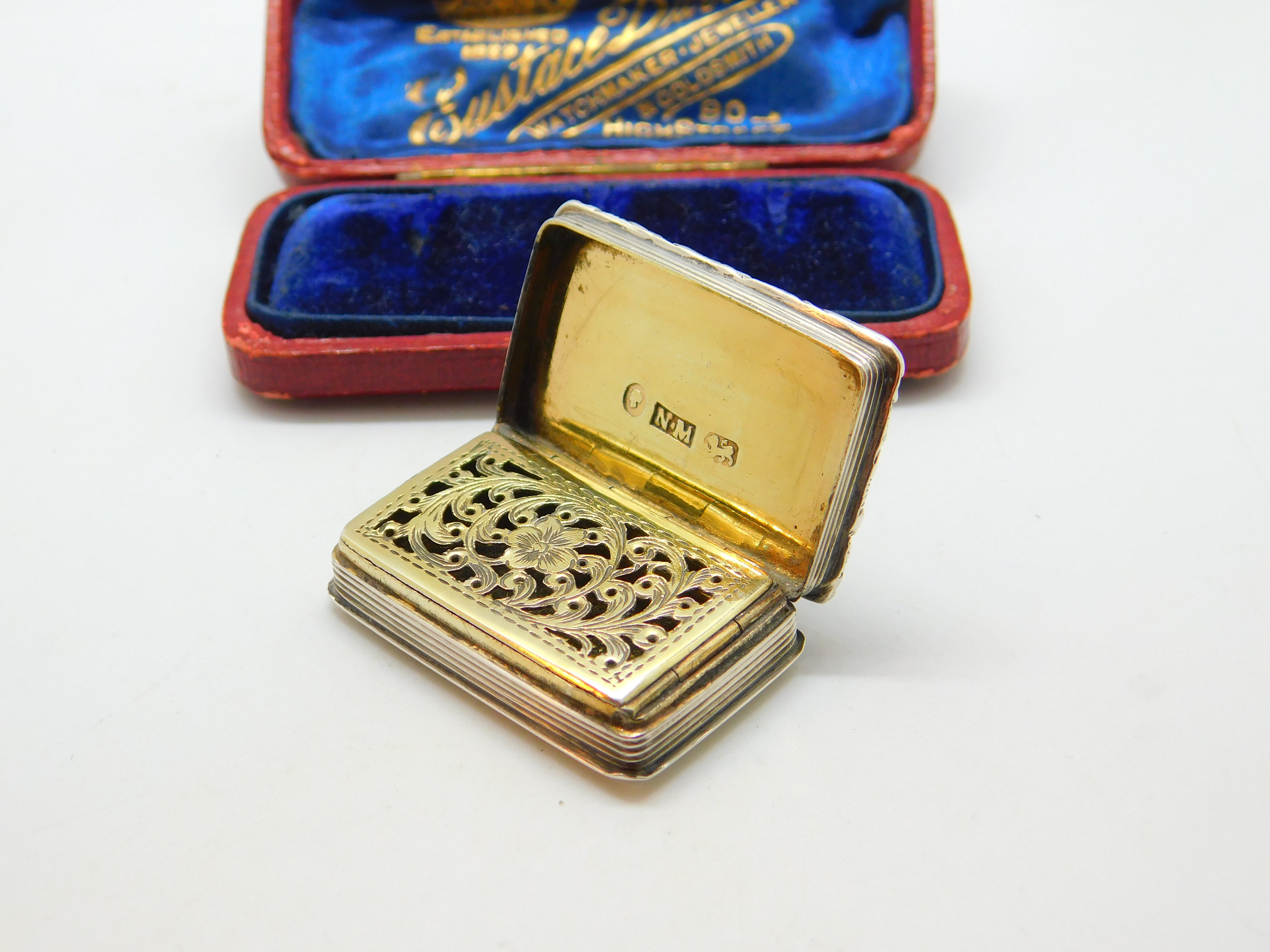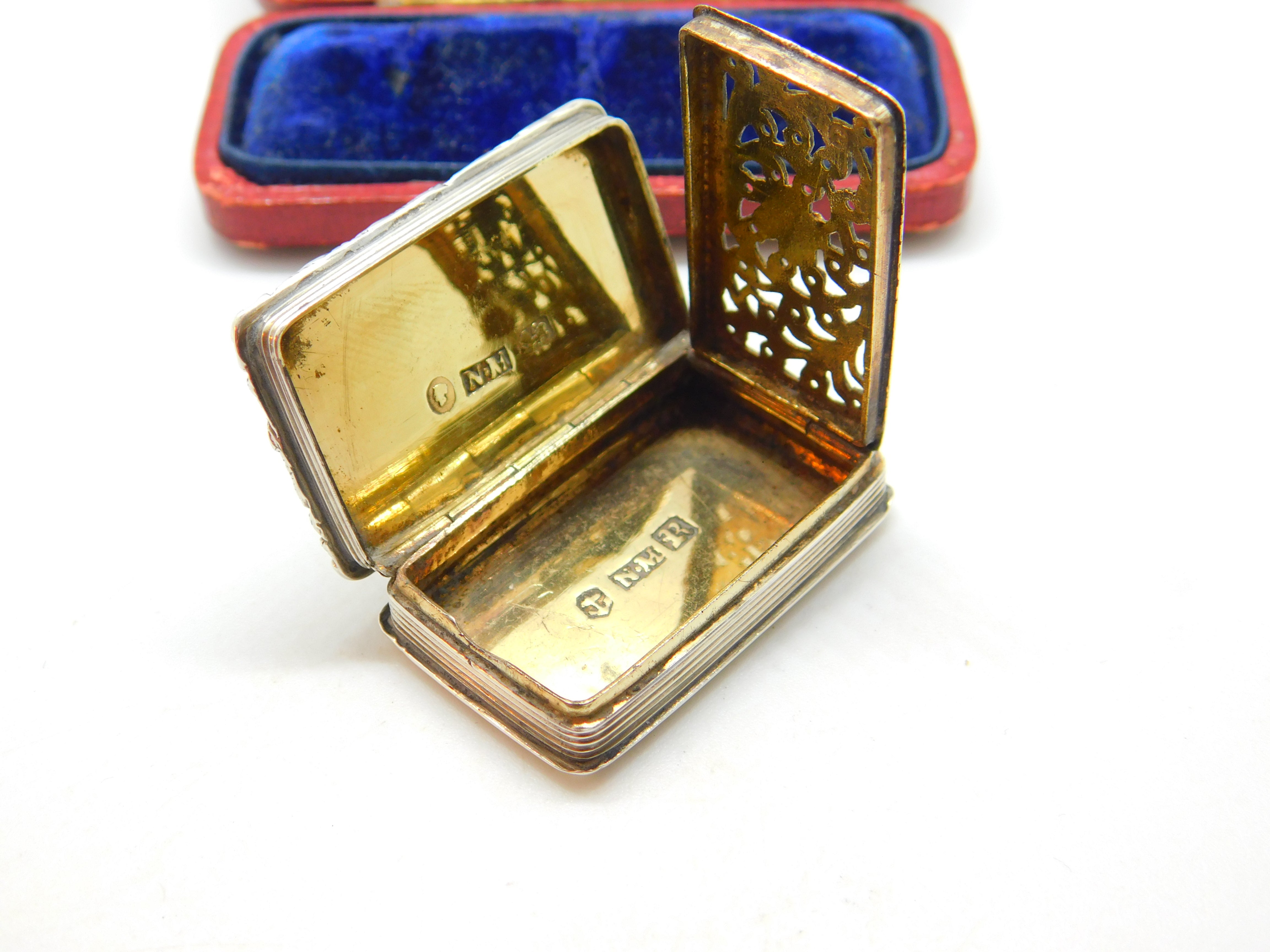Details: A fantastic and wonderfully designed antique early Victorian sterling silver floral grill vinaigrette with lovely chased edges gilded to the interior hallmarked clearly Birmingham 1840 by prestigious silversmith Nathaniel Mills. This is a wonderful item that would make a perfect gift or addition to any collection. The BOX pictured is for PRESENTATION ONLY and is NOT included in the listings but used to frame the pictures unless specifically stated otherwise.