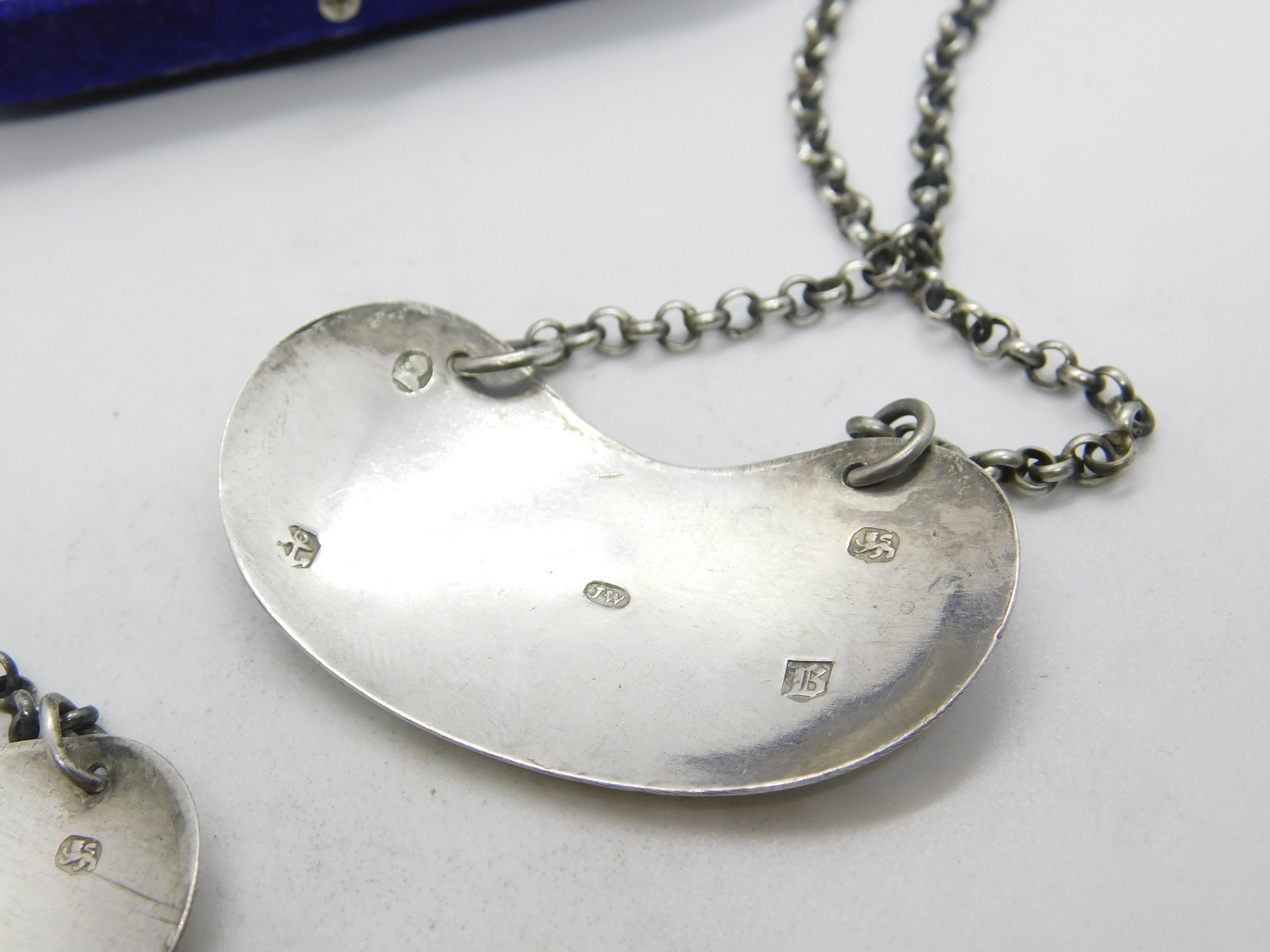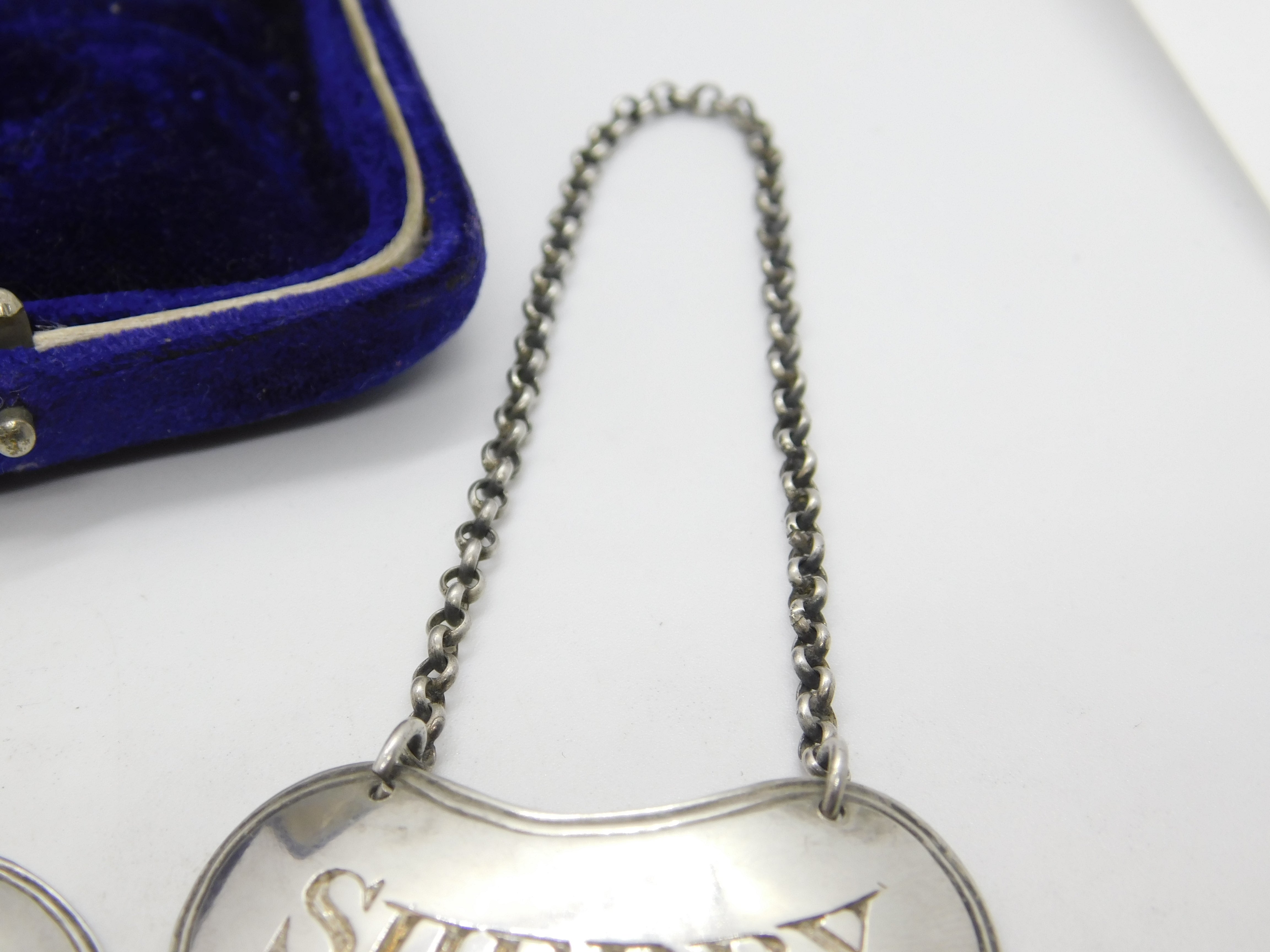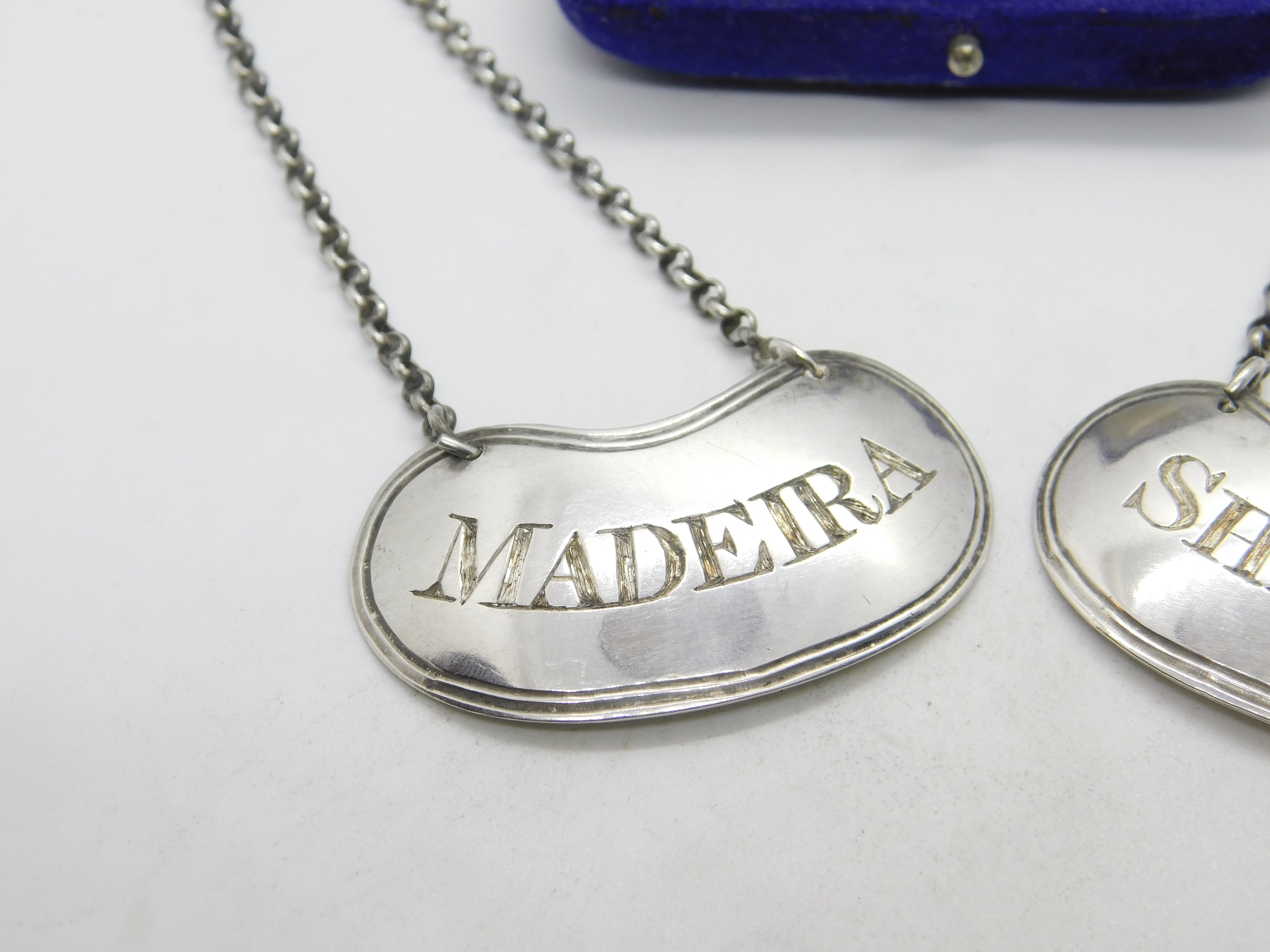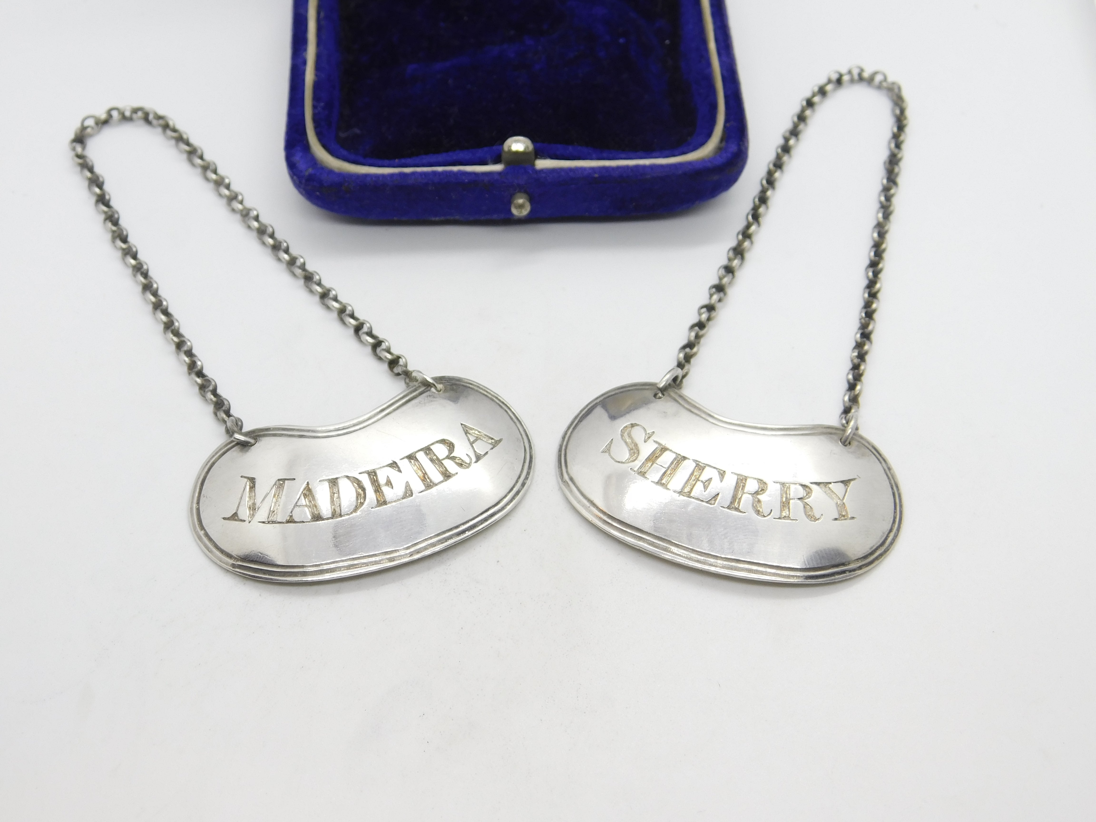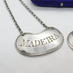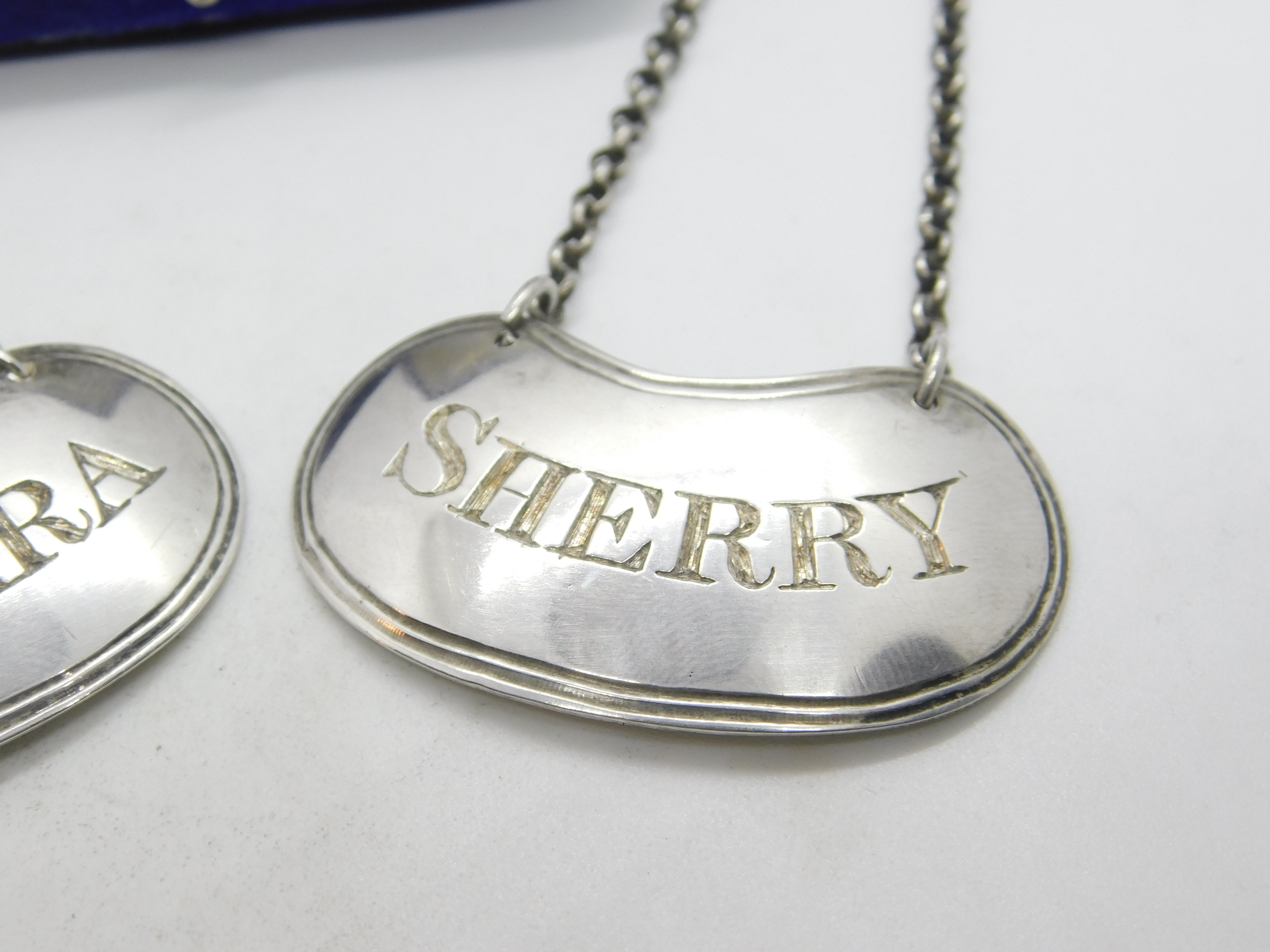 Pair Georgian Sterling Silver Bright Cut Decanter Labels Madeira & Sherry 1825