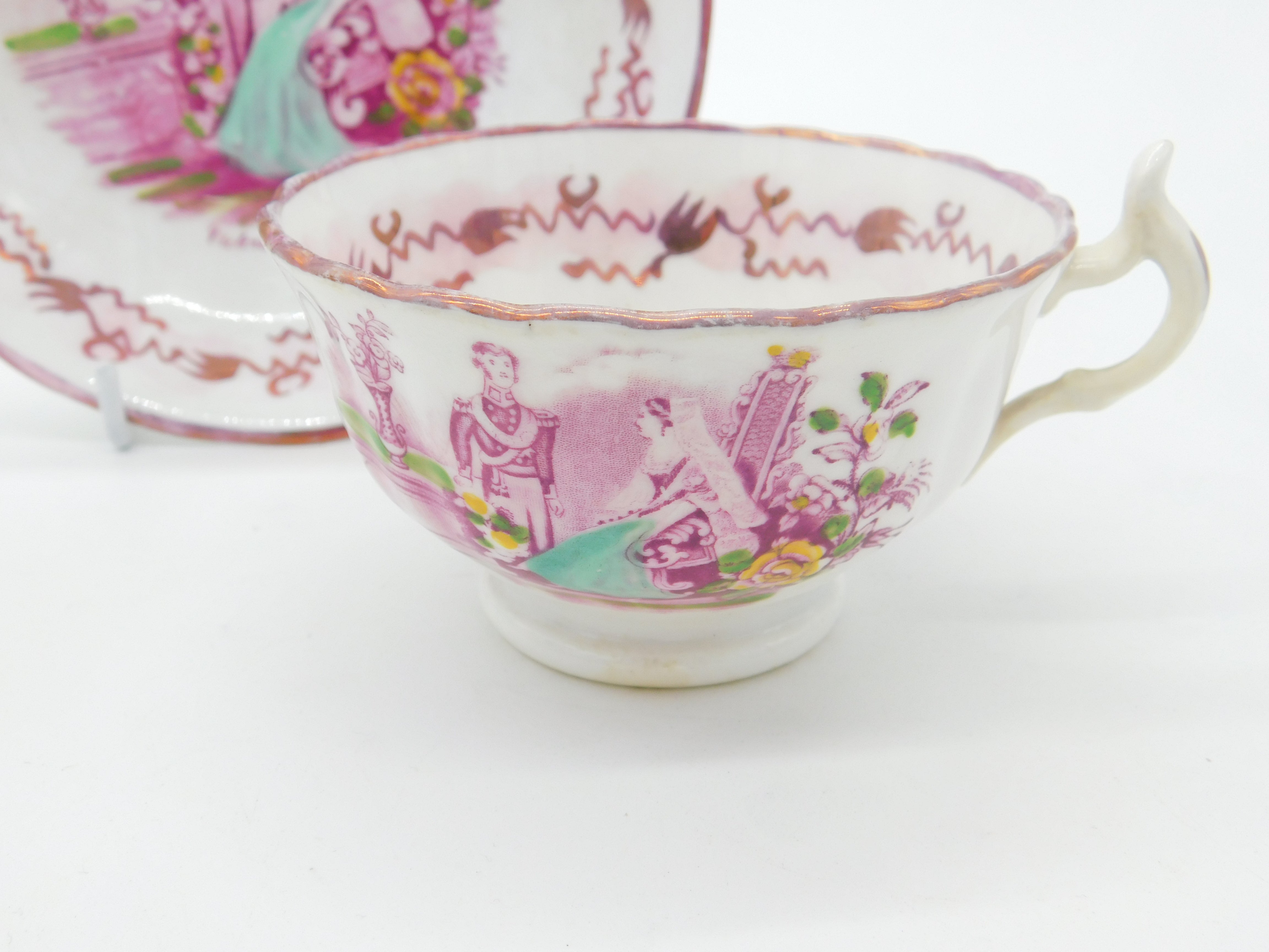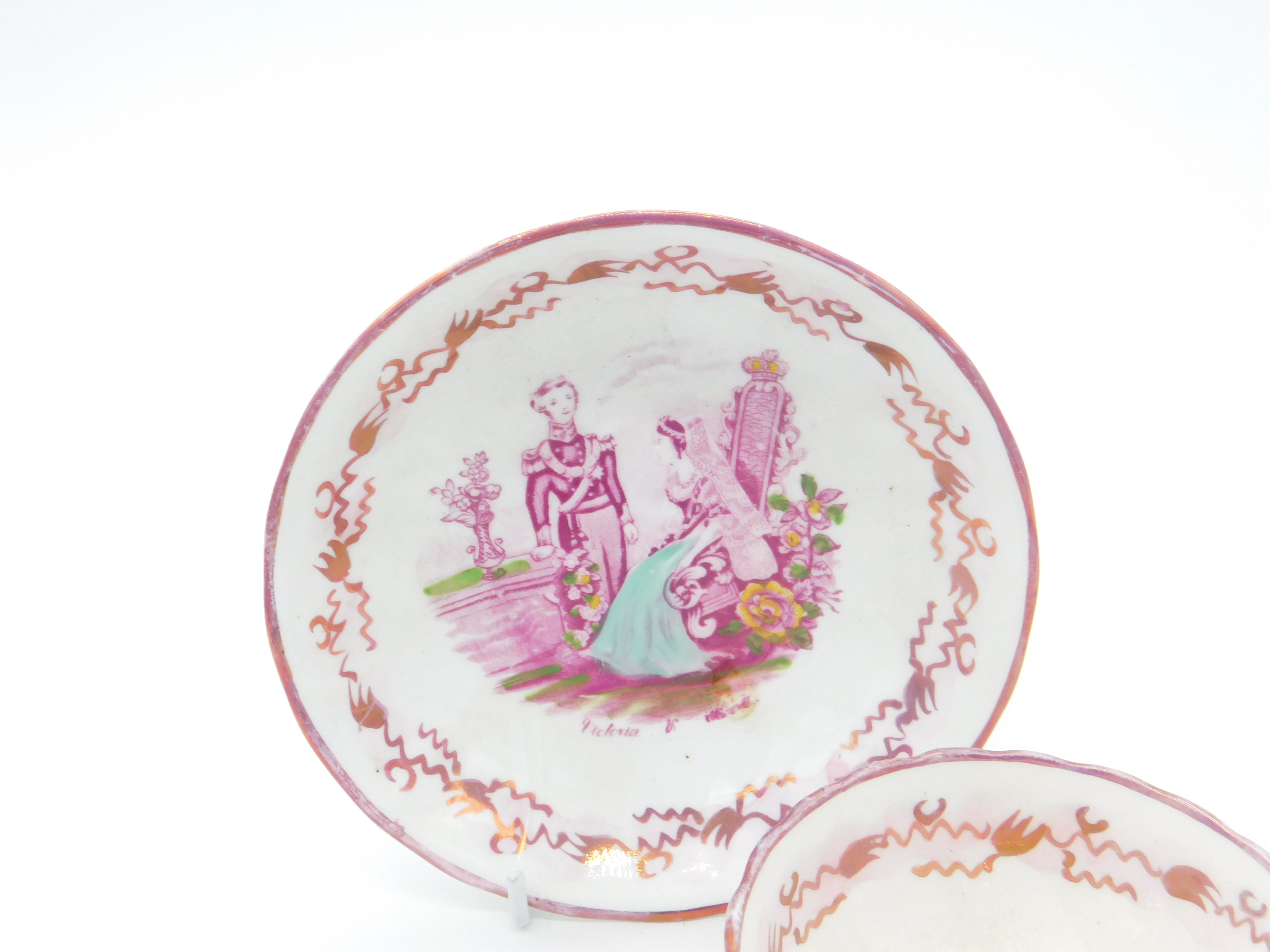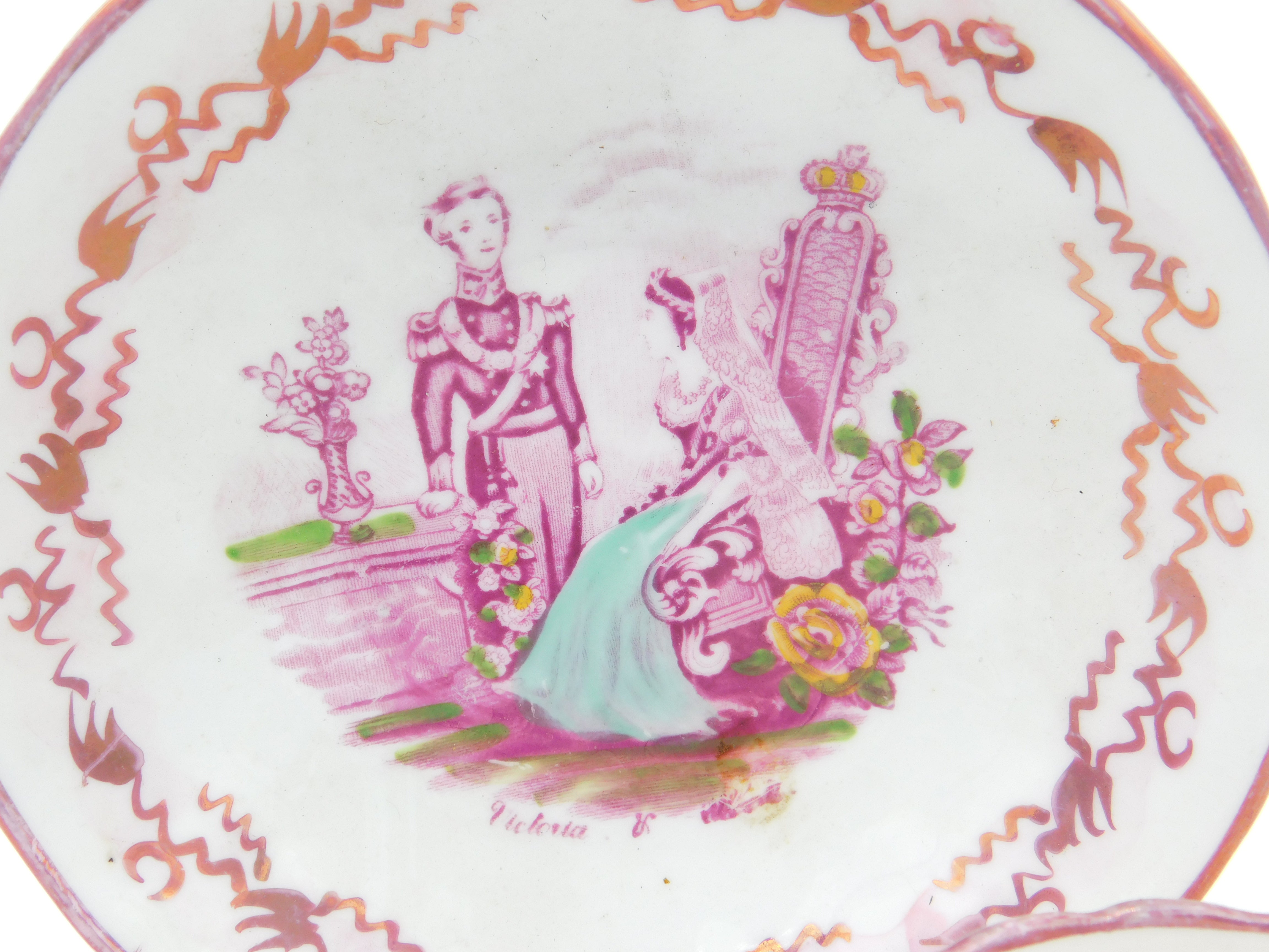 Details: A fantastic and wonderfully designed antique ceramic pink lustre tea cup and saucer commemorating the marriage of Queen Victoria and Prince Albert in 1840 - we have never come across this model before. This is a wonderful item that would make a perfect gift or addition to any collection. The BOX pictured is for PRESENTATION ONLY and is NOT included in the listings but used to frame the pictures unless specifically stated otherwise.