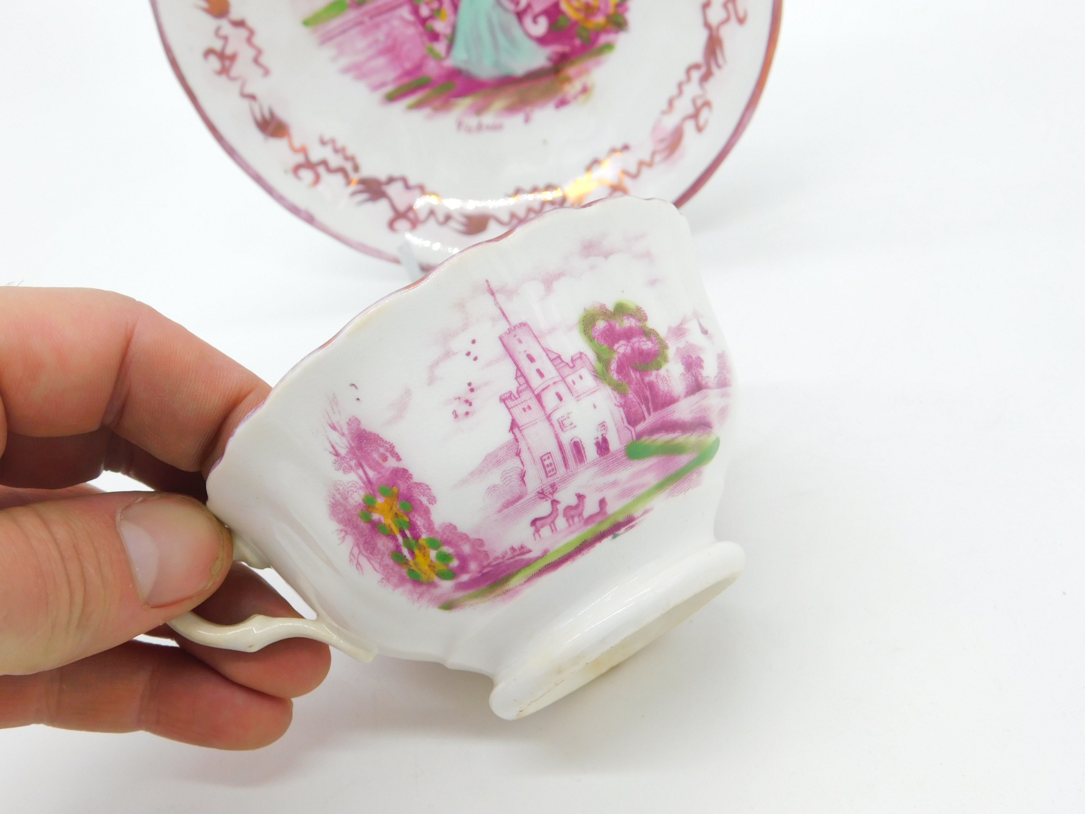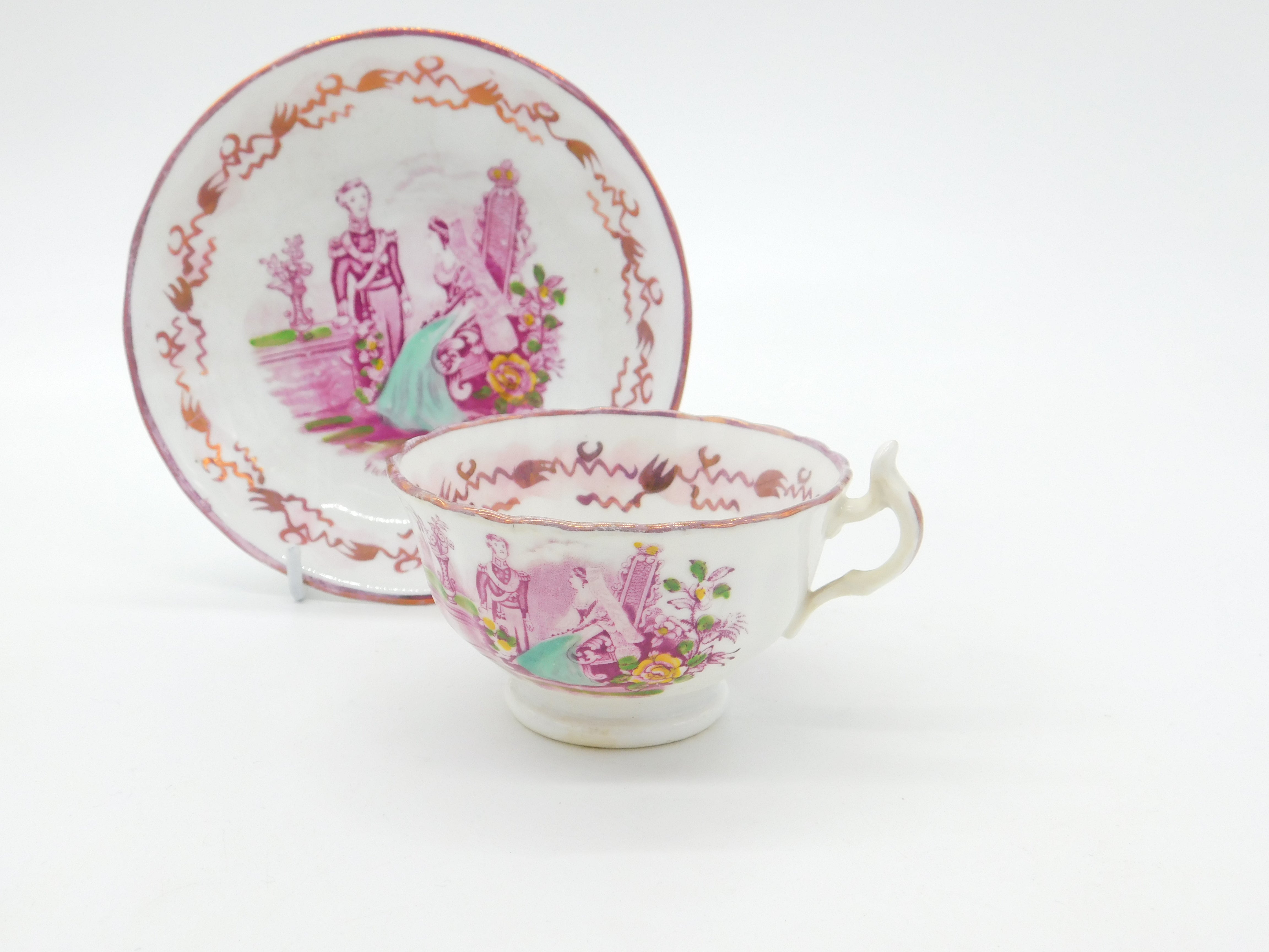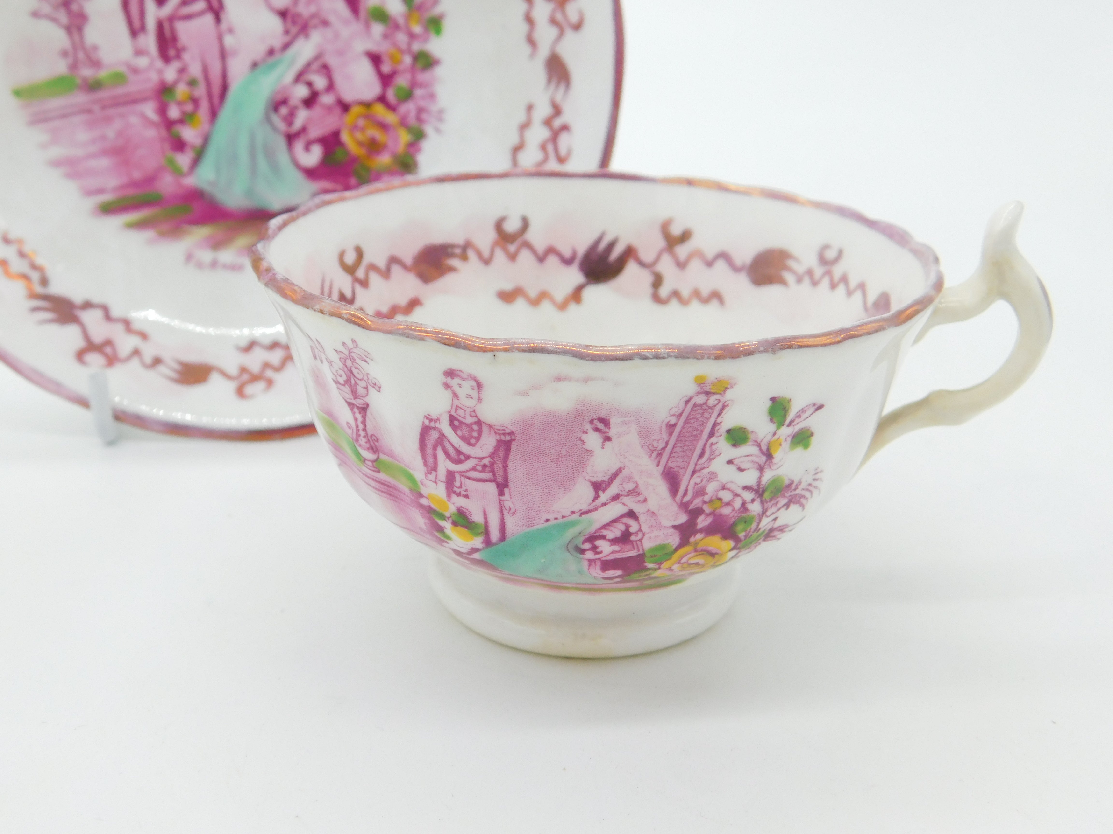 Details: A fantastic and wonderfully designed antique ceramic pink lustre tea cup and saucer commemorating the marriage of Queen Victoria and Prince Albert in 1840 - we have never come across this model before. This is a wonderful item that would make a perfect gift or addition to any collection. The BOX pictured is for PRESENTATION ONLY and is NOT included in the listings but used to frame the pictures unless specifically stated otherwise.
